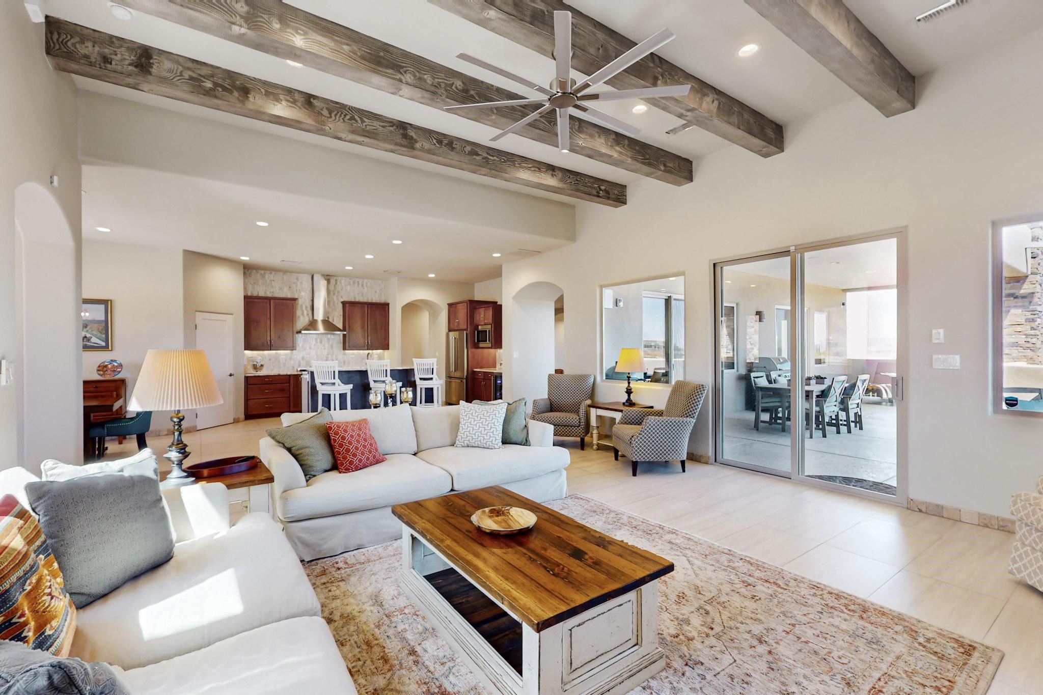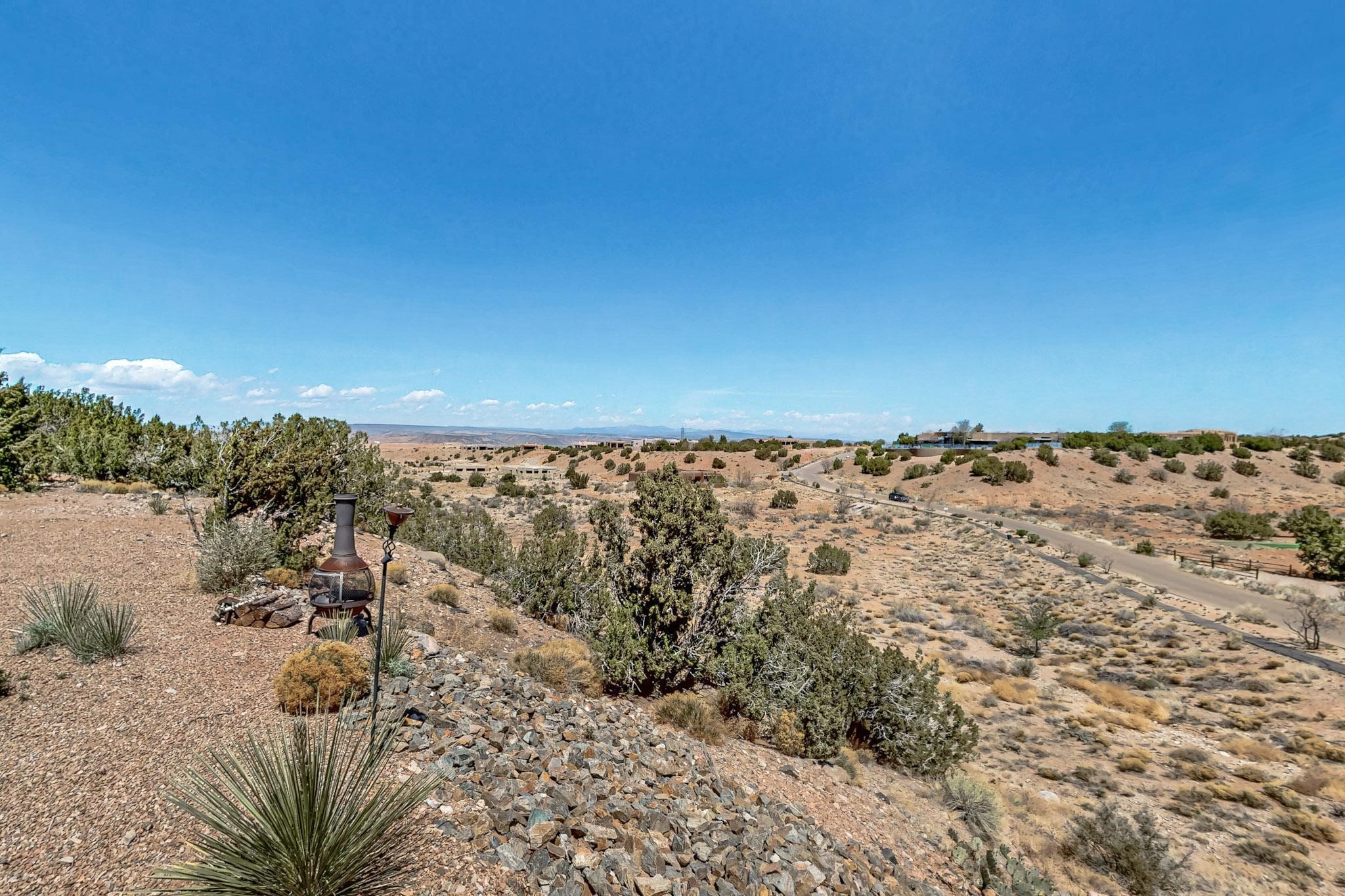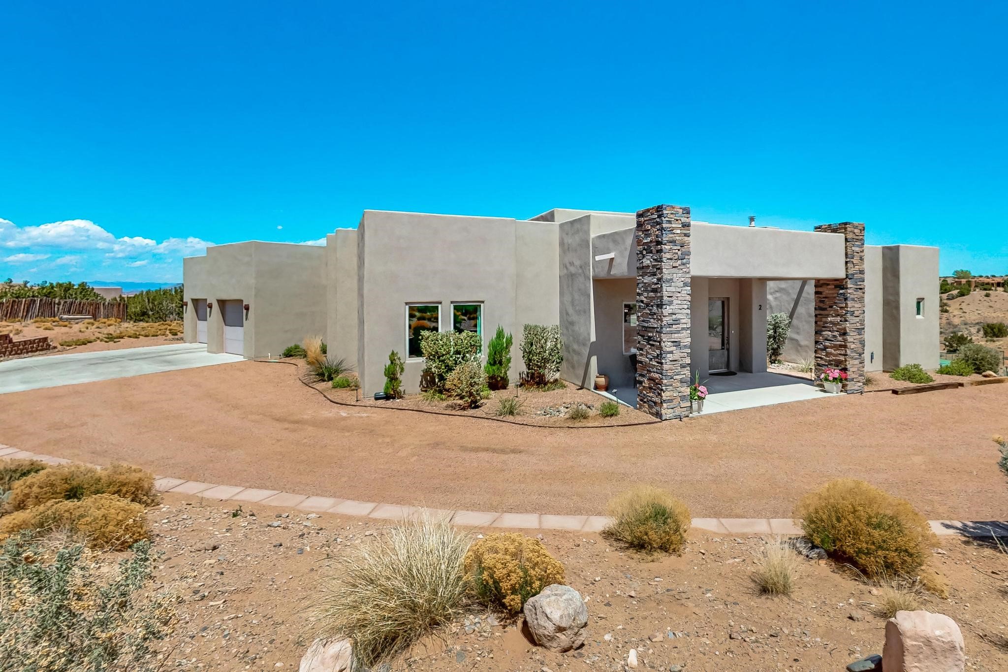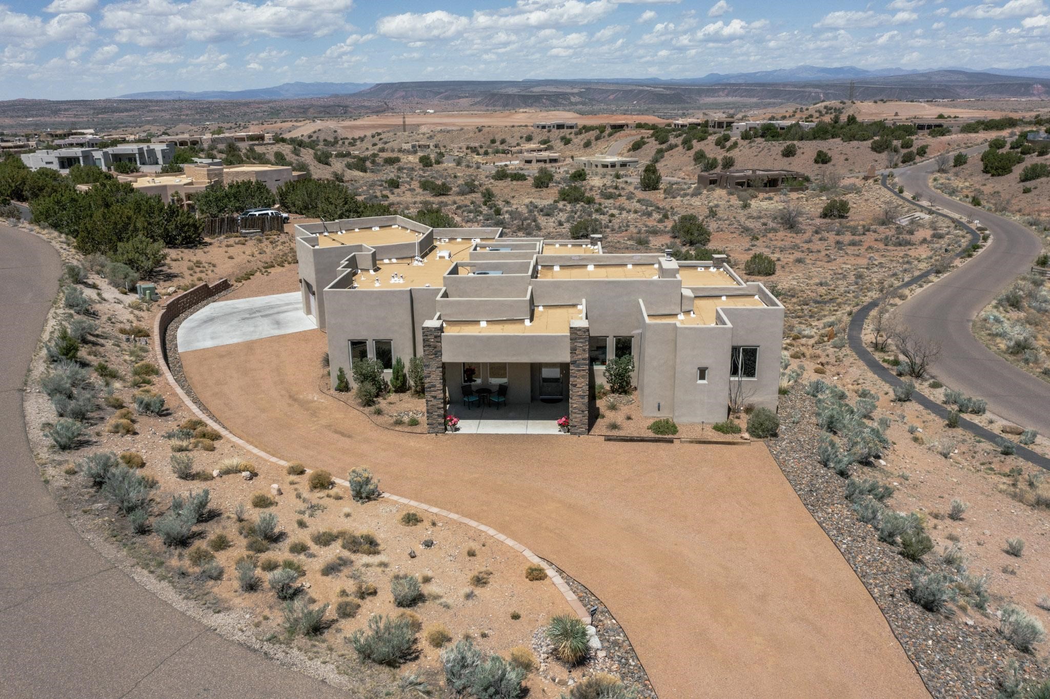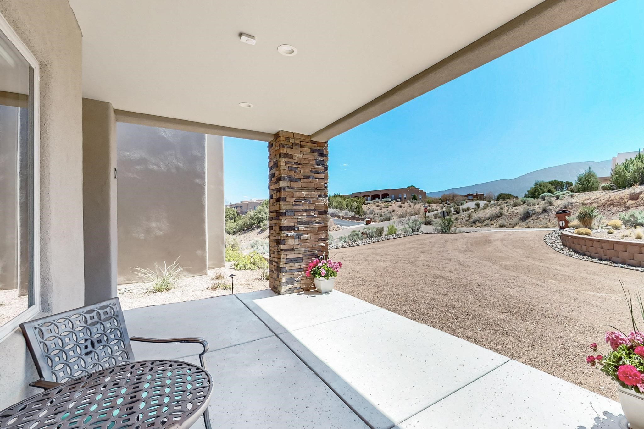 Experience the perfect balance of elegance, comfort, and functionality in this custom built 2022 Parade of Homes award winning home. Ideally situated on a 1.71-acre cul-de-sac lot in the prestigious Anasazi Trails subdivision, this thoughtfully designed single-level 2,850 sq ft residence is a rare find. Featuring 3 bedrooms, 3 bathrooms, and 2 spacious living areas, the home's open, split-bedroom floorplan offers both privacy and versatility. The luxurious primary suite and ensuite guest room are thoughtfully placed and perfect for multigenerational living or hosting out-of-town guests. Soak in the beauty of New Mexico's natural landscape from every angle. Strategically placed large windows provide lots of natural light and frame breathtaking views of the Sandia Mountains, Jemez Mesas, and the Rio Grande Valley. The family room highlights include beam ceilings and a sleek linear direct-vent fireplace, while the formal dining and living areas offer the perfect backdrop for gathering and entertaining. At the heart of the home, the gourmet kitchen is a chef's dream with granite countertops and stylish tile backsplash, stainless steel appliances including a 5-burner gas stove with double ovens and a beverage cooler, walk-in pantry, breakfast bar, and ample cabinetry for storage and organization. The primary suite is a private retreat, complete with backyard patio access, beam ceilings and a spa-like bathroom including dual vanities, soaking tub, large shower room with rainfall shower heads, and 2 walk-in closets with built-in shelving. Additional features include an 880 sq ft covered patio with multiple sliders and built-in speakers perfect for outdoor entertaining while enjoying panoramic views, a massive 3-car garage, an oversized laundry room with utility sink, cabinets and countertop space, a tankless hot water heater system, 36" tile and laminate flooring throughout, and a built-in Yamaha MusicCast sound system. Anasazi Trails offers a peaceful lifestyle with community tennis and pickleball courts and walking trails to explore the natural beauty of Placitas. With clean, contemporary lines, high-end finishes, and unparalleled craftsmanship, this home is truly one of a kind. Don't miss the opportunity to make this your Dream Home!
