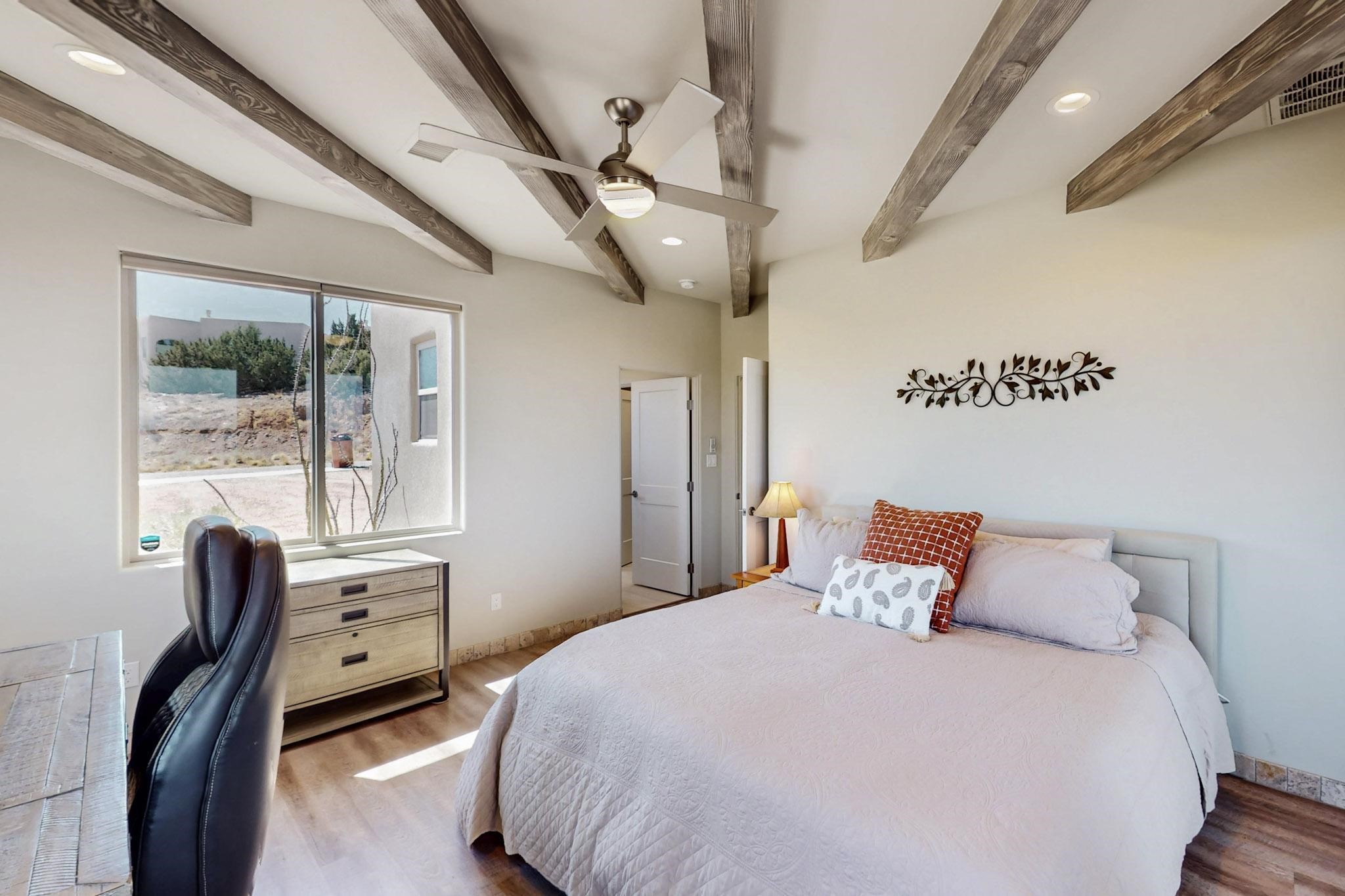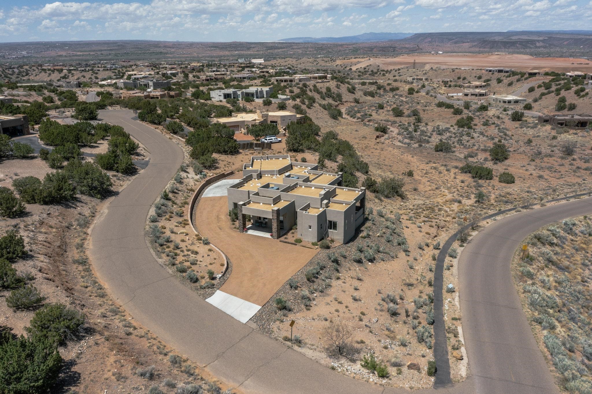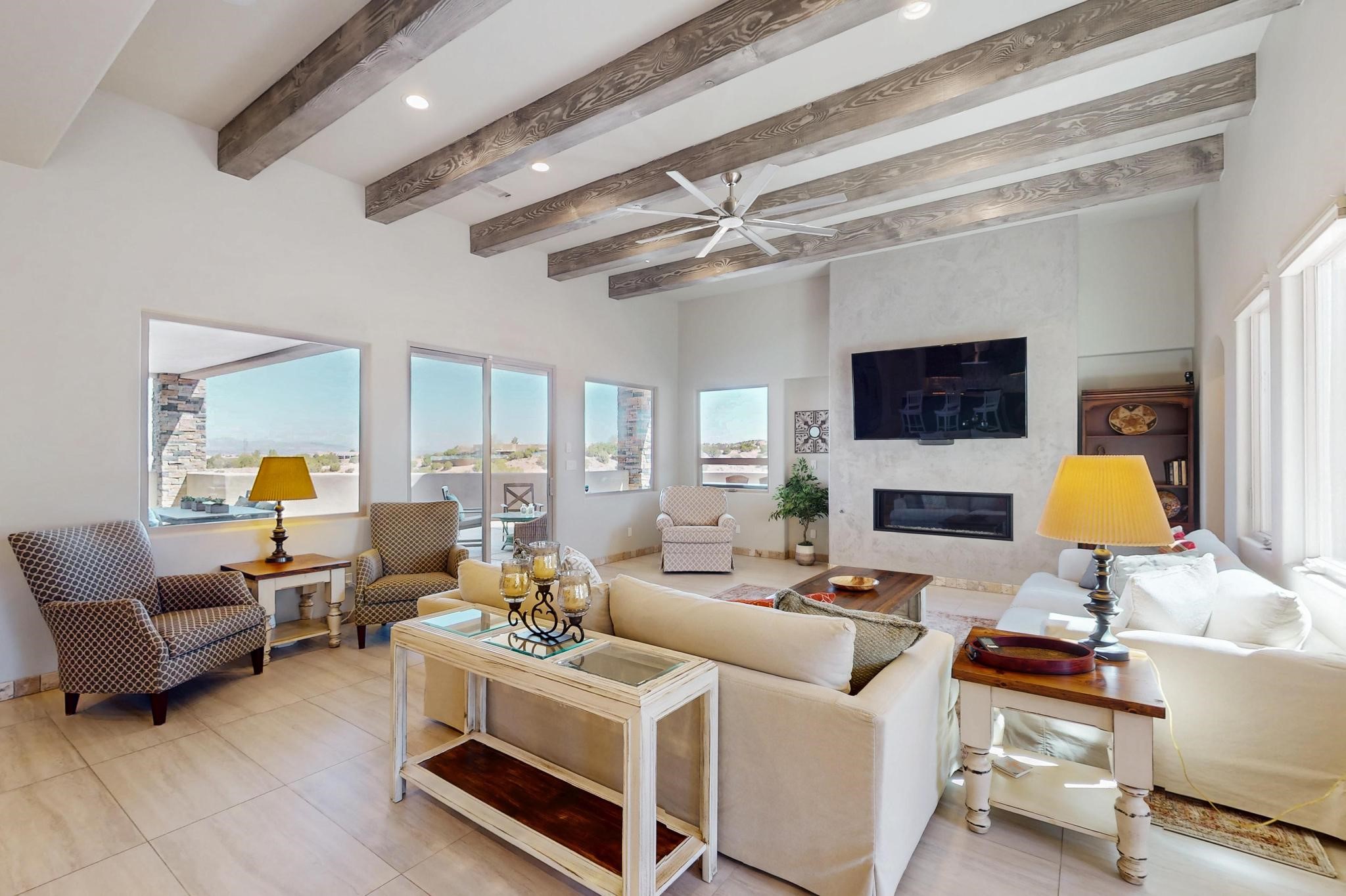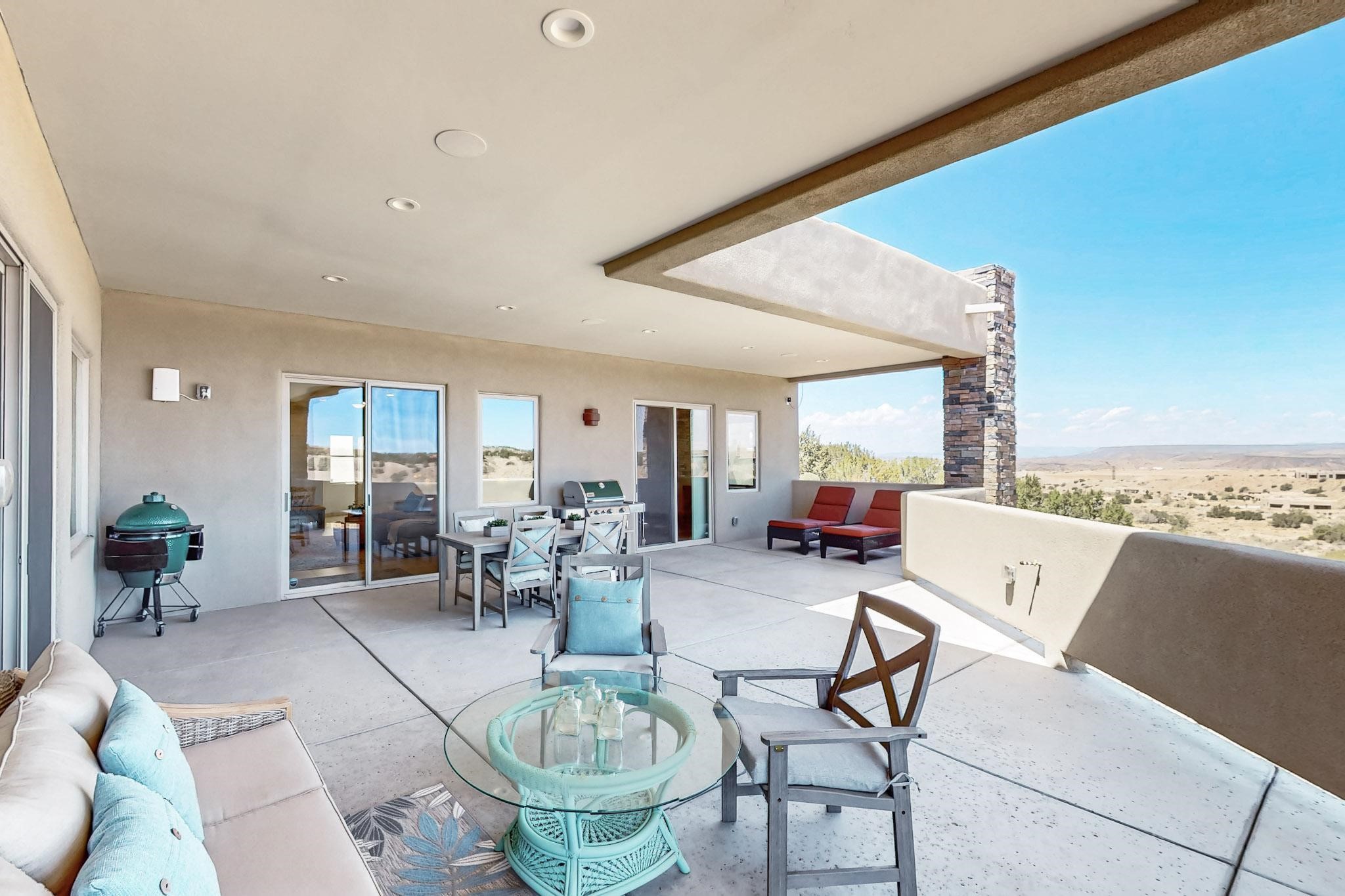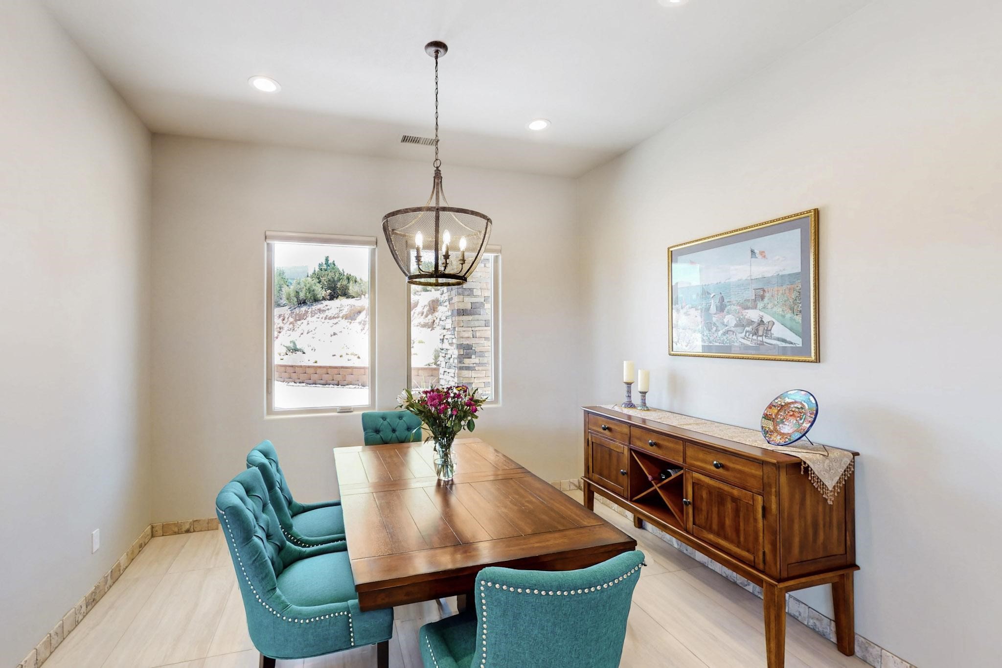 Experience the perfect balance of elegance, comfort, and functionality in this custom built 2022 Parade of Homes award winning home. Ideally situated on a 1.71-acre cul-de-sac lot in the prestigious Anasazi Trails subdivision, this thoughtfully designed single-level 2,850 sq ft residence is a rare find. Featuring 3 bedrooms, 3 bathrooms, and 2 spacious living areas, the home's open, split-bedroom floorplan offers both privacy and versatility. The luxurious primary suite and ensuite guest room are thoughtfully placed and perfect for multigenerational living or hosting out-of-town guests. Soak in the beauty of New Mexico's natural landscape from every angle. Strategically placed large windows provide lots of natural light and frame breathtaking views of the Sandia Mountains, Jemez Mesas, and the Rio Grande Valley. The family room highlights include beam ceilings and a sleek linear direct-vent fireplace, while the formal dining and living areas offer the perfect backdrop for gathering and entertaining. At the heart of the home, the gourmet kitchen is a chef's dream with granite countertops and stylish tile backsplash, stainless steel appliances including a 5-burner gas stove with double ovens and a beverage cooler, walk-in pantry, breakfast bar, and ample cabinetry for storage and organization. The primary suite is a private retreat, complete with backyard patio access, beam ceilings and a spa-like bathroom including dual vanities, soaking tub, large shower room with rainfall shower heads, and 2 walk-in closets with built-in shelving. Additional features include an 880 sq ft covered patio with multiple sliders and built-in speakers perfect for outdoor entertaining while enjoying panoramic views, a massive 3-car garage, an oversized laundry room with utility sink, cabinets and countertop space, a tankless hot water heater system, 36" tile and laminate flooring throughout, and a built-in Yamaha MusicCast sound system. Anasazi Trails offers a peaceful lifestyle with community tennis and pickleball courts and walking trails to explore the natural beauty of Placitas. With clean, contemporary lines, high-end finishes, and unparalleled craftsmanship, this home is truly one of a kind. Don't miss the opportunity to make this your Dream Home!
