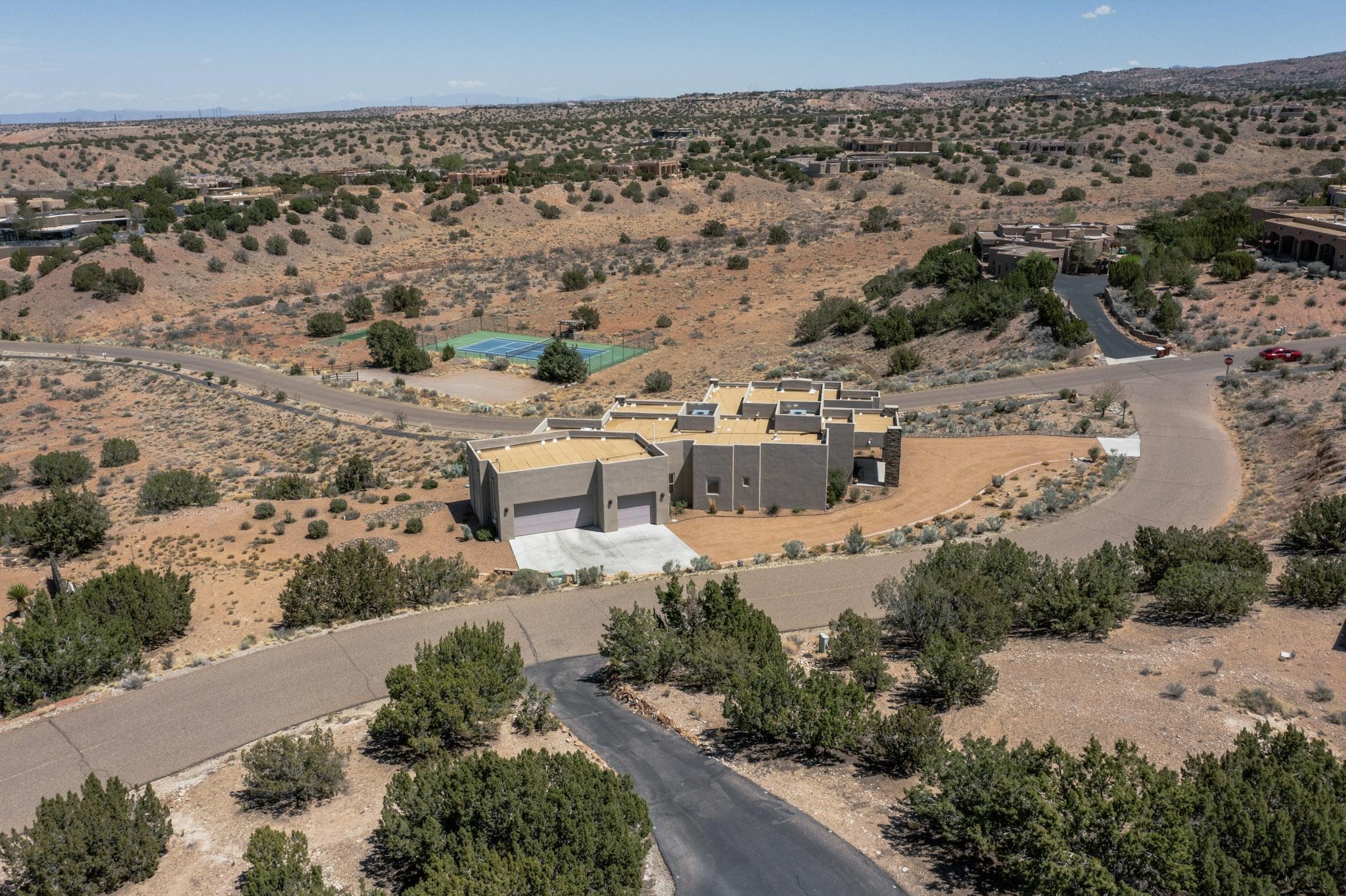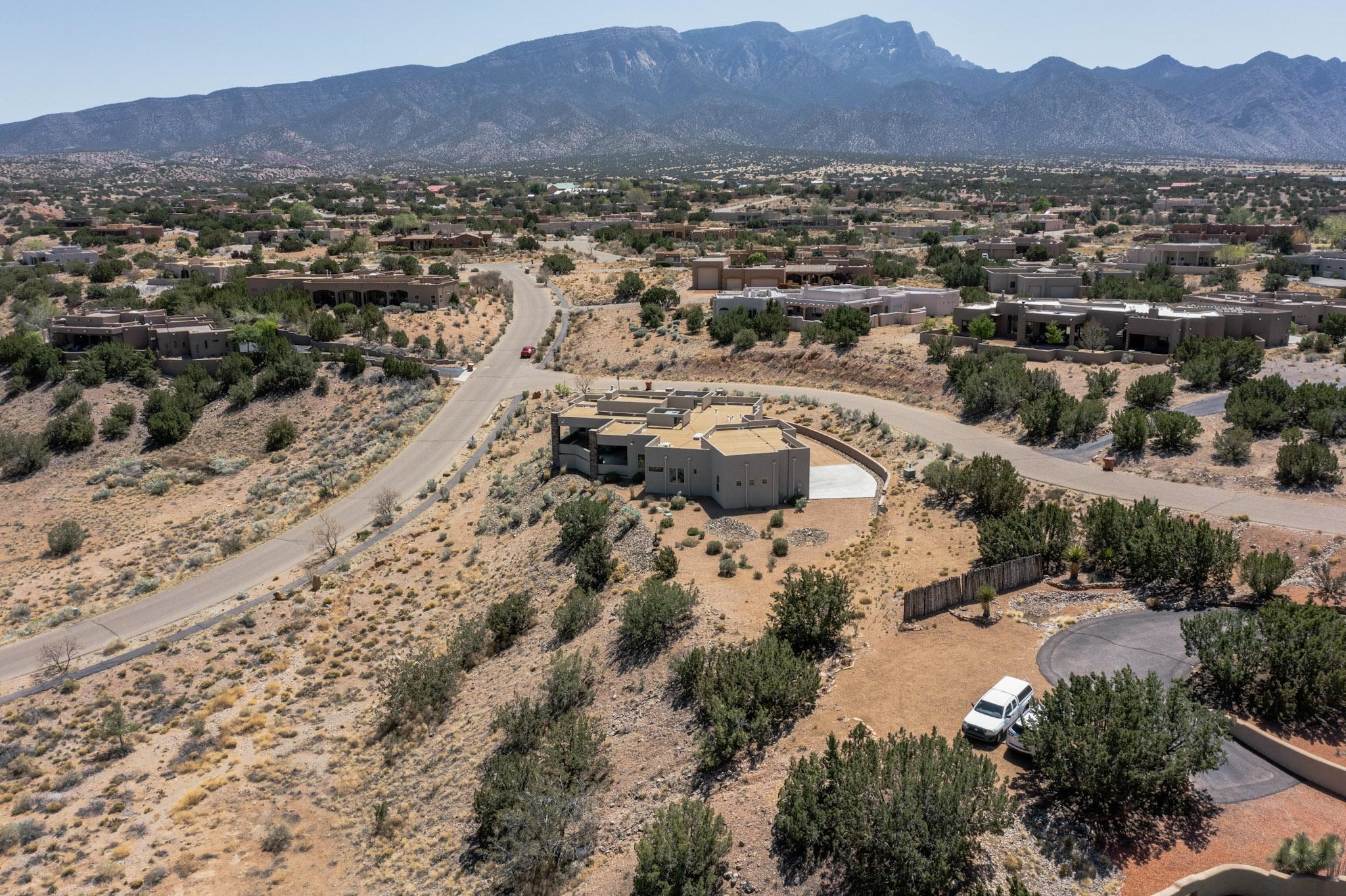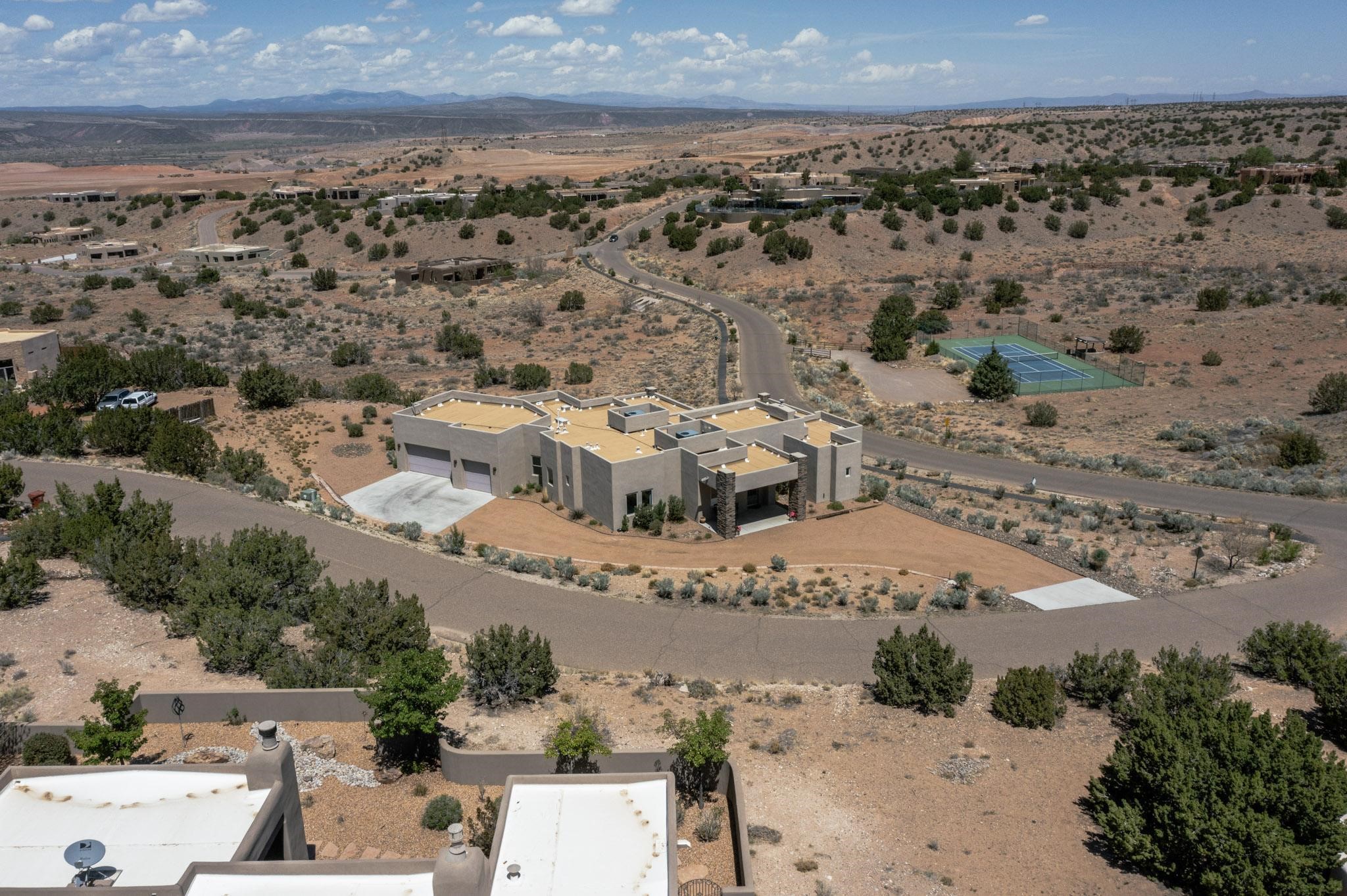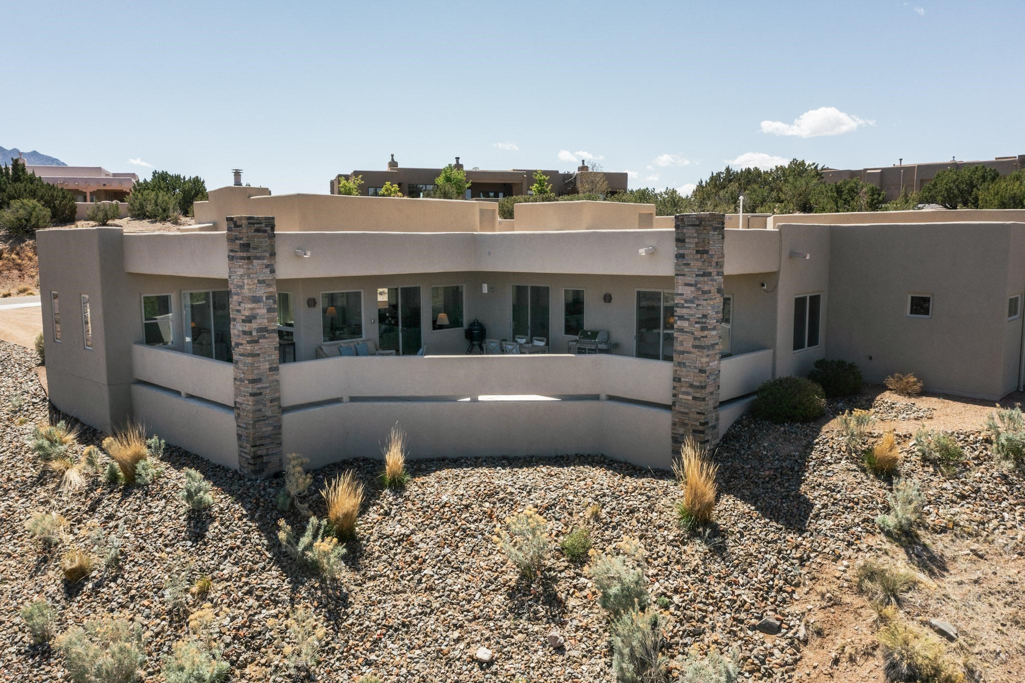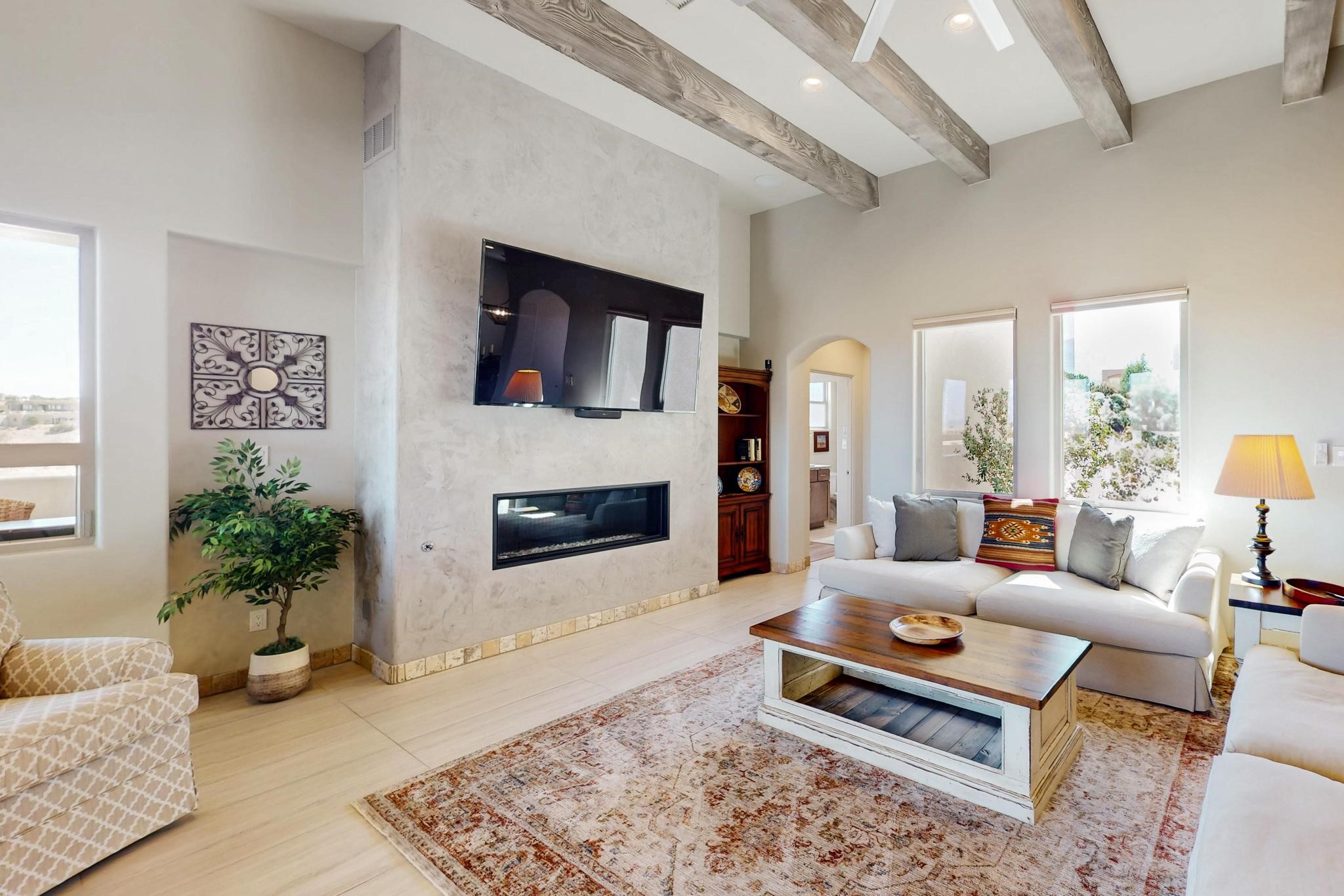Experience the perfect balance of elegance, comfort, and functionality in this custom built 2022 Parade of Homes award winning home. Ideally situated on a 1.71-acre cul-de-sac lot in the prestigious Anasazi Trails subdivision, this thoughtfully designed single-level 2,850 sq ft residence is a rare find. Featuring 3 bedrooms, 3 bathrooms, and 2 spacious living areas, the home's open, split-bedroom floorplan offers both privacy and versatility. The luxurious primary suite and ensuite guest room are thoughtfully placed and perfect for multigenerational living or hosting out-of-town guests. Soak in the beauty of New Mexico's natural landscape from every angle. Strategically placed large windows provide lots of natural light and frame breathtaking views of the Sandia Mountains, Jemez Mesas, and the Rio Grande Valley. The family room highlights include beam ceilings and a sleek linear direct-vent fireplace, while the formal dining and living areas offer the perfect backdrop for gathering and entertaining. At the heart of the home, the gourmet kitchen is a chef's dream with granite countertops and stylish tile backsplash, stainless steel appliances including a 5-burner gas stove with double ovens and a beverage cooler, walk-in pantry, breakfast bar, and ample cabinetry for storage and organization. The primary suite is a private retreat, complete with backyard patio access, beam ceilings and a spa-like bathroom including dual vanities, soaking tub, large shower room with rainfall shower heads, and 2 walk-in closets with built-in shelving. Additional features include an 880 sq ft covered patio with multiple sliders and built-in speakers perfect for outdoor entertaining while enjoying panoramic views, a massive 3-car garage, an oversized laundry room with utility sink, cabinets and countertop space, a tankless hot water heater system, 36" tile and laminate flooring throughout, and a built-in Yamaha MusicCast sound system. Anasazi Trails offers a peaceful lifestyle with community tennis and pickleball courts and walking trails to explore the natural beauty of Placitas. With clean, contemporary lines, high-end finishes, and unparalleled craftsmanship, this home is truly one of a kind. Don't miss the opportunity to make this your Dream Home!