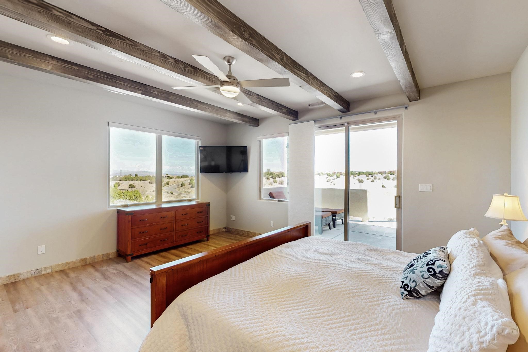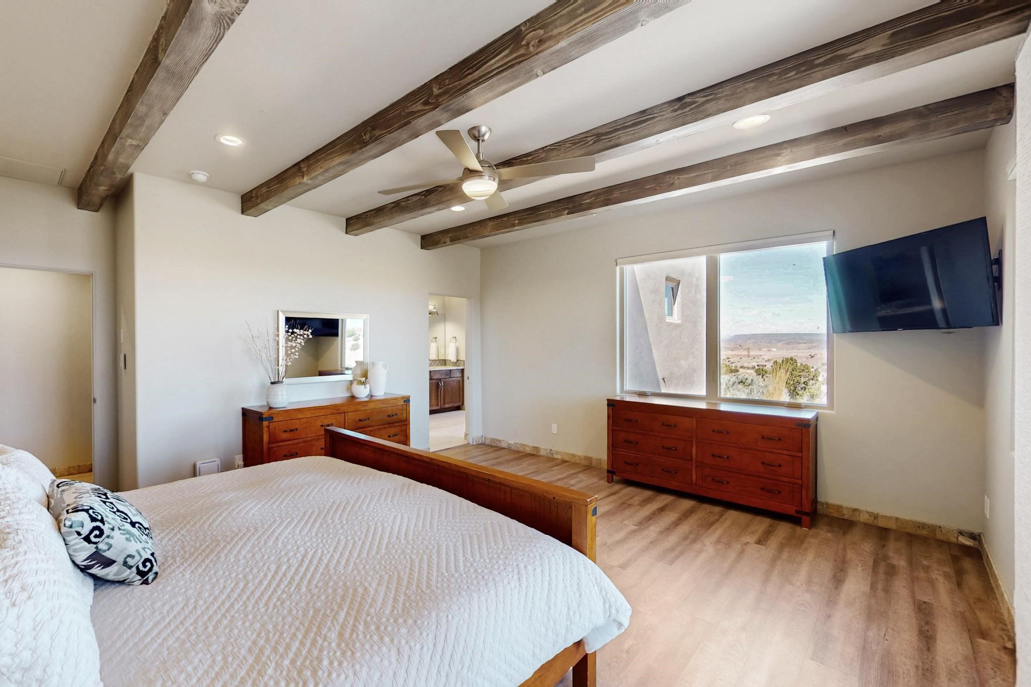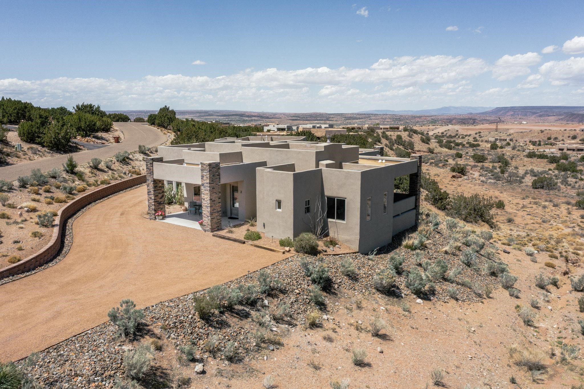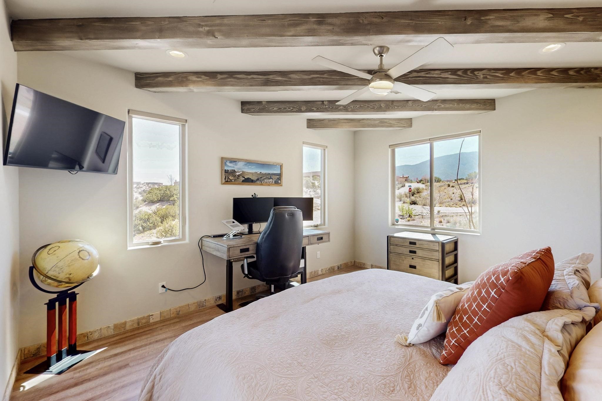 Experience the perfect balance of elegance, comfort, and functionality in this custom built 2022 Parade of Homes award winning home. Ideally situated on a 1.71-acre cul-de-sac lot in the prestigious Anasazi Trails subdivision, this thoughtfully designed single-level 2,850 sq ft residence is a rare find. Featuring 3 bedrooms, 3 bathrooms, and 2 spacious living areas, the home's open, split-bedroom floorplan offers both privacy and versatility. The luxurious primary suite and ensuite guest room are thoughtfully placed and perfect for multigenerational living or hosting out-of-town guests. Soak in the beauty of New Mexico's natural landscape from every angle. Strategically placed large windows provide lots of natural light and frame breathtaking views of the Sandia Mountains, Jemez Mesas, and the Rio Grande Valley. The family room highlights include beam ceilings and a sleek linear direct-vent fireplace, while the formal dining and living areas offer the perfect backdrop for gathering and entertaining. At the heart of the home, the gourmet kitchen is a chef's dream with granite countertops and stylish tile backsplash, stainless steel appliances including a 5-burner gas stove with double ovens and a beverage cooler, walk-in pantry, breakfast bar, and ample cabinetry for storage and organization. The primary suite is a private retreat, complete with backyard patio access, beam ceilings and a spa-like bathroom including dual vanities, soaking tub, large shower room with rainfall shower heads, and 2 walk-in closets with built-in shelving. Additional features include an 880 sq ft covered patio with multiple sliders and built-in speakers perfect for outdoor entertaining while enjoying panoramic views, a massive 3-car garage, an oversized laundry room with utility sink, cabinets and countertop space, a tankless hot water heater system, 36" tile and laminate flooring throughout, and a built-in Yamaha MusicCast sound system. Anasazi Trails offers a peaceful lifestyle with community tennis and pickleball courts and walking trails to explore the natural beauty of Placitas. With clean, contemporary lines, high-end finishes, and unparalleled craftsmanship, this home is truly one of a kind. Don't miss the opportunity to make this your Dream Home!