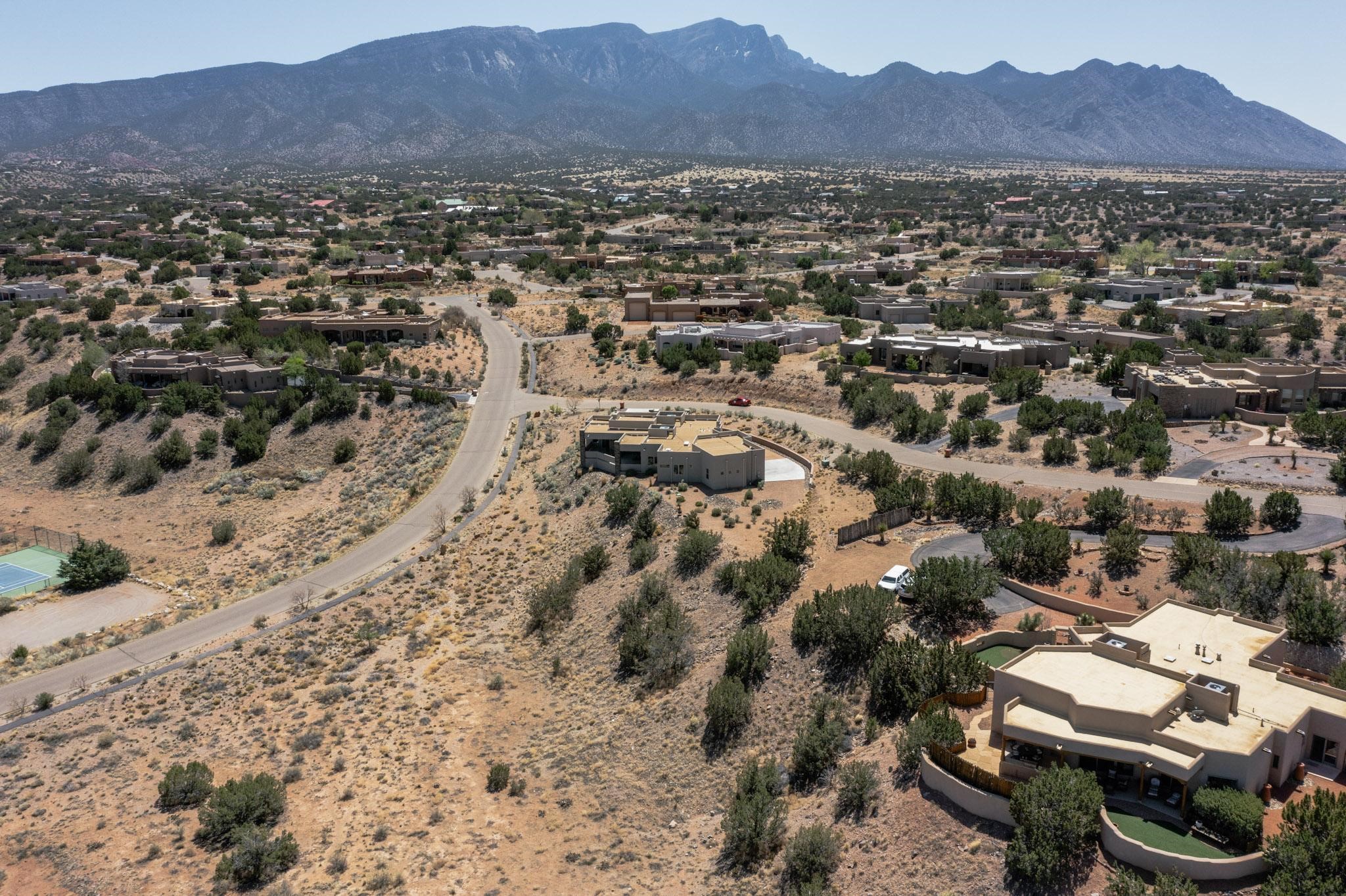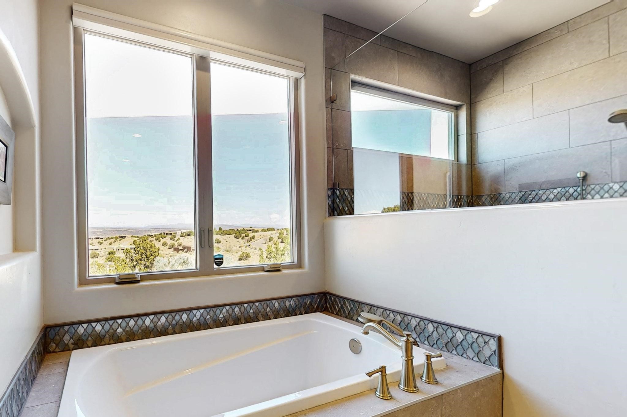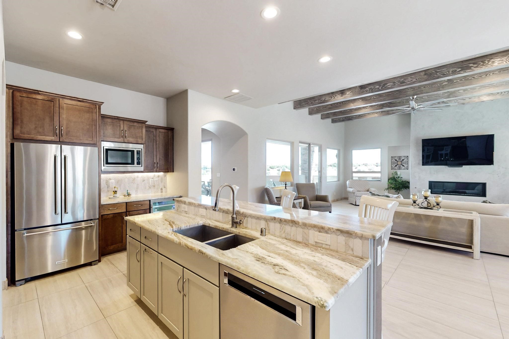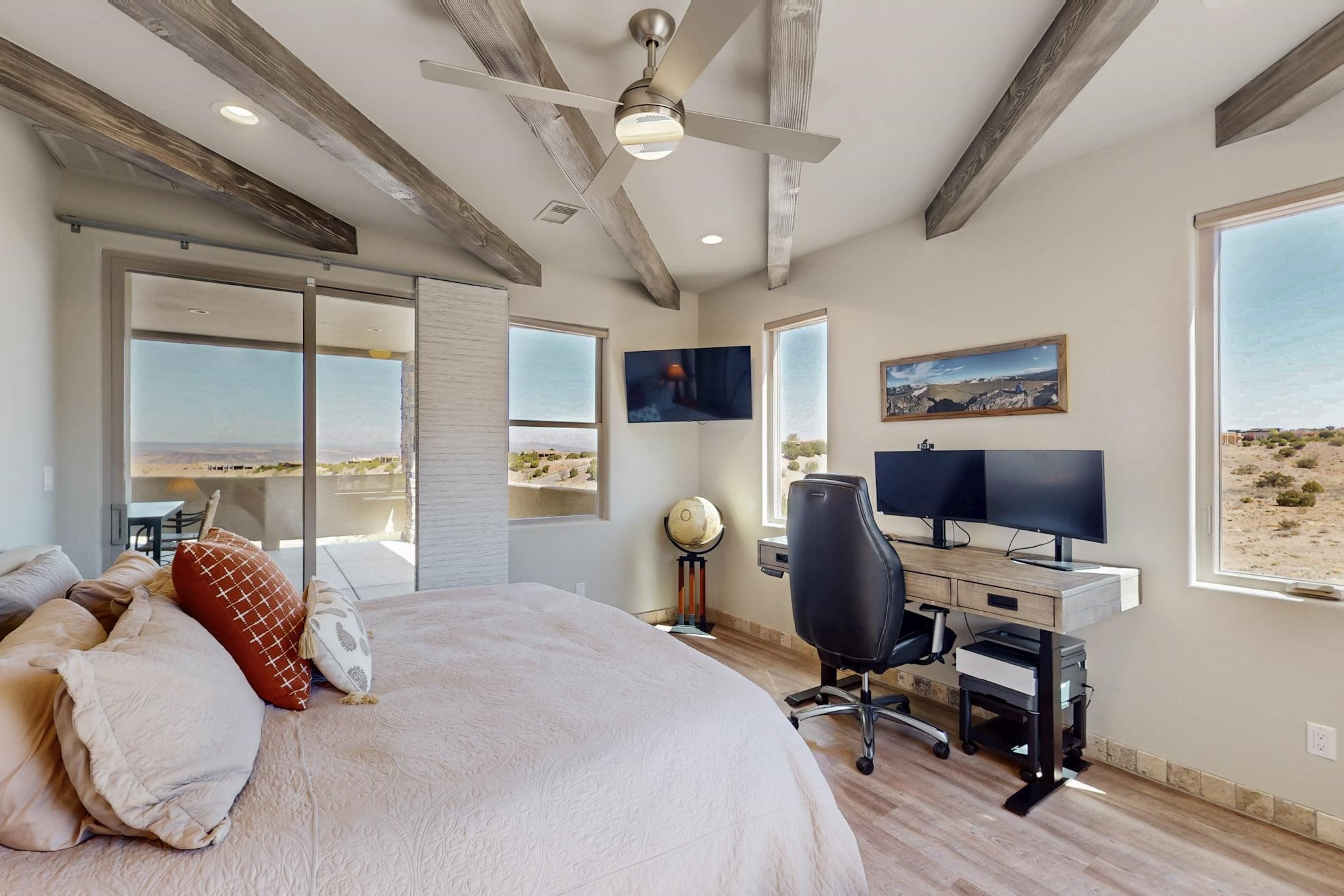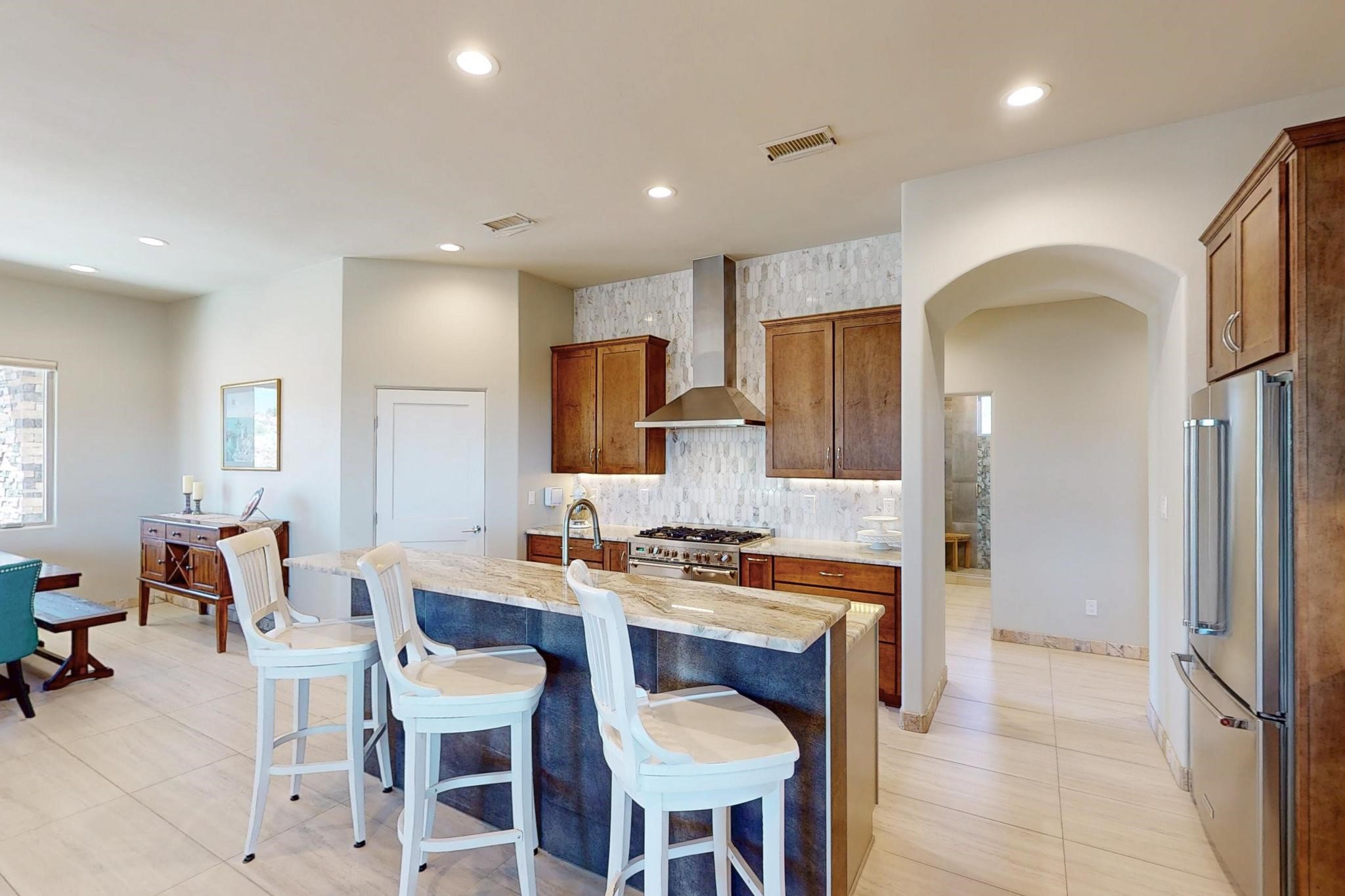 Experience the perfect balance of elegance, comfort, and functionality in this custom built 2022 Parade of Homes award winning home. Ideally situated on a 1.71-acre cul-de-sac lot in the prestigious Anasazi Trails subdivision, this thoughtfully designed single-level 2,850 sq ft residence is a rare find. Featuring 3 bedrooms, 3 bathrooms, and 2 spacious living areas, the home's open, split-bedroom floorplan offers both privacy and versatility. The luxurious primary suite and ensuite guest room are thoughtfully placed and perfect for multigenerational living or hosting out-of-town guests. Soak in the beauty of New Mexico's natural landscape from every angle. Strategically placed large windows provide lots of natural light and frame breathtaking views of the Sandia Mountains, Jemez Mesas, and the Rio Grande Valley. The family room highlights include beam ceilings and a sleek linear direct-vent fireplace, while the formal dining and living areas offer the perfect backdrop for gathering and entertaining. At the heart of the home, the gourmet kitchen is a chef's dream with granite countertops and stylish tile backsplash, stainless steel appliances including a 5-burner gas stove with double ovens and a beverage cooler, walk-in pantry, breakfast bar, and ample cabinetry for storage and organization. The primary suite is a private retreat, complete with backyard patio access, beam ceilings and a spa-like bathroom including dual vanities, soaking tub, large shower room with rainfall shower heads, and 2 walk-in closets with built-in shelving. Additional features include an 880 sq ft covered patio with multiple sliders and built-in speakers perfect for outdoor entertaining while enjoying panoramic views, a massive 3-car garage, an oversized laundry room with utility sink, cabinets and countertop space, a tankless hot water heater system, 36" tile and laminate flooring throughout, and a built-in Yamaha MusicCast sound system. Anasazi Trails offers a peaceful lifestyle with community tennis and pickleball courts and walking trails to explore the natural beauty of Placitas. With clean, contemporary lines, high-end finishes, and unparalleled craftsmanship, this home is truly one of a kind. Don't miss the opportunity to make this your Dream Home!