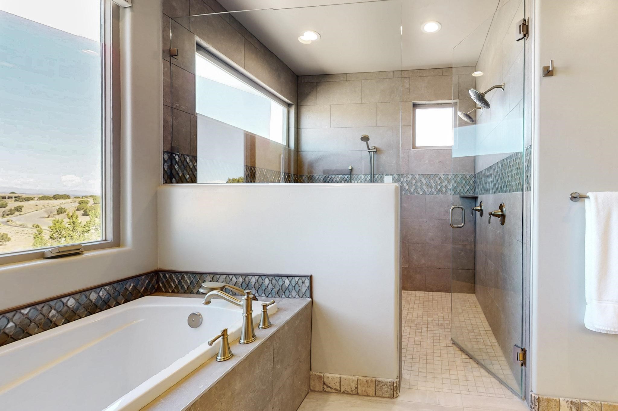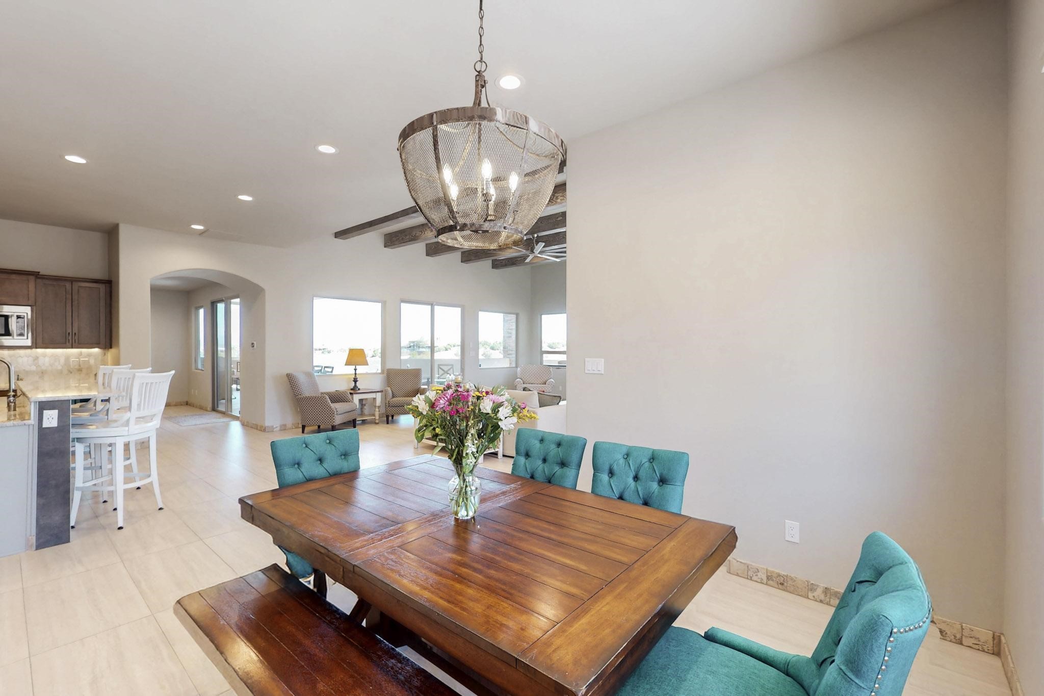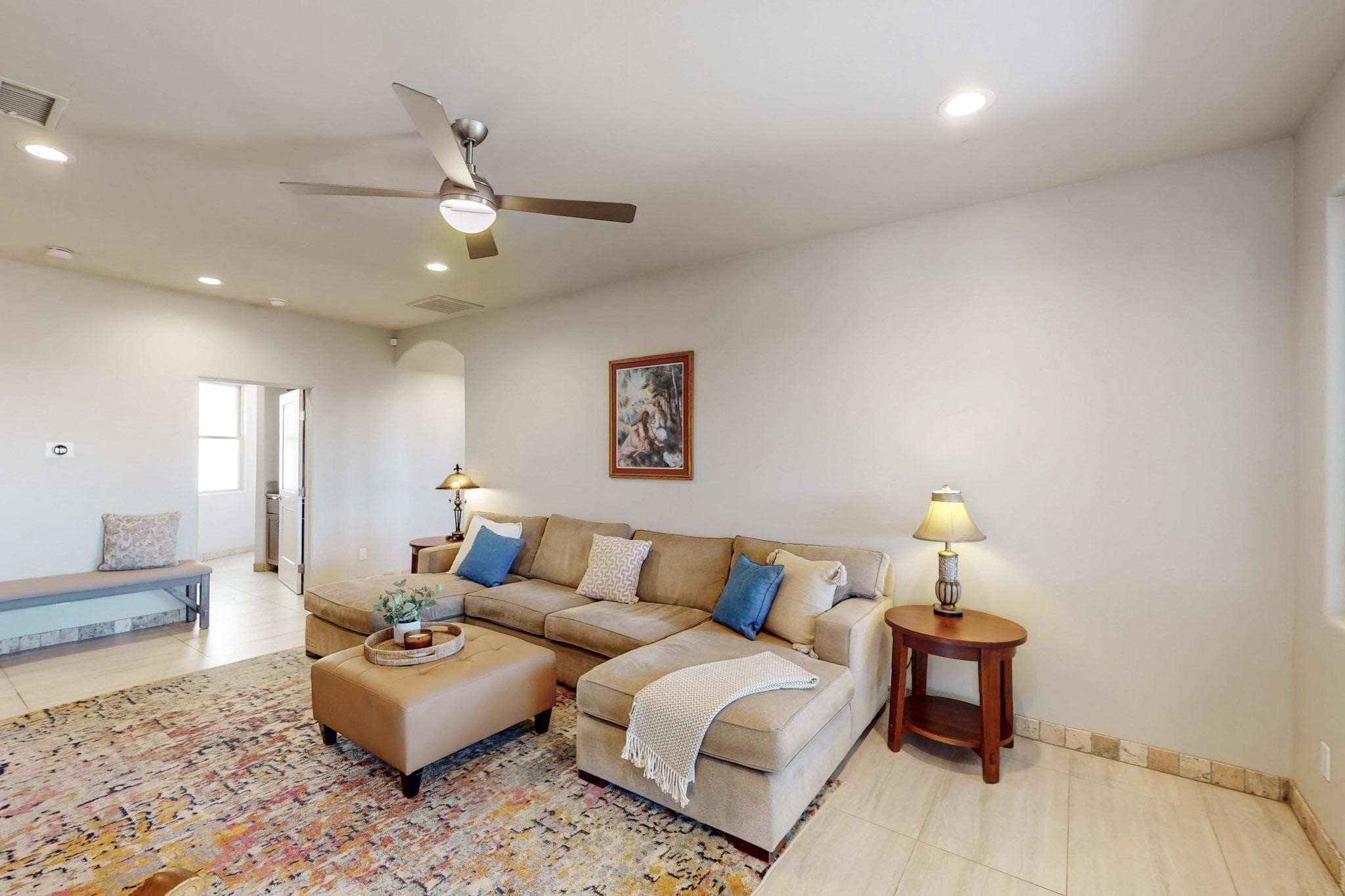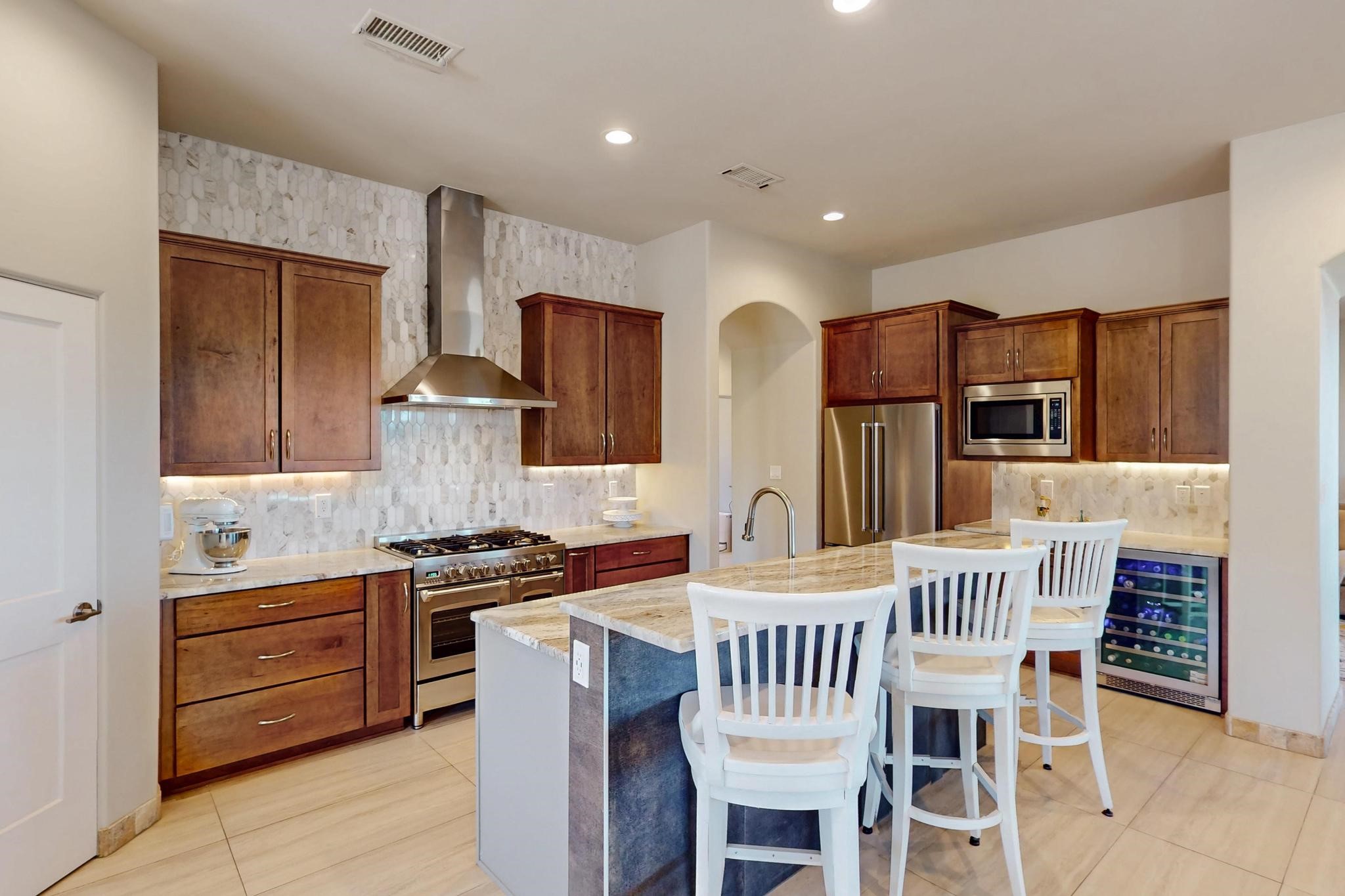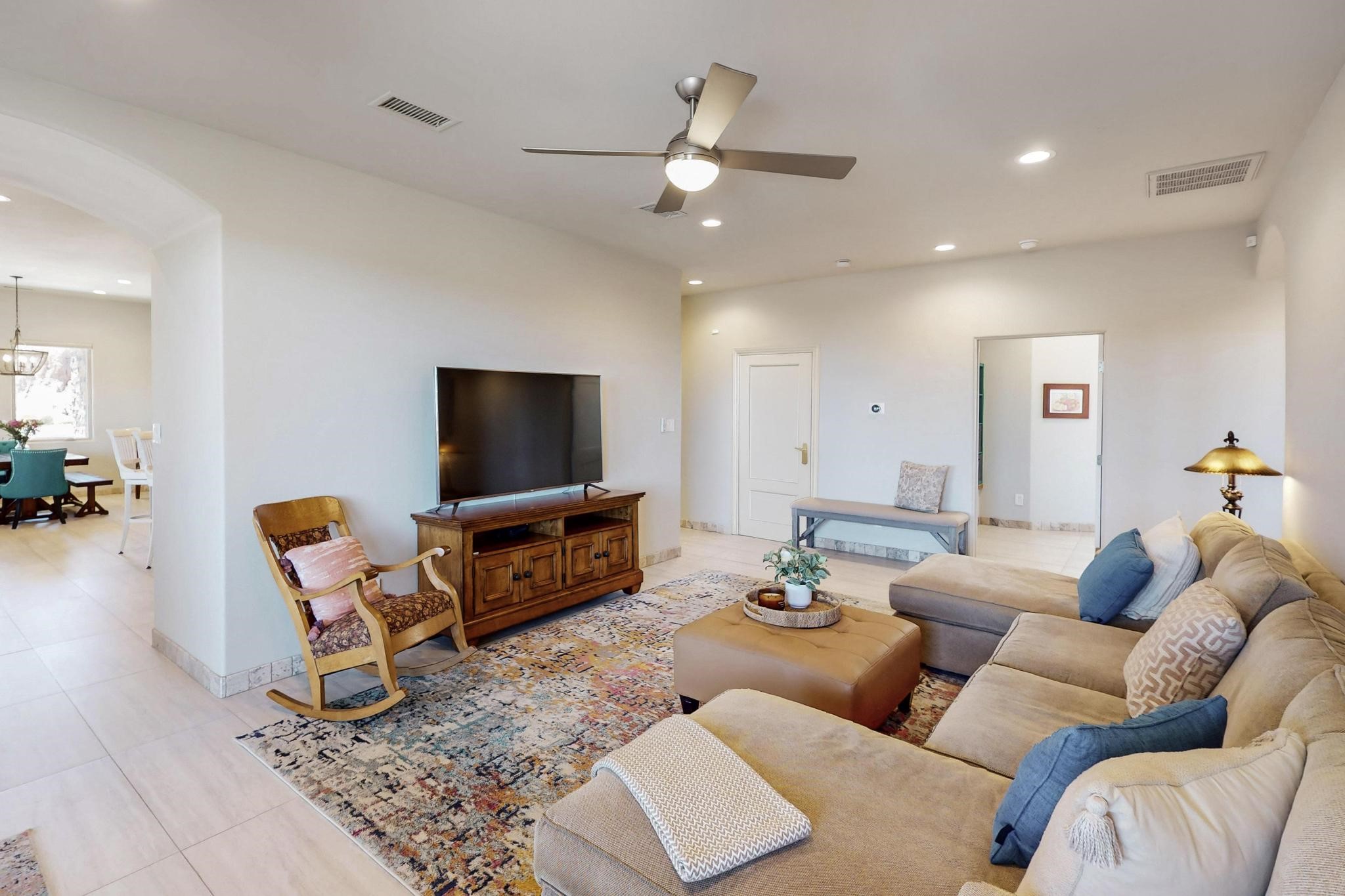 Experience the perfect balance of elegance, comfort, and functionality in this custom built 2022 Parade of Homes award winning home. Ideally situated on a 1.71-acre cul-de-sac lot in the prestigious Anasazi Trails subdivision, this thoughtfully designed single-level 2,850 sq ft residence is a rare find. Featuring 3 bedrooms, 3 bathrooms, and 2 spacious living areas, the home's open, split-bedroom floorplan offers both privacy and versatility. The luxurious primary suite and ensuite guest room are thoughtfully placed and perfect for multigenerational living or hosting out-of-town guests. Soak in the beauty of New Mexico's natural landscape from every angle. Strategically placed large windows provide lots of natural light and frame breathtaking views of the Sandia Mountains, Jemez Mesas, and the Rio Grande Valley. The family room highlights include beam ceilings and a sleek linear direct-vent fireplace, while the formal dining and living areas offer the perfect backdrop for gathering and entertaining. At the heart of the home, the gourmet kitchen is a chef's dream with granite countertops and stylish tile backsplash, stainless steel appliances including a 5-burner gas stove with double ovens and a beverage cooler, walk-in pantry, breakfast bar, and ample cabinetry for storage and organization. The primary suite is a private retreat, complete with backyard patio access, beam ceilings and a spa-like bathroom including dual vanities, soaking tub, large shower room with rainfall shower heads, and 2 walk-in closets with built-in shelving. Additional features include an 880 sq ft covered patio with multiple sliders and built-in speakers perfect for outdoor entertaining while enjoying panoramic views, a massive 3-car garage, an oversized laundry room with utility sink, cabinets and countertop space, a tankless hot water heater system, 36" tile and laminate flooring throughout, and a built-in Yamaha MusicCast sound system. Anasazi Trails offers a peaceful lifestyle with community tennis and pickleball courts and walking trails to explore the natural beauty of Placitas. With clean, contemporary lines, high-end finishes, and unparalleled craftsmanship, this home is truly one of a kind. Don't miss the opportunity to make this your Dream Home!