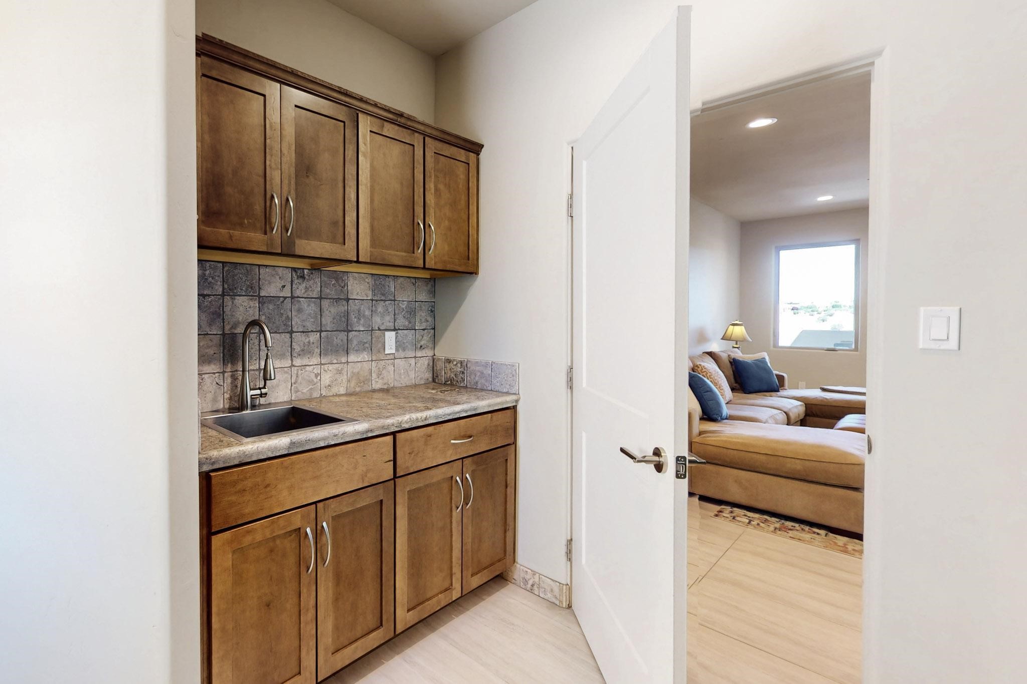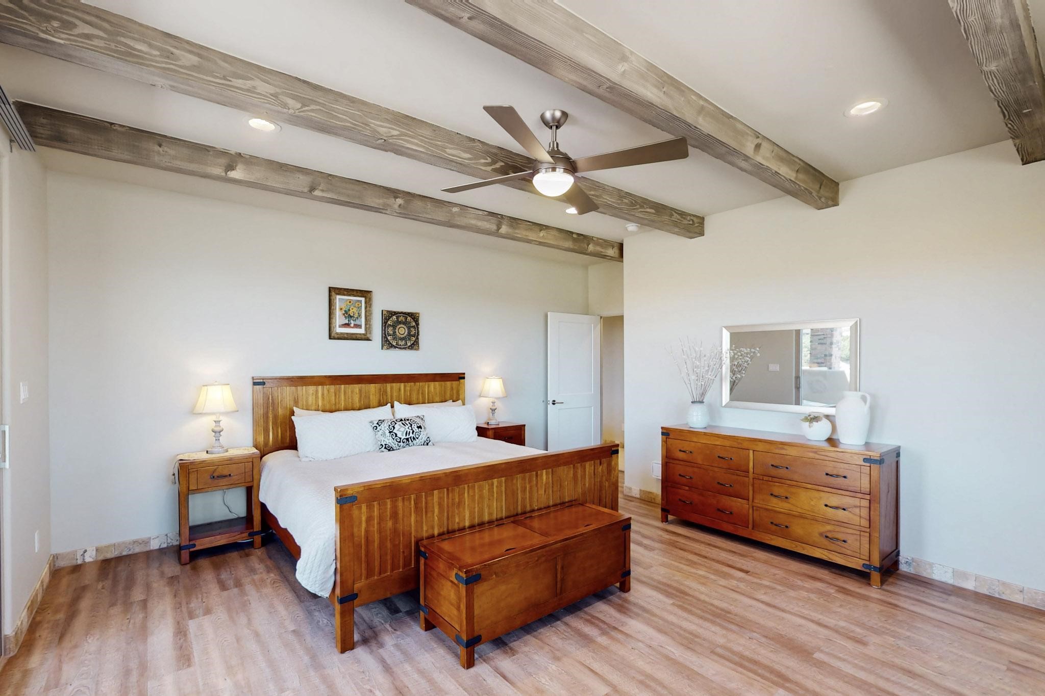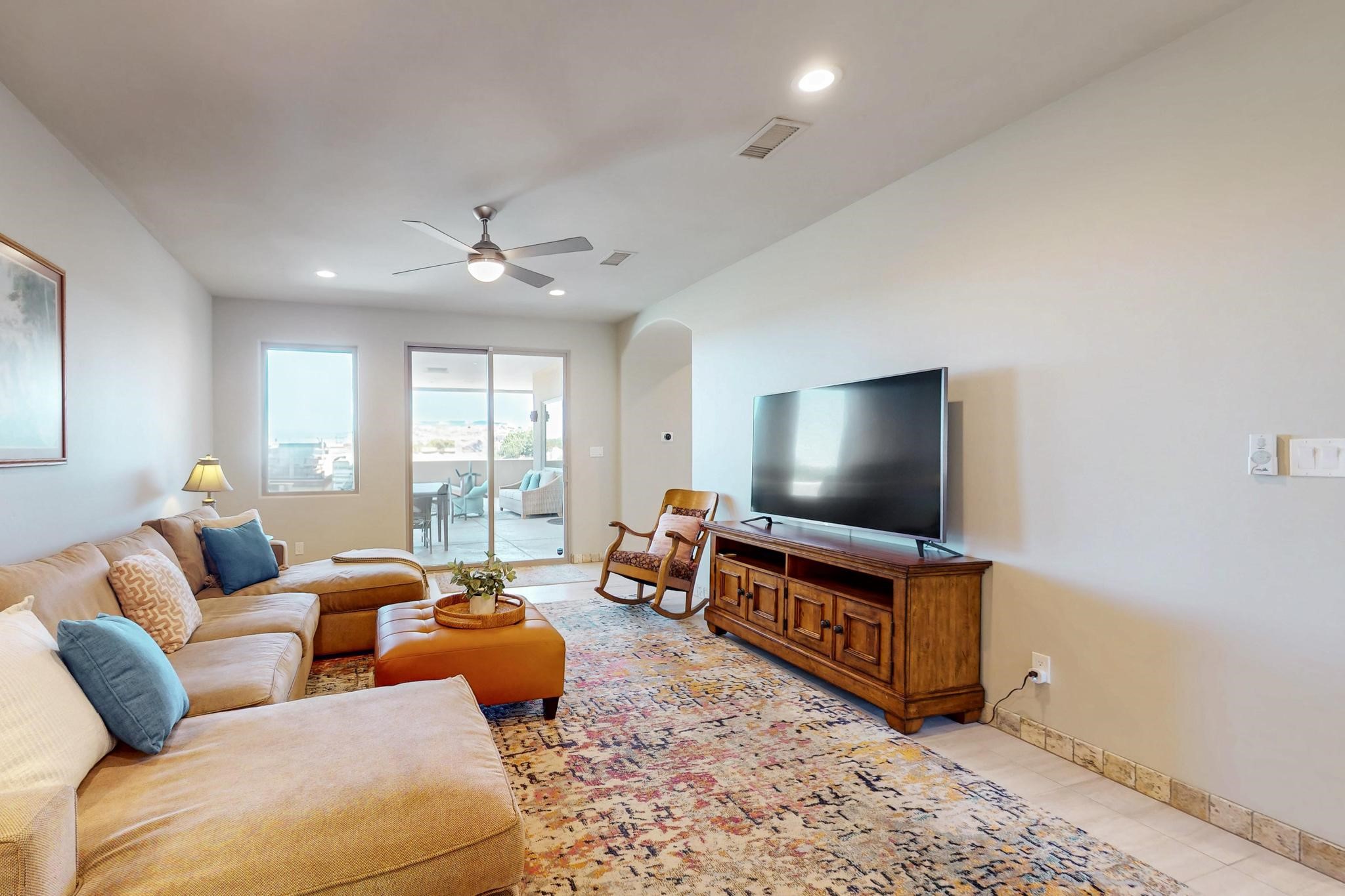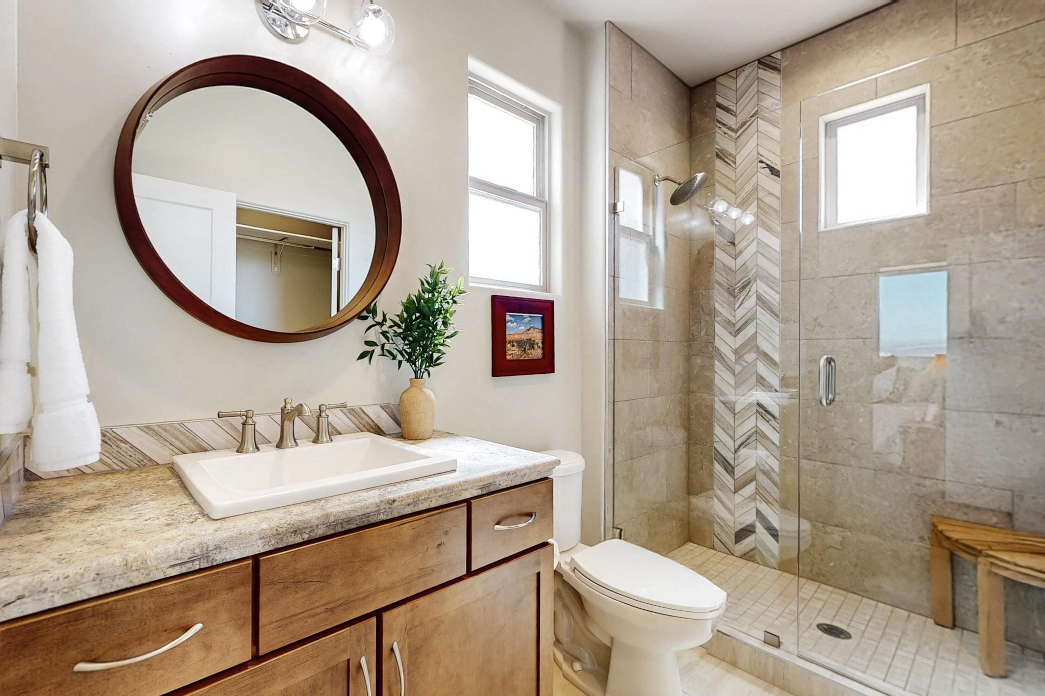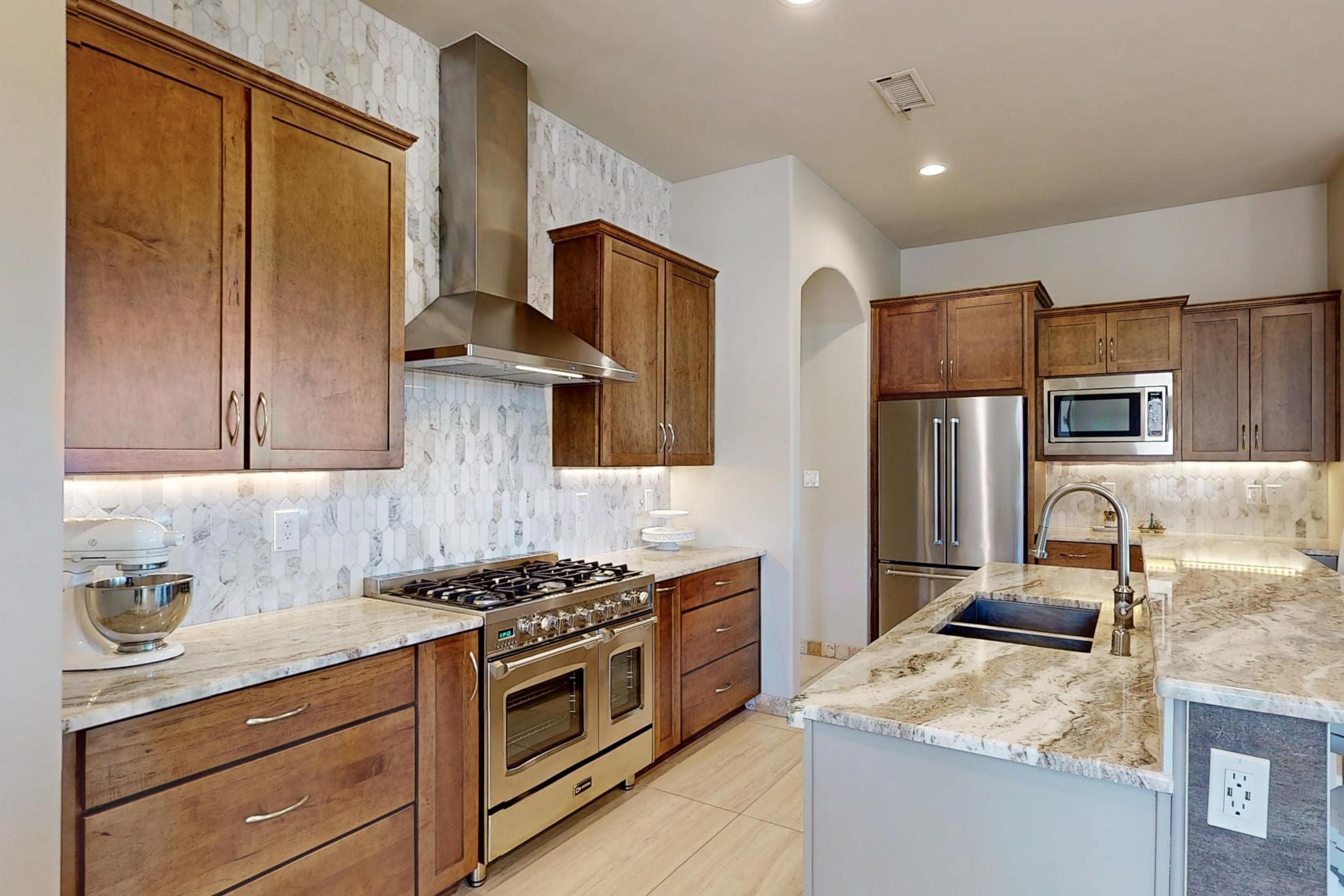 Experience the perfect balance of elegance, comfort, and functionality in this custom built 2022 Parade of Homes award winning home. Ideally situated on a 1.71-acre cul-de-sac lot in the prestigious Anasazi Trails subdivision, this thoughtfully designed single-level 2,850 sq ft residence is a rare find. Featuring 3 bedrooms, 3 bathrooms, and 2 spacious living areas, the home's open, split-bedroom floorplan offers both privacy and versatility. The luxurious primary suite and ensuite guest room are thoughtfully placed and perfect for multigenerational living or hosting out-of-town guests. Soak in the beauty of New Mexico's natural landscape from every angle. Strategically placed large windows provide lots of natural light and frame breathtaking views of the Sandia Mountains, Jemez Mesas, and the Rio Grande Valley. The family room highlights include beam ceilings and a sleek linear direct-vent fireplace, while the formal dining and living areas offer the perfect backdrop for gathering and entertaining. At the heart of the home, the gourmet kitchen is a chef's dream with granite countertops and stylish tile backsplash, stainless steel appliances including a 5-burner gas stove with double ovens and a beverage cooler, walk-in pantry, breakfast bar, and ample cabinetry for storage and organization. The primary suite is a private retreat, complete with backyard patio access, beam ceilings and a spa-like bathroom including dual vanities, soaking tub, large shower room with rainfall shower heads, and 2 walk-in closets with built-in shelving. Additional features include an 880 sq ft covered patio with multiple sliders and built-in speakers perfect for outdoor entertaining while enjoying panoramic views, a massive 3-car garage, an oversized laundry room with utility sink, cabinets and countertop space, a tankless hot water heater system, 36" tile and laminate flooring throughout, and a built-in Yamaha MusicCast sound system. Anasazi Trails offers a peaceful lifestyle with community tennis and pickleball courts and walking trails to explore the natural beauty of Placitas. With clean, contemporary lines, high-end finishes, and unparalleled craftsmanship, this home is truly one of a kind. Don't miss the opportunity to make this your Dream Home!