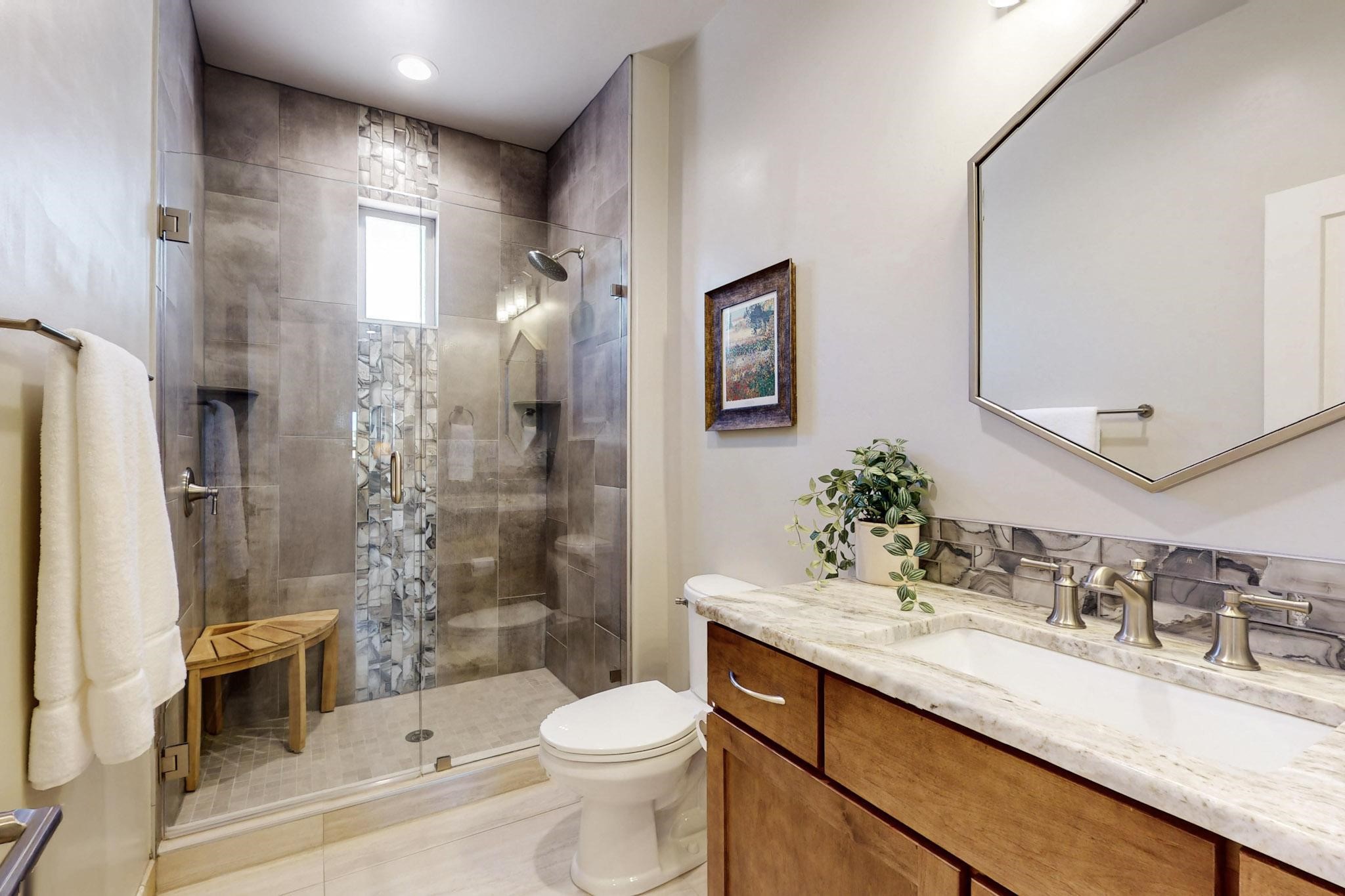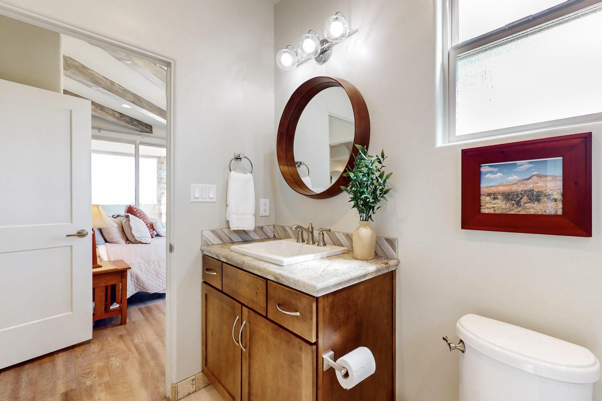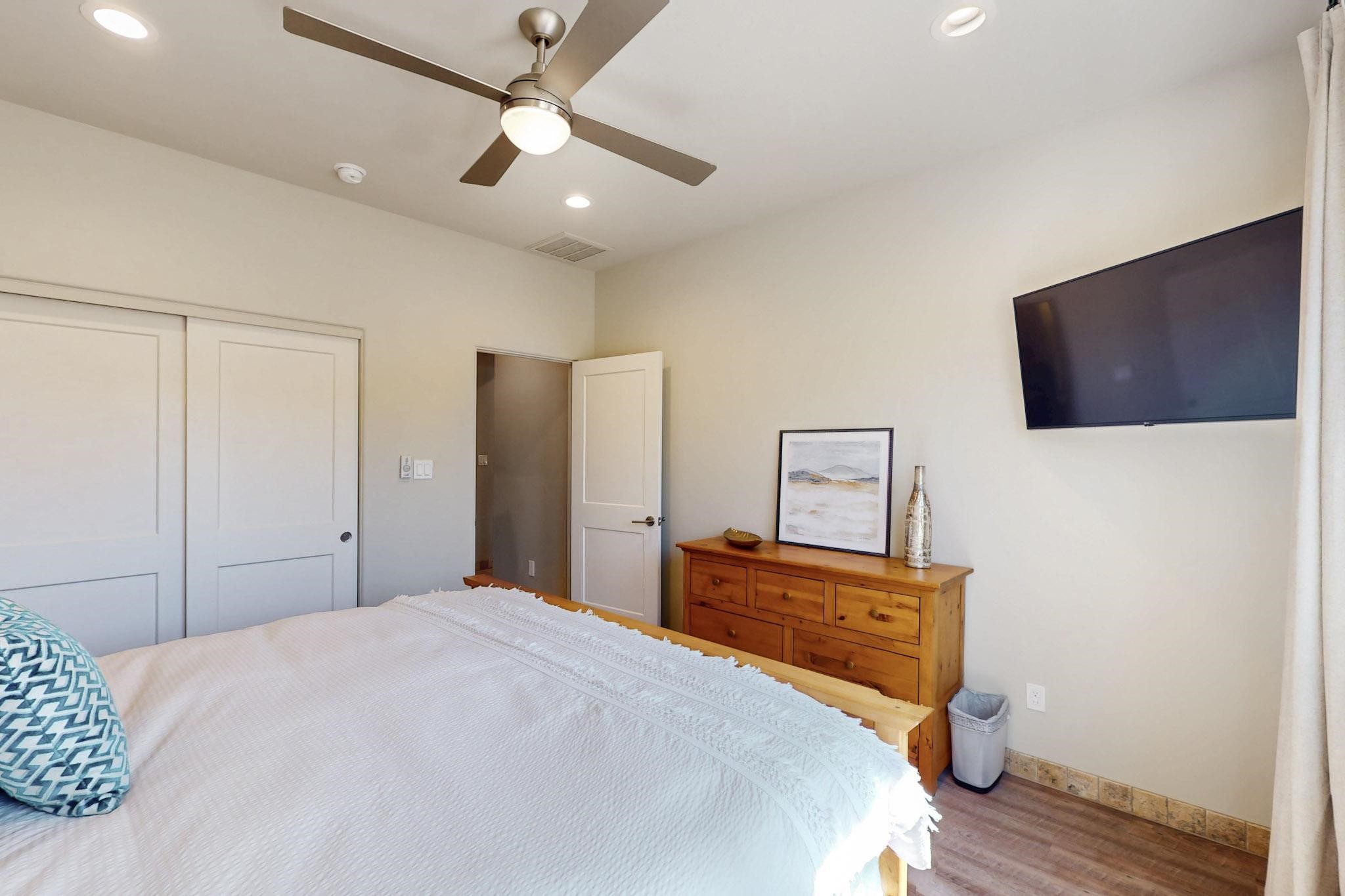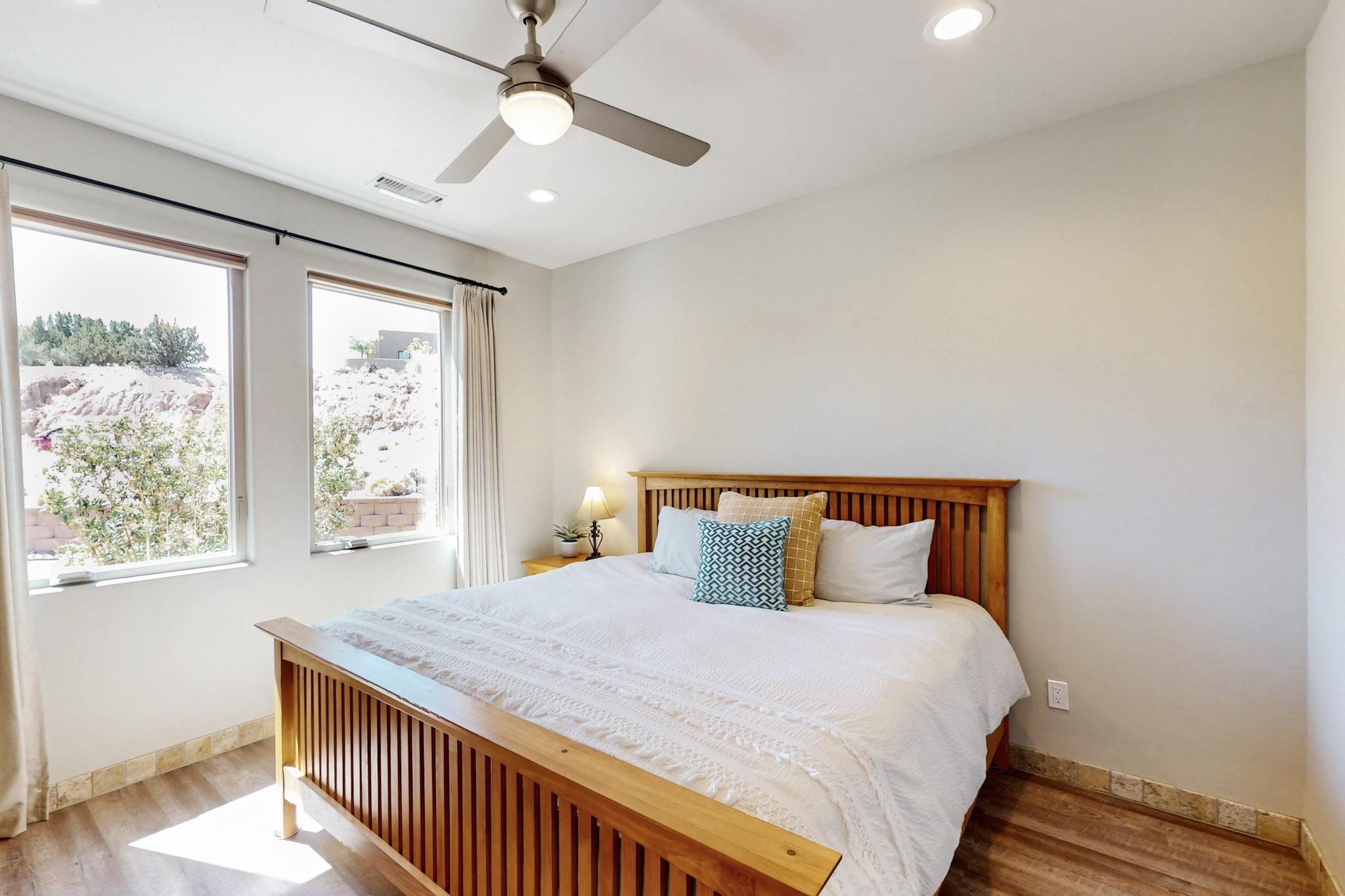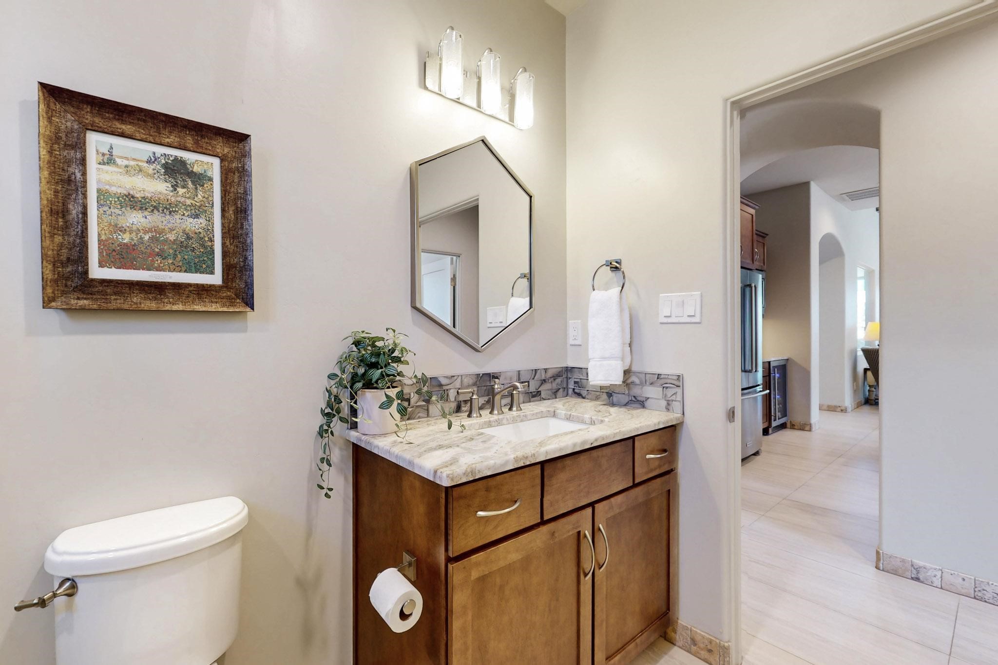 Experience the perfect balance of elegance, comfort, and functionality in this custom built 2022 Parade of Homes award winning home. Ideally situated on a 1.71-acre cul-de-sac lot in the prestigious Anasazi Trails subdivision, this thoughtfully designed single-level 2,850 sq ft residence is a rare find. Featuring 3 bedrooms, 3 bathrooms, and 2 spacious living areas, the home's open, split-bedroom floorplan offers both privacy and versatility. The luxurious primary suite and ensuite guest room are thoughtfully placed and perfect for multigenerational living or hosting out-of-town guests. Soak in the beauty of New Mexico's natural landscape from every angle. Strategically placed large windows provide lots of natural light and frame breathtaking views of the Sandia Mountains, Jemez Mesas, and the Rio Grande Valley. The family room highlights include beam ceilings and a sleek linear direct-vent fireplace, while the formal dining and living areas offer the perfect backdrop for gathering and entertaining. At the heart of the home, the gourmet kitchen is a chef's dream with granite countertops and stylish tile backsplash, stainless steel appliances including a 5-burner gas stove with double ovens and a beverage cooler, walk-in pantry, breakfast bar, and ample cabinetry for storage and organization. The primary suite is a private retreat, complete with backyard patio access, beam ceilings and a spa-like bathroom including dual vanities, soaking tub, large shower room with rainfall shower heads, and 2 walk-in closets with built-in shelving. Additional features include an 880 sq ft covered patio with multiple sliders and built-in speakers perfect for outdoor entertaining while enjoying panoramic views, a massive 3-car garage, an oversized laundry room with utility sink, cabinets and countertop space, a tankless hot water heater system, 36" tile and laminate flooring throughout, and a built-in Yamaha MusicCast sound system. Anasazi Trails offers a peaceful lifestyle with community tennis and pickleball courts and walking trails to explore the natural beauty of Placitas. With clean, contemporary lines, high-end finishes, and unparalleled craftsmanship, this home is truly one of a kind. Don't miss the opportunity to make this your Dream Home!