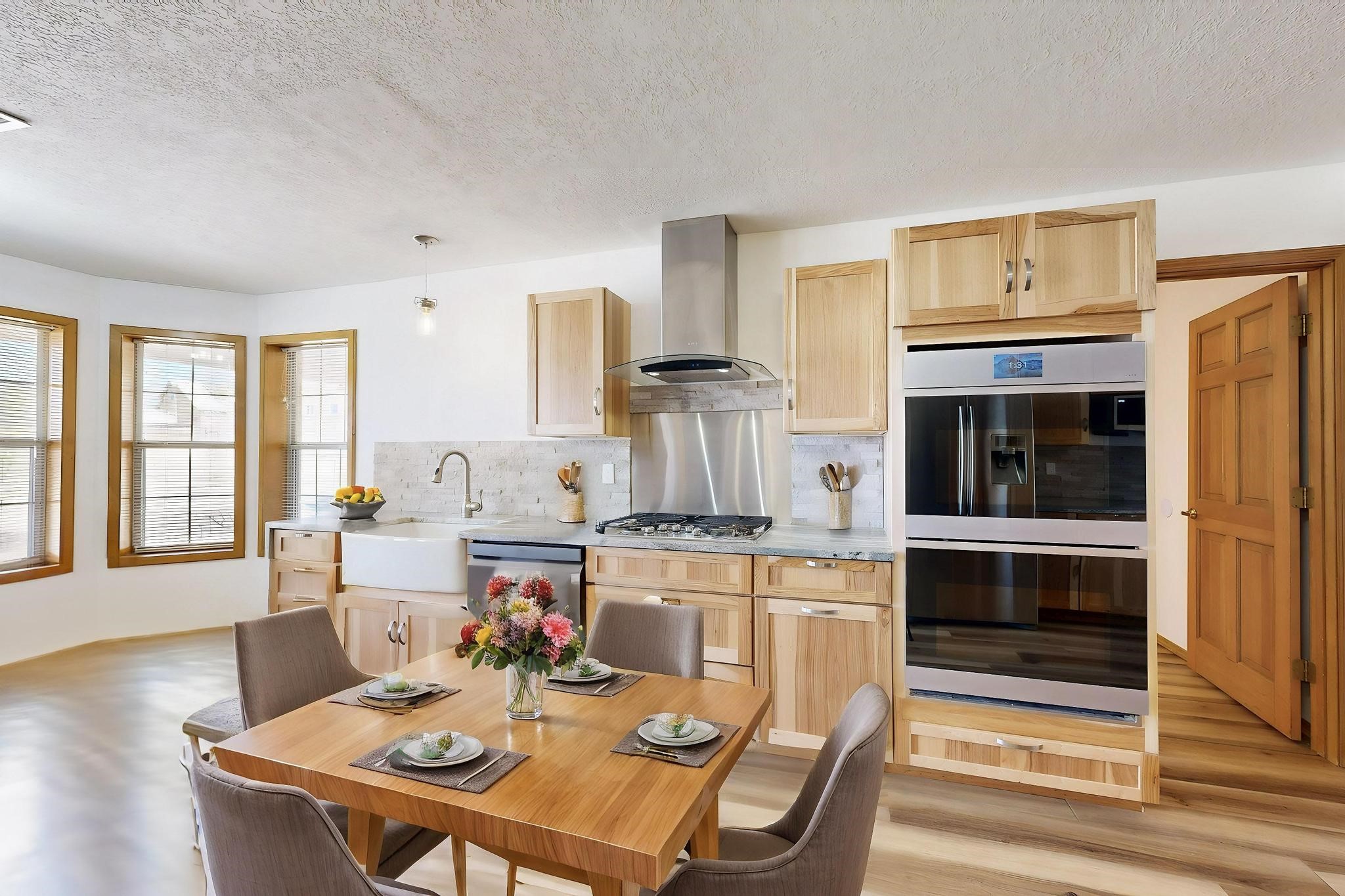 Set on a spacious 0.89-acre lot in the highly desirable North Albuquerque Acres, this nicely maintained single-story brick home offers breathtaking Sandia Mountain views and a thoughtfully designed layout perfect for comfortable living. Spanning 3,376 square feet, this home features 4 bedrooms, 3 bathrooms, two living areas plus a versatile flex room, perfect for work or play. The formal living and dining rooms provide an inviting space for entertaining, while the cozy family room with a wood-burning fireplace seamlessly flows into the eat-in kitchen with a charming bay window. The newly renovated kitchen boasts engineered hardwood flooring, marble countertops with a stone backsplash, a farmhouse sink, ample cabinet space, a 5-burner gas cooktop with range hood, and stainless-steel appliances, including double ovens, a dishwasher, and a refrigerator. A matching marble dining table with four chairs completes this stylish space. The primary suite offers a peaceful retreat with his-and-hers walk-in closets, dual vanities, a jetted tub, and a large shower. Three additional spacious bedrooms, all with walk-in closets, share a full bath with double sinks. Step outside to enjoy covered front and back porches, a pergola-covered hot tub, a children's play area, a tool/well room, and a barn with stalls--all within a fully fenced property. The 5-car tandem garage offers ample storage, while owned solar panels and propane provide energy efficiency. Conveniently located near top-rated schools, hiking and biking trails, and Tramway Blvd, this inviting home is perfect for both living and entertaining, combining comfort and style in one exceptional package. Don't miss the opportunity to make this your ABQ Dream Home!