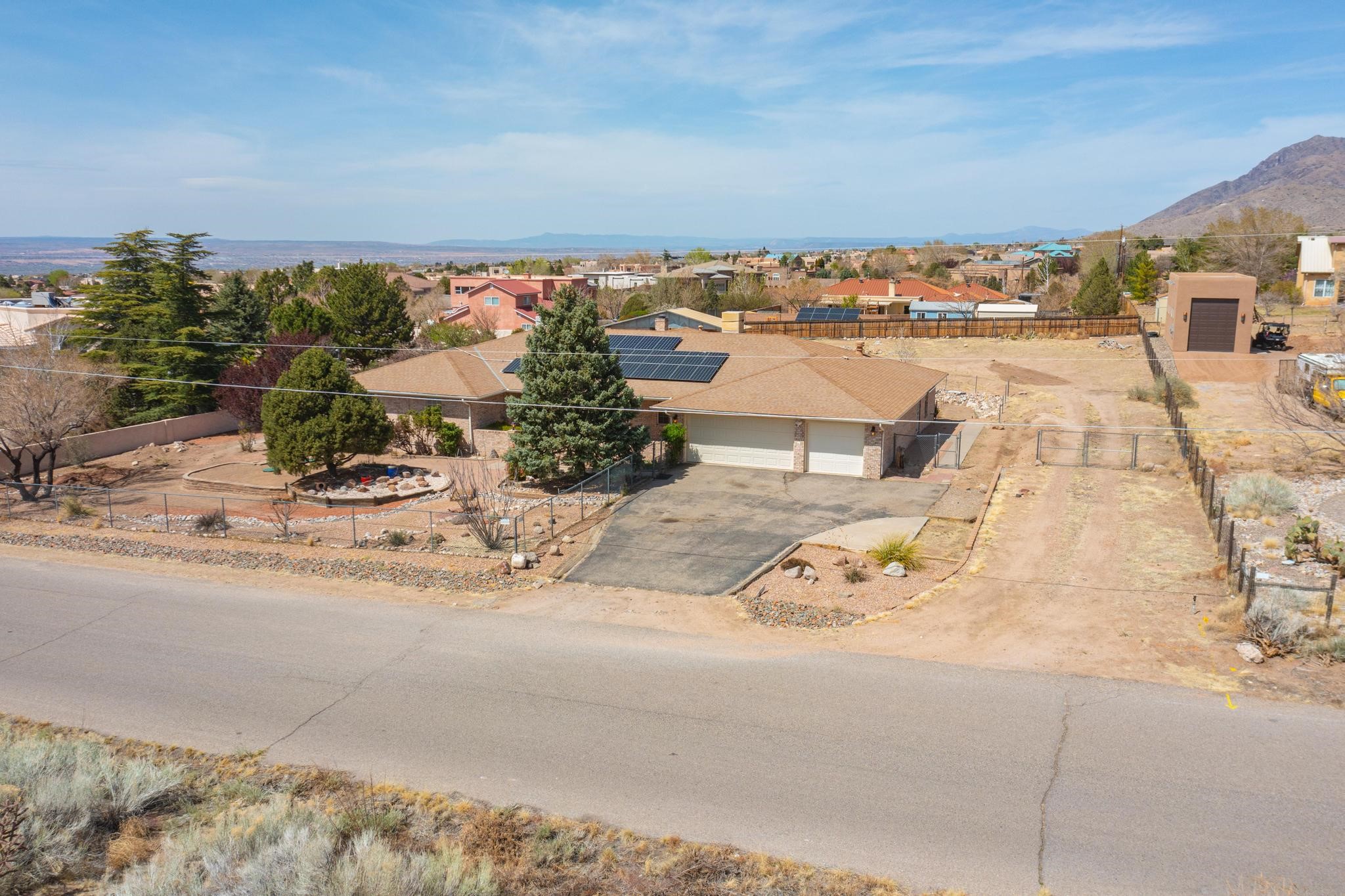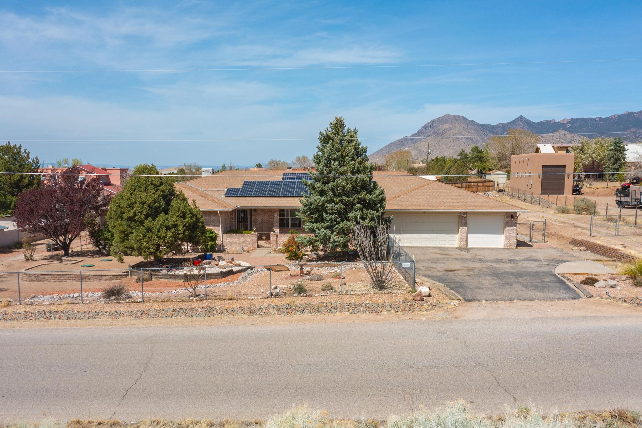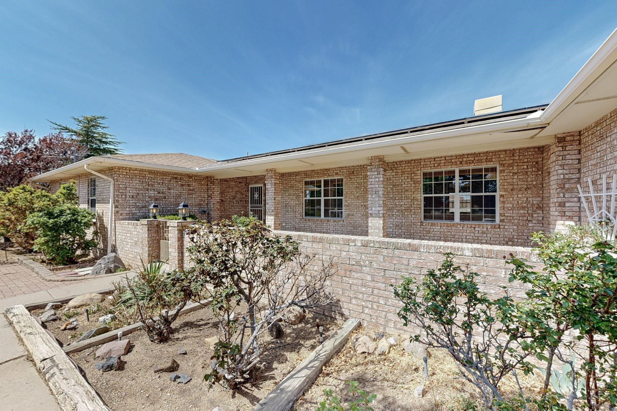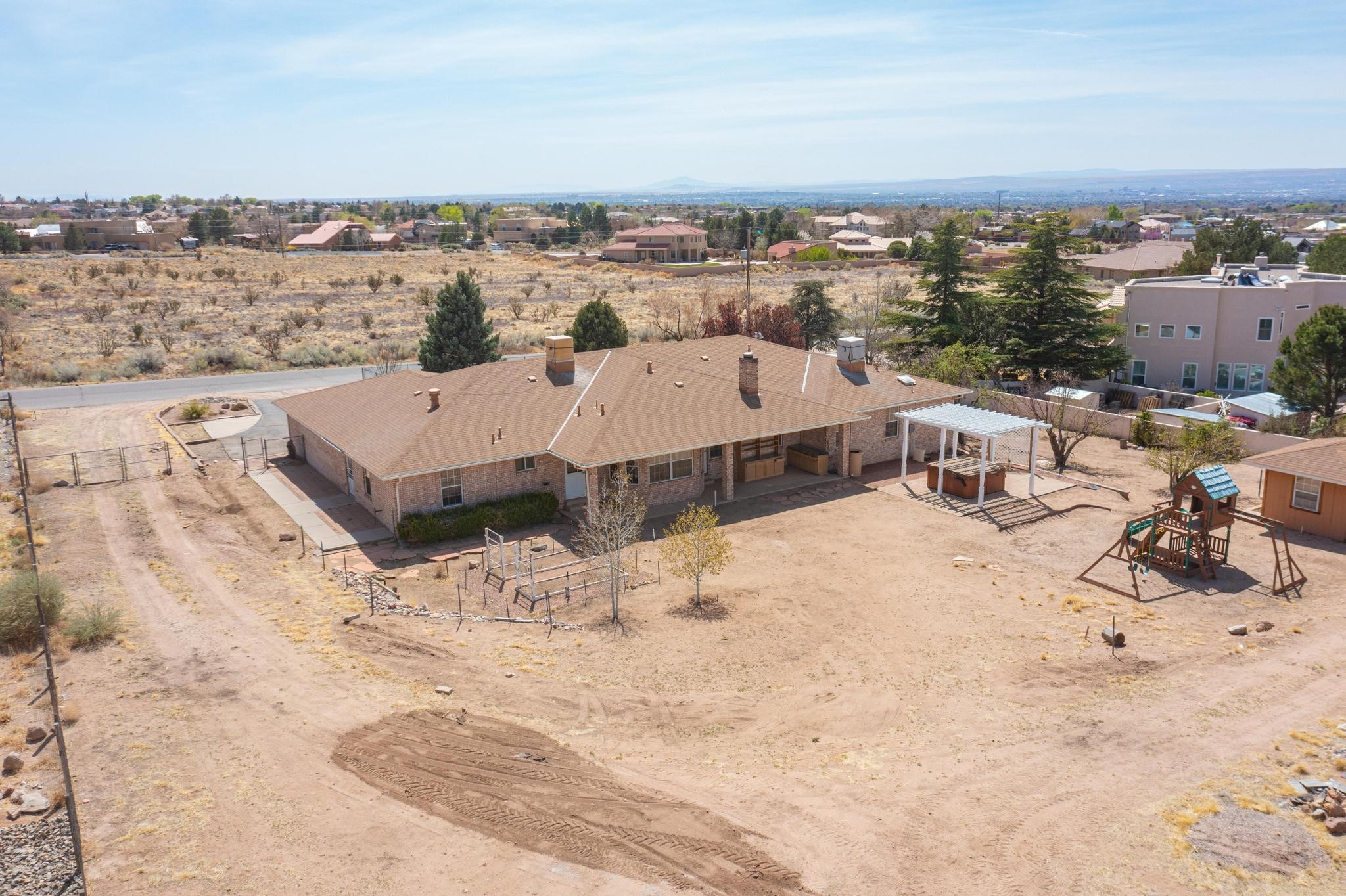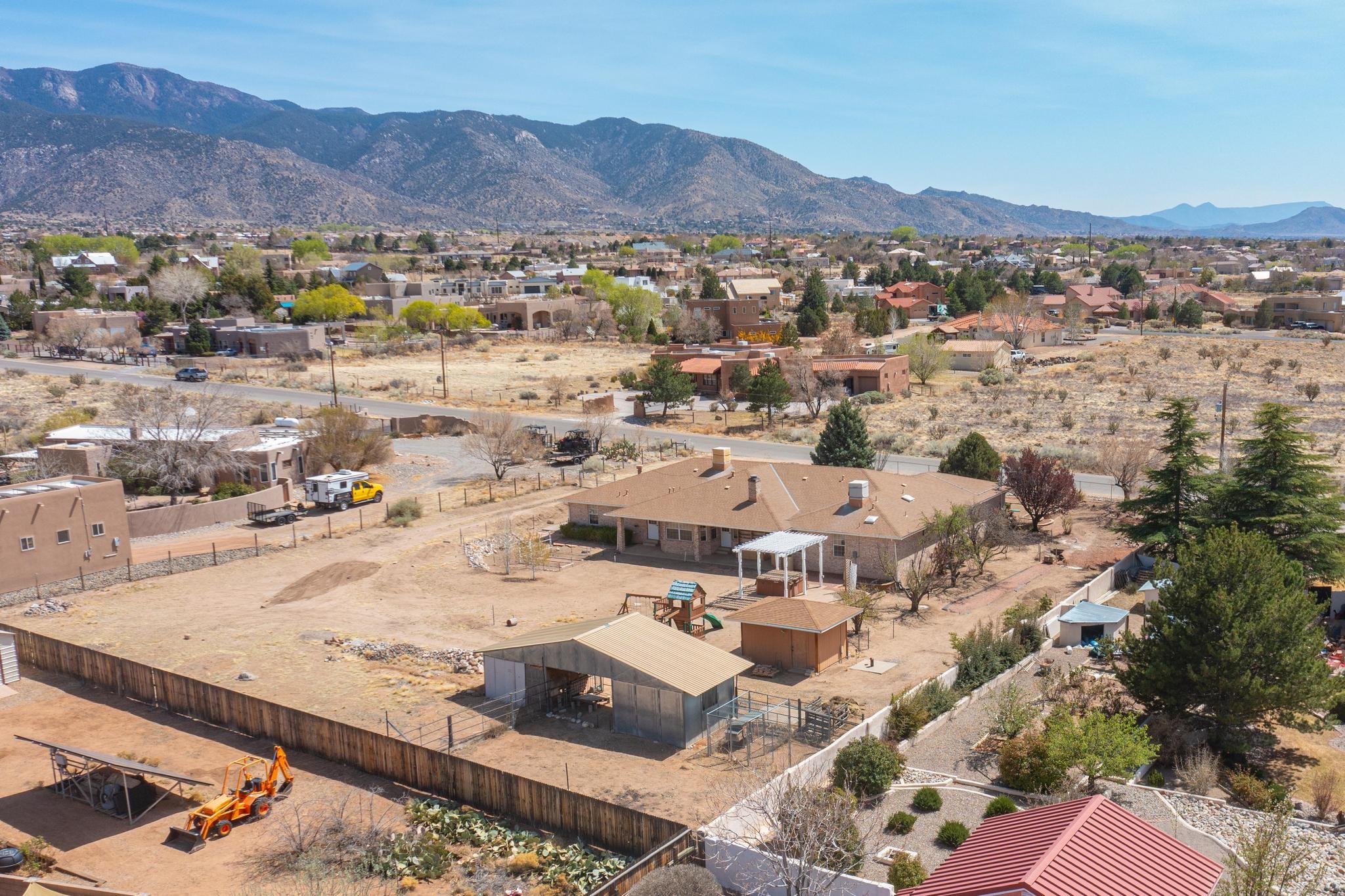 Set on a spacious 0.89-acre lot in the highly desirable North Albuquerque Acres, this nicely maintained single-story brick home offers breathtaking Sandia Mountain views and a thoughtfully designed layout perfect for comfortable living. Spanning 3,376 square feet, this home features 4 bedrooms, 3 bathrooms, two living areas plus a versatile flex room, perfect for work or play. The formal living and dining rooms provide an inviting space for entertaining, while the cozy family room with a wood-burning fireplace seamlessly flows into the eat-in kitchen with a charming bay window. The newly renovated kitchen boasts engineered hardwood flooring, marble countertops with a stone backsplash, a farmhouse sink, ample cabinet space, a 5-burner gas cooktop with range hood, and stainless-steel appliances, including double ovens, a dishwasher, and a refrigerator. A matching marble dining table with four chairs completes this stylish space. The primary suite offers a peaceful retreat with his-and-hers walk-in closets, dual vanities, a jetted tub, and a large shower. Three additional spacious bedrooms, all with walk-in closets, share a full bath with double sinks. Step outside to enjoy covered front and back porches, a pergola-covered hot tub, a children's play area, a tool/well room, and a barn with stalls--all within a fully fenced property. The 5-car tandem garage offers ample storage, while owned solar panels and propane provide energy efficiency. Conveniently located near top-rated schools, hiking and biking trails, and Tramway Blvd, this inviting home is perfect for both living and entertaining, combining comfort and style in one exceptional package. Don't miss the opportunity to make this your ABQ Dream Home!
