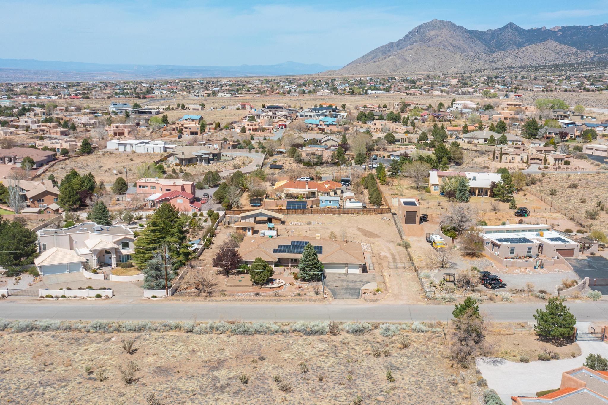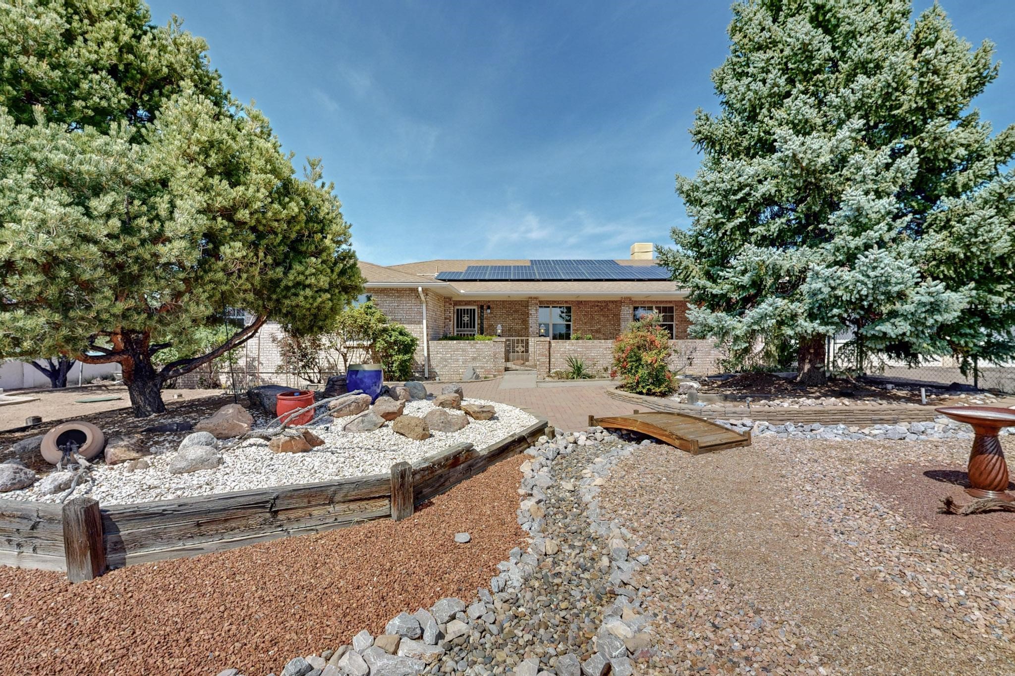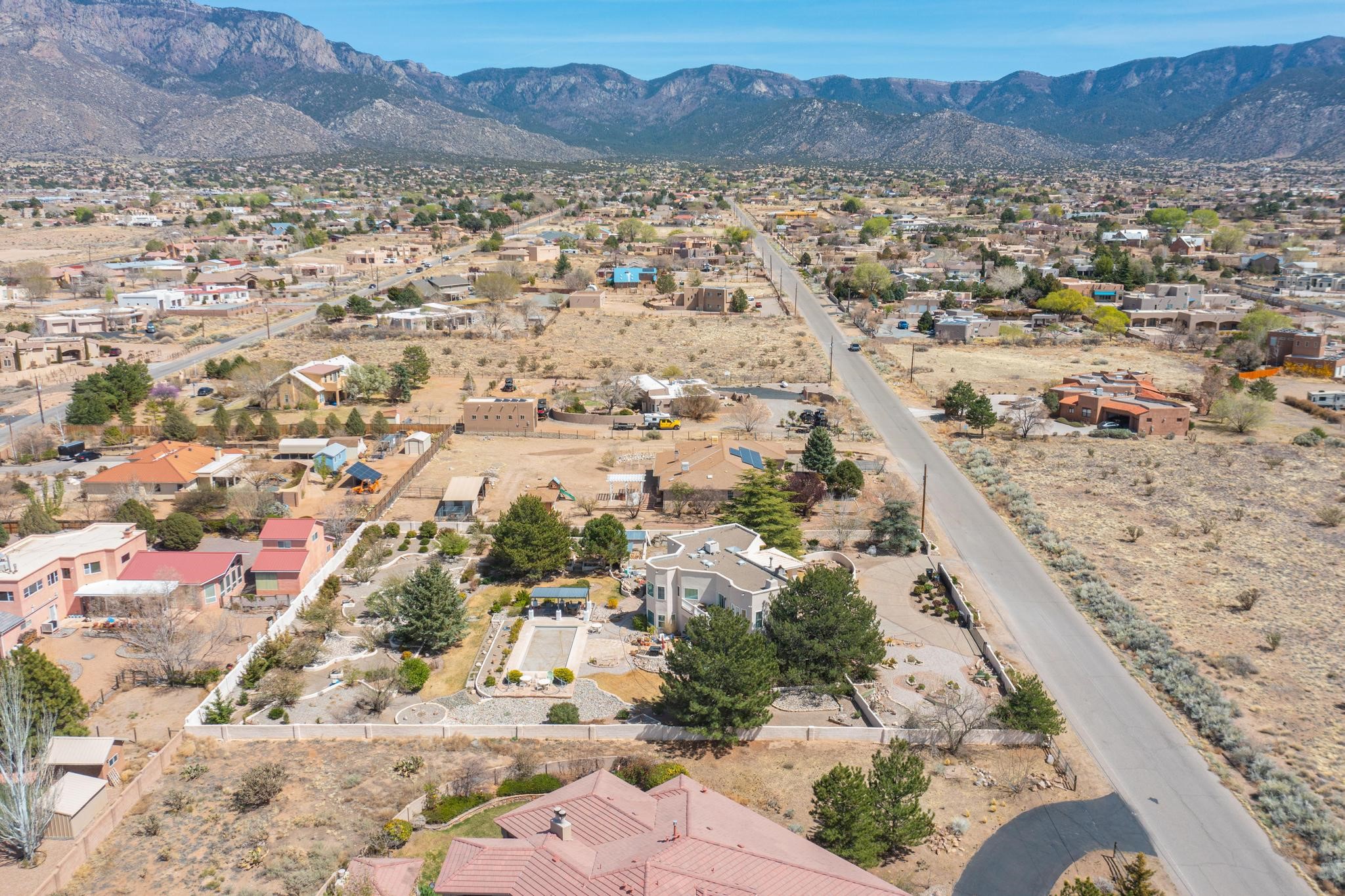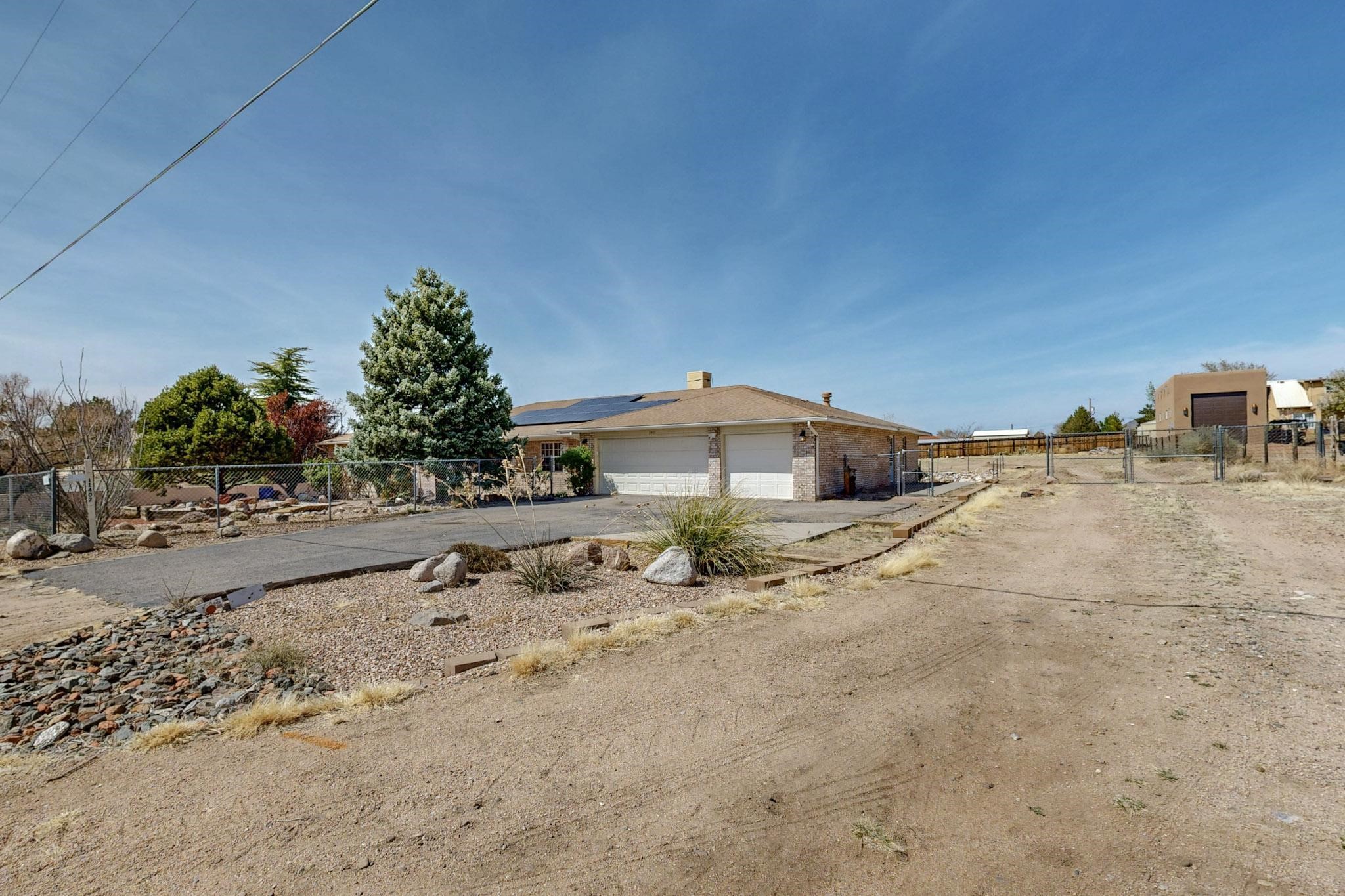Set on a spacious 0.89-acre lot in the highly desirable North Albuquerque Acres, this nicely maintained single-story brick home offers breathtaking Sandia Mountain views and a thoughtfully designed layout perfect for comfortable living. Spanning 3,376 square feet, this home features 4 bedrooms, 3 bathrooms, two living areas plus a versatile flex room, perfect for work or play. The formal living and dining rooms provide an inviting space for entertaining, while the cozy family room with a wood-burning fireplace seamlessly flows into the eat-in kitchen with a charming bay window. The newly renovated kitchen boasts engineered hardwood flooring, marble countertops with a stone backsplash, a farmhouse sink, ample cabinet space, a 5-burner gas cooktop with range hood, and stainless-steel appliances, including double ovens, a dishwasher, and a refrigerator. A matching marble dining table with four chairs completes this stylish space. The primary suite offers a peaceful retreat with his-and-hers walk-in closets, dual vanities, a jetted tub, and a large shower. Three additional spacious bedrooms, all with walk-in closets, share a full bath with double sinks. Step outside to enjoy covered front and back porches, a pergola-covered hot tub, a children's play area, a tool/well room, and a barn with stalls--all within a fully fenced property. The 5-car tandem garage offers ample storage, while owned solar panels and propane provide energy efficiency. Conveniently located near top-rated schools, hiking and biking trails, and Tramway Blvd, this inviting home is perfect for both living and entertaining, combining comfort and style in one exceptional package. Don't miss the opportunity to make this your ABQ Dream Home!