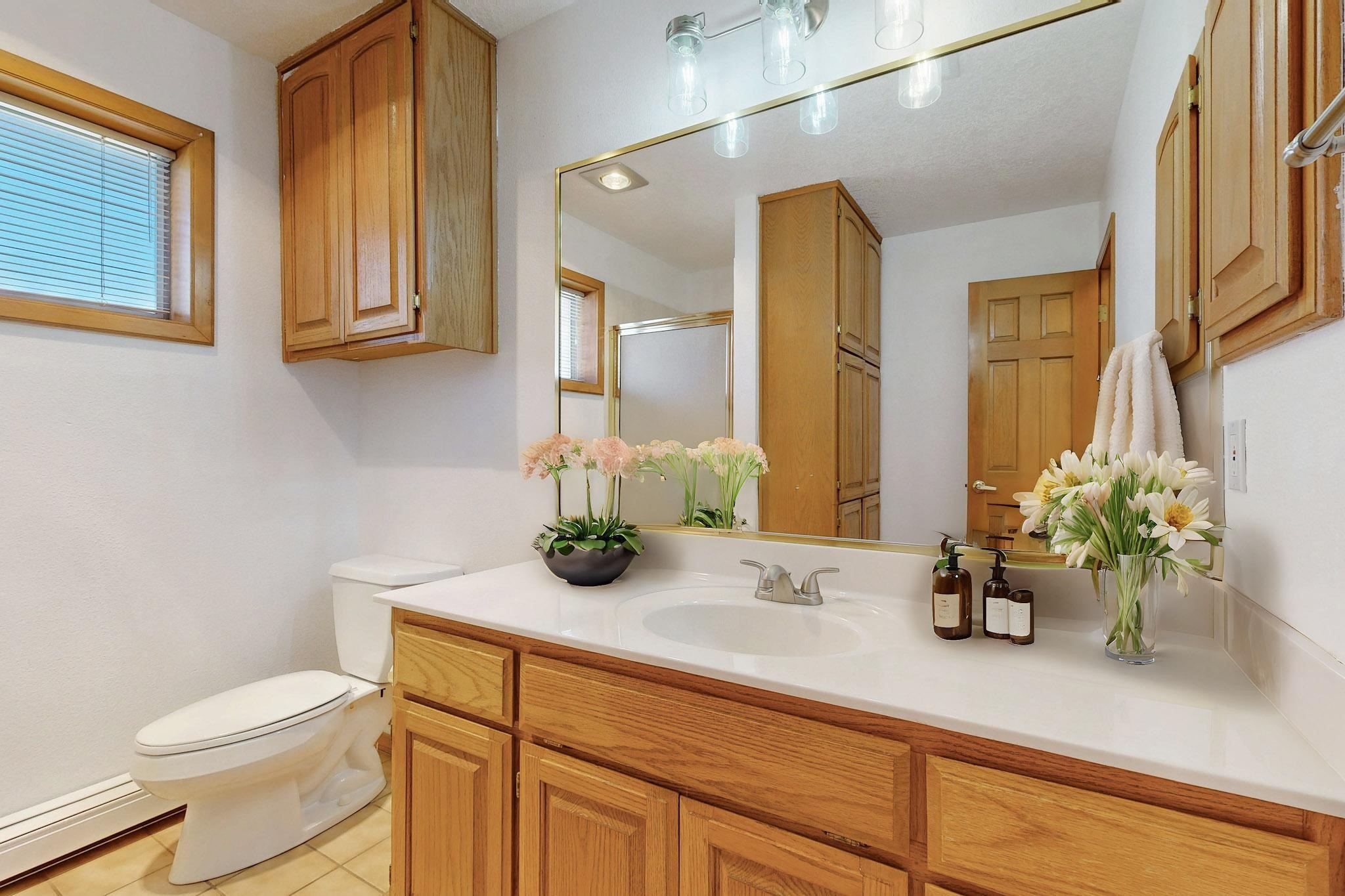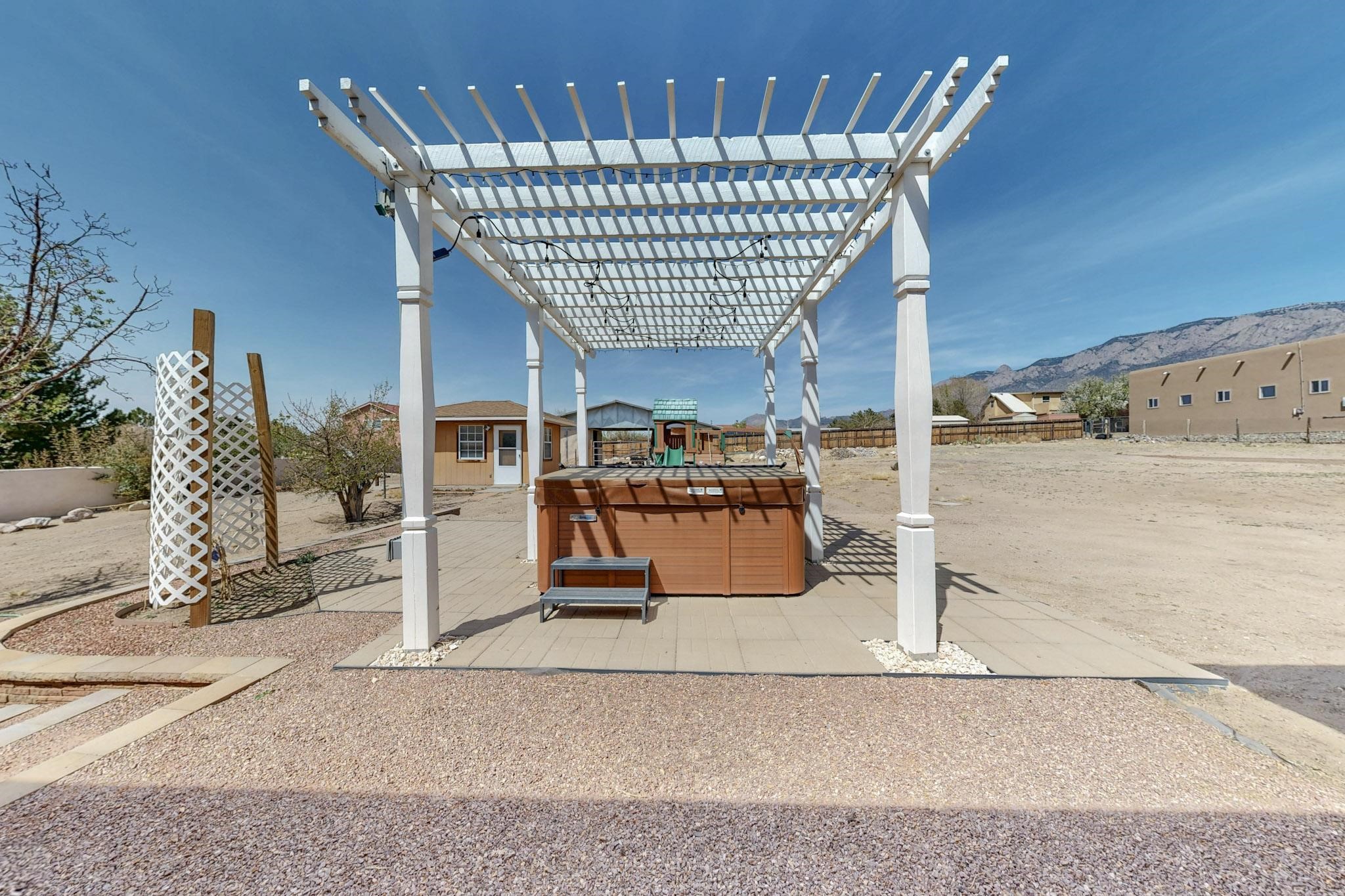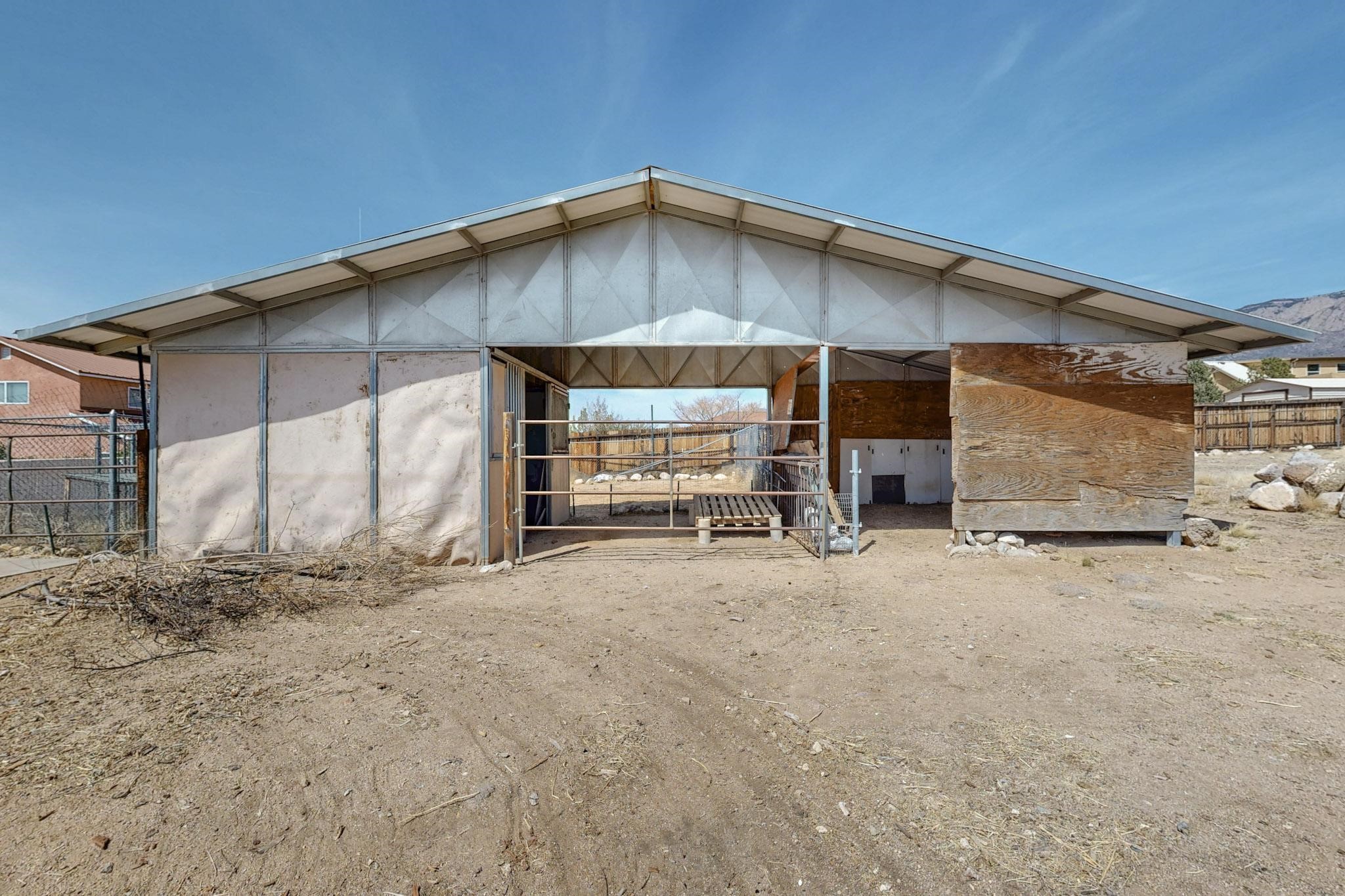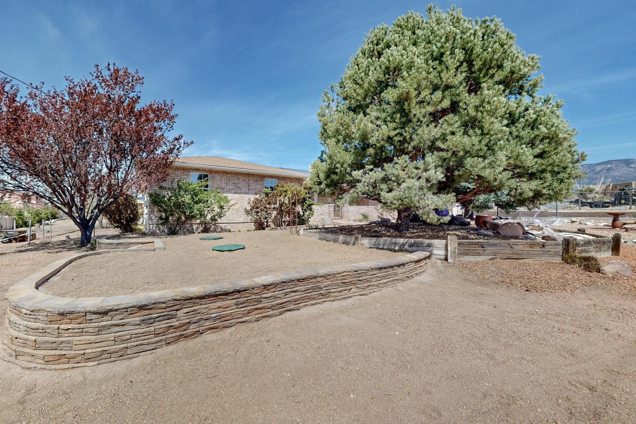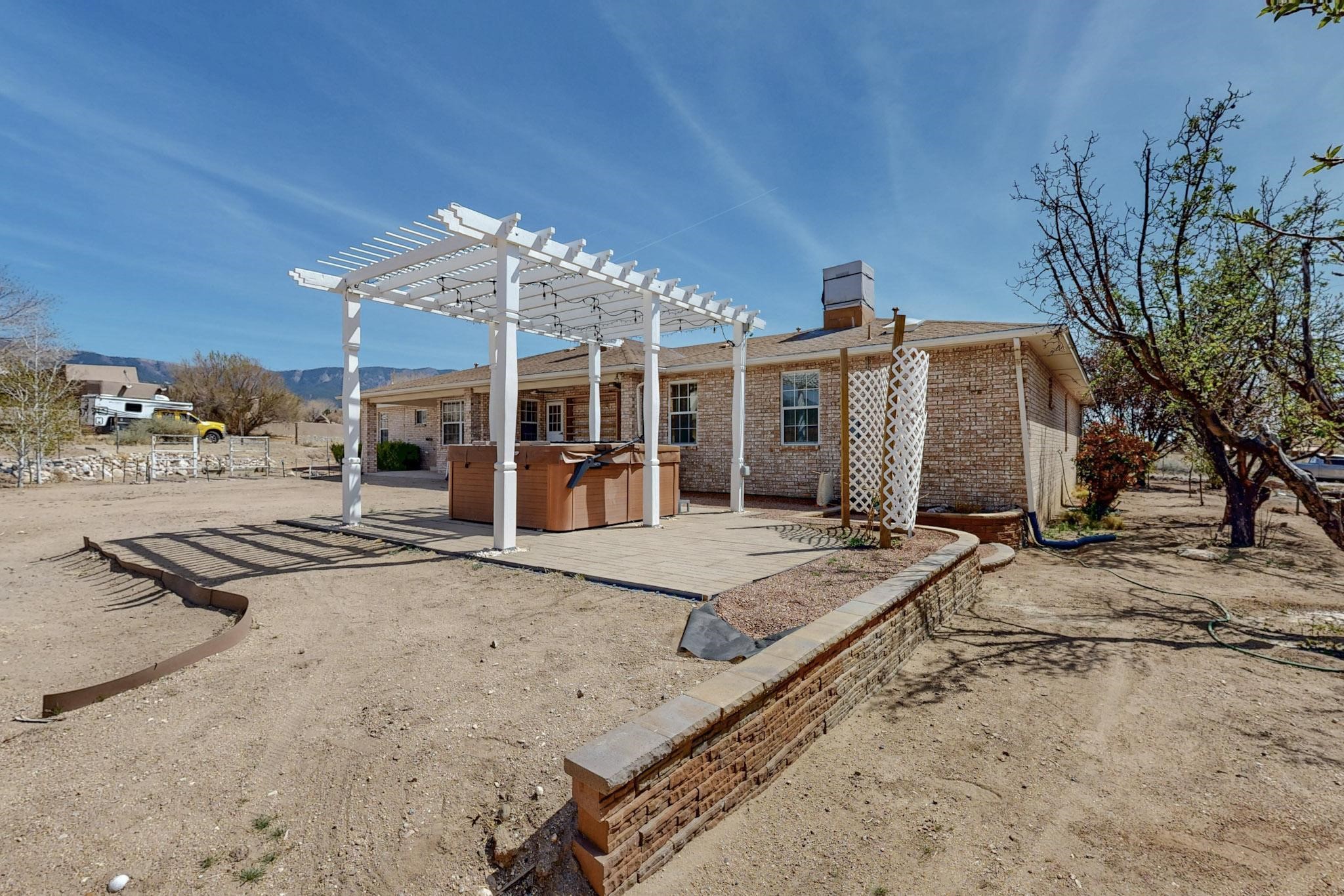 Set on a spacious 0.89-acre lot in the highly desirable North Albuquerque Acres, this nicely maintained single-story brick home offers breathtaking Sandia Mountain views and a thoughtfully designed layout perfect for comfortable living. Spanning 3,376 square feet, this home features 4 bedrooms, 3 bathrooms, two living areas plus a versatile flex room, perfect for work or play. The formal living and dining rooms provide an inviting space for entertaining, while the cozy family room with a wood-burning fireplace seamlessly flows into the eat-in kitchen with a charming bay window. The newly renovated kitchen boasts engineered hardwood flooring, marble countertops with a stone backsplash, a farmhouse sink, ample cabinet space, a 5-burner gas cooktop with range hood, and stainless-steel appliances, including double ovens, a dishwasher, and a refrigerator. A matching marble dining table with four chairs completes this stylish space. The primary suite offers a peaceful retreat with his-and-hers walk-in closets, dual vanities, a jetted tub, and a large shower. Three additional spacious bedrooms, all with walk-in closets, share a full bath with double sinks. Step outside to enjoy covered front and back porches, a pergola-covered hot tub, a children's play area, a tool/well room, and a barn with stalls--all within a fully fenced property. The 5-car tandem garage offers ample storage, while owned solar panels and propane provide energy efficiency. Conveniently located near top-rated schools, hiking and biking trails, and Tramway Blvd, this inviting home is perfect for both living and entertaining, combining comfort and style in one exceptional package. Don't miss the opportunity to make this your ABQ Dream Home!
