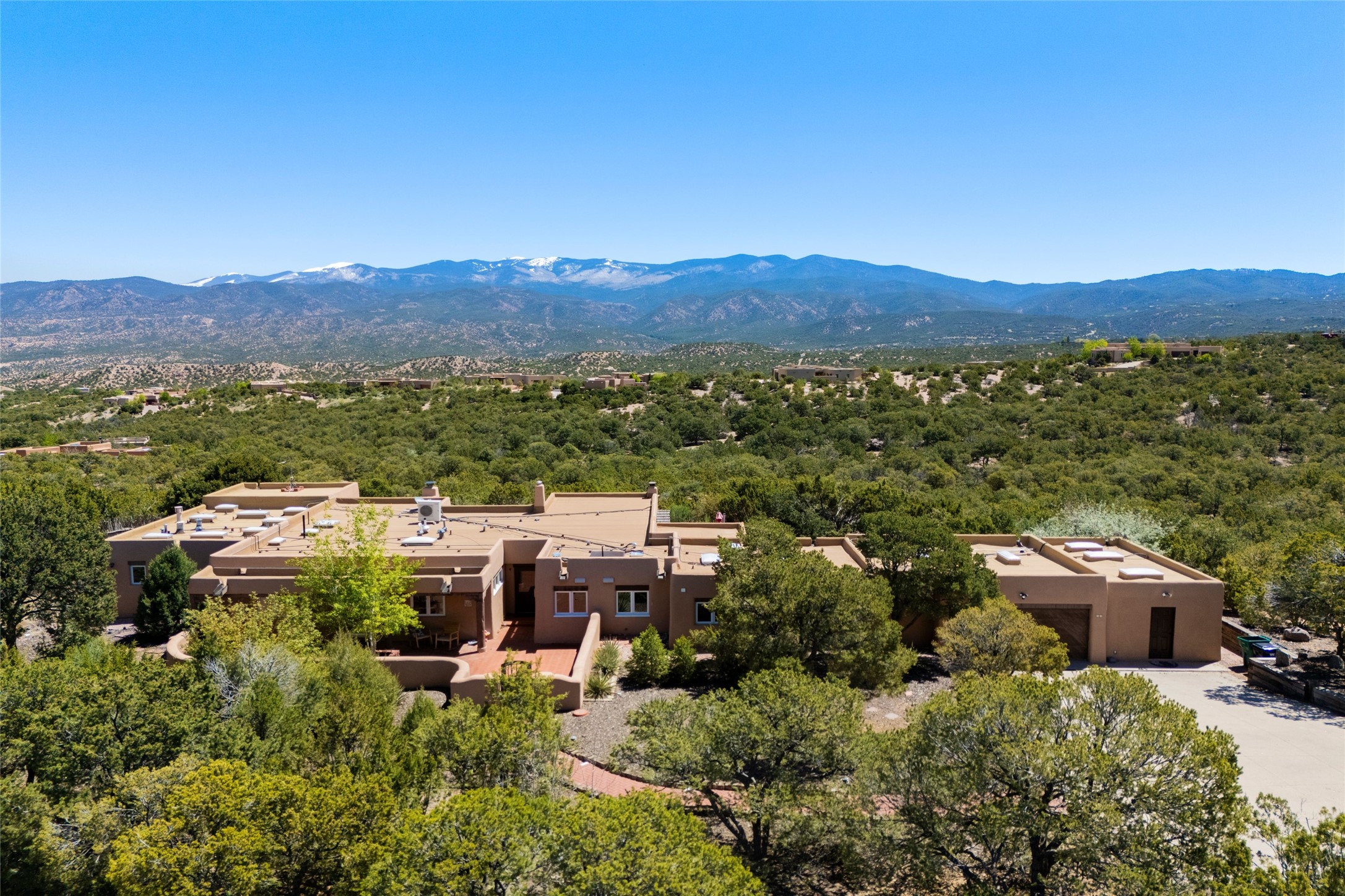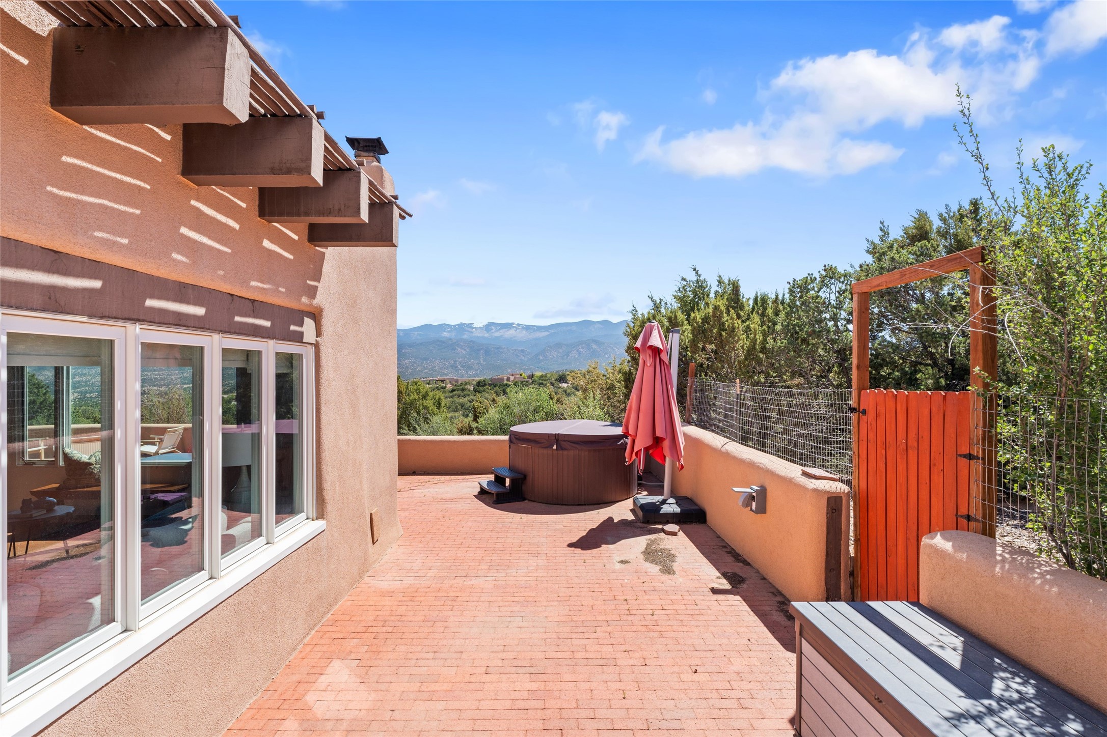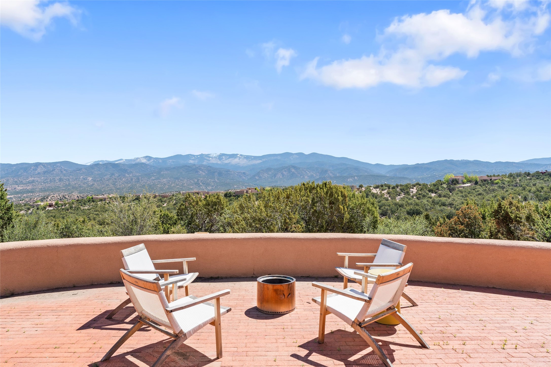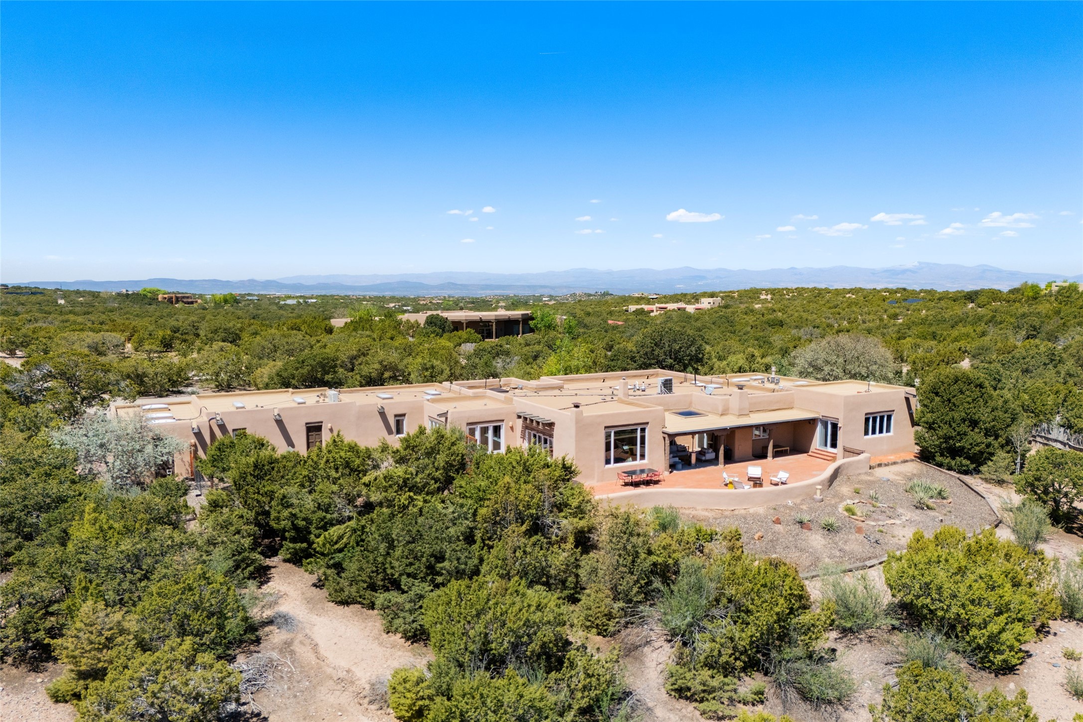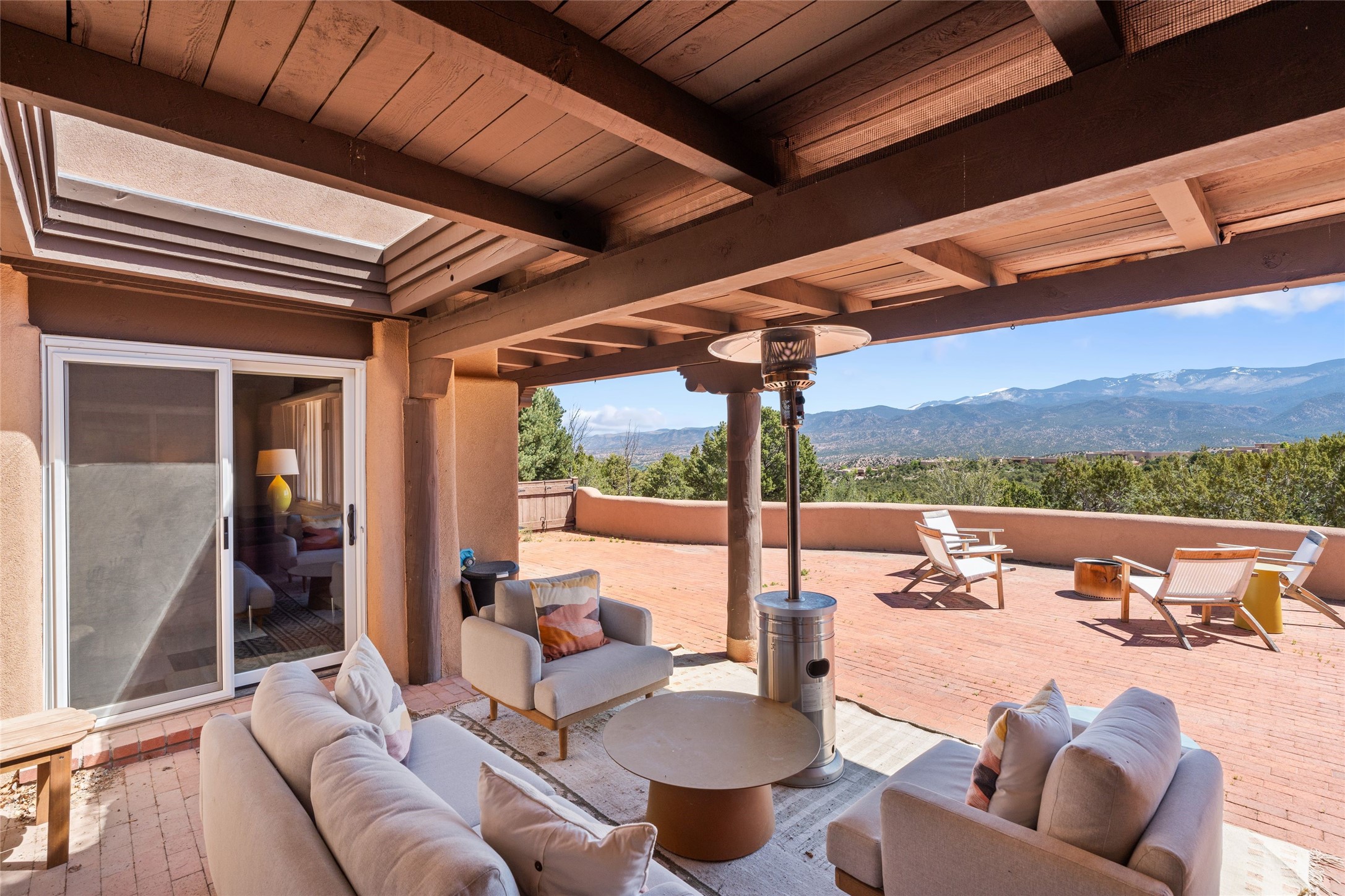 Breathtaking views and timeless Santa Fe charm converge in this enchanting light-filled Pueblo Revival home, ideally situated on 2.5 private, wooded acres just minutes from the historic Santa Fe Plaza. With panoramic vistas of the Sangre de Cristo Mountains, this single story 4-bedroom, 3.5-bath residence offers a rare combination of serenity, style, and location.At the heart of the home, the open-concept chef's kitchen--fully rebuilt in 2023--flows beautifully into the dining and living spaces, anchored by a massive picture window that captures the ever-changing mountain light. Outfitted with top-tier appliances by Wolf, Thermador, and KitchenAid, the kitchen features hand-glazed brick backsplash, premium granite countertops, abundant knotty alder cabinetry, clever under-counter storage solutions, and a oversized walk-in pantry.The four spacious bedrooms include two luxurious primary suites, each with a private full bath. These suites, along with the den, living room, and dining room, open directly onto a generously scaled patio, offering spectacular indoor/outdoor living with sweeping views of the Sangre de Cristos--a true extension of the interior space and an entertainer's dream. The patio features a covered portal, dining area, hot tub, and fire pit. Inside, classic Santa Fe design elements abound: two kiva fireplaces, exposed beams and vigas, ample skylights, brick flooring, decorative tile work and built-in bookcases lend warmth and regional authenticity to every room. The layout balances openness with privacy, including a separately located owner's suite with dual walk-in closets and stunning mountain views. Creative pursuits find a natural home in the separate workshop/art studio/yoga room, while ample storage, including a large laundry room and an oversized two-car garage, ensures functionality matches beauty. A beautiful home office space with large windows provides additional options for working from home, a home gym, or can be used as a 5th bedroom