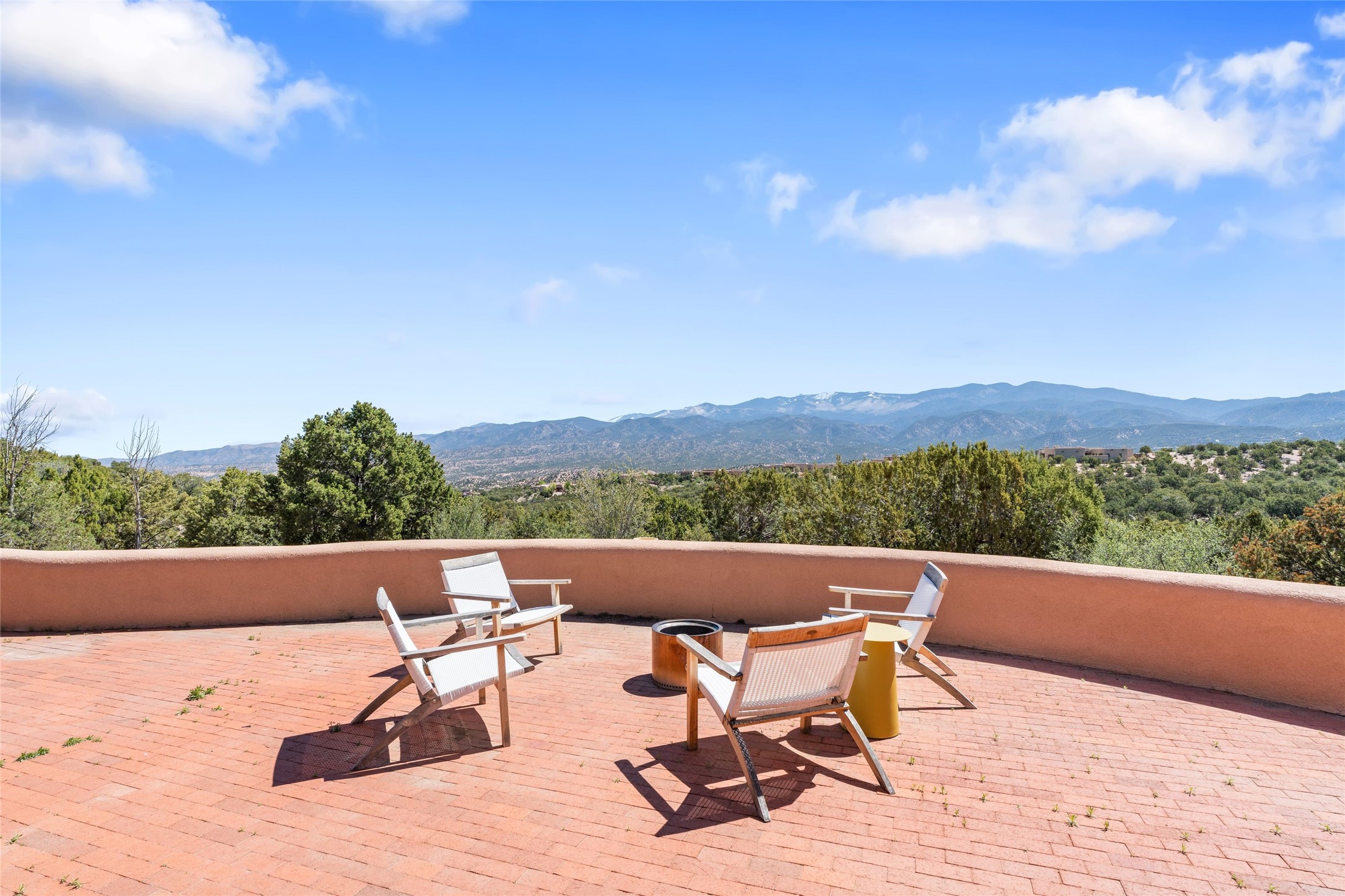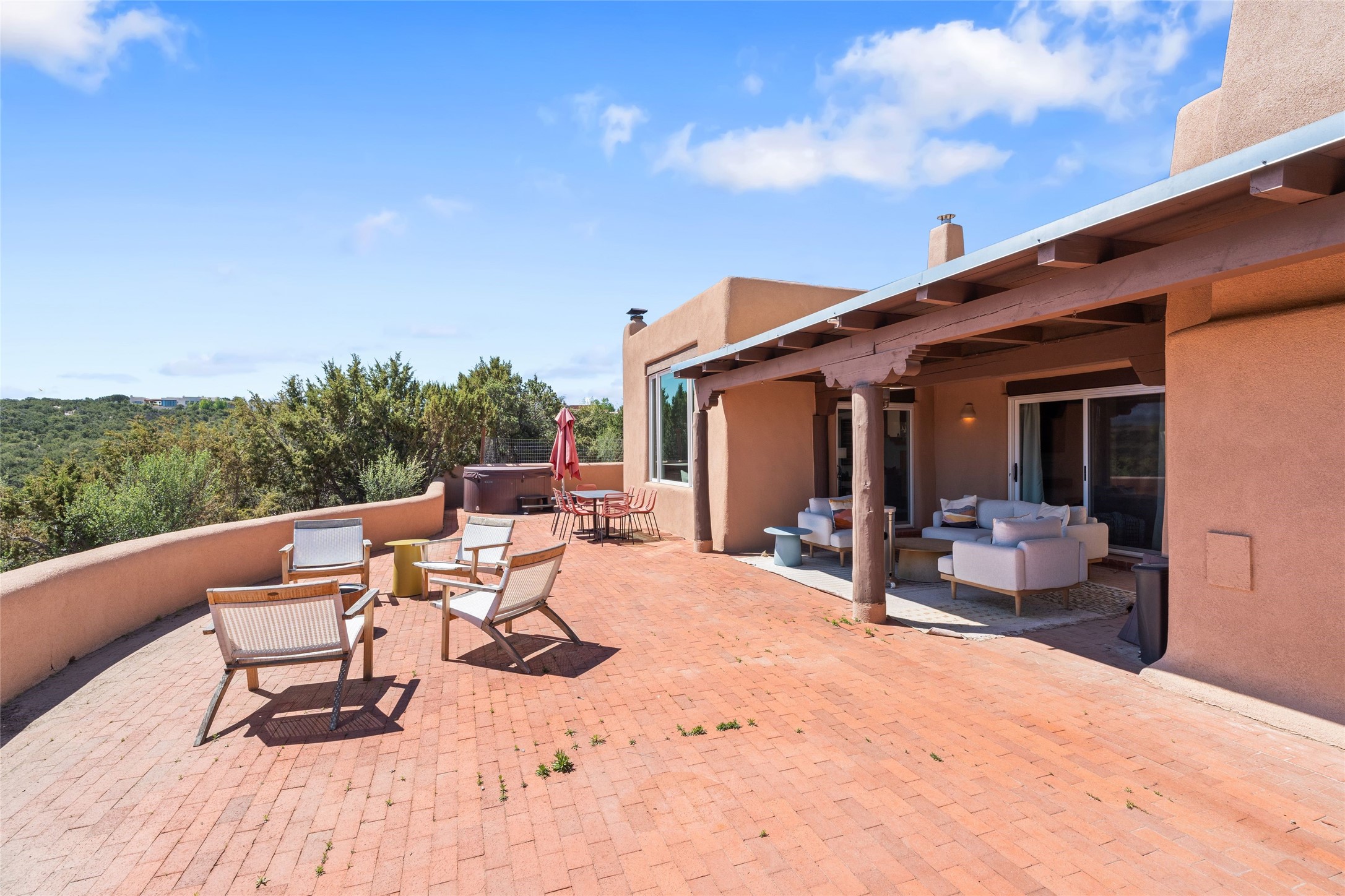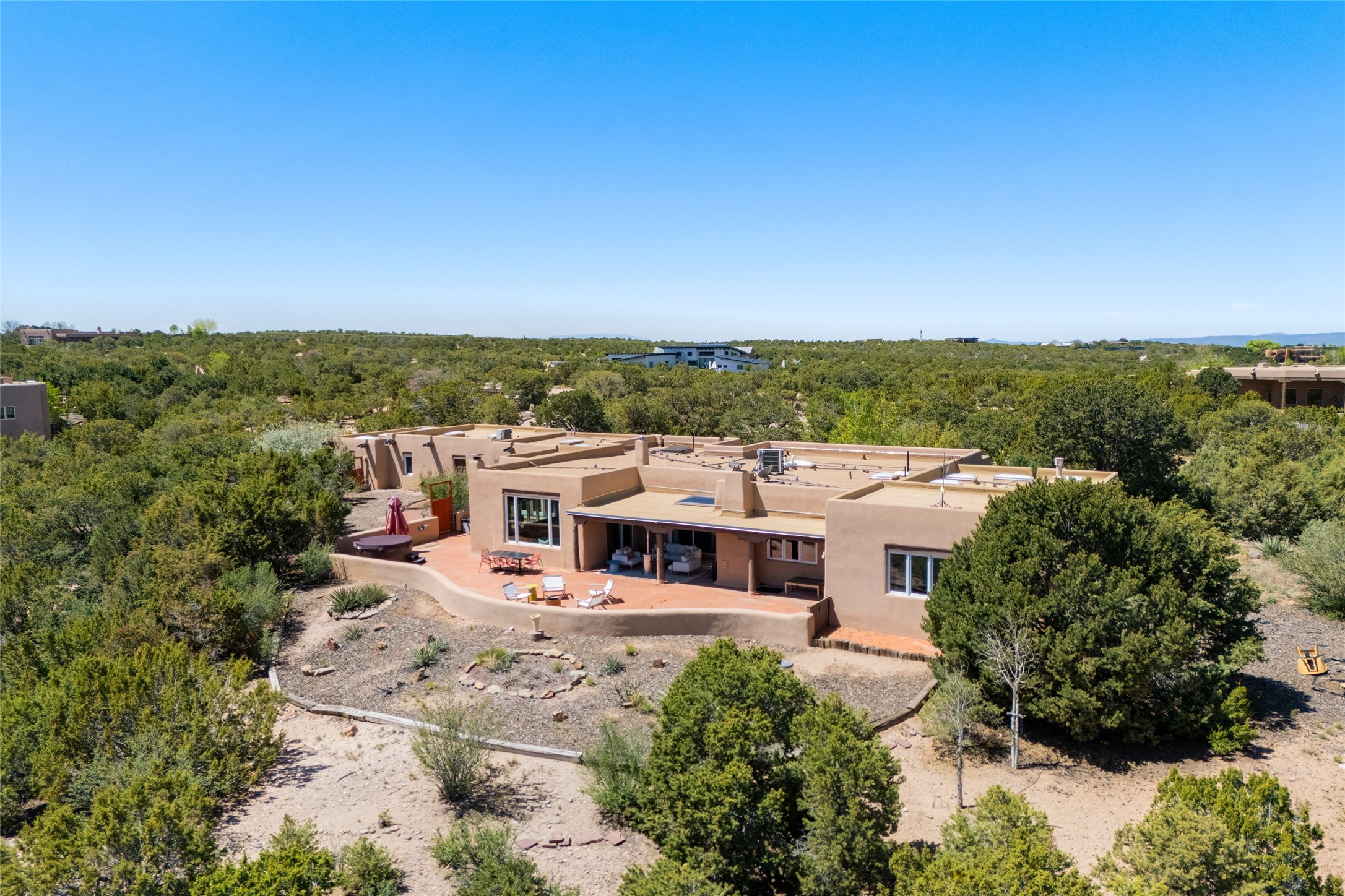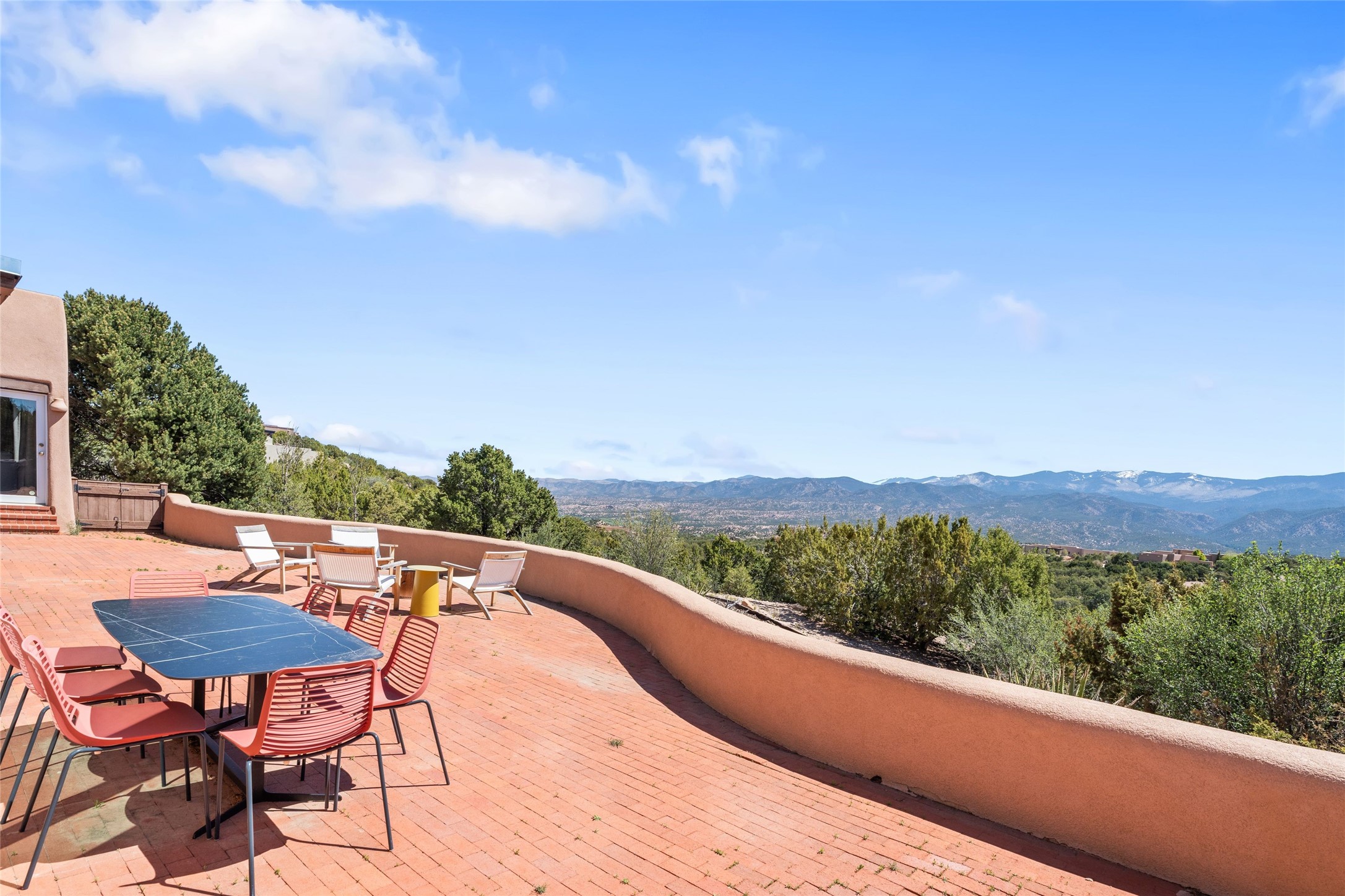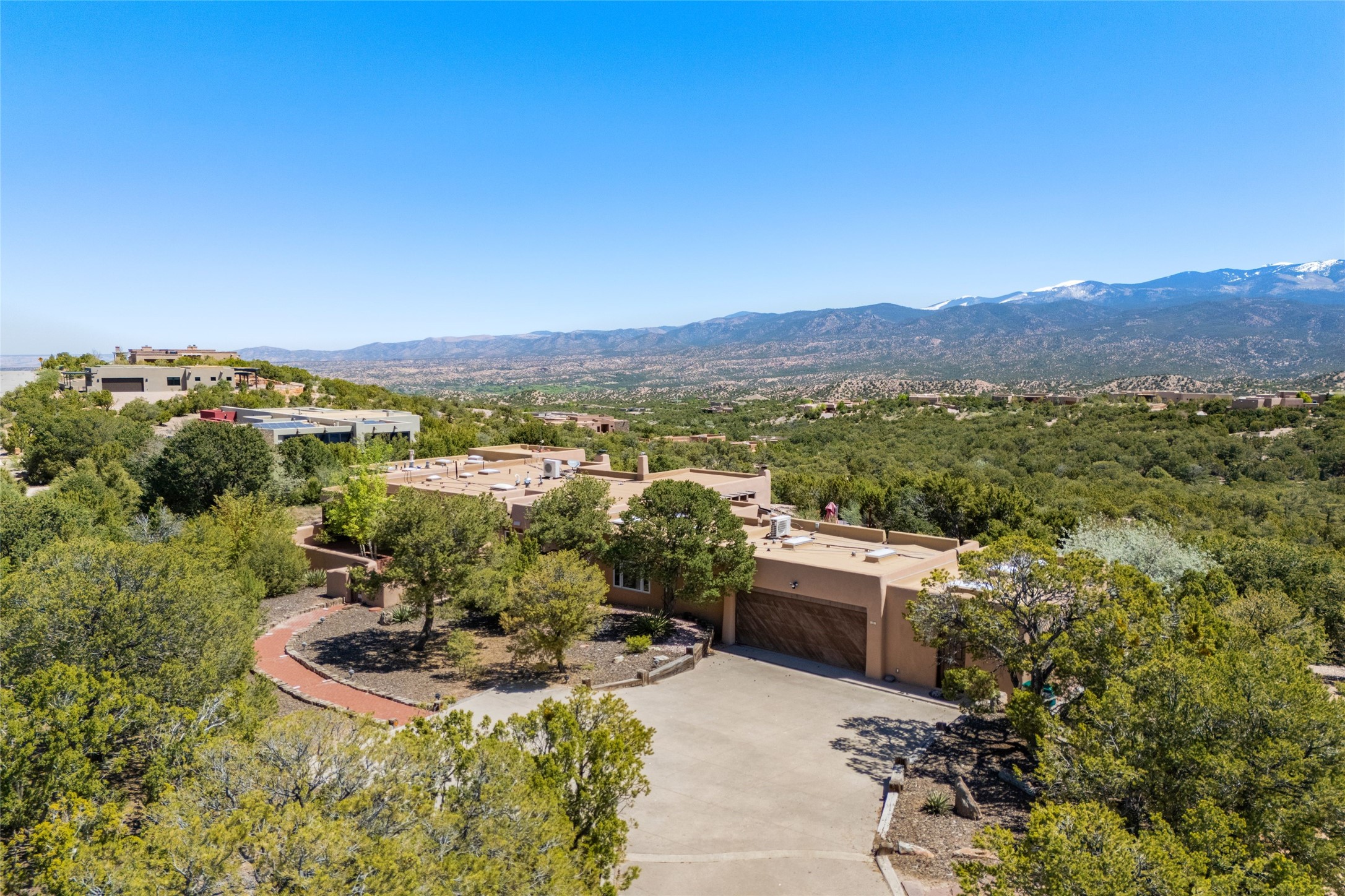 Breathtaking views and timeless Santa Fe charm converge in this enchanting light-filled Pueblo Revival home, ideally situated on 2.5 private, wooded acres just minutes from the historic Santa Fe Plaza. With panoramic vistas of the Sangre de Cristo Mountains, this single story 4-bedroom, 3.5-bath residence offers a rare combination of serenity, style, and location.At the heart of the home, the open-concept chef's kitchen--fully rebuilt in 2023--flows beautifully into the dining and living spaces, anchored by a massive picture window that captures the ever-changing mountain light. Outfitted with top-tier appliances by Wolf, Thermador, and KitchenAid, the kitchen features hand-glazed brick backsplash, premium granite countertops, abundant knotty alder cabinetry, clever under-counter storage solutions, and a oversized walk-in pantry.The four spacious bedrooms include two luxurious primary suites, each with a private full bath. These suites, along with the den, living room, and dining room, open directly onto a generously scaled patio, offering spectacular indoor/outdoor living with sweeping views of the Sangre de Cristos--a true extension of the interior space and an entertainer's dream. The patio features a covered portal, dining area, hot tub, and fire pit. Inside, classic Santa Fe design elements abound: two kiva fireplaces, exposed beams and vigas, ample skylights, brick flooring, decorative tile work and built-in bookcases lend warmth and regional authenticity to every room. The layout balances openness with privacy, including a separately located owner's suite with dual walk-in closets and stunning mountain views. Creative pursuits find a natural home in the separate workshop/art studio/yoga room, while ample storage, including a large laundry room and an oversized two-car garage, ensures functionality matches beauty. A beautiful home office space with large windows provides additional options for working from home, a home gym, or can be used as a 5th bedroom