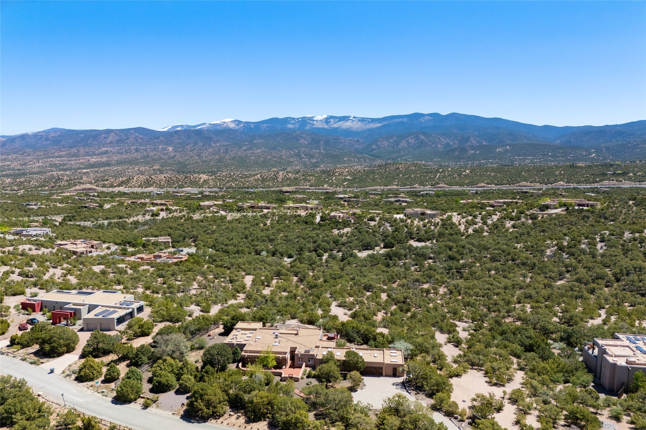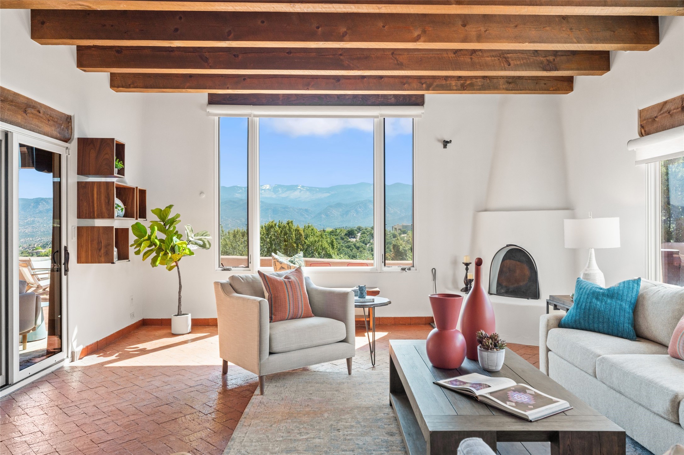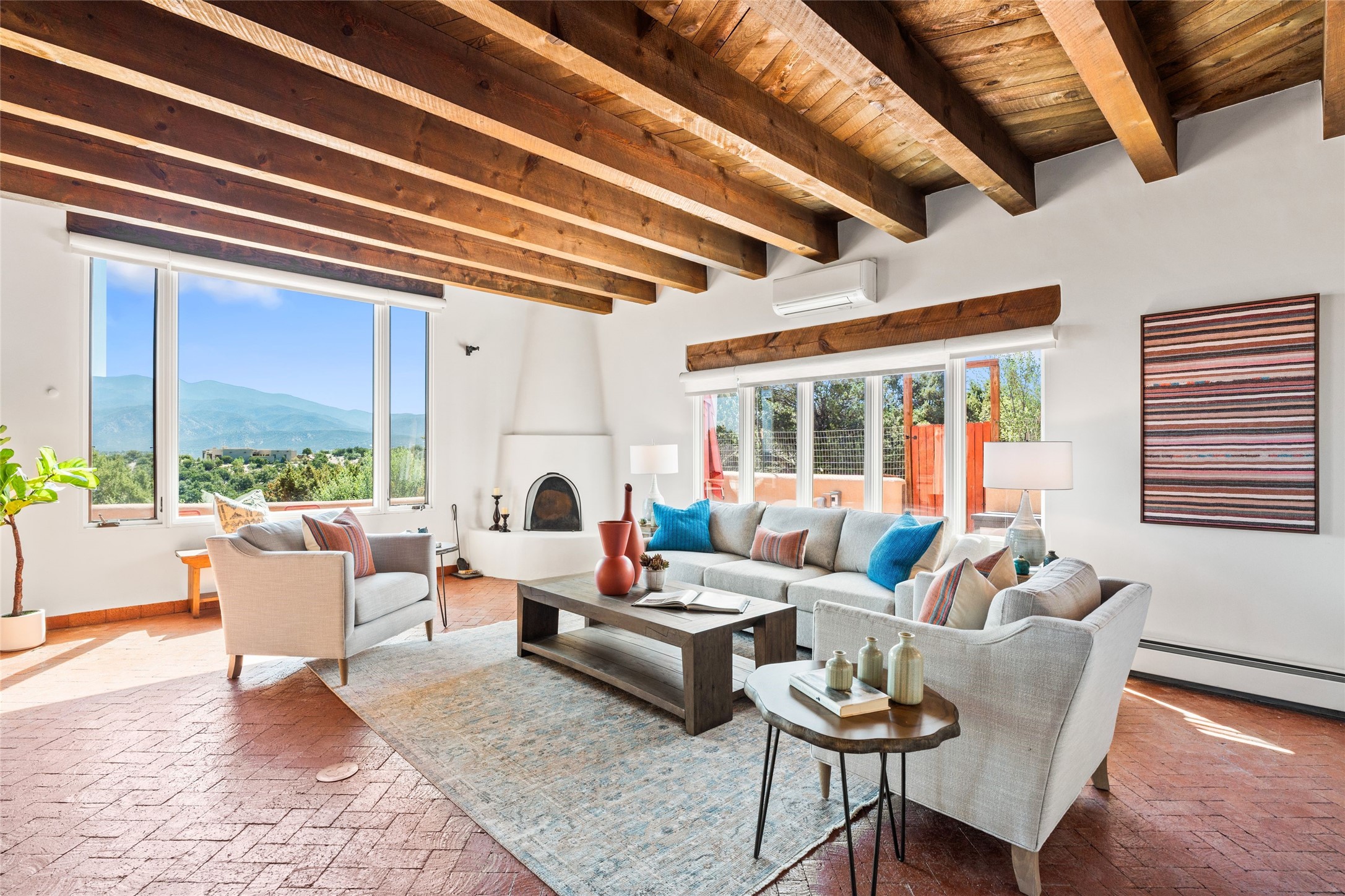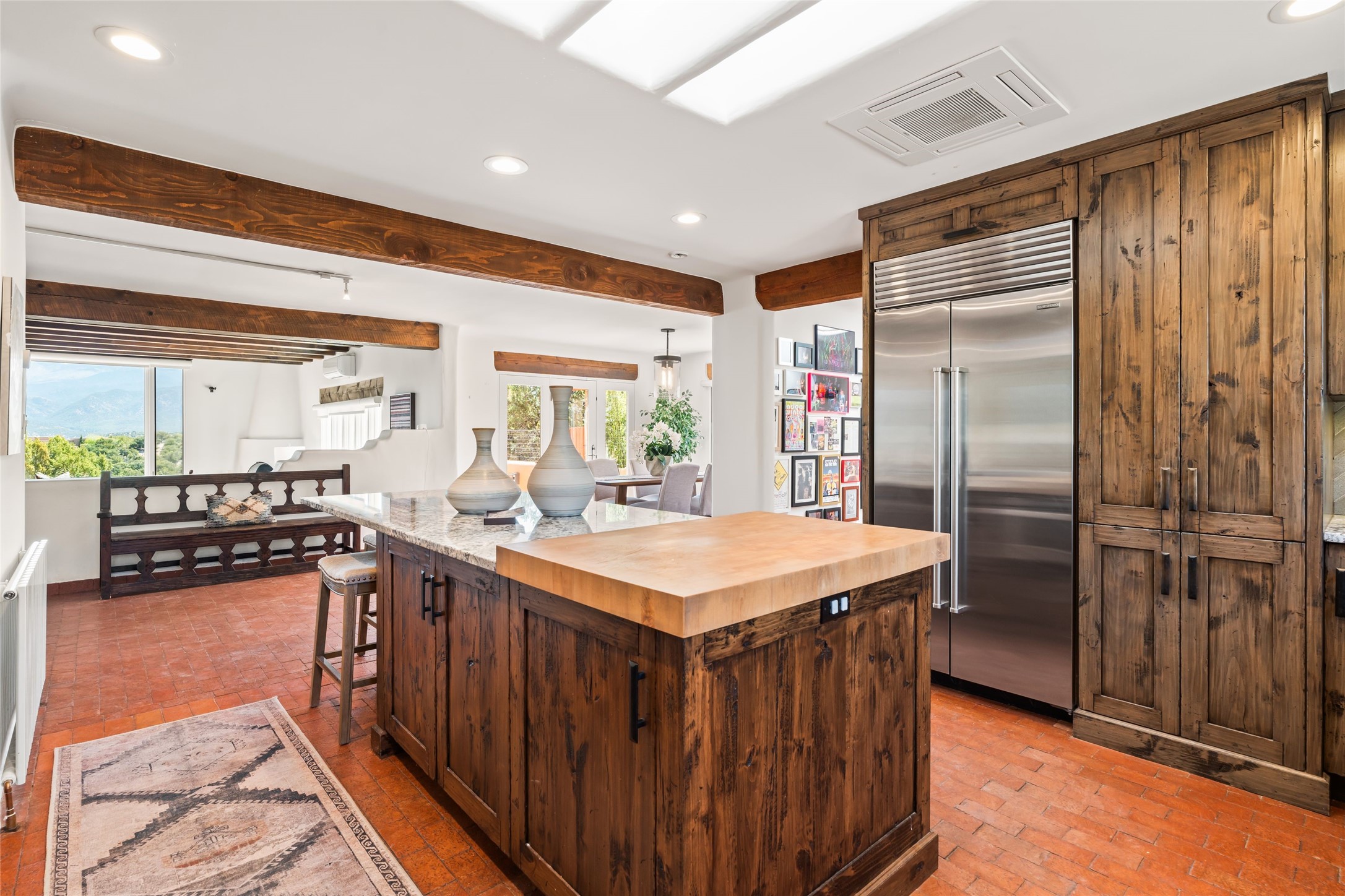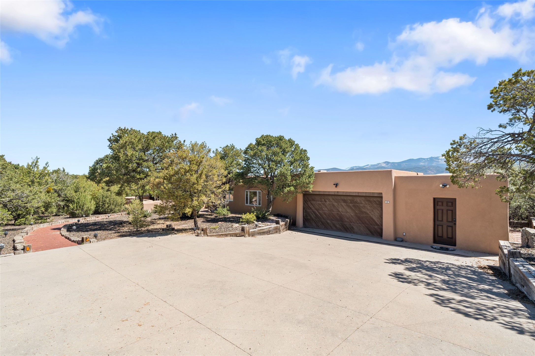 Breathtaking views and timeless Santa Fe charm converge in this enchanting light-filled Pueblo Revival home, ideally situated on 2.5 private, wooded acres just minutes from the historic Santa Fe Plaza. With panoramic vistas of the Sangre de Cristo Mountains, this single story 4-bedroom, 3.5-bath residence offers a rare combination of serenity, style, and location.At the heart of the home, the open-concept chef's kitchen--fully rebuilt in 2023--flows beautifully into the dining and living spaces, anchored by a massive picture window that captures the ever-changing mountain light. Outfitted with top-tier appliances by Wolf, Thermador, and KitchenAid, the kitchen features hand-glazed brick backsplash, premium granite countertops, abundant knotty alder cabinetry, clever under-counter storage solutions, and a oversized walk-in pantry.The four spacious bedrooms include two luxurious primary suites, each with a private full bath. These suites, along with the den, living room, and dining room, open directly onto a generously scaled patio, offering spectacular indoor/outdoor living with sweeping views of the Sangre de Cristos--a true extension of the interior space and an entertainer's dream. The patio features a covered portal, dining area, hot tub, and fire pit. Inside, classic Santa Fe design elements abound: two kiva fireplaces, exposed beams and vigas, ample skylights, brick flooring, decorative tile work and built-in bookcases lend warmth and regional authenticity to every room. The layout balances openness with privacy, including a separately located owner's suite with dual walk-in closets and stunning mountain views. Creative pursuits find a natural home in the separate workshop/art studio/yoga room, while ample storage, including a large laundry room and an oversized two-car garage, ensures functionality matches beauty. A beautiful home office space with large windows provides additional options for working from home, a home gym, or can be used as a 5th bedroom