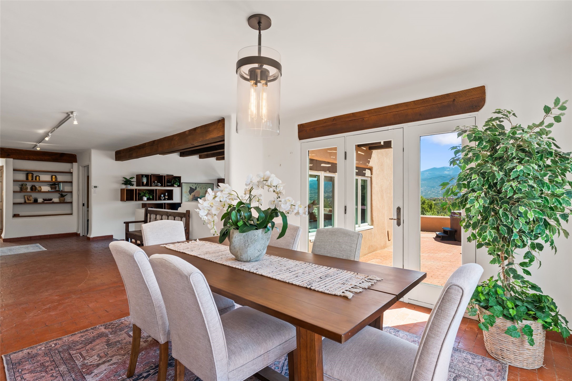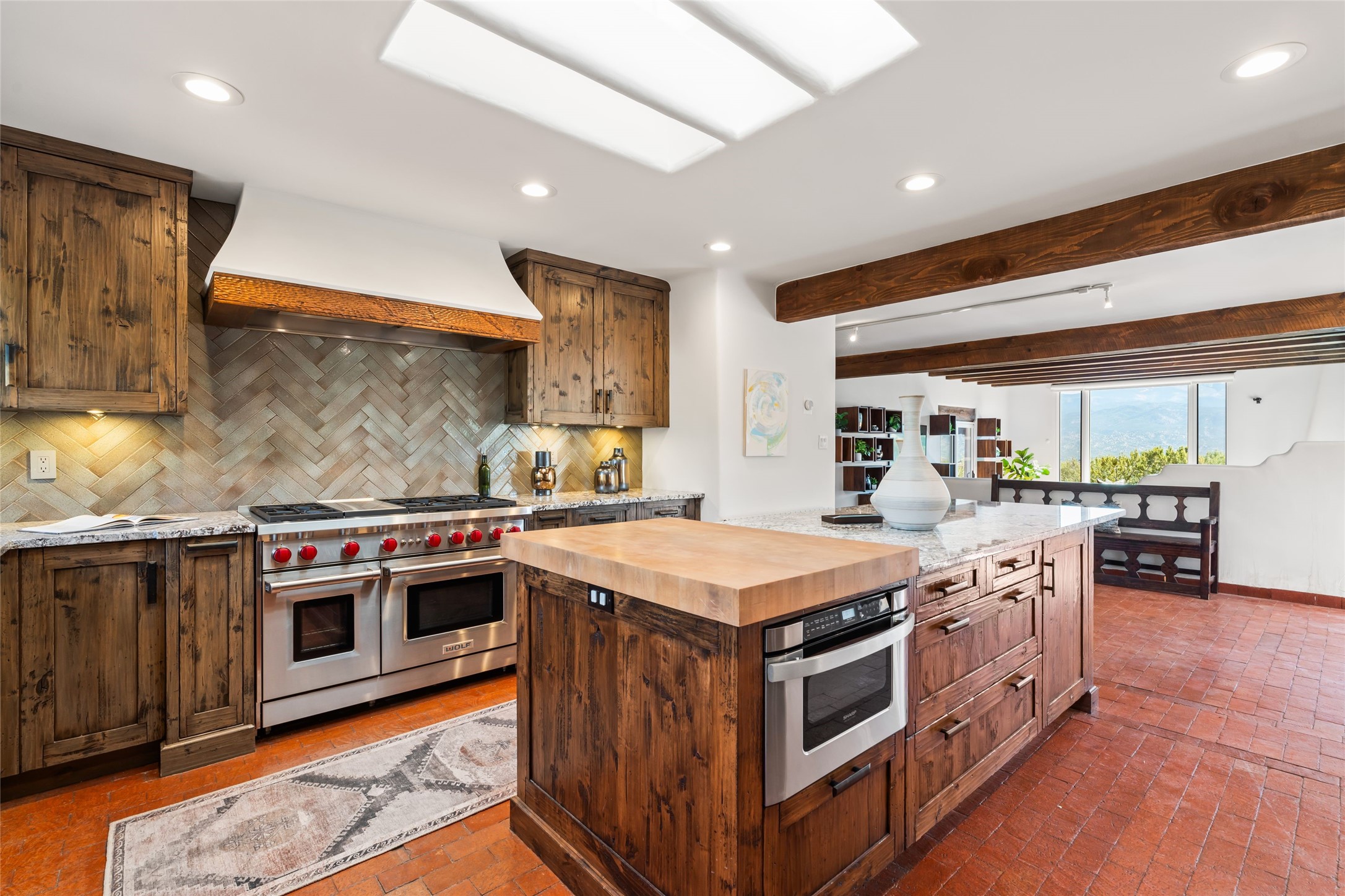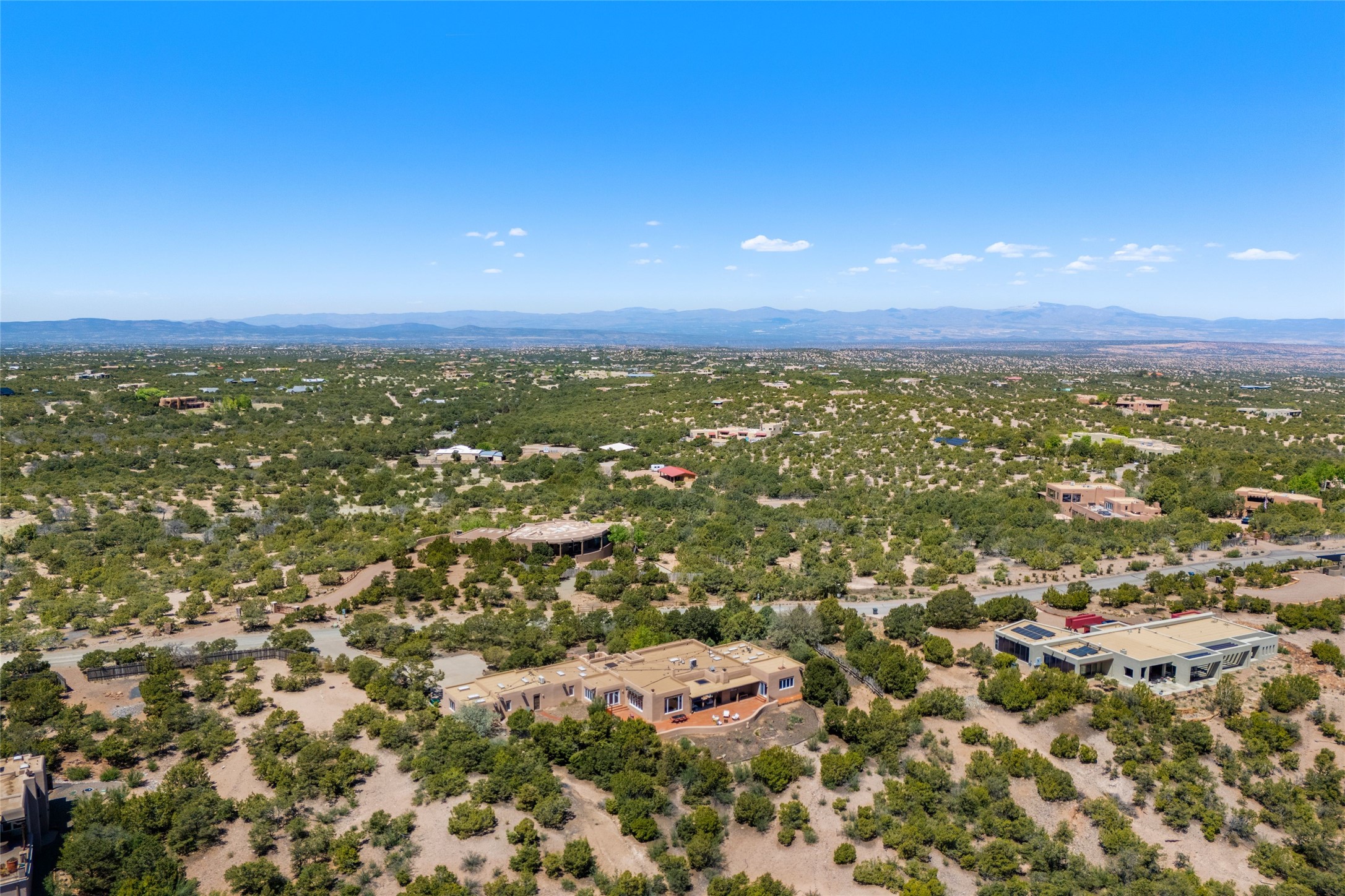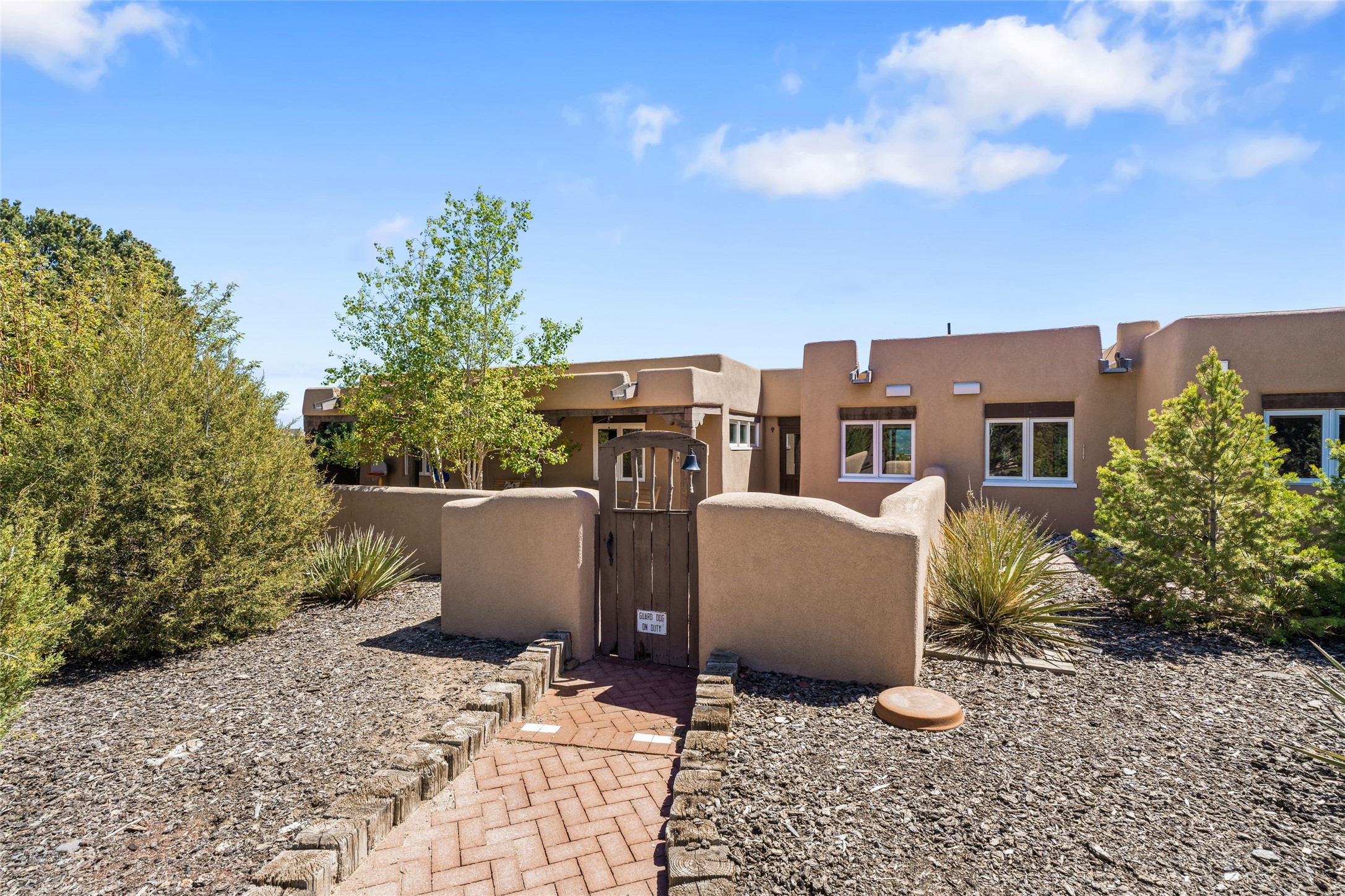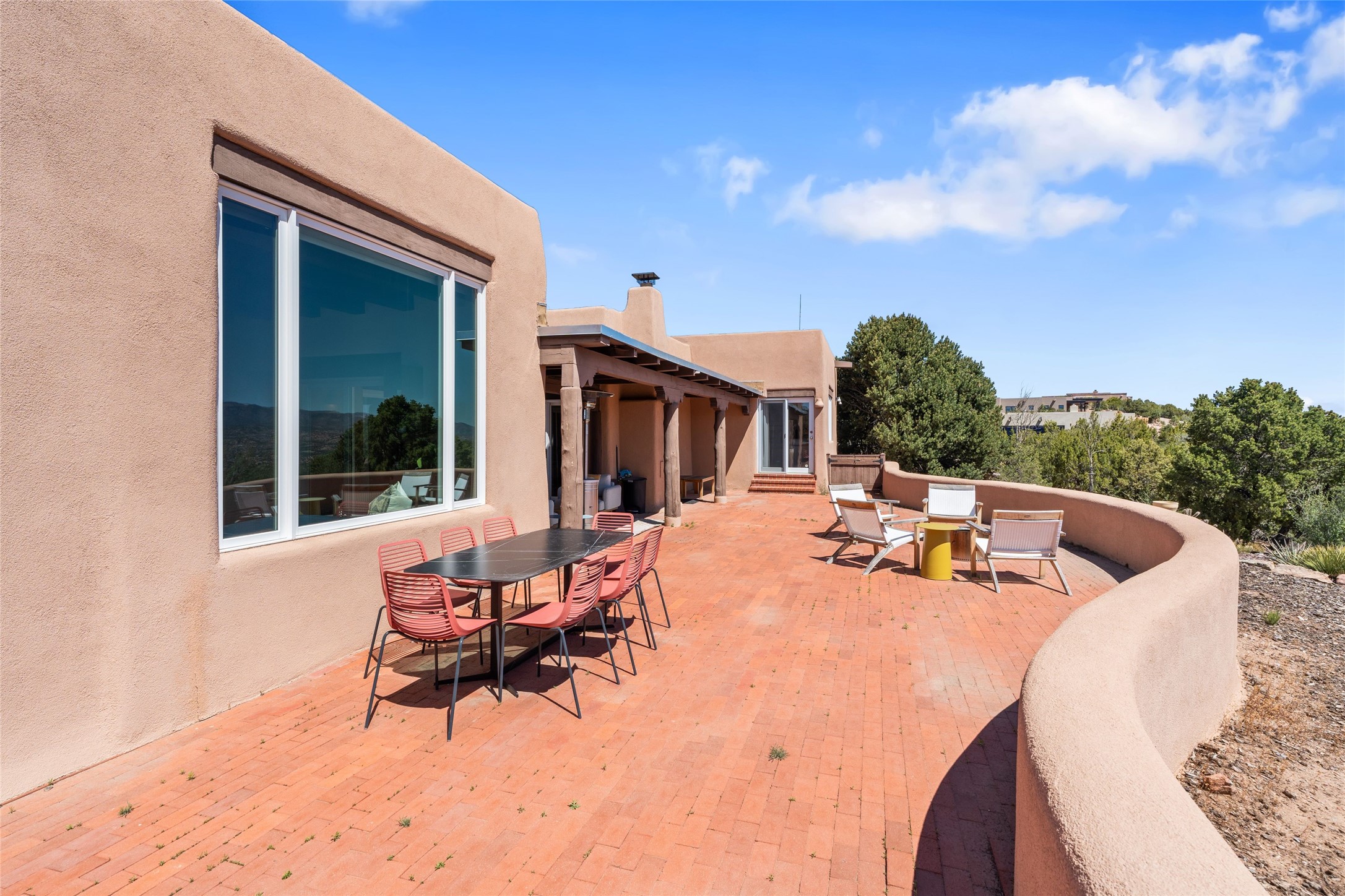 Breathtaking views and timeless Santa Fe charm converge in this enchanting light-filled Pueblo Revival home, ideally situated on 2.5 private, wooded acres just minutes from the historic Santa Fe Plaza. With panoramic vistas of the Sangre de Cristo Mountains, this single story 4-bedroom, 3.5-bath residence offers a rare combination of serenity, style, and location.At the heart of the home, the open-concept chef's kitchen--fully rebuilt in 2023--flows beautifully into the dining and living spaces, anchored by a massive picture window that captures the ever-changing mountain light. Outfitted with top-tier appliances by Wolf, Thermador, and KitchenAid, the kitchen features hand-glazed brick backsplash, premium granite countertops, abundant knotty alder cabinetry, clever under-counter storage solutions, and a oversized walk-in pantry.The four spacious bedrooms include two luxurious primary suites, each with a private full bath. These suites, along with the den, living room, and dining room, open directly onto a generously scaled patio, offering spectacular indoor/outdoor living with sweeping views of the Sangre de Cristos--a true extension of the interior space and an entertainer's dream. The patio features a covered portal, dining area, hot tub, and fire pit. Inside, classic Santa Fe design elements abound: two kiva fireplaces, exposed beams and vigas, ample skylights, brick flooring, decorative tile work and built-in bookcases lend warmth and regional authenticity to every room. The layout balances openness with privacy, including a separately located owner's suite with dual walk-in closets and stunning mountain views. Creative pursuits find a natural home in the separate workshop/art studio/yoga room, while ample storage, including a large laundry room and an oversized two-car garage, ensures functionality matches beauty. A beautiful home office space with large windows provides additional options for working from home, a home gym, or can be used as a 5th bedroom