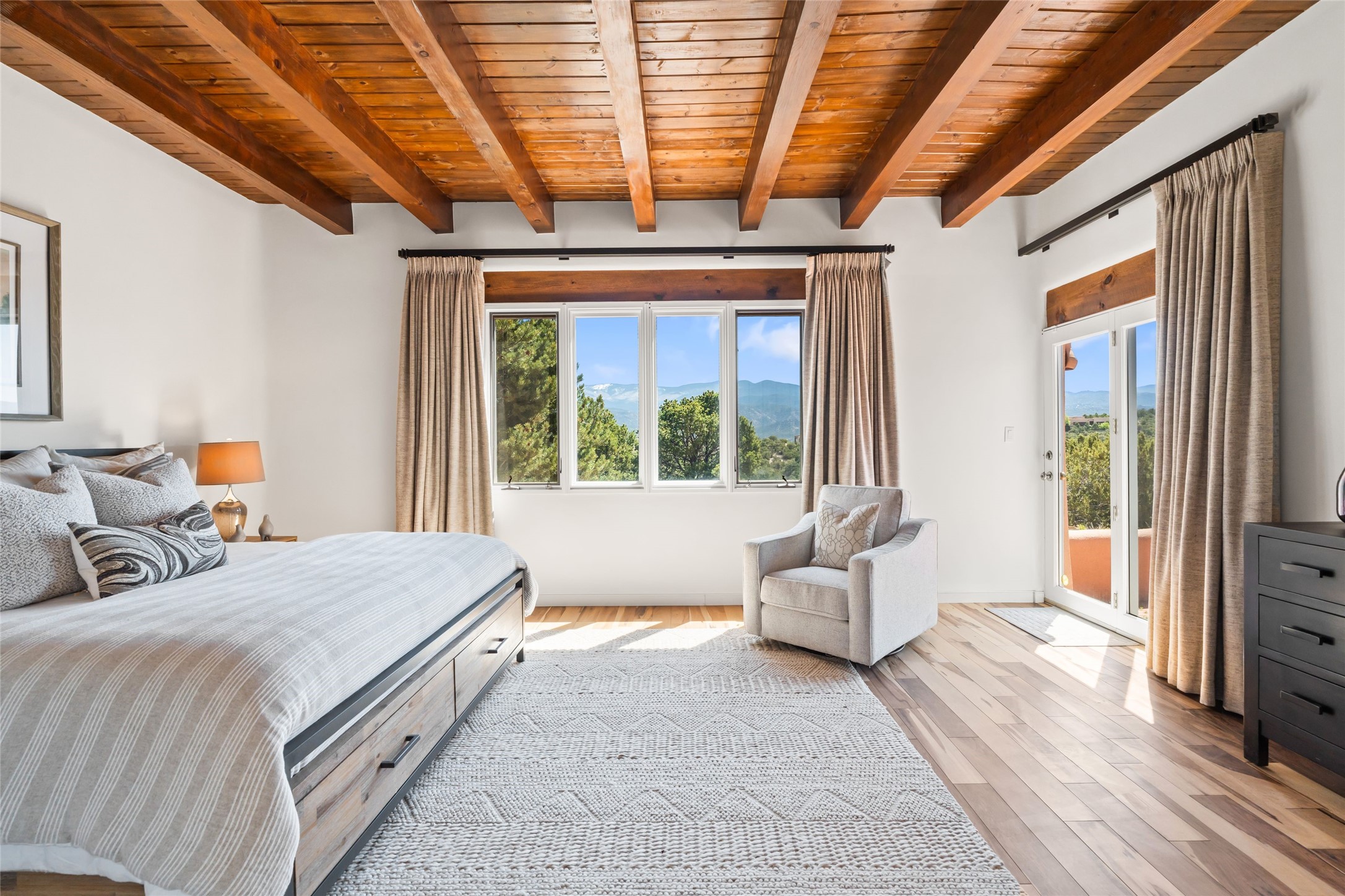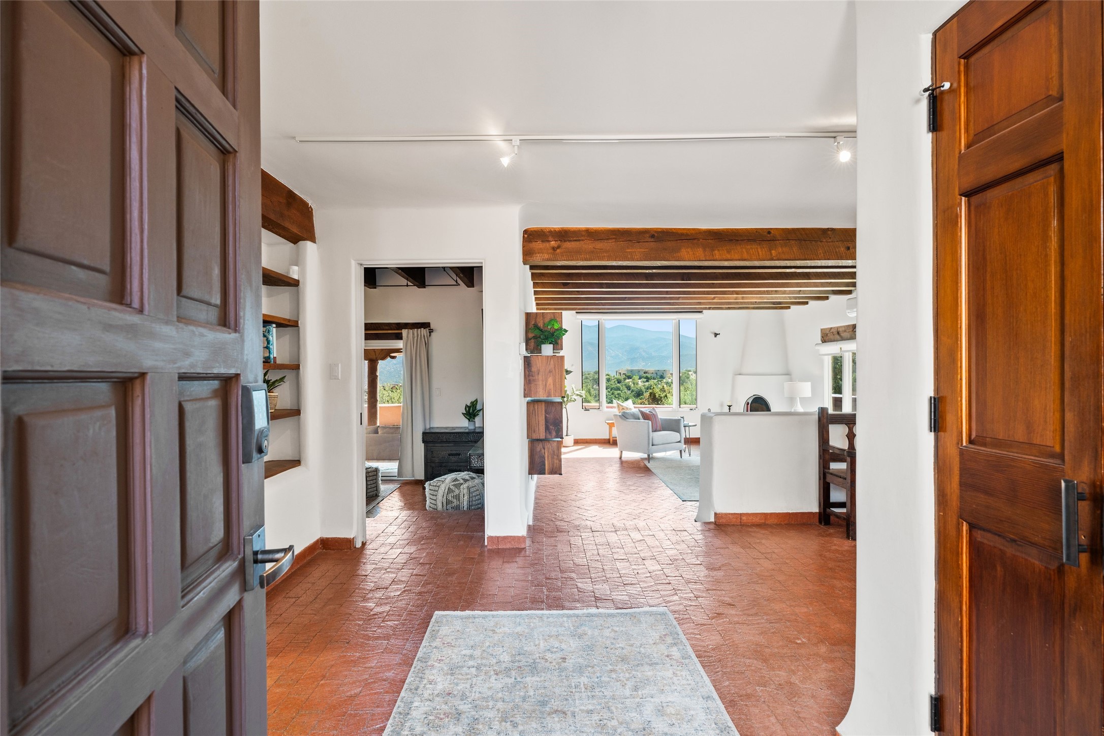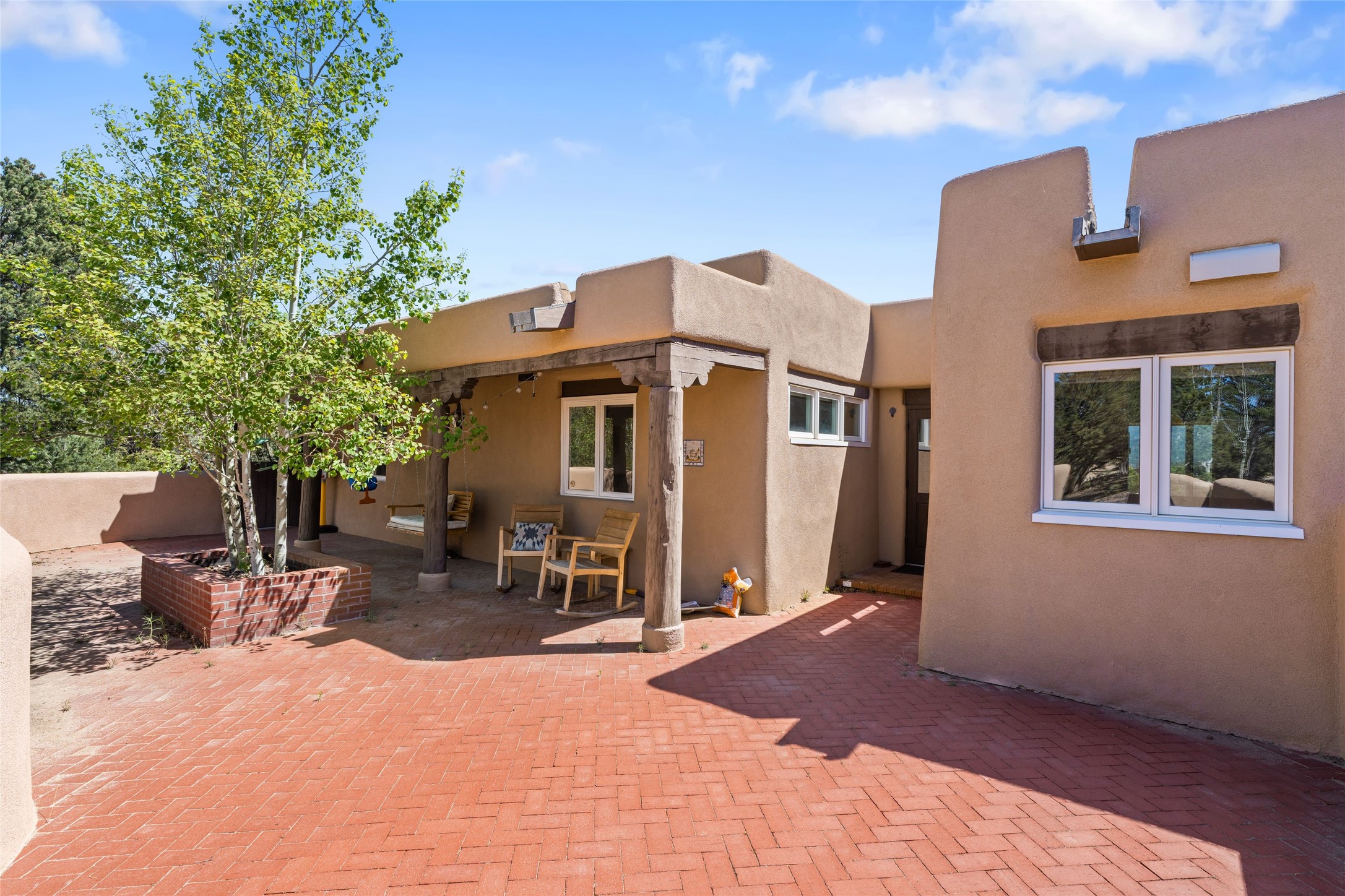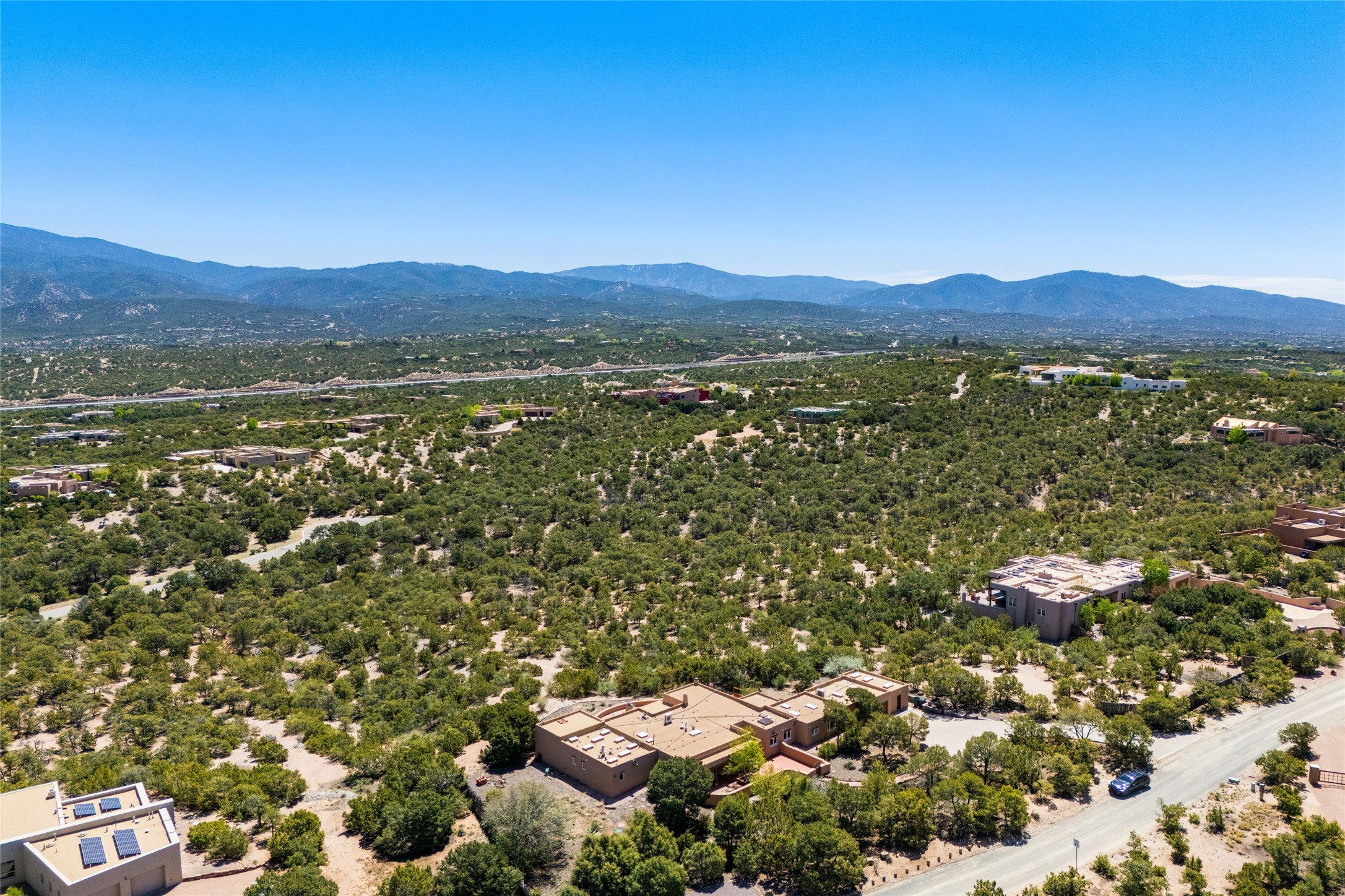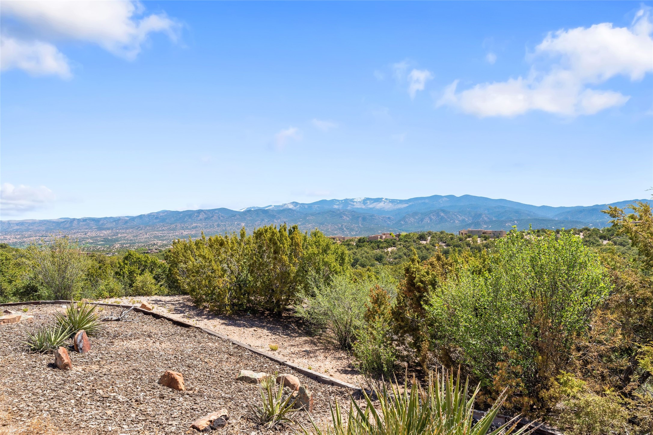 Breathtaking views and timeless Santa Fe charm converge in this enchanting light-filled Pueblo Revival home, ideally situated on 2.5 private, wooded acres just minutes from the historic Santa Fe Plaza. With panoramic vistas of the Sangre de Cristo Mountains, this single story 4-bedroom, 3.5-bath residence offers a rare combination of serenity, style, and location.At the heart of the home, the open-concept chef's kitchen--fully rebuilt in 2023--flows beautifully into the dining and living spaces, anchored by a massive picture window that captures the ever-changing mountain light. Outfitted with top-tier appliances by Wolf, Thermador, and KitchenAid, the kitchen features hand-glazed brick backsplash, premium granite countertops, abundant knotty alder cabinetry, clever under-counter storage solutions, and a oversized walk-in pantry.The four spacious bedrooms include two luxurious primary suites, each with a private full bath. These suites, along with the den, living room, and dining room, open directly onto a generously scaled patio, offering spectacular indoor/outdoor living with sweeping views of the Sangre de Cristos--a true extension of the interior space and an entertainer's dream. The patio features a covered portal, dining area, hot tub, and fire pit. Inside, classic Santa Fe design elements abound: two kiva fireplaces, exposed beams and vigas, ample skylights, brick flooring, decorative tile work and built-in bookcases lend warmth and regional authenticity to every room. The layout balances openness with privacy, including a separately located owner's suite with dual walk-in closets and stunning mountain views. Creative pursuits find a natural home in the separate workshop/art studio/yoga room, while ample storage, including a large laundry room and an oversized two-car garage, ensures functionality matches beauty. A beautiful home office space with large windows provides additional options for working from home, a home gym, or can be used as a 5th bedroom