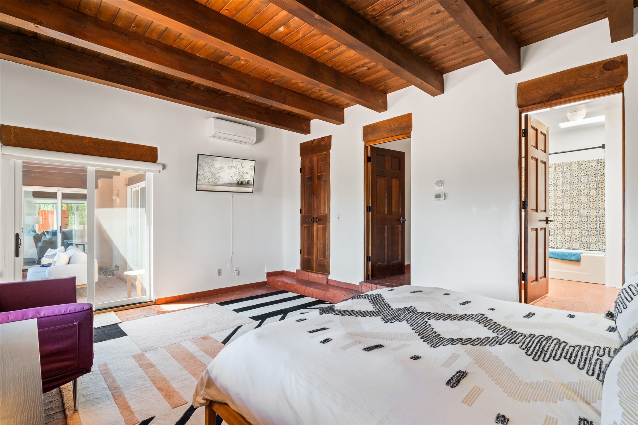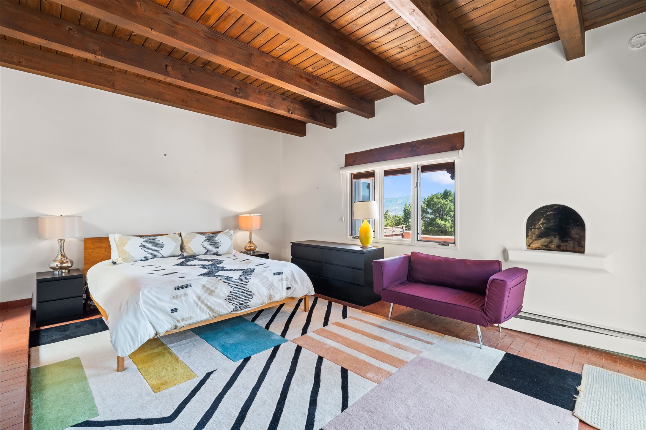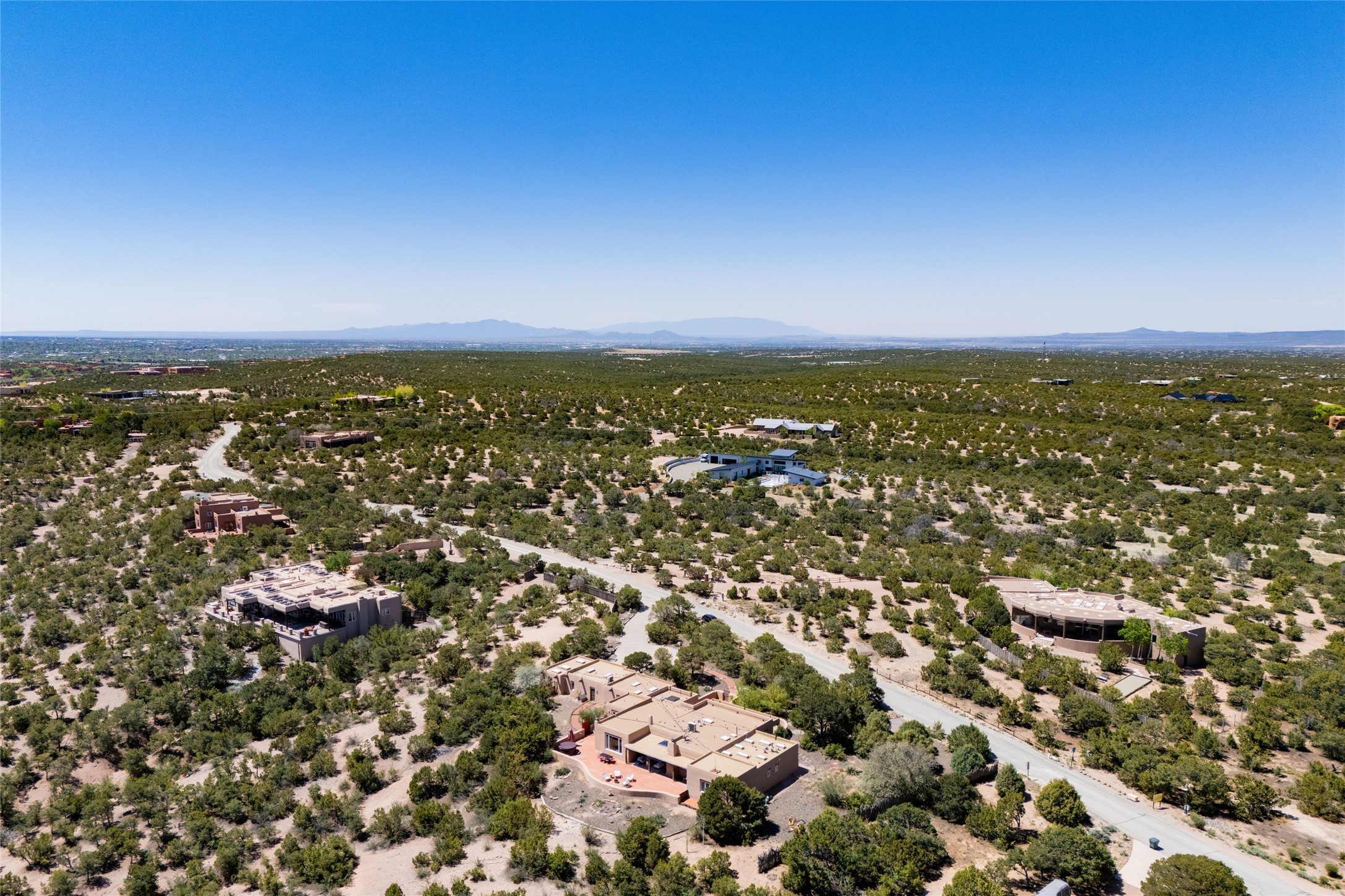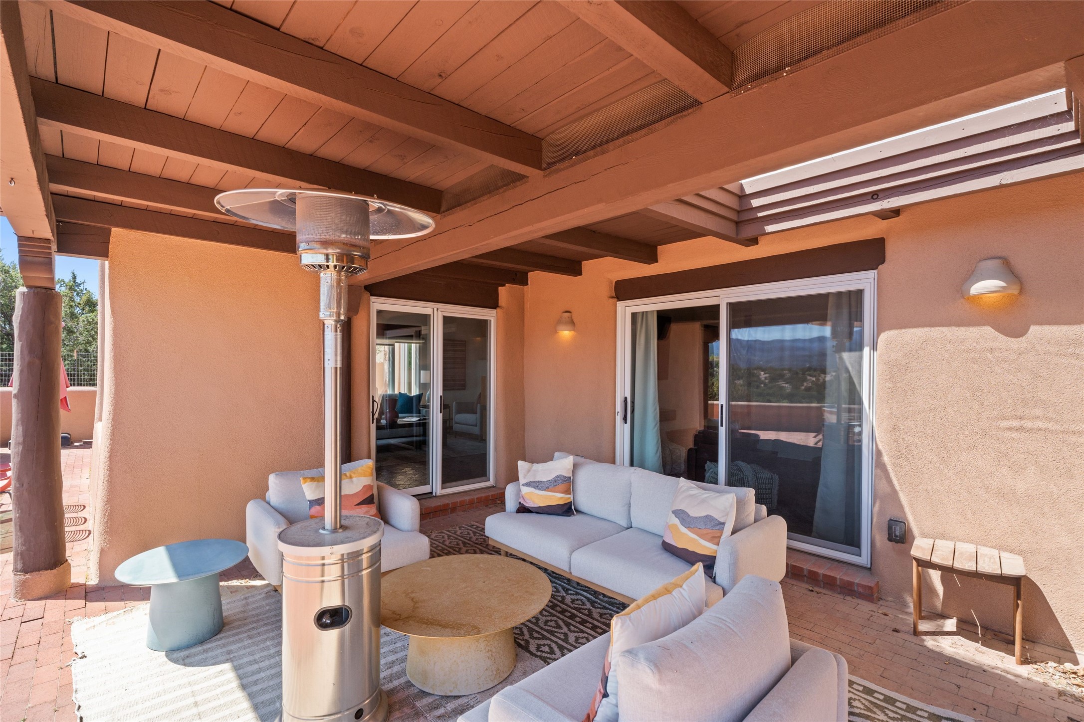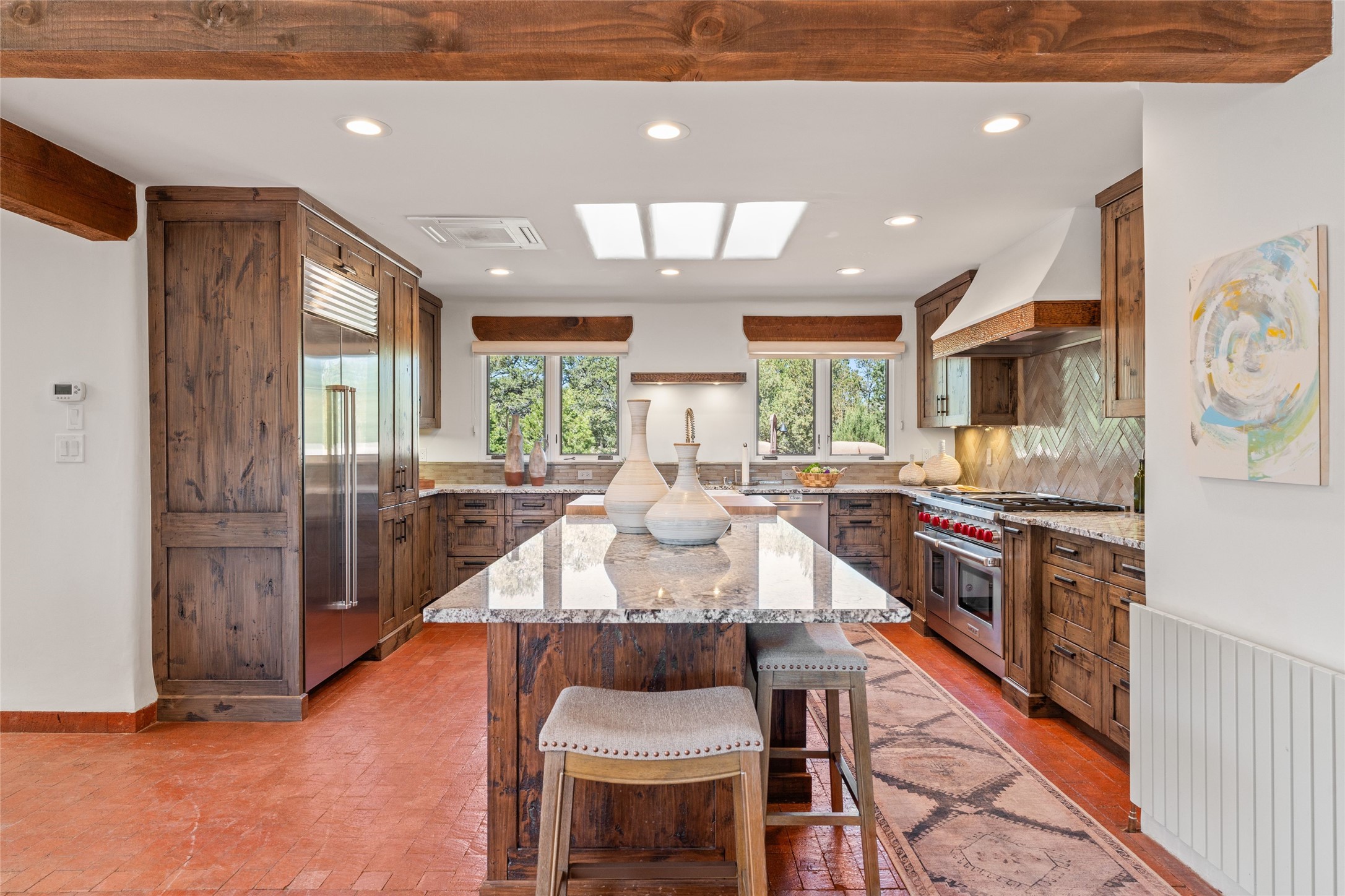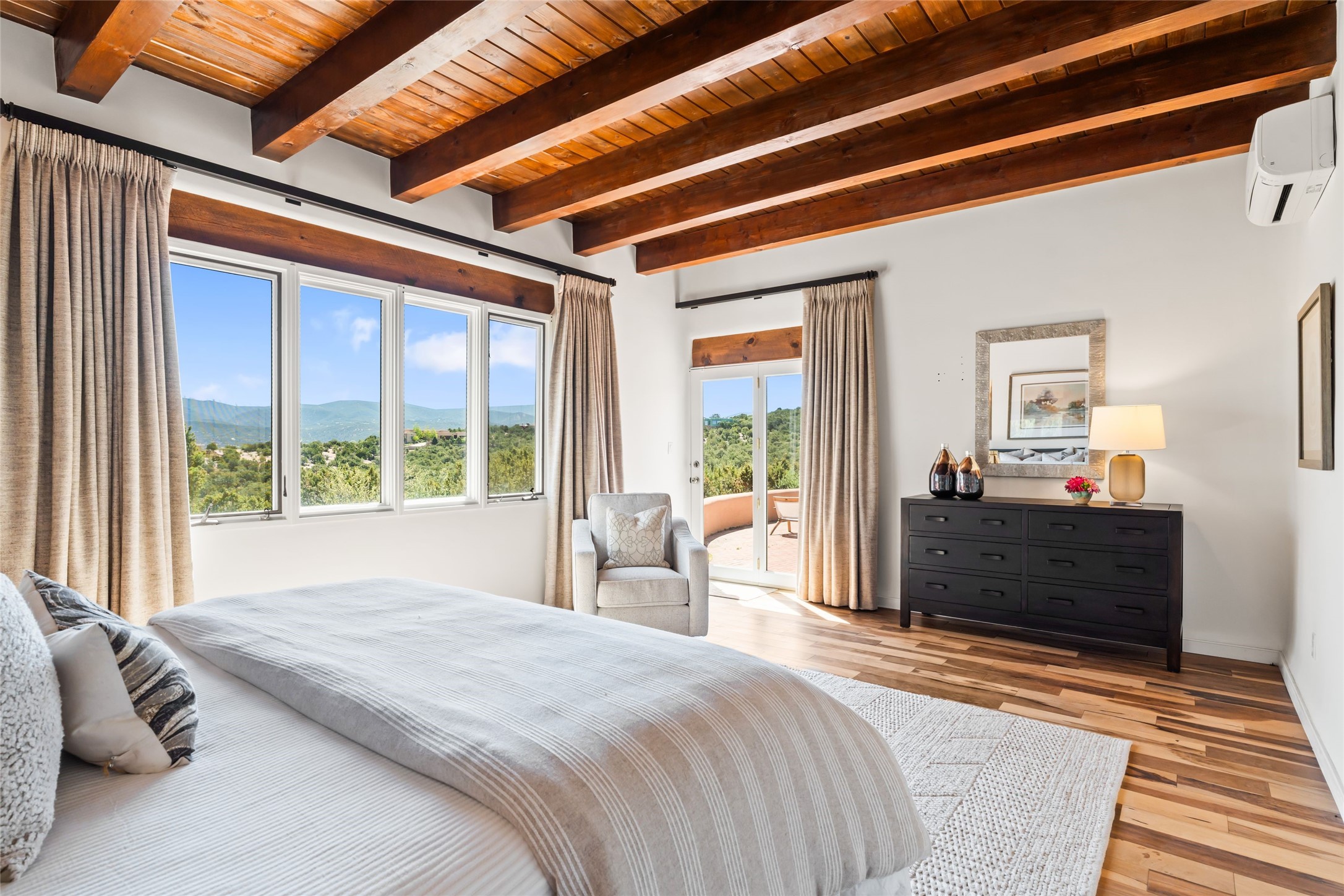 Breathtaking views and timeless Santa Fe charm converge in this enchanting light-filled Pueblo Revival home, ideally situated on 2.5 private, wooded acres just minutes from the historic Santa Fe Plaza. With panoramic vistas of the Sangre de Cristo Mountains, this single story 4-bedroom, 3.5-bath residence offers a rare combination of serenity, style, and location.At the heart of the home, the open-concept chef's kitchen--fully rebuilt in 2023--flows beautifully into the dining and living spaces, anchored by a massive picture window that captures the ever-changing mountain light. Outfitted with top-tier appliances by Wolf, Thermador, and KitchenAid, the kitchen features hand-glazed brick backsplash, premium granite countertops, abundant knotty alder cabinetry, clever under-counter storage solutions, and a oversized walk-in pantry.The four spacious bedrooms include two luxurious primary suites, each with a private full bath. These suites, along with the den, living room, and dining room, open directly onto a generously scaled patio, offering spectacular indoor/outdoor living with sweeping views of the Sangre de Cristos--a true extension of the interior space and an entertainer's dream. The patio features a covered portal, dining area, hot tub, and fire pit. Inside, classic Santa Fe design elements abound: two kiva fireplaces, exposed beams and vigas, ample skylights, brick flooring, decorative tile work and built-in bookcases lend warmth and regional authenticity to every room. The layout balances openness with privacy, including a separately located owner's suite with dual walk-in closets and stunning mountain views. Creative pursuits find a natural home in the separate workshop/art studio/yoga room, while ample storage, including a large laundry room and an oversized two-car garage, ensures functionality matches beauty. A beautiful home office space with large windows provides additional options for working from home, a home gym, or can be used as a 5th bedroom