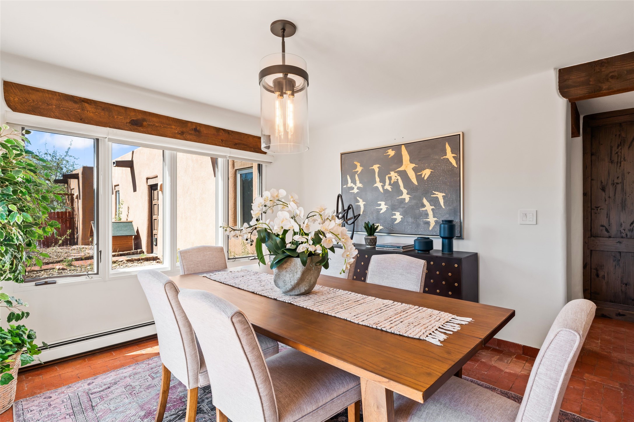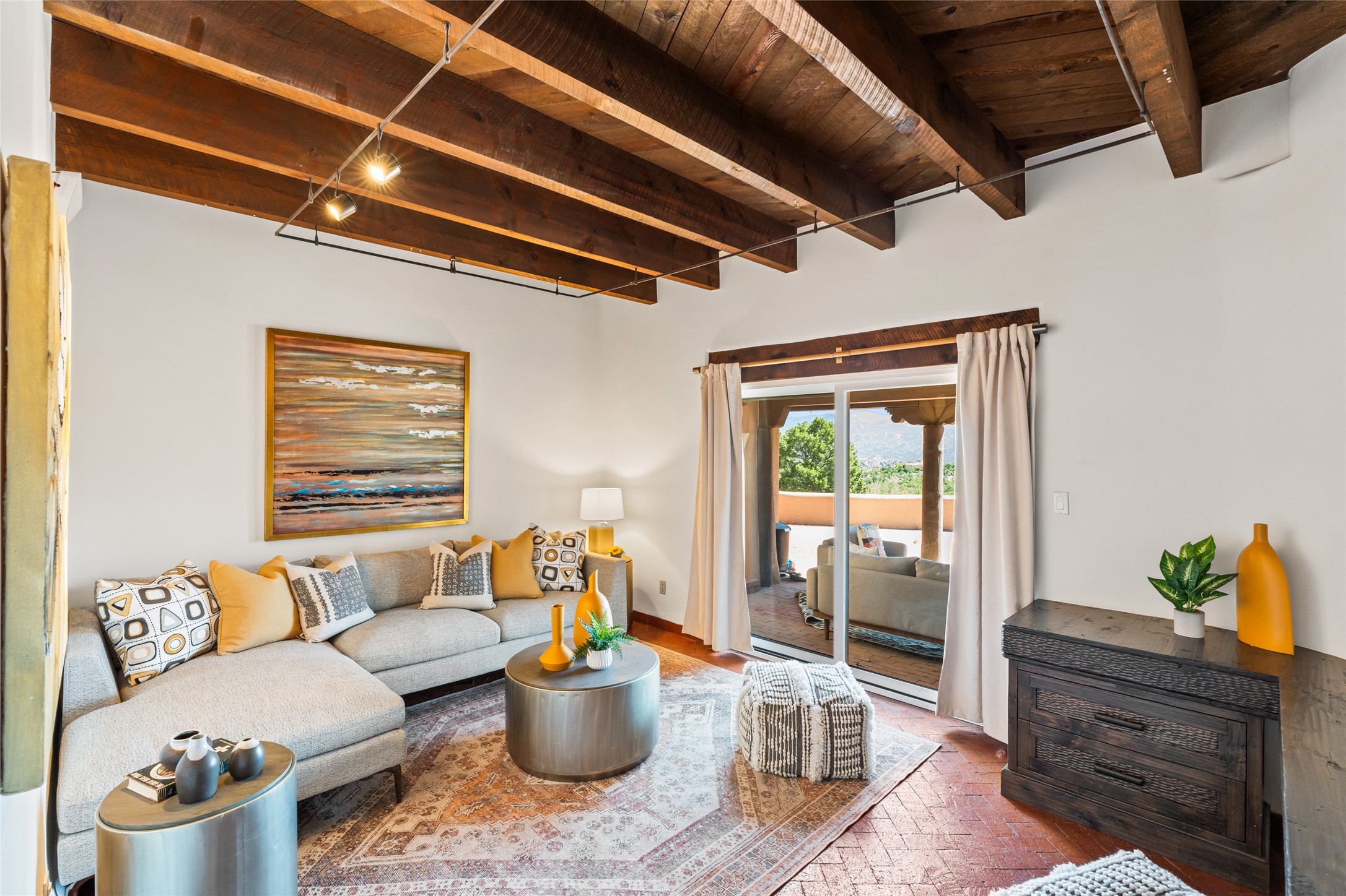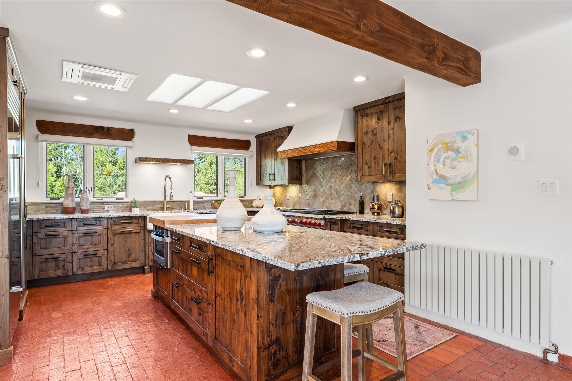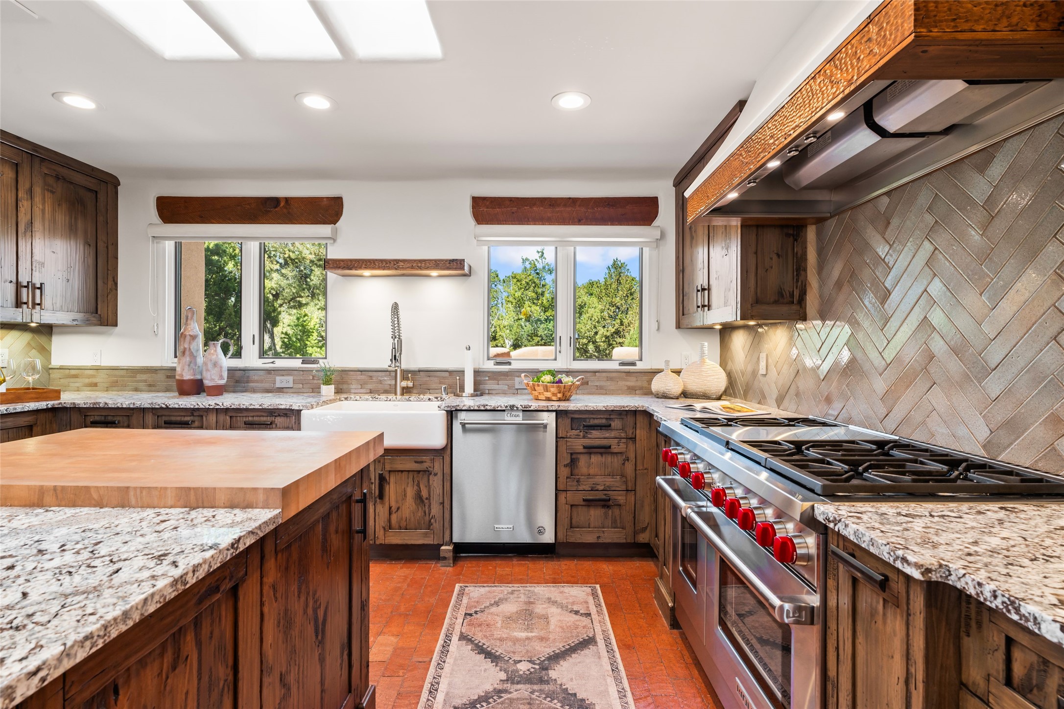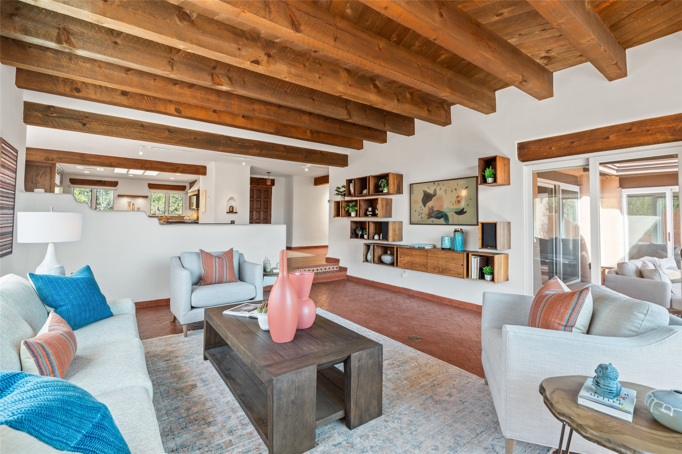 Breathtaking views and timeless Santa Fe charm converge in this enchanting light-filled Pueblo Revival home, ideally situated on 2.5 private, wooded acres just minutes from the historic Santa Fe Plaza. With panoramic vistas of the Sangre de Cristo Mountains, this single story 4-bedroom, 3.5-bath residence offers a rare combination of serenity, style, and location.At the heart of the home, the open-concept chef's kitchen--fully rebuilt in 2023--flows beautifully into the dining and living spaces, anchored by a massive picture window that captures the ever-changing mountain light. Outfitted with top-tier appliances by Wolf, Thermador, and KitchenAid, the kitchen features hand-glazed brick backsplash, premium granite countertops, abundant knotty alder cabinetry, clever under-counter storage solutions, and a oversized walk-in pantry.The four spacious bedrooms include two luxurious primary suites, each with a private full bath. These suites, along with the den, living room, and dining room, open directly onto a generously scaled patio, offering spectacular indoor/outdoor living with sweeping views of the Sangre de Cristos--a true extension of the interior space and an entertainer's dream. The patio features a covered portal, dining area, hot tub, and fire pit. Inside, classic Santa Fe design elements abound: two kiva fireplaces, exposed beams and vigas, ample skylights, brick flooring, decorative tile work and built-in bookcases lend warmth and regional authenticity to every room. The layout balances openness with privacy, including a separately located owner's suite with dual walk-in closets and stunning mountain views. Creative pursuits find a natural home in the separate workshop/art studio/yoga room, while ample storage, including a large laundry room and an oversized two-car garage, ensures functionality matches beauty. A beautiful home office space with large windows provides additional options for working from home, a home gym, or can be used as a 5th bedroom