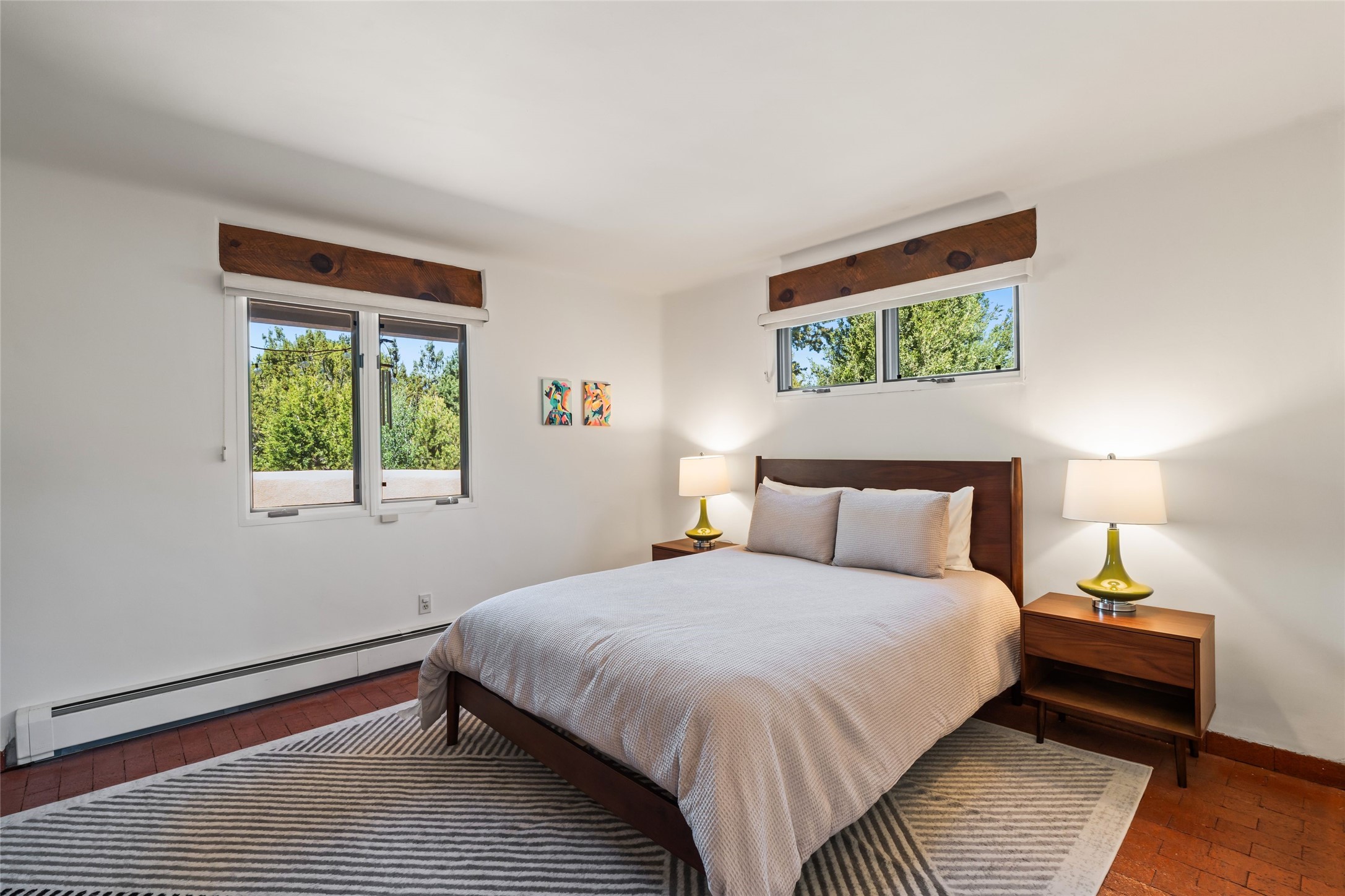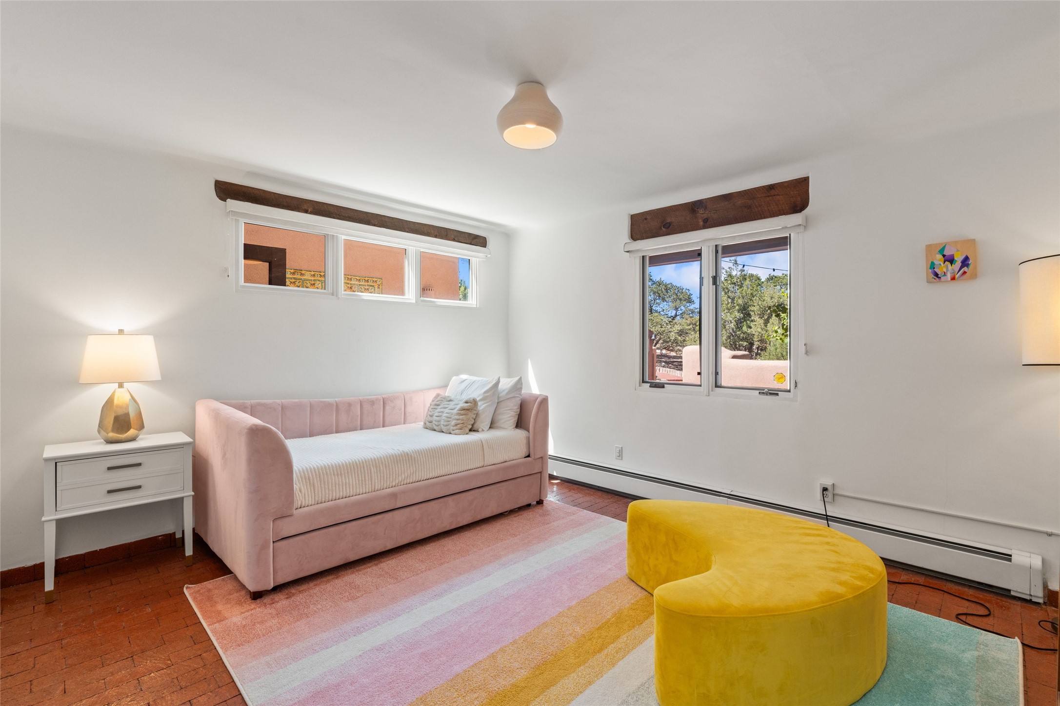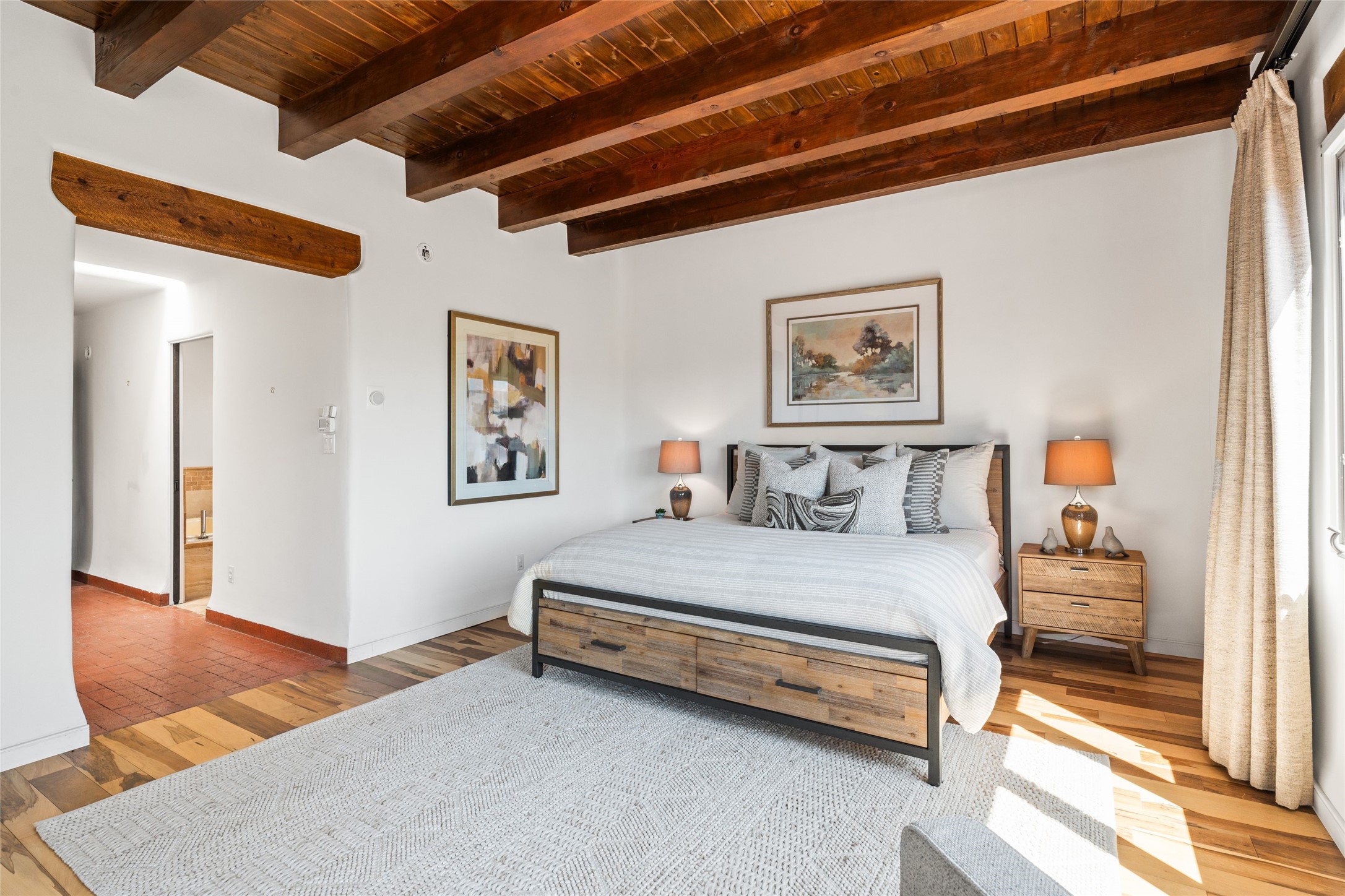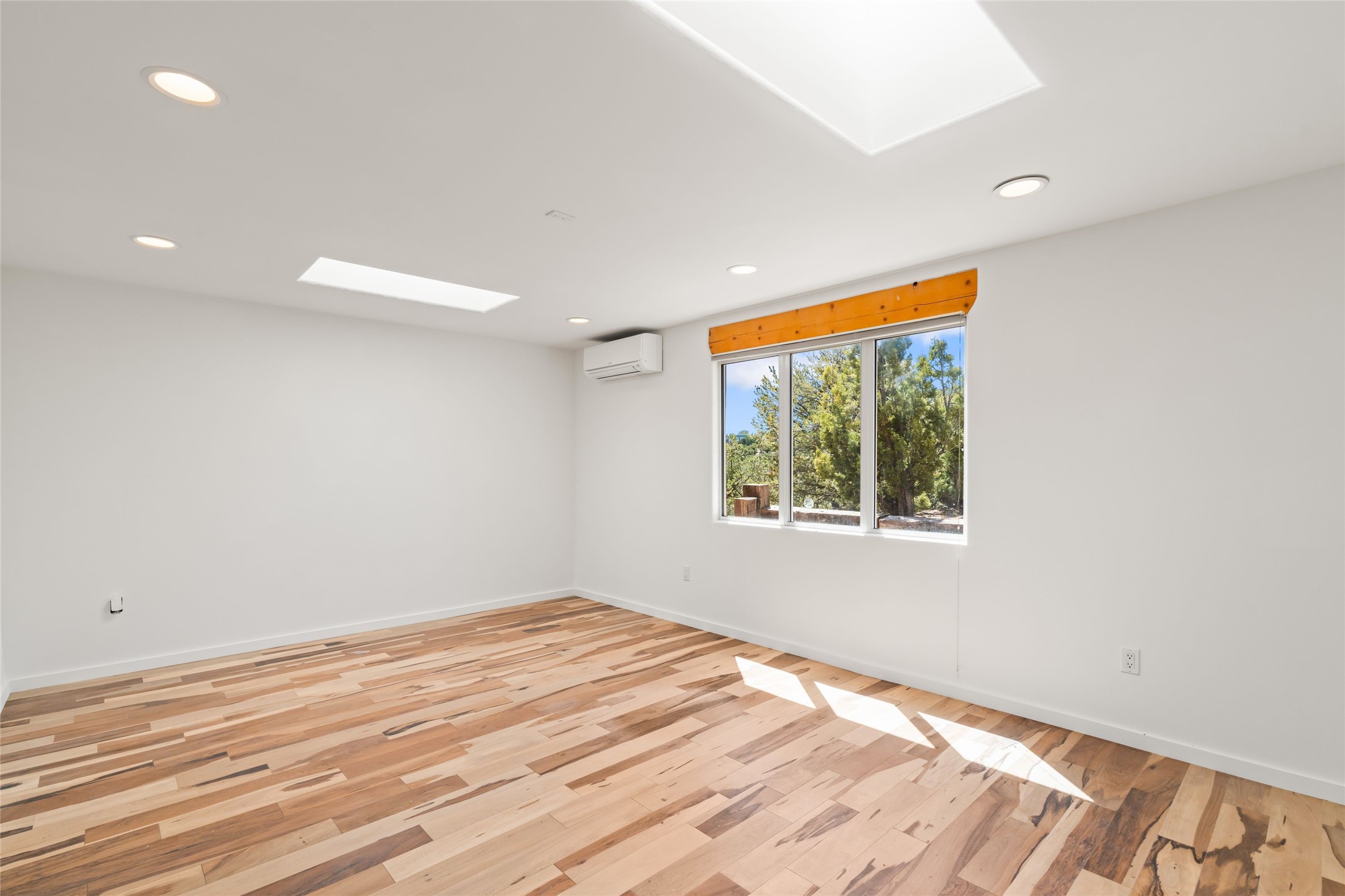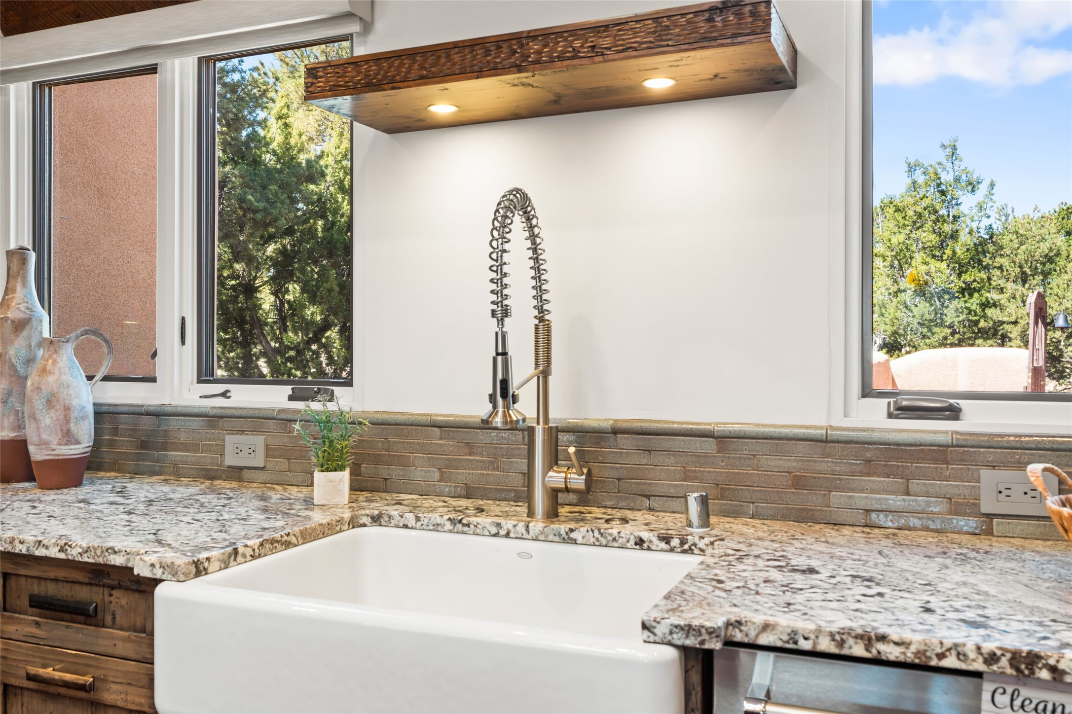 Breathtaking views and timeless Santa Fe charm converge in this enchanting light-filled Pueblo Revival home, ideally situated on 2.5 private, wooded acres just minutes from the historic Santa Fe Plaza. With panoramic vistas of the Sangre de Cristo Mountains, this single story 4-bedroom, 3.5-bath residence offers a rare combination of serenity, style, and location.At the heart of the home, the open-concept chef's kitchen--fully rebuilt in 2023--flows beautifully into the dining and living spaces, anchored by a massive picture window that captures the ever-changing mountain light. Outfitted with top-tier appliances by Wolf, Thermador, and KitchenAid, the kitchen features hand-glazed brick backsplash, premium granite countertops, abundant knotty alder cabinetry, clever under-counter storage solutions, and a oversized walk-in pantry.The four spacious bedrooms include two luxurious primary suites, each with a private full bath. These suites, along with the den, living room, and dining room, open directly onto a generously scaled patio, offering spectacular indoor/outdoor living with sweeping views of the Sangre de Cristos--a true extension of the interior space and an entertainer's dream. The patio features a covered portal, dining area, hot tub, and fire pit. Inside, classic Santa Fe design elements abound: two kiva fireplaces, exposed beams and vigas, ample skylights, brick flooring, decorative tile work and built-in bookcases lend warmth and regional authenticity to every room. The layout balances openness with privacy, including a separately located owner's suite with dual walk-in closets and stunning mountain views. Creative pursuits find a natural home in the separate workshop/art studio/yoga room, while ample storage, including a large laundry room and an oversized two-car garage, ensures functionality matches beauty. A beautiful home office space with large windows provides additional options for working from home, a home gym, or can be used as a 5th bedroom