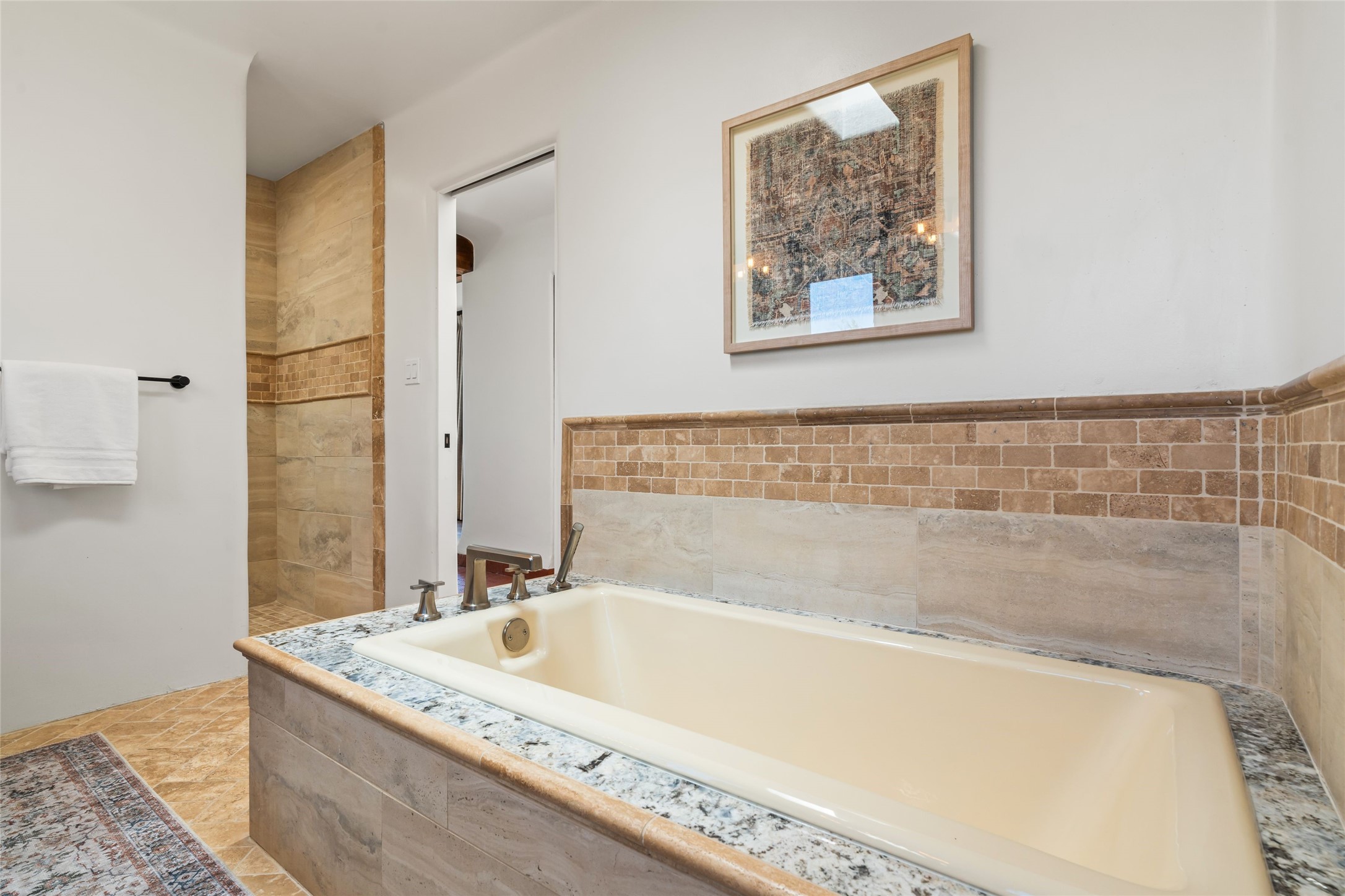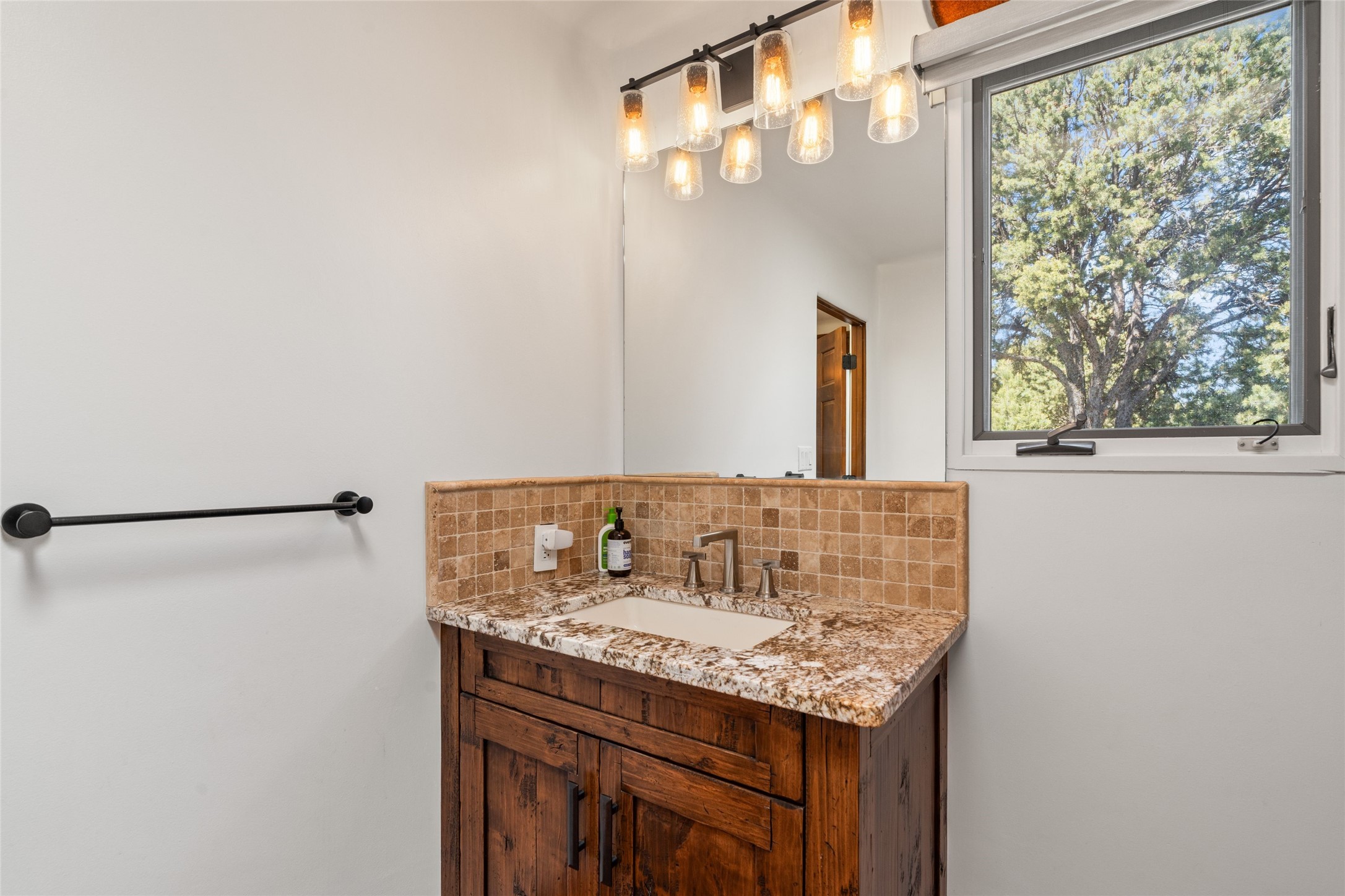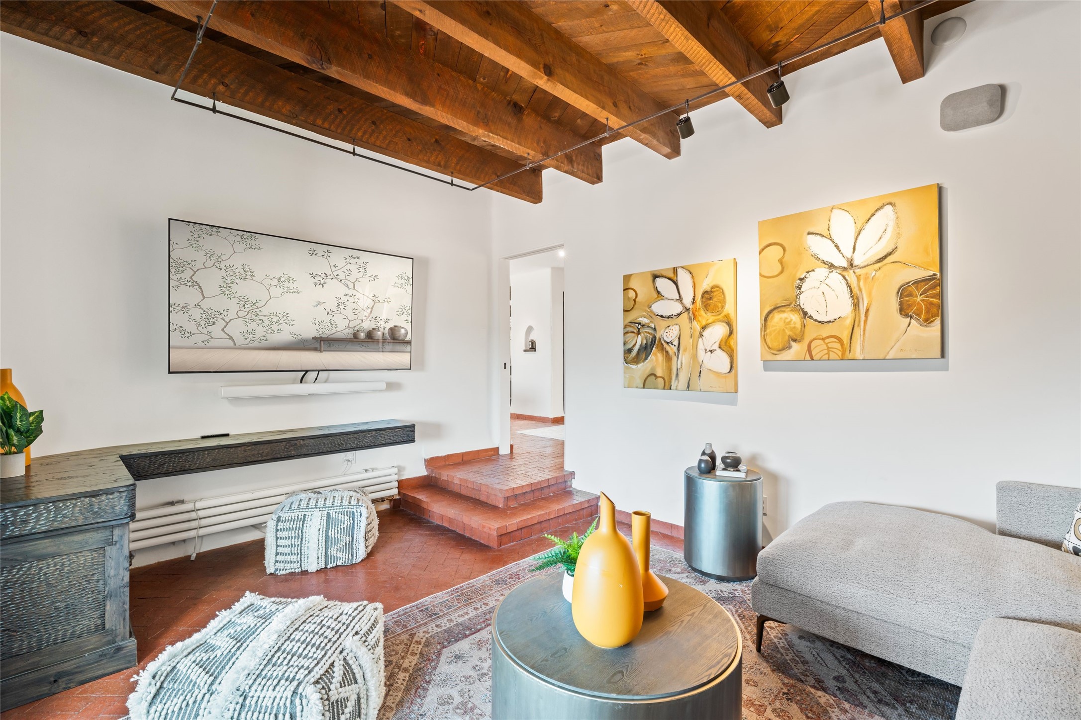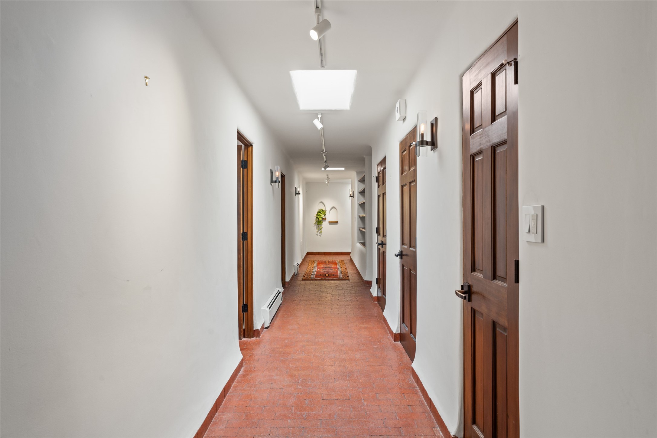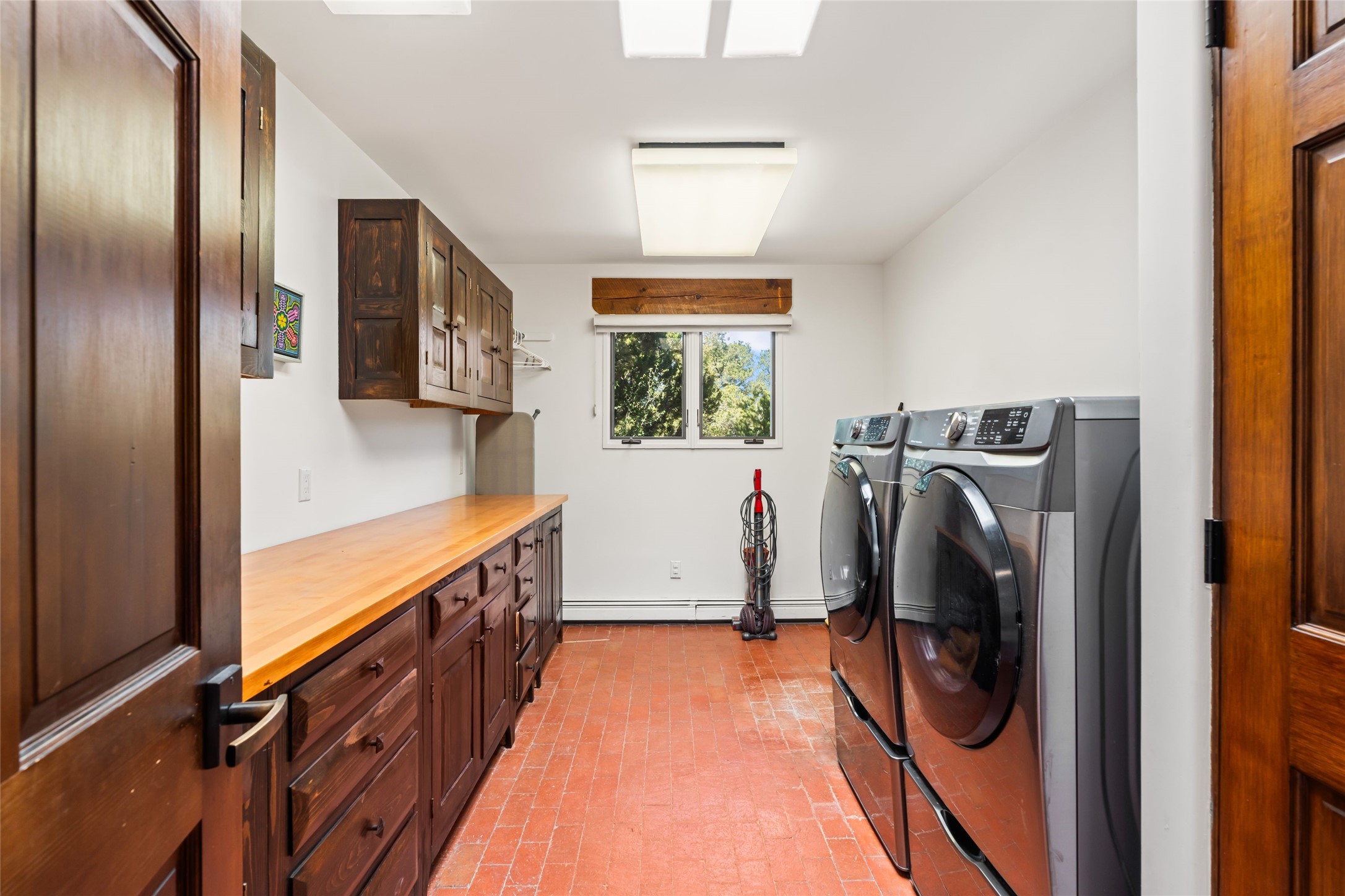 Breathtaking views and timeless Santa Fe charm converge in this enchanting light-filled Pueblo Revival home, ideally situated on 2.5 private, wooded acres just minutes from the historic Santa Fe Plaza. With panoramic vistas of the Sangre de Cristo Mountains, this single story 4-bedroom, 3.5-bath residence offers a rare combination of serenity, style, and location.At the heart of the home, the open-concept chef's kitchen--fully rebuilt in 2023--flows beautifully into the dining and living spaces, anchored by a massive picture window that captures the ever-changing mountain light. Outfitted with top-tier appliances by Wolf, Thermador, and KitchenAid, the kitchen features hand-glazed brick backsplash, premium granite countertops, abundant knotty alder cabinetry, clever under-counter storage solutions, and a oversized walk-in pantry.The four spacious bedrooms include two luxurious primary suites, each with a private full bath. These suites, along with the den, living room, and dining room, open directly onto a generously scaled patio, offering spectacular indoor/outdoor living with sweeping views of the Sangre de Cristos--a true extension of the interior space and an entertainer's dream. The patio features a covered portal, dining area, hot tub, and fire pit. Inside, classic Santa Fe design elements abound: two kiva fireplaces, exposed beams and vigas, ample skylights, brick flooring, decorative tile work and built-in bookcases lend warmth and regional authenticity to every room. The layout balances openness with privacy, including a separately located owner's suite with dual walk-in closets and stunning mountain views. Creative pursuits find a natural home in the separate workshop/art studio/yoga room, while ample storage, including a large laundry room and an oversized two-car garage, ensures functionality matches beauty. A beautiful home office space with large windows provides additional options for working from home, a home gym, or can be used as a 5th bedroom