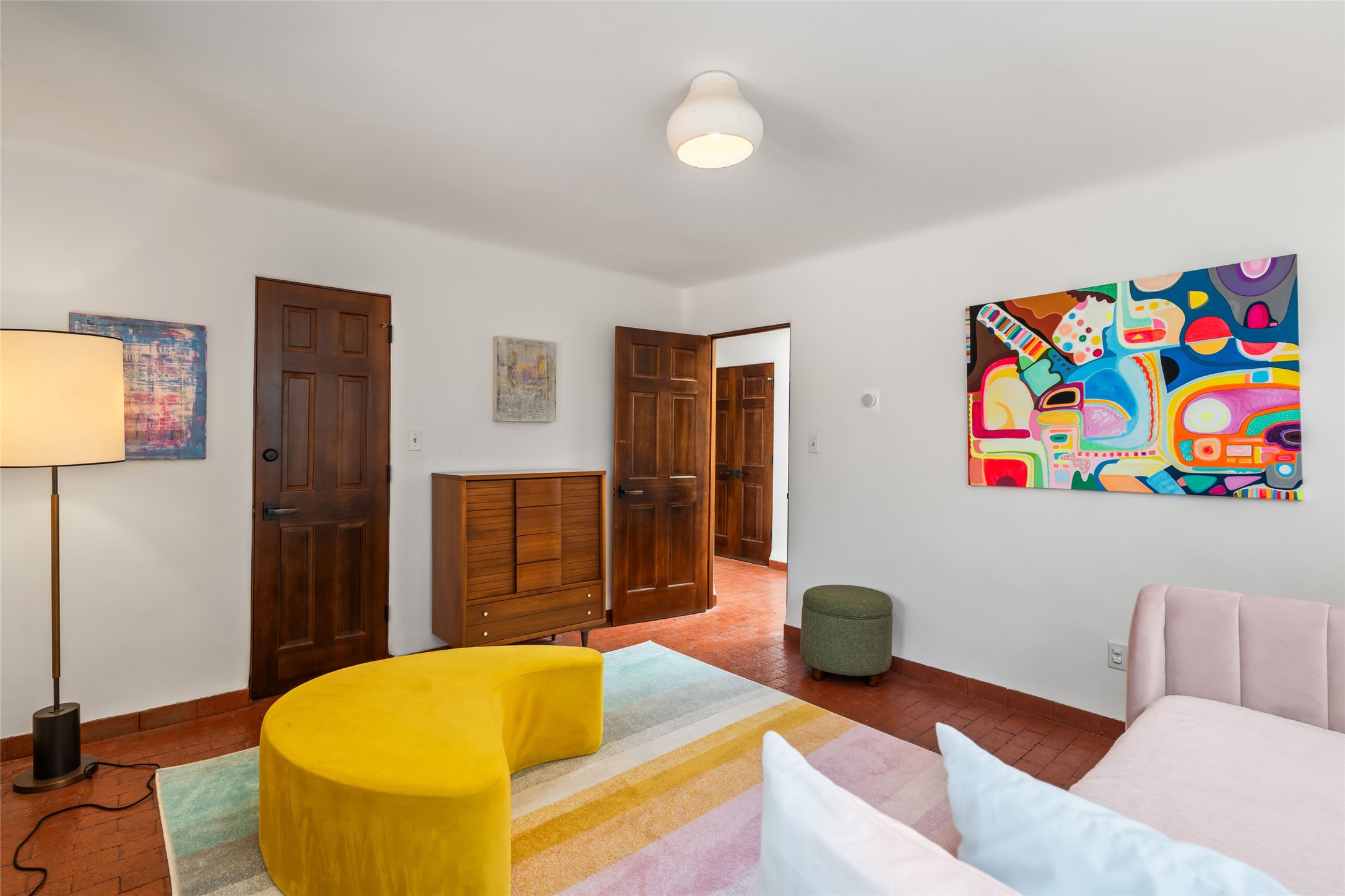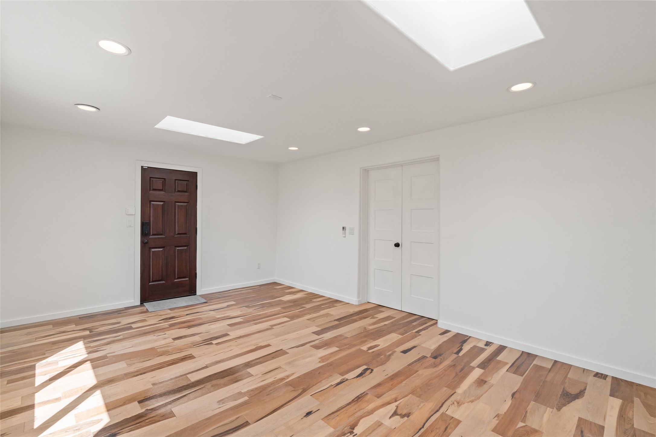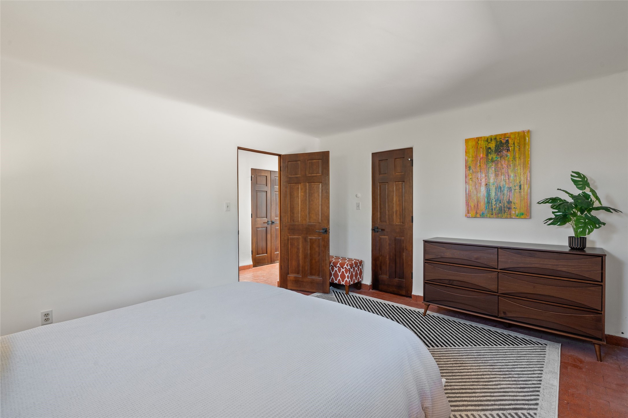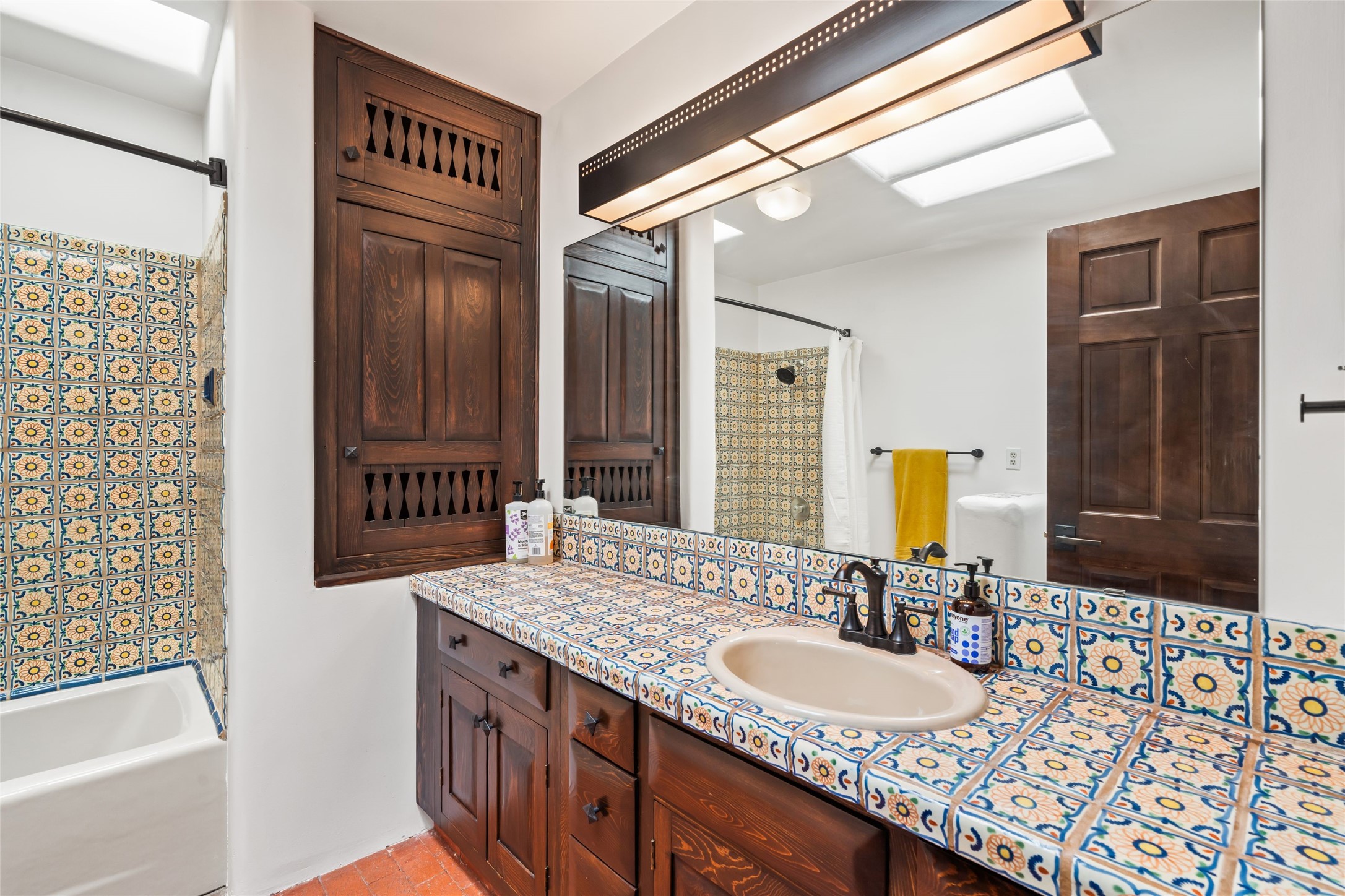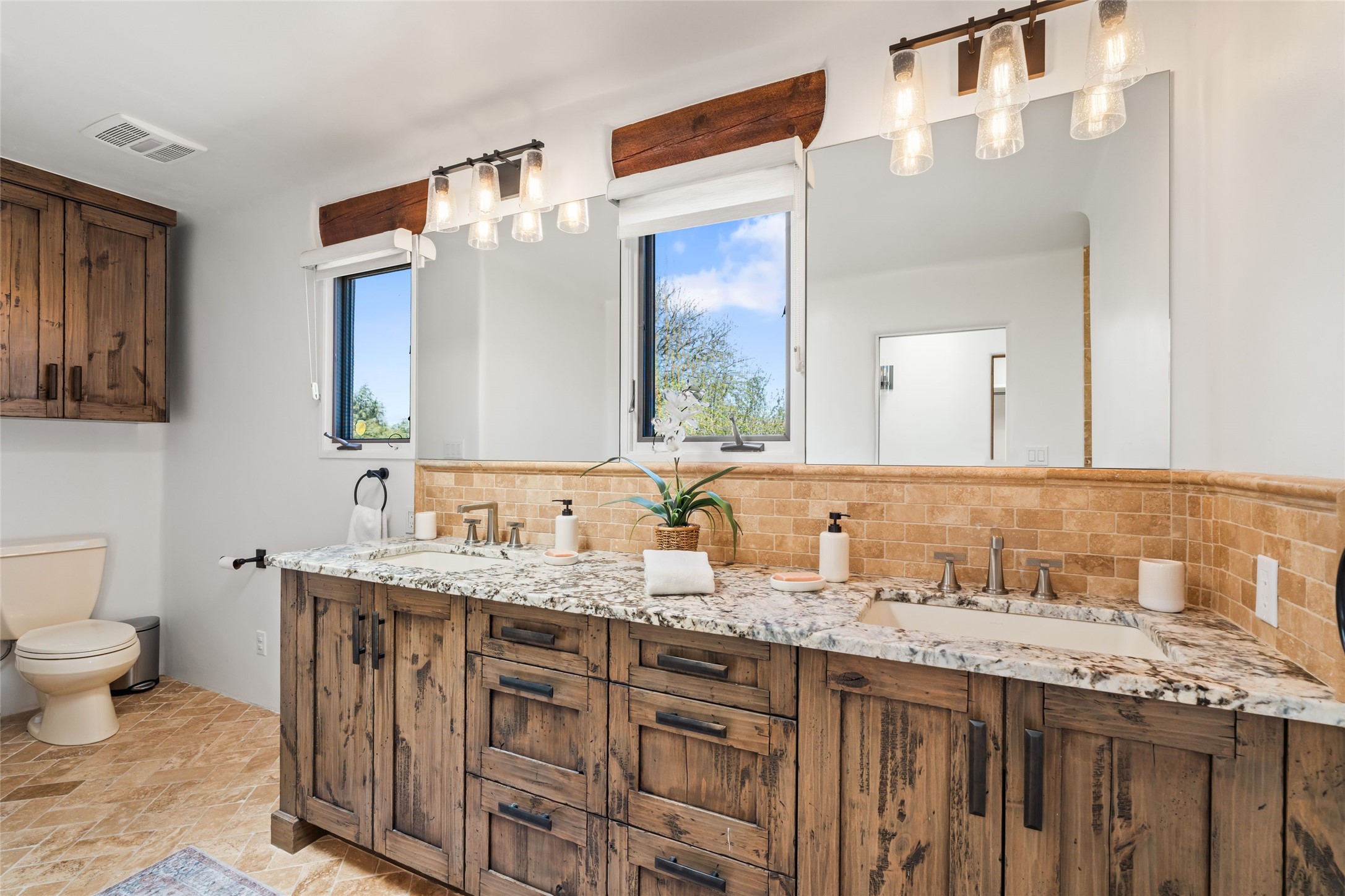 Breathtaking views and timeless Santa Fe charm converge in this enchanting light-filled Pueblo Revival home, ideally situated on 2.5 private, wooded acres just minutes from the historic Santa Fe Plaza. With panoramic vistas of the Sangre de Cristo Mountains, this single story 4-bedroom, 3.5-bath residence offers a rare combination of serenity, style, and location.At the heart of the home, the open-concept chef's kitchen--fully rebuilt in 2023--flows beautifully into the dining and living spaces, anchored by a massive picture window that captures the ever-changing mountain light. Outfitted with top-tier appliances by Wolf, Thermador, and KitchenAid, the kitchen features hand-glazed brick backsplash, premium granite countertops, abundant knotty alder cabinetry, clever under-counter storage solutions, and a oversized walk-in pantry.The four spacious bedrooms include two luxurious primary suites, each with a private full bath. These suites, along with the den, living room, and dining room, open directly onto a generously scaled patio, offering spectacular indoor/outdoor living with sweeping views of the Sangre de Cristos--a true extension of the interior space and an entertainer's dream. The patio features a covered portal, dining area, hot tub, and fire pit. Inside, classic Santa Fe design elements abound: two kiva fireplaces, exposed beams and vigas, ample skylights, brick flooring, decorative tile work and built-in bookcases lend warmth and regional authenticity to every room. The layout balances openness with privacy, including a separately located owner's suite with dual walk-in closets and stunning mountain views. Creative pursuits find a natural home in the separate workshop/art studio/yoga room, while ample storage, including a large laundry room and an oversized two-car garage, ensures functionality matches beauty. A beautiful home office space with large windows provides additional options for working from home, a home gym, or can be used as a 5th bedroom