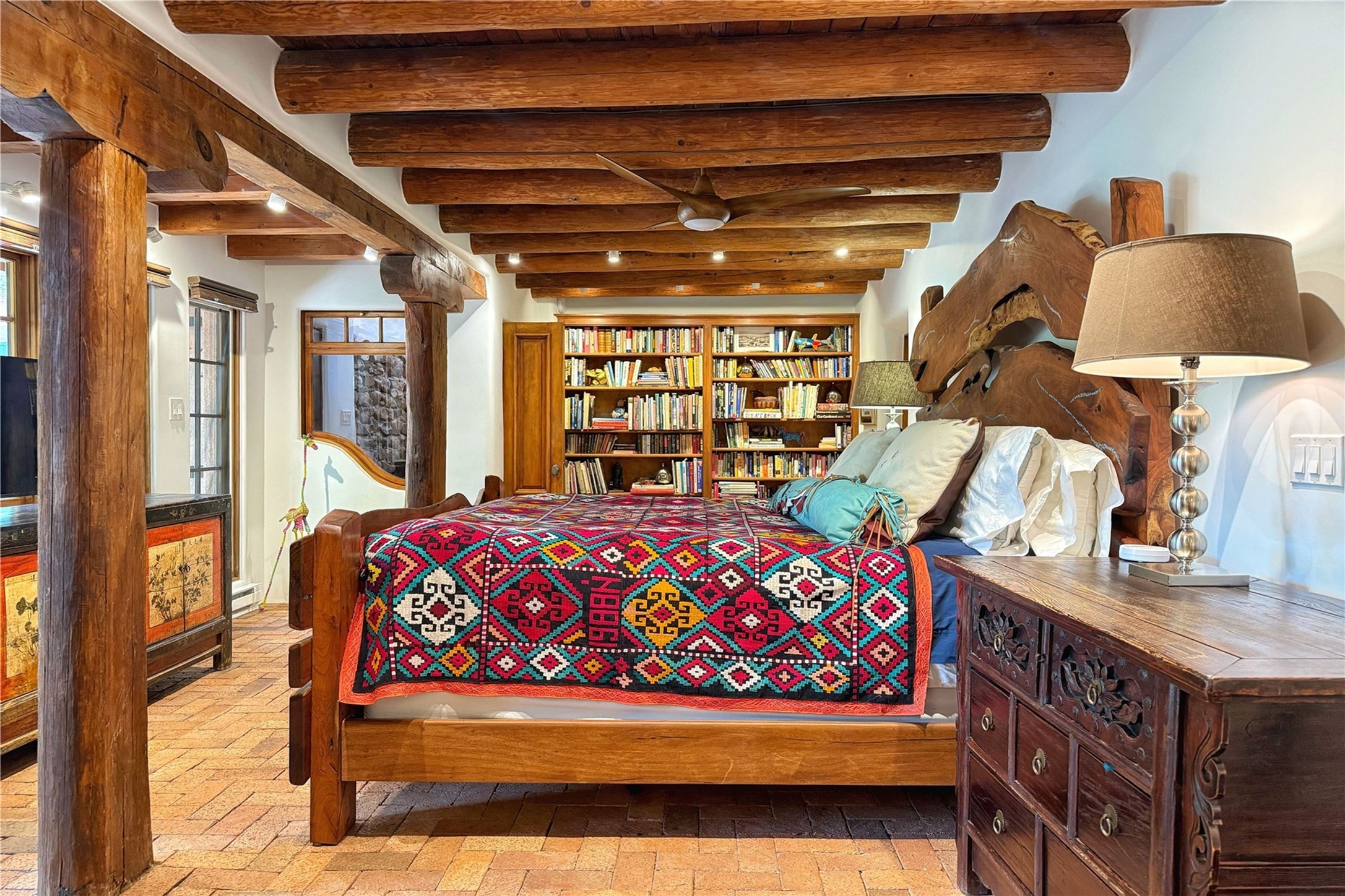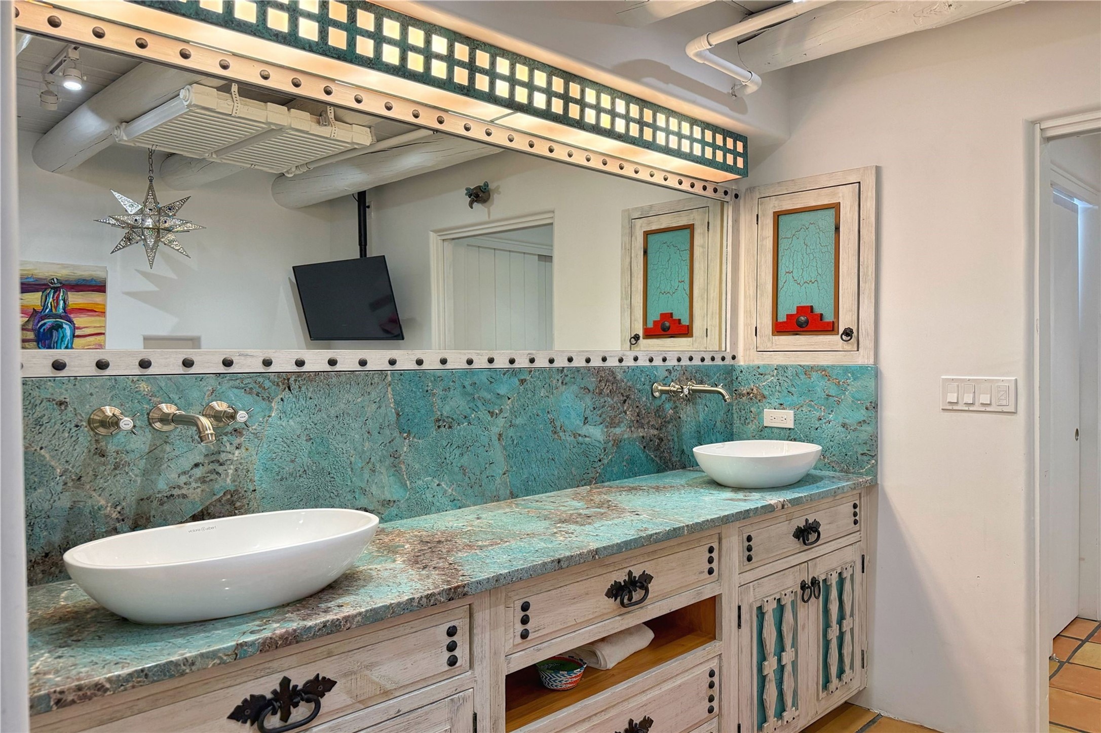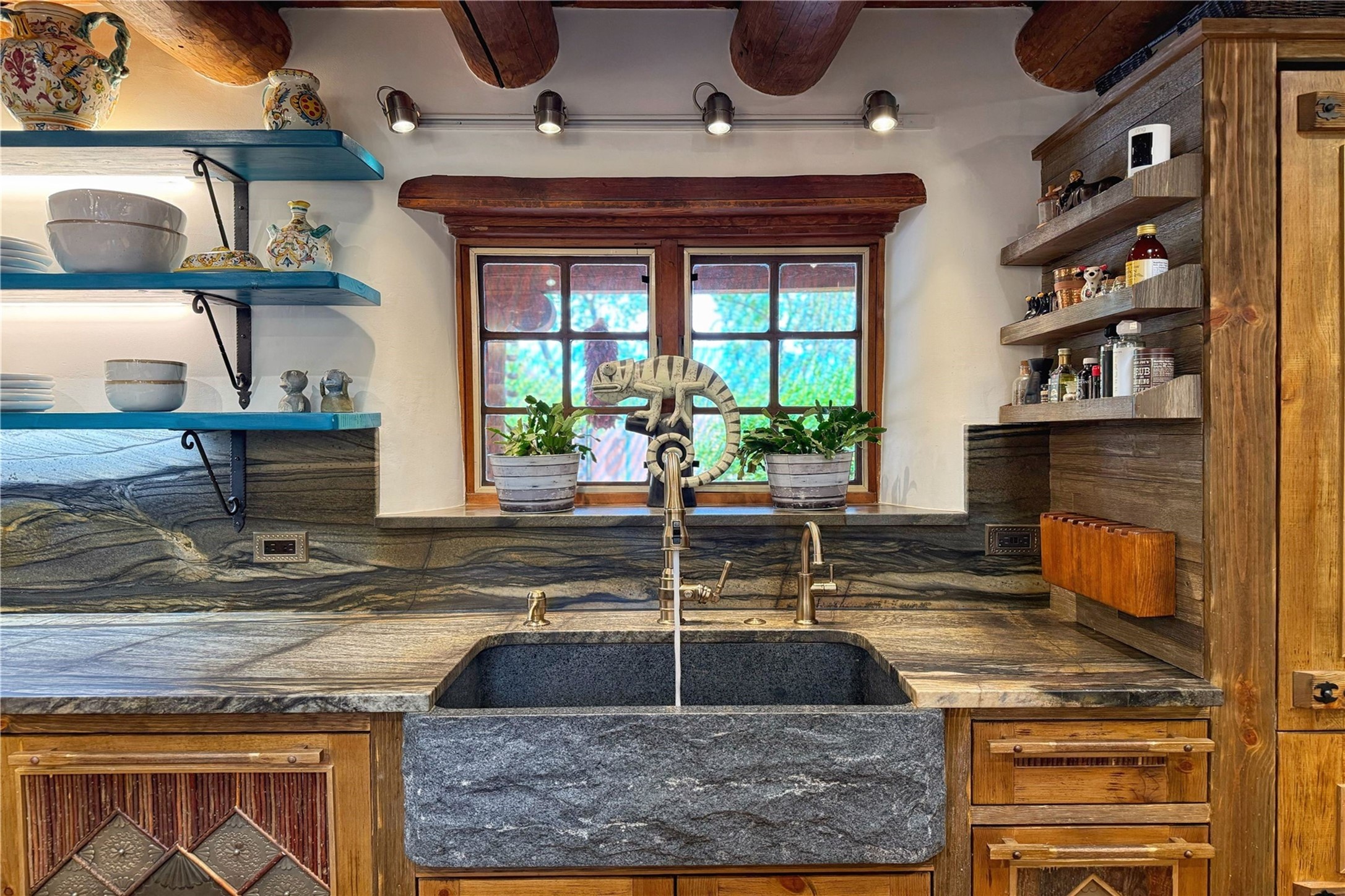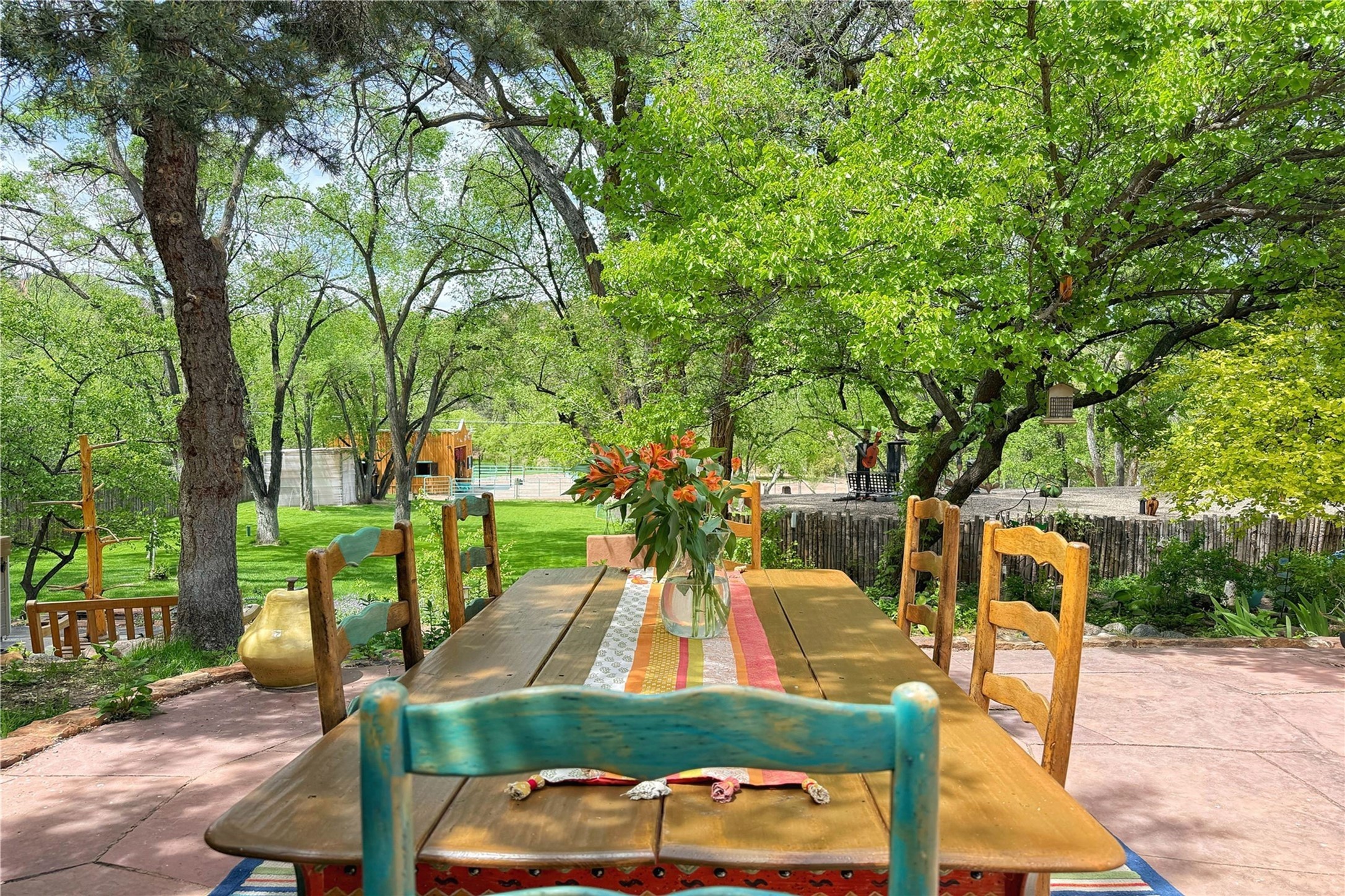 Exquisite Historic Compound with Modern Luxuries - Recent Extensive Renovation Creating a Truly Unique Lush Tesuque Oasis. Welcome to this extraordinary multi-residence estate nestled on a historic 100+ year-old property. Seamlessly blending Old Santa Fe charm with modern sophistication. From handcrafted elements to lush gardens, every detail of this property tells a story.Enter into a serene courtyard with water features, mature trees, and fruiting grapevines that leads to a warm sitting room and flows into the dining area and gourmet kitchen.Granite leather-finished countertops, a deep stone sink, open shelving, skylights, Liebherr fridge, and custom cabinetry complete a kitchen that is like no other. The main house features timeless design with 18 inch adobe walls, hardwood floors, original vigas, multiple kivas and custom cabinetry crafted on-site from 100-year-old wood.Downstairs, the primary suite is nestled below the main living area. Relax with a kiva fireplace, and a peaceful view of the back garden. Stunning Brazilian Aquamarine granite graces the primary bath. "Dancing Hare" casita offers Saltillo tile, two bedrooms, a full kitchen with Taj Mahal counters, turquoise cabinets, and a private patio and balcony. This casita has separate parking adding privacy. "Laughing Horse" casita features open-concept living with large glass doors opening to the garden with stable views, original exposed brick and wood stove, and a full kitchen. Additional Structures include large art studio with private entrance, an expansive gym, and two-stalled stables. This property boats multiple stunning outdoor spaces for dining, gardening and entertaining parties intimate or grand. Terraced levels, hot tub, fire-pit, a creek running at the back of the property and apricot trees complete this oasis. A rare opportunity to own a piece of history enhanced with artisanal craftsmanship and high-end modern finishes. A perfect personal sanctuary or family compound.
