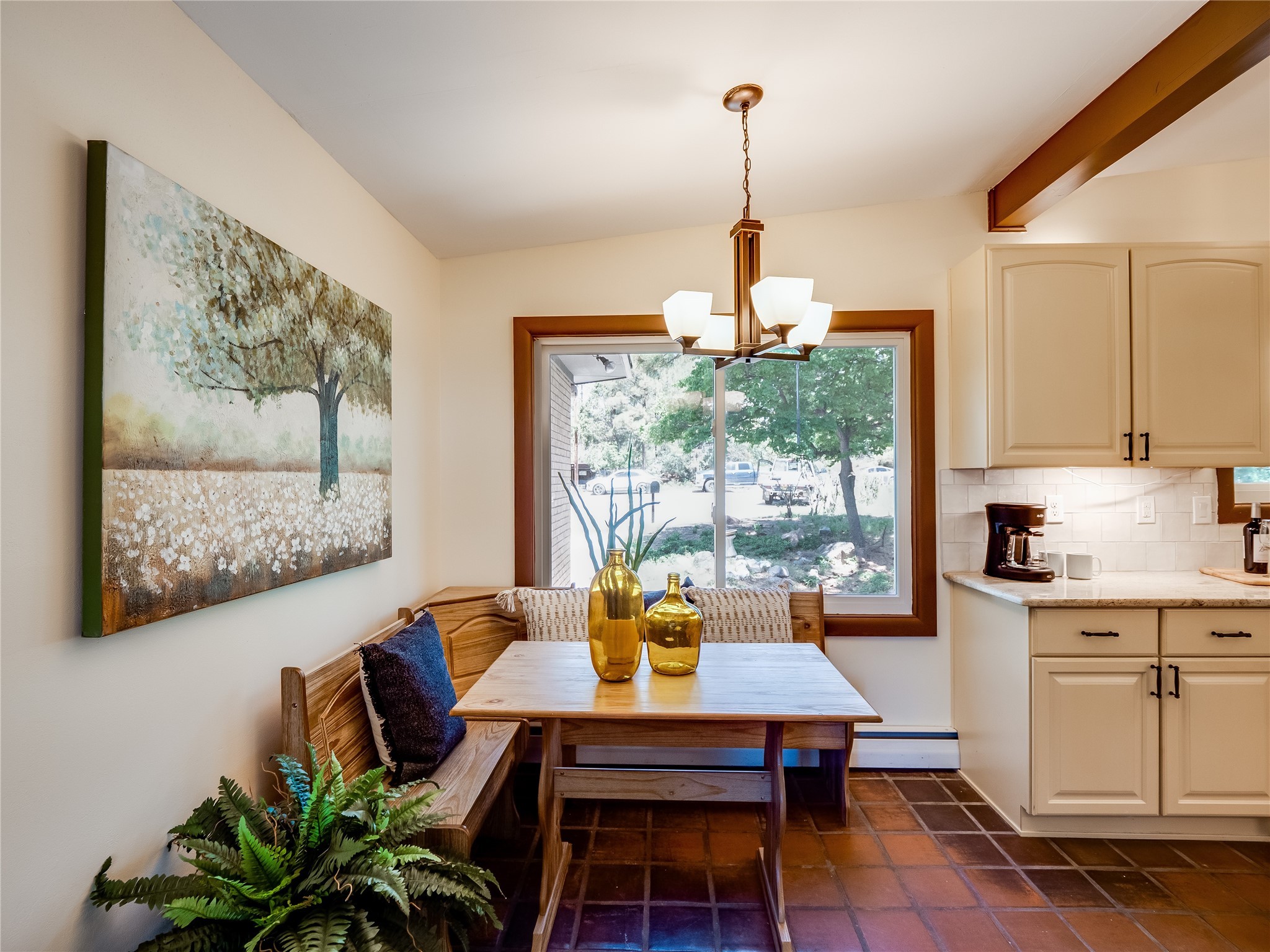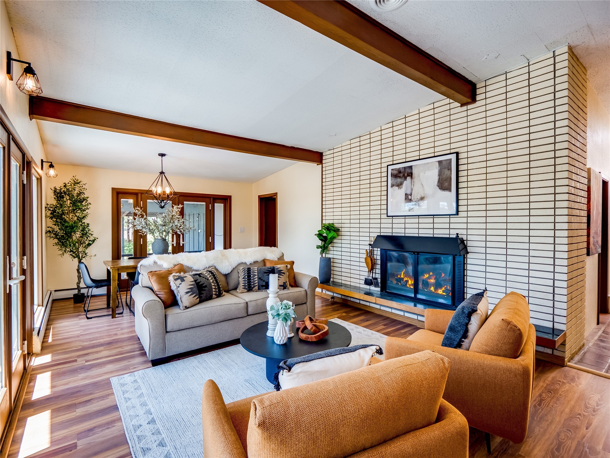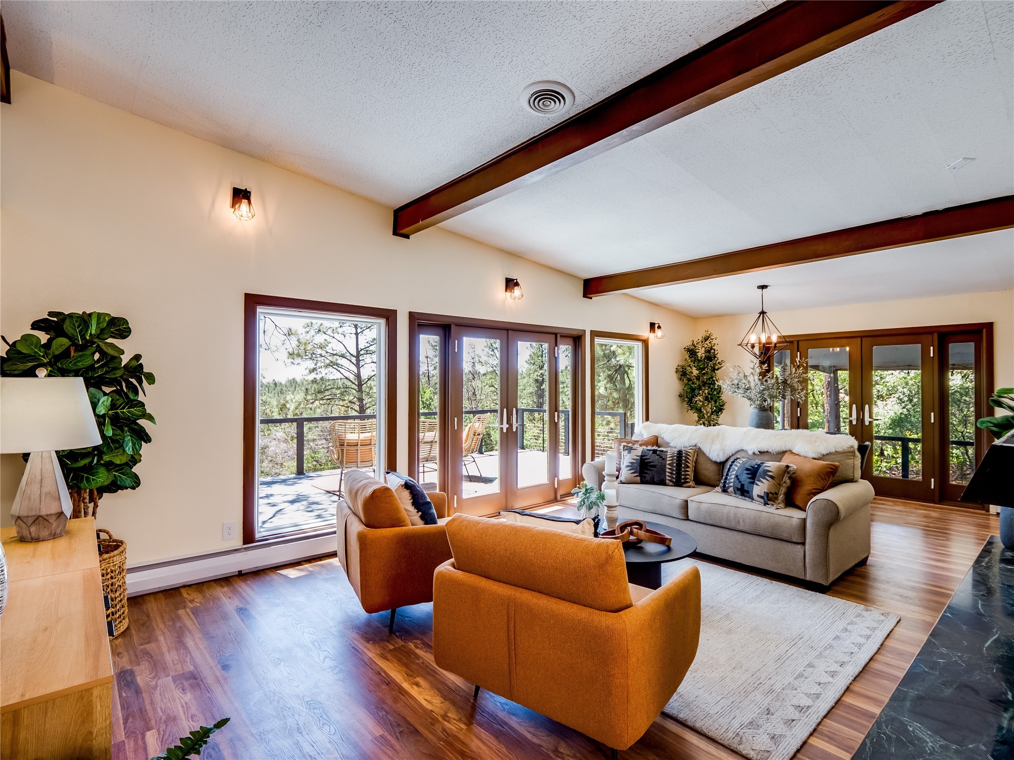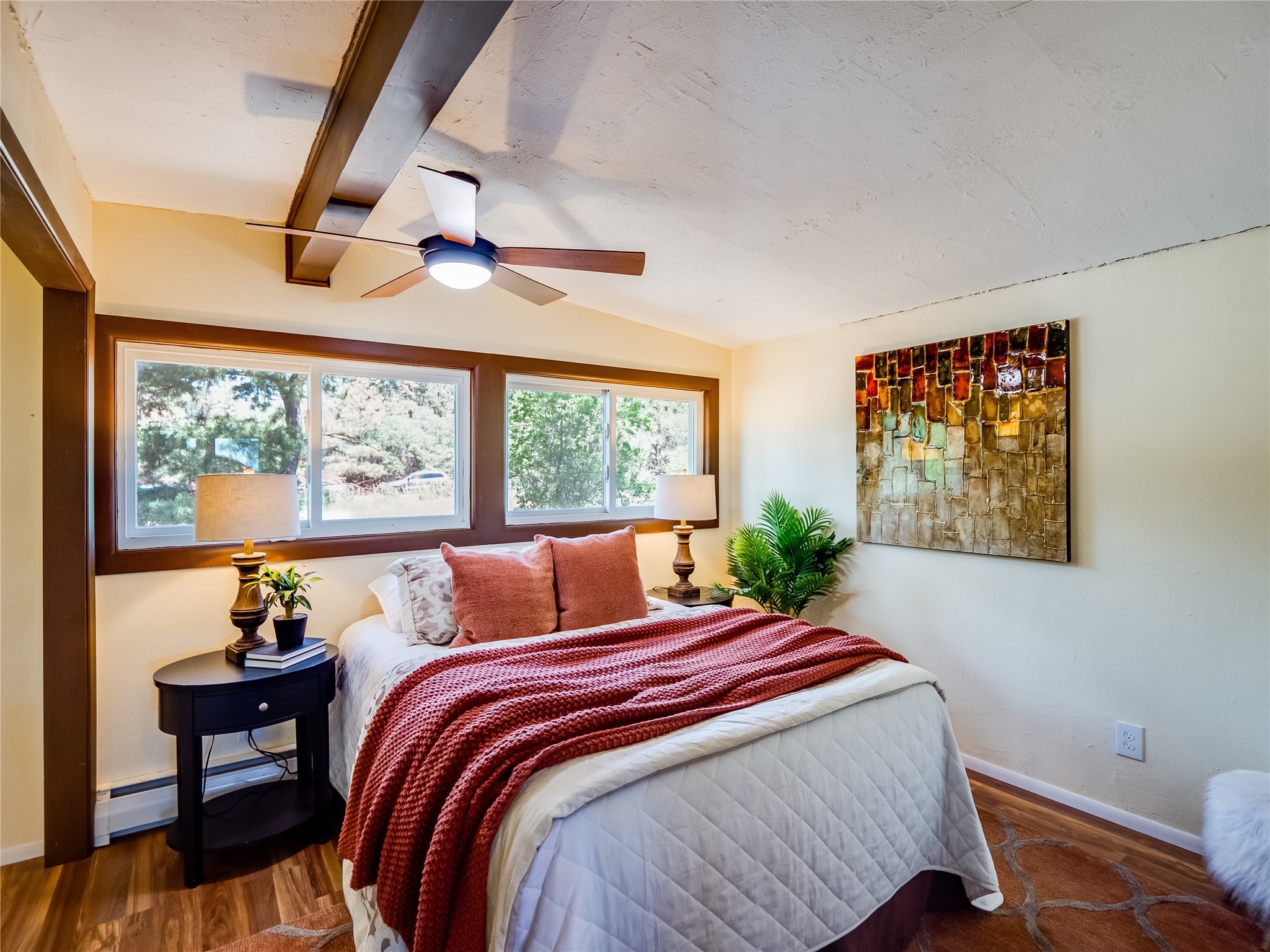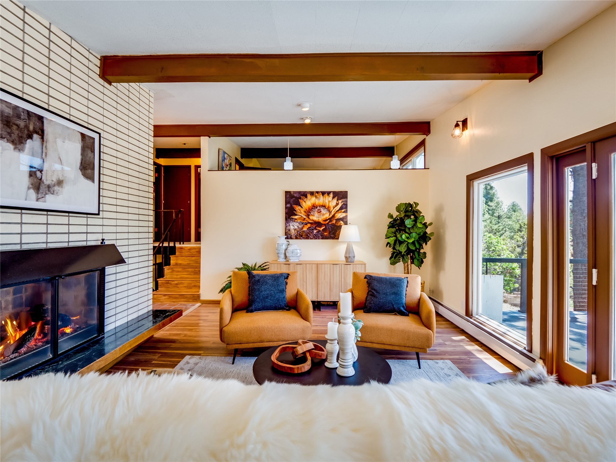 Nestled at the end of a quiet cul-de-sac in desirable Barranca Mesa, this multi-level canyon home offers space, privacy, and breathtaking views. Step inside and you are immediately drawn to the stunning open living and dining area with soaring vaulted ceilings with wood beams, warm laminate wood floors, and a wall of Anderson windows that flood the space with natural light. Two separate access points lead to multiple decks that overlook the canyon, creating a seamless indoor-outdoor flow perfect for entertaining with family and friends and taking in the serene surroundings. A cozy brick wood-burning fireplace anchors the room and adds charm to the main living space. The beautifully renovated galley-style kitchen features tile flooring, cream-colored shaker cabinets with black hardware, granite counters, and a stylish tile backsplash. Brand-new Caf brand appliances elevate the space, while a pantry and cozy breakfast nook offer function and flexibility. Off the kitchen, access the attached two-car garage for added convenience. Upstairs, you'll find a guest bedroom and a spacious loft-style primary bedroom that overlooks the living area below and includes multiple closets. The shared updated bathroom has a modern touch with a sleek single-sink vanity, walk-in shower, and backlit mirror. A few steps down reveals two more bedrooms and a second full bath with vintage-style blue tile, walk-in shower, and another light-up mirror. The lowest level features a spacious walk-out basement family room with a wall of windows, access to the large covered patio, a rustic stone wood-burning fireplace, and eye-catching tin ceilings. This level also includes a laundry room with additional storage, plus a separate storage room. Outside, the oversized backyard extends to the canyon ridge, offering a blank canvas to create your dream outdoor oasis. Located close to hiking trails, the golf course, and outdoor recreation, this one-of-a-kind home is perfect for nature lovers.
