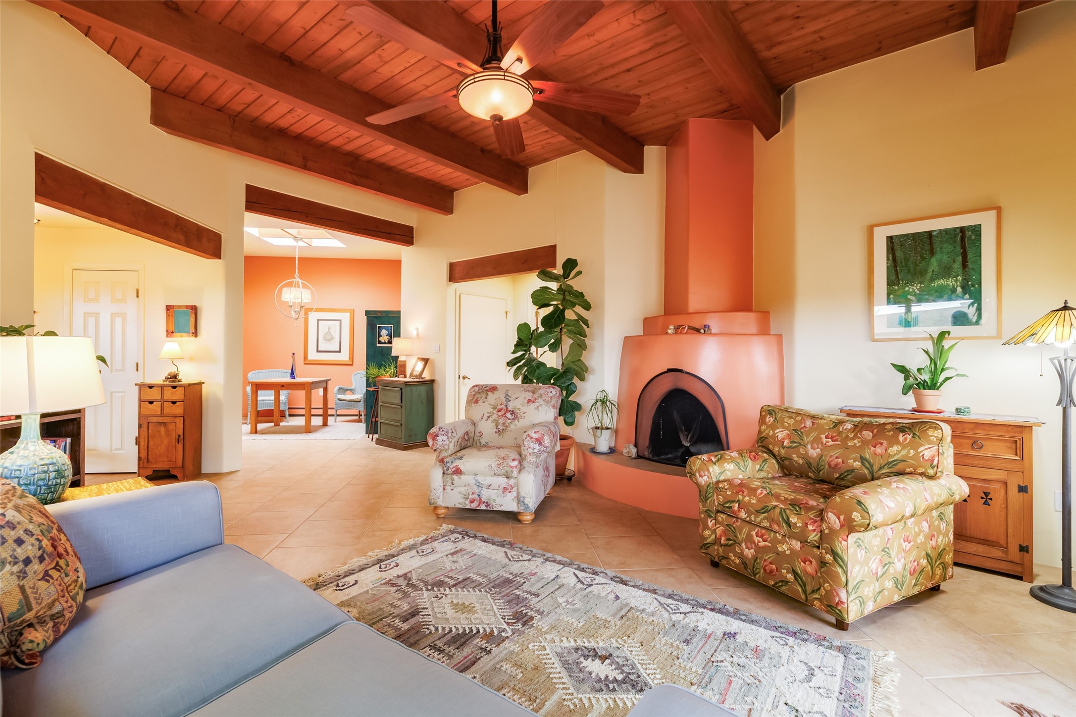 Welcome to this beautifully updated and meticulously maintained Park Plazas home, offering flexible living with 3 bedrooms or 2 bedrooms plus a dedicated office. The main living areas feature elegant tile flooring, while the bedrooms are graced with luxurious wood-look vinyl for a warm, inviting feel.Step into the spacious living room where high, beamed ceilings and a dramatic Kiva fireplace create a striking focal point. Sliding doors lead you to a generous covered portal and a flagstone patio--perfect for year-round indoor-outdoor living.The fully landscaped yard is a true oasis, showcasing an ornamental plum tree, vibrant Rose of Sharon, stately Blue Point Juniper, and a variety of flowering and evergreen plants. Multiple sitting areas and a charming pergola provide ideal spaces for entertaining or relaxing al fresco.Inside, the remodeled kitchen features newer cabinetry, sleek appliances, and stylish countertops, seamlessly combining functionality with modern aesthetics. Enjoy comfort throughout the seasons with efficient hot water baseboard heating and four mini-split units for zoned cooling.A two-car garage with direct access into the kitchen adds everyday convenience to this already stellar home.Don't miss your chance to own this standout Park Plazas property that blends classic Santa Fe style with thoughtful upgrades and lush outdoor living.