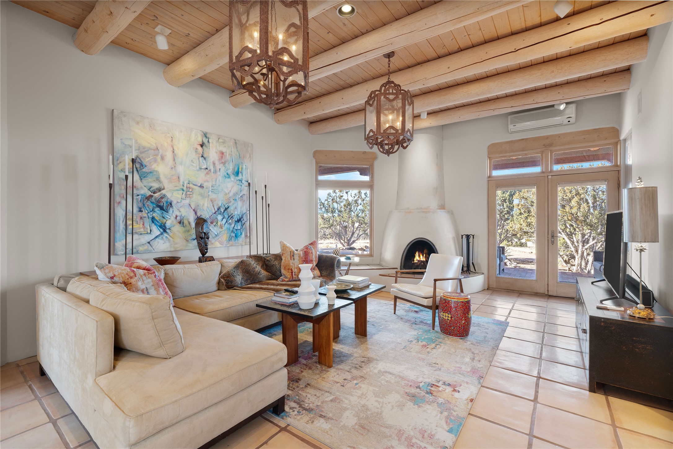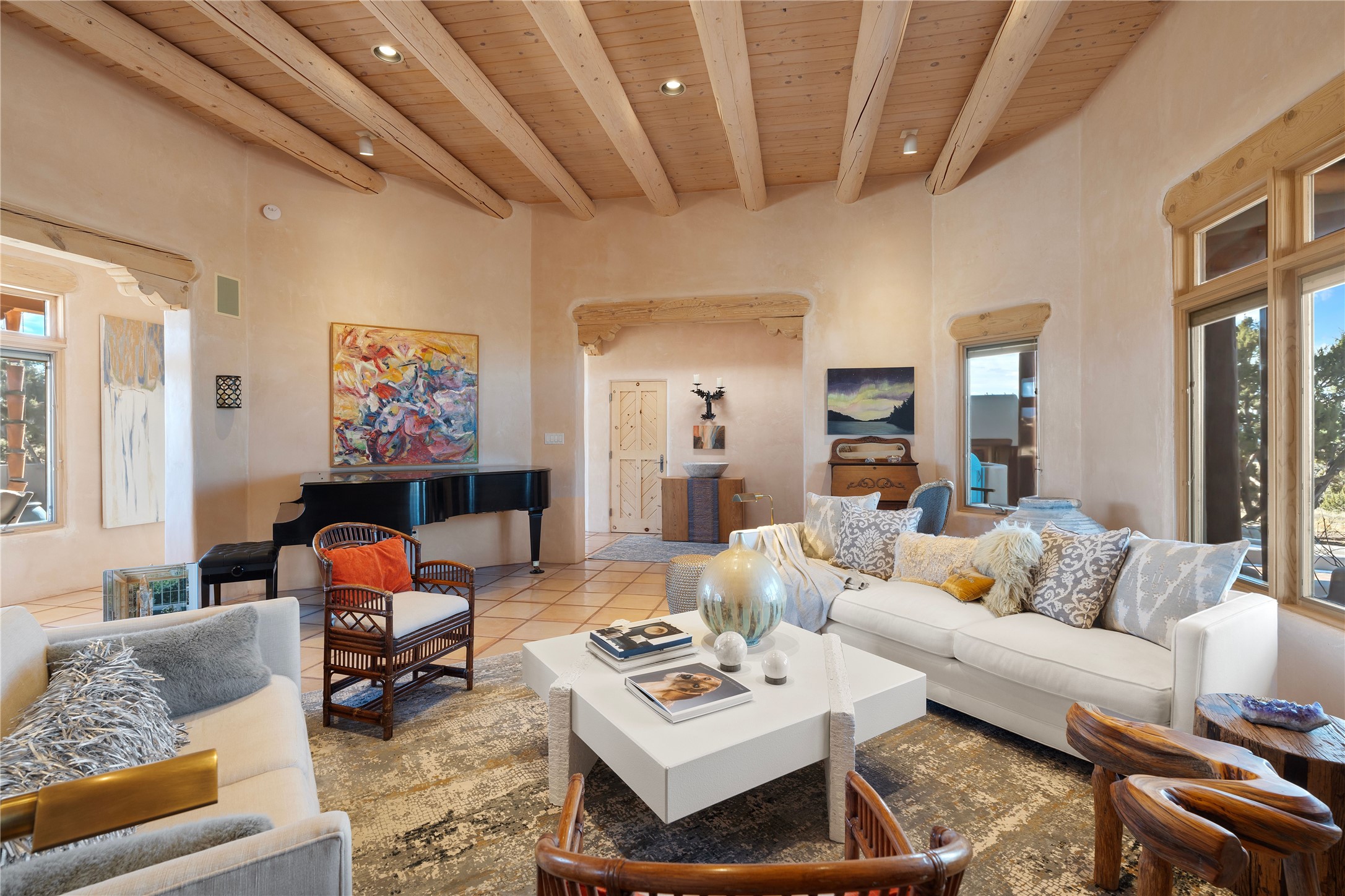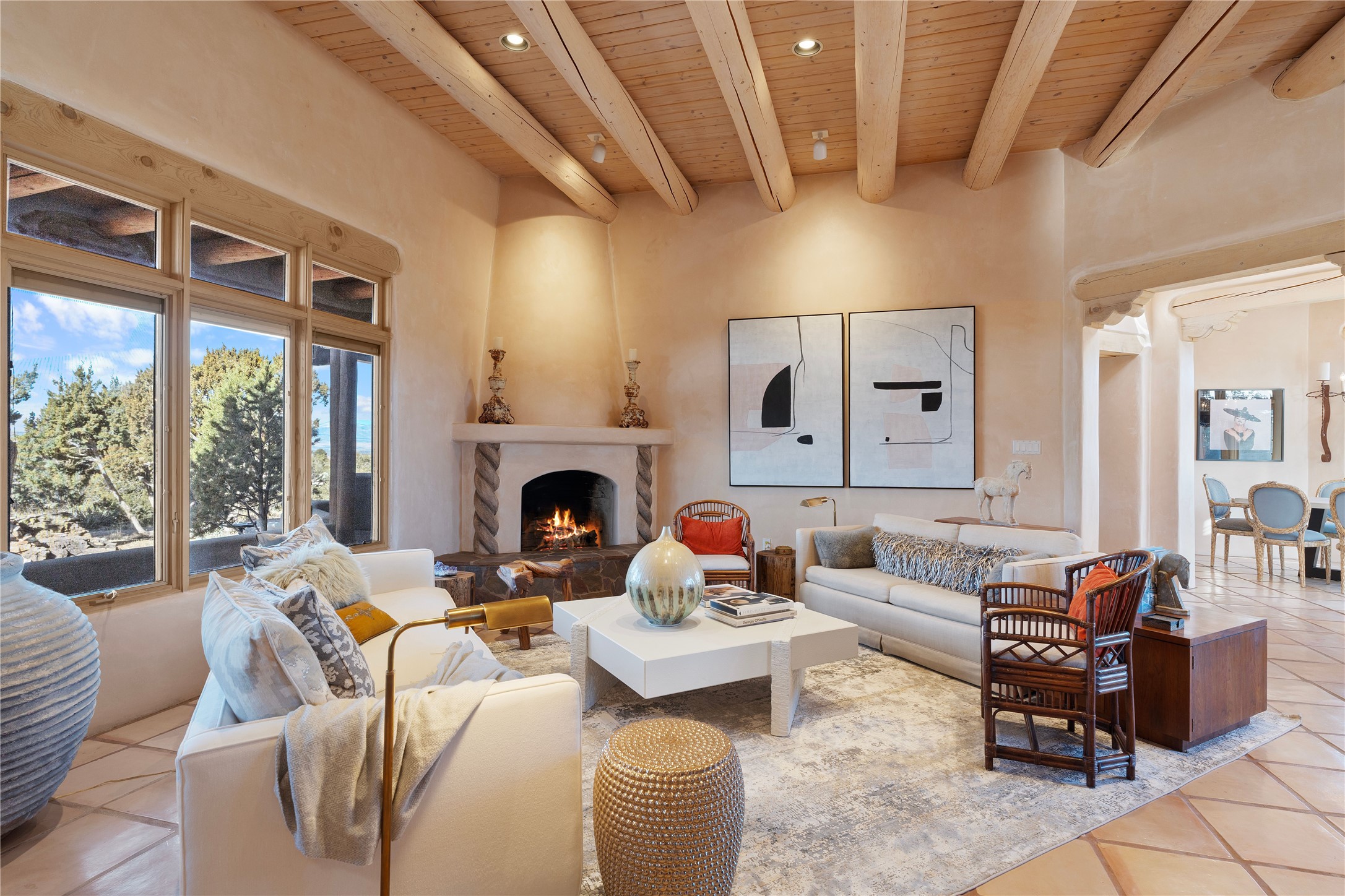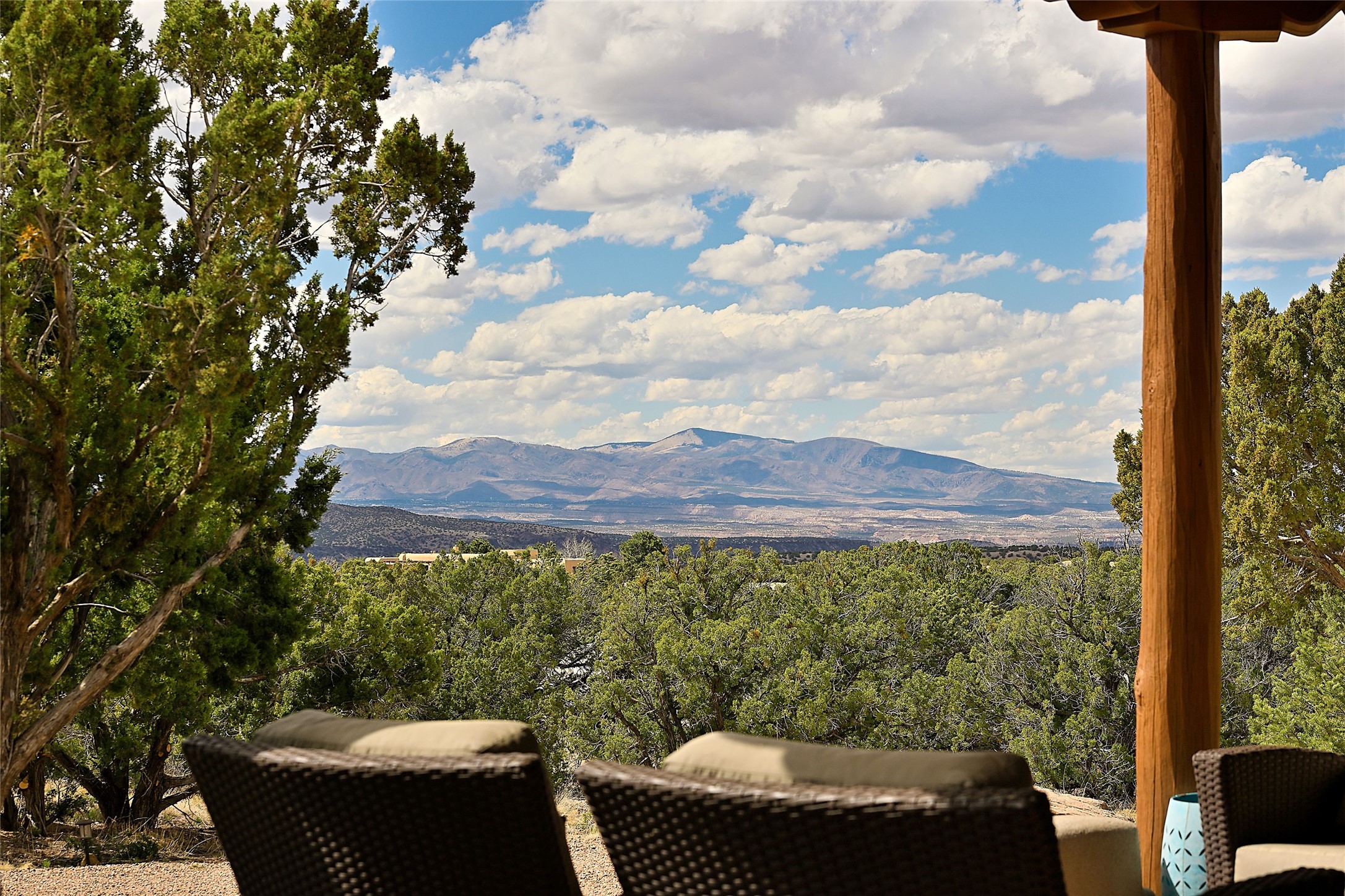 Your Private Hideaway Awaits! Amazing architecture and forever mountain views from every room define thisextraordinary custom home in fabulous guard-gated La Tierra Nueva! Enjoy an "other world" feeling in this beautiful location, on 11.9 natural acres only a beautiful 15 minute drive to the Santa Fe Plaza! Featuring a thoughtful single level plan with resort like charm, beautiful architectural details, and spacious rooms with high ceilings, vigas, and abundant windows throughout. Thick plastered walls and a flowing floor plan create a feeling of warmth and belonging. Off the front entry, you'll enter a large and beautiful living room with 11' ceilings, a kiva fireplace, an adjacent glassed dining room, and plenty of space for artwork. A gallery hallway featuring all glass on one side links to the media room/den, with kiva fireplace, built-in seating, and direct access to the front portico. The large island kitchen opens to den, with an oversized island with seating. The luxurious owner's suite features direct access to a private patio, kiva fireplace, spa like bath, jetted soaking tub overlooking the mountains, and a spacious walk in closet. The other end of the home has a private guest suite with it's own views and bathroom. The home's outdoor spaces are equally impressive, with an east-facing portal offering sweeping views of the Sangre de Cristo Mountains, and a west-facing portal takes in the grandeur of the Jemez Mountains. A separately entered studio can easily be transformed into a fourth bedroom/casita. This subdivision is great for horses and their owners, ride on your lot or trot to nearby BLM land. The Club at Las Campanas is nearby. La Tierra Nueva offers a ranch like feel just a short drive to world class art, dining, symphony, opera, culture, museums, golf, tennis, pickleball, biking, skiing, and the clean air and sunny skies that make Santa Fe famous! Watch the property tour video; however, this magnificent property must be experienced in person.