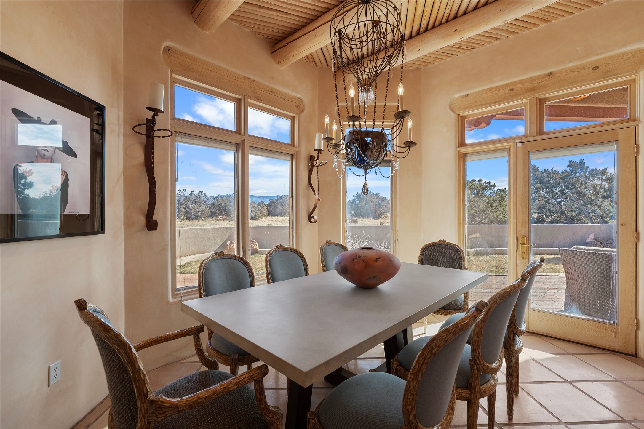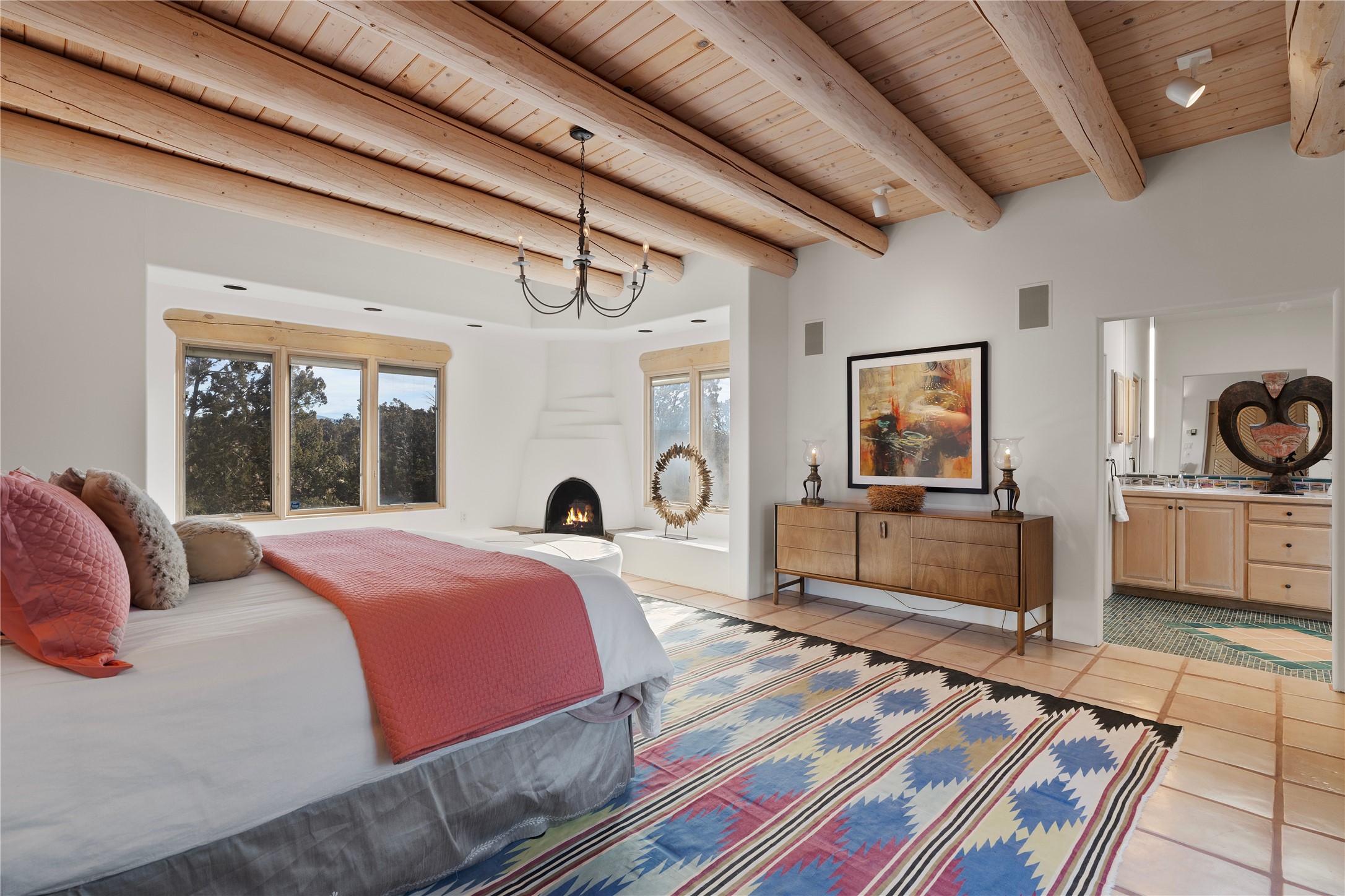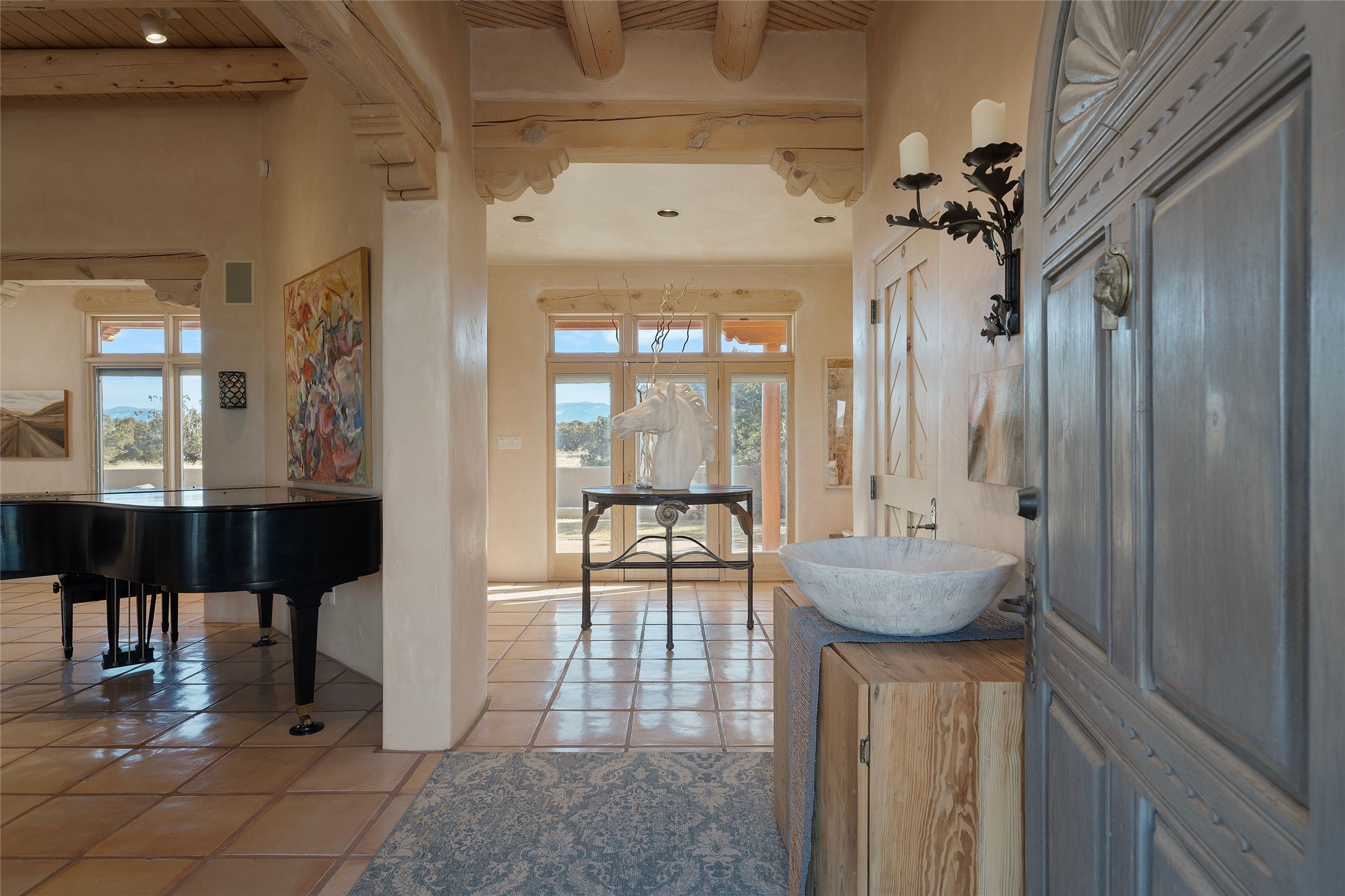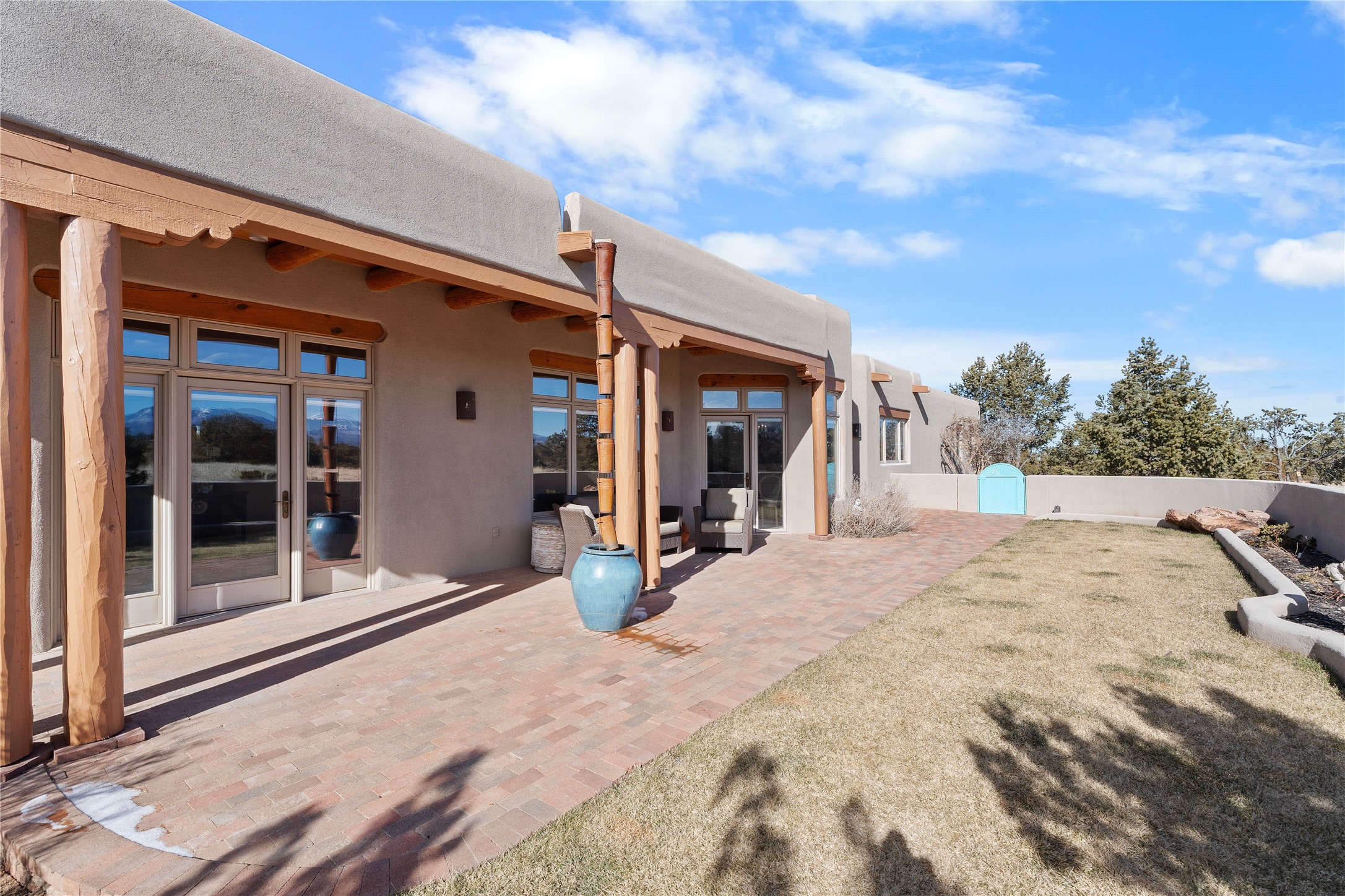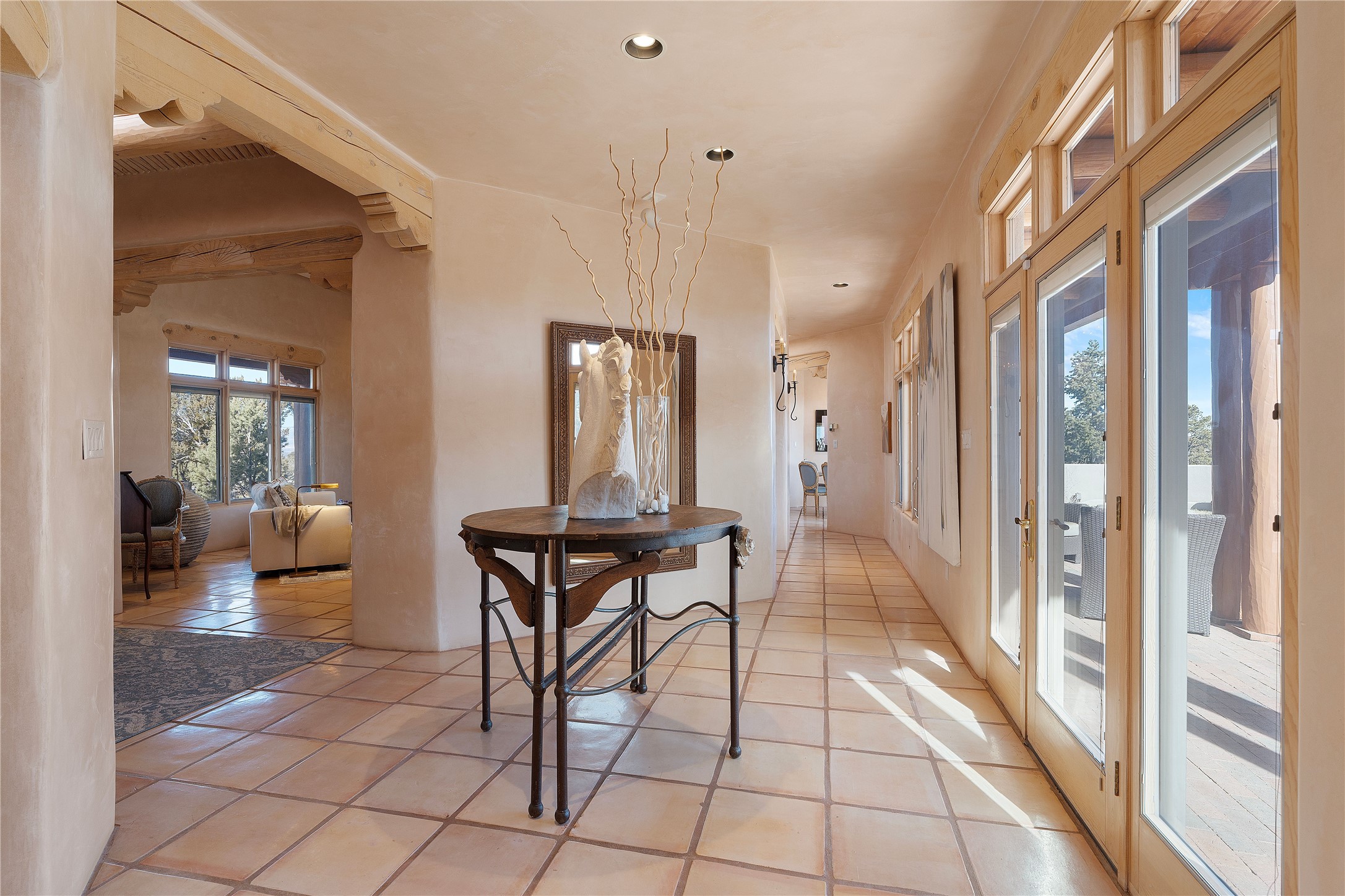 Your Private Hideaway Awaits! Amazing architecture and forever mountain views from every room define thisextraordinary custom home in fabulous guard-gated La Tierra Nueva! Enjoy an "other world" feeling in this beautiful location, on 11.9 natural acres only a beautiful 15 minute drive to the Santa Fe Plaza! Featuring a thoughtful single level plan with resort like charm, beautiful architectural details, and spacious rooms with high ceilings, vigas, and abundant windows throughout. Thick plastered walls and a flowing floor plan create a feeling of warmth and belonging. Off the front entry, you'll enter a large and beautiful living room with 11' ceilings, a kiva fireplace, an adjacent glassed dining room, and plenty of space for artwork. A gallery hallway featuring all glass on one side links to the media room/den, with kiva fireplace, built-in seating, and direct access to the front portico. The large island kitchen opens to den, with an oversized island with seating. The luxurious owner's suite features direct access to a private patio, kiva fireplace, spa like bath, jetted soaking tub overlooking the mountains, and a spacious walk in closet. The other end of the home has a private guest suite with it's own views and bathroom. The home's outdoor spaces are equally impressive, with an east-facing portal offering sweeping views of the Sangre de Cristo Mountains, and a west-facing portal takes in the grandeur of the Jemez Mountains. A separately entered studio can easily be transformed into a fourth bedroom/casita. This subdivision is great for horses and their owners, ride on your lot or trot to nearby BLM land. The Club at Las Campanas is nearby. La Tierra Nueva offers a ranch like feel just a short drive to world class art, dining, symphony, opera, culture, museums, golf, tennis, pickleball, biking, skiing, and the clean air and sunny skies that make Santa Fe famous! Watch the property tour video; however, this magnificent property must be experienced in person.