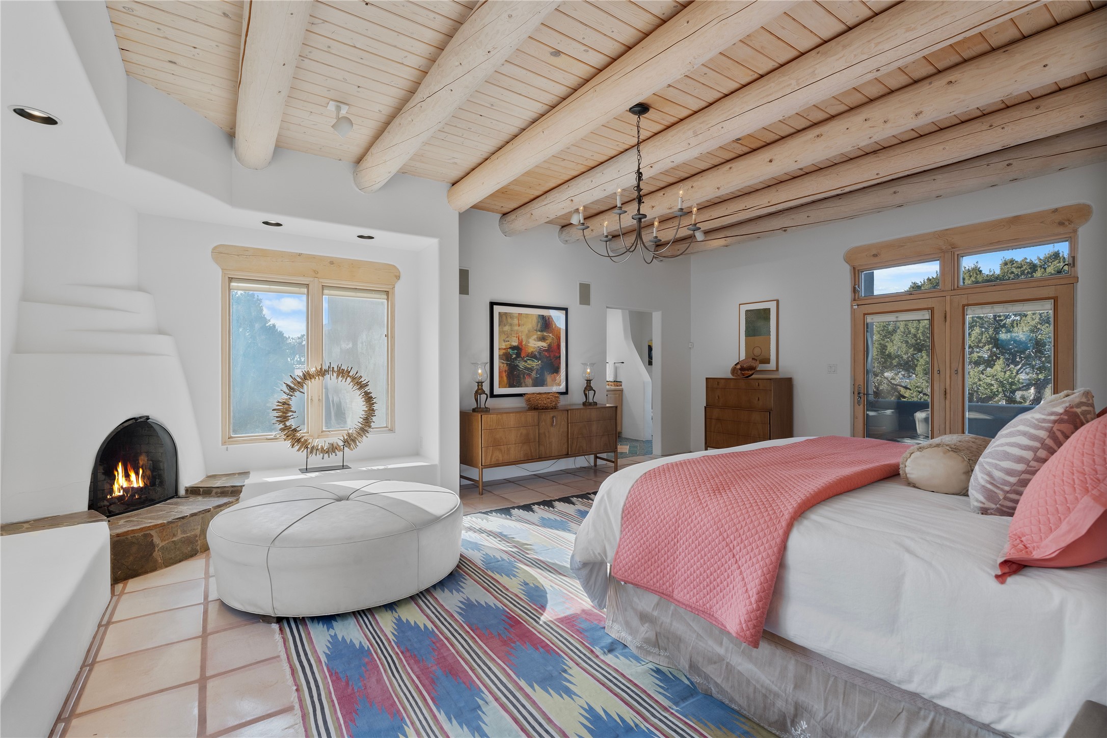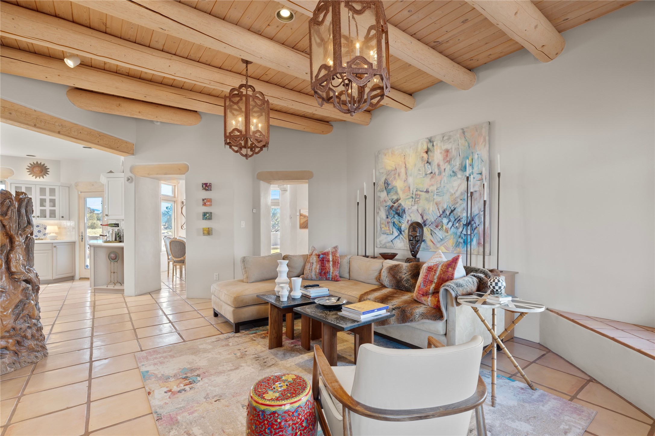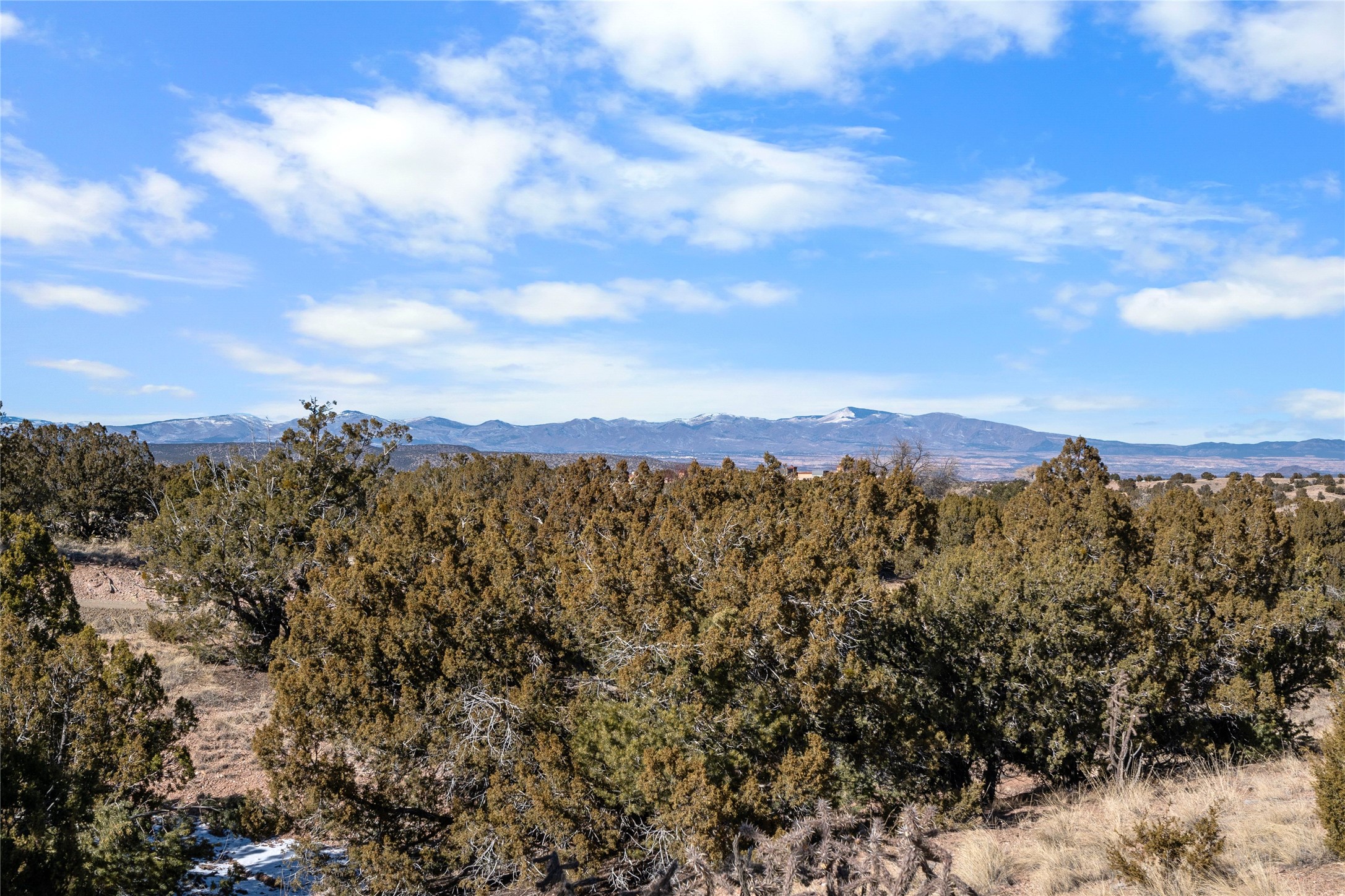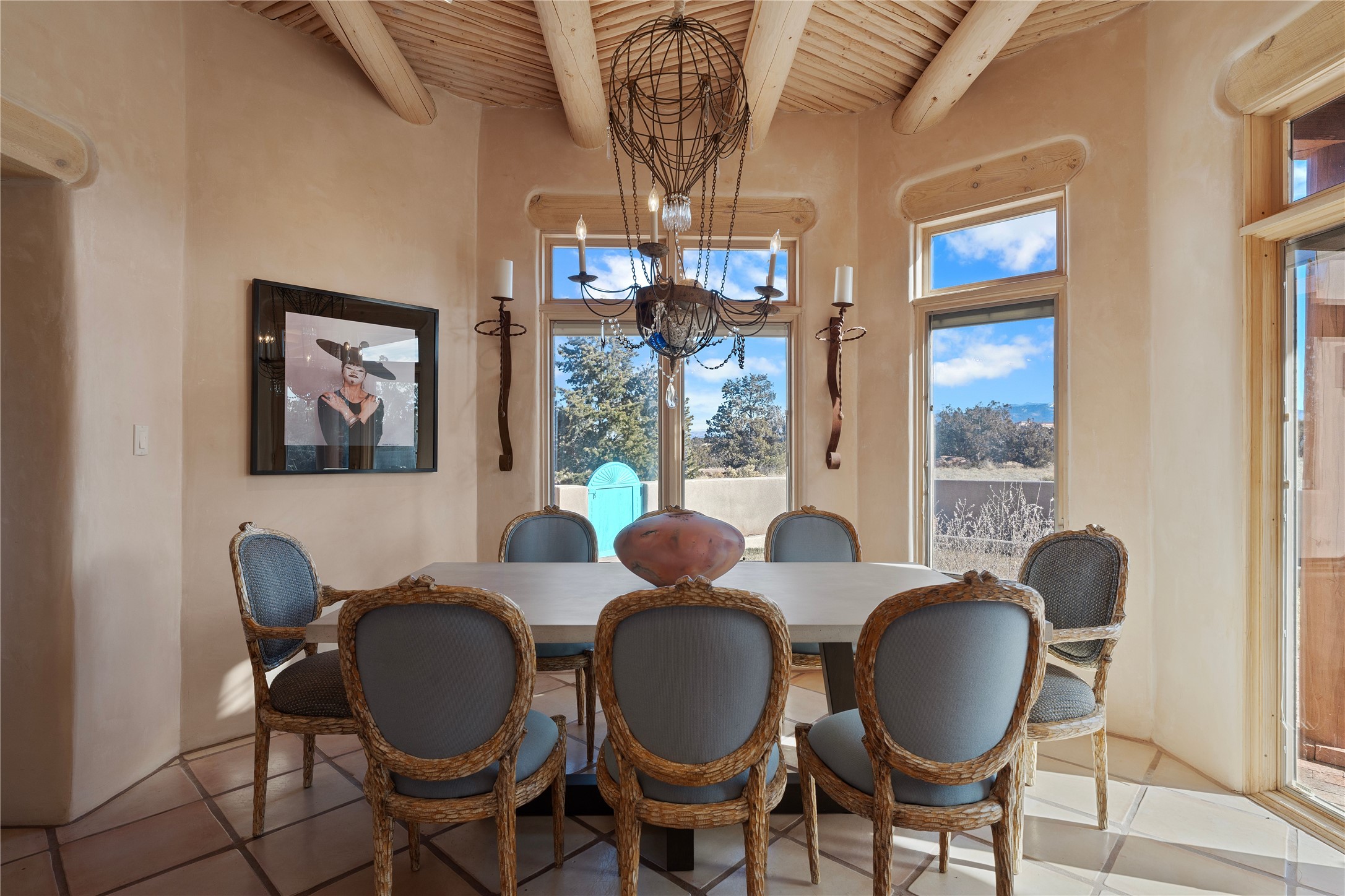 Your Private Hideaway Awaits! Amazing architecture and forever mountain views from every room define thisextraordinary custom home in fabulous guard-gated La Tierra Nueva! Enjoy an "other world" feeling in this beautiful location, on 11.9 natural acres only a beautiful 15 minute drive to the Santa Fe Plaza! Featuring a thoughtful single level plan with resort like charm, beautiful architectural details, and spacious rooms with high ceilings, vigas, and abundant windows throughout. Thick plastered walls and a flowing floor plan create a feeling of warmth and belonging. Off the front entry, you'll enter a large and beautiful living room with 11' ceilings, a kiva fireplace, an adjacent glassed dining room, and plenty of space for artwork. A gallery hallway featuring all glass on one side links to the media room/den, with kiva fireplace, built-in seating, and direct access to the front portico. The large island kitchen opens to den, with an oversized island with seating. The luxurious owner's suite features direct access to a private patio, kiva fireplace, spa like bath, jetted soaking tub overlooking the mountains, and a spacious walk in closet. The other end of the home has a private guest suite with it's own views and bathroom. The home's outdoor spaces are equally impressive, with an east-facing portal offering sweeping views of the Sangre de Cristo Mountains, and a west-facing portal takes in the grandeur of the Jemez Mountains. A separately entered studio can easily be transformed into a fourth bedroom/casita. This subdivision is great for horses and their owners, ride on your lot or trot to nearby BLM land. The Club at Las Campanas is nearby. La Tierra Nueva offers a ranch like feel just a short drive to world class art, dining, symphony, opera, culture, museums, golf, tennis, pickleball, biking, skiing, and the clean air and sunny skies that make Santa Fe famous! Watch the property tour video; however, this magnificent property must be experienced in person.
