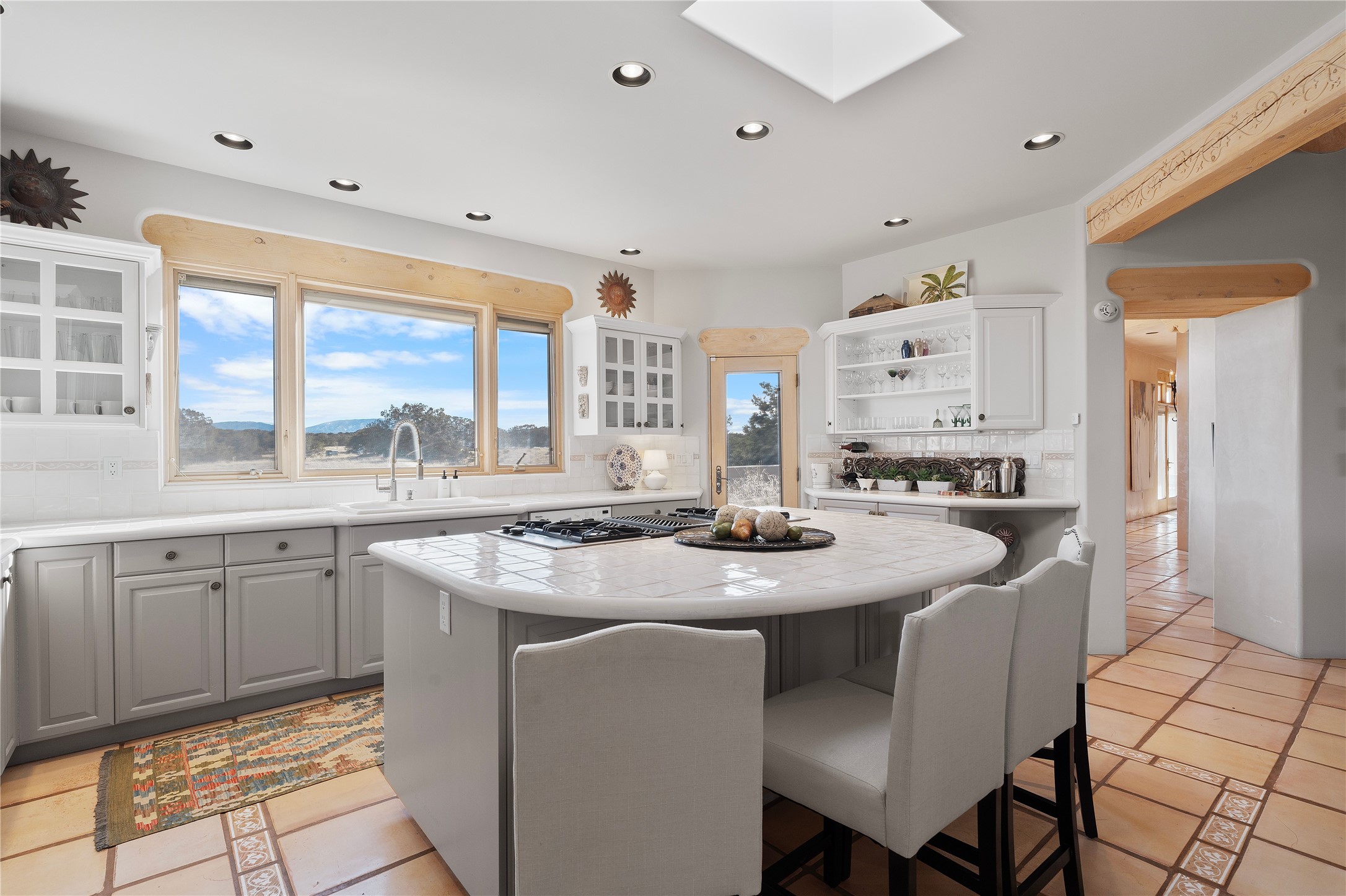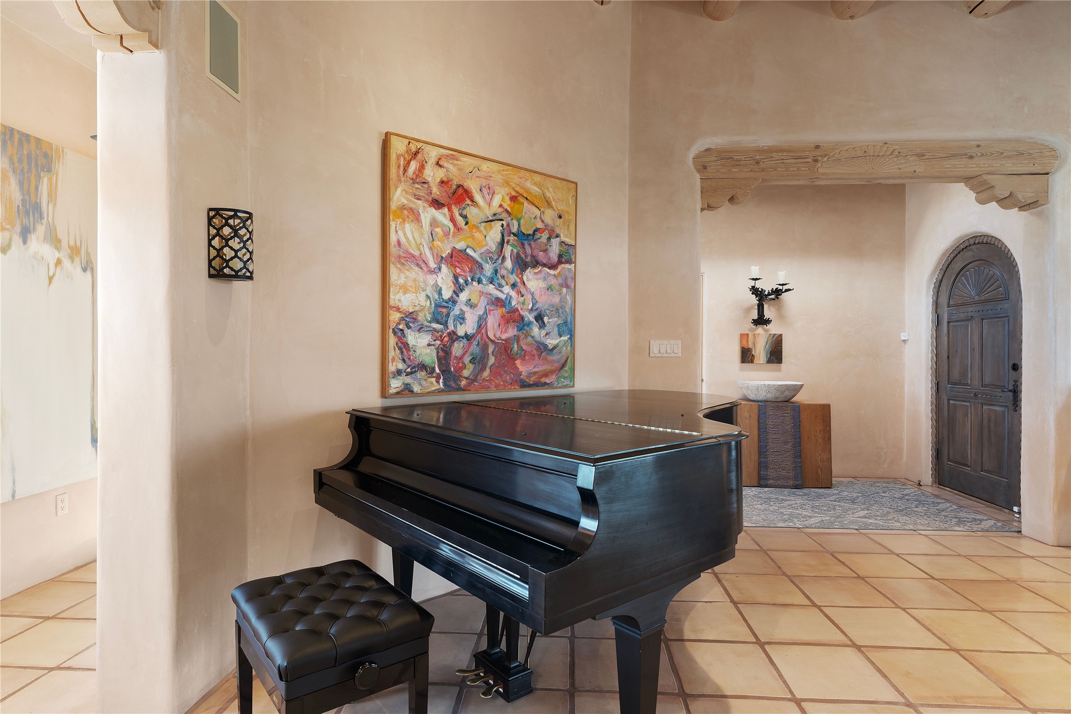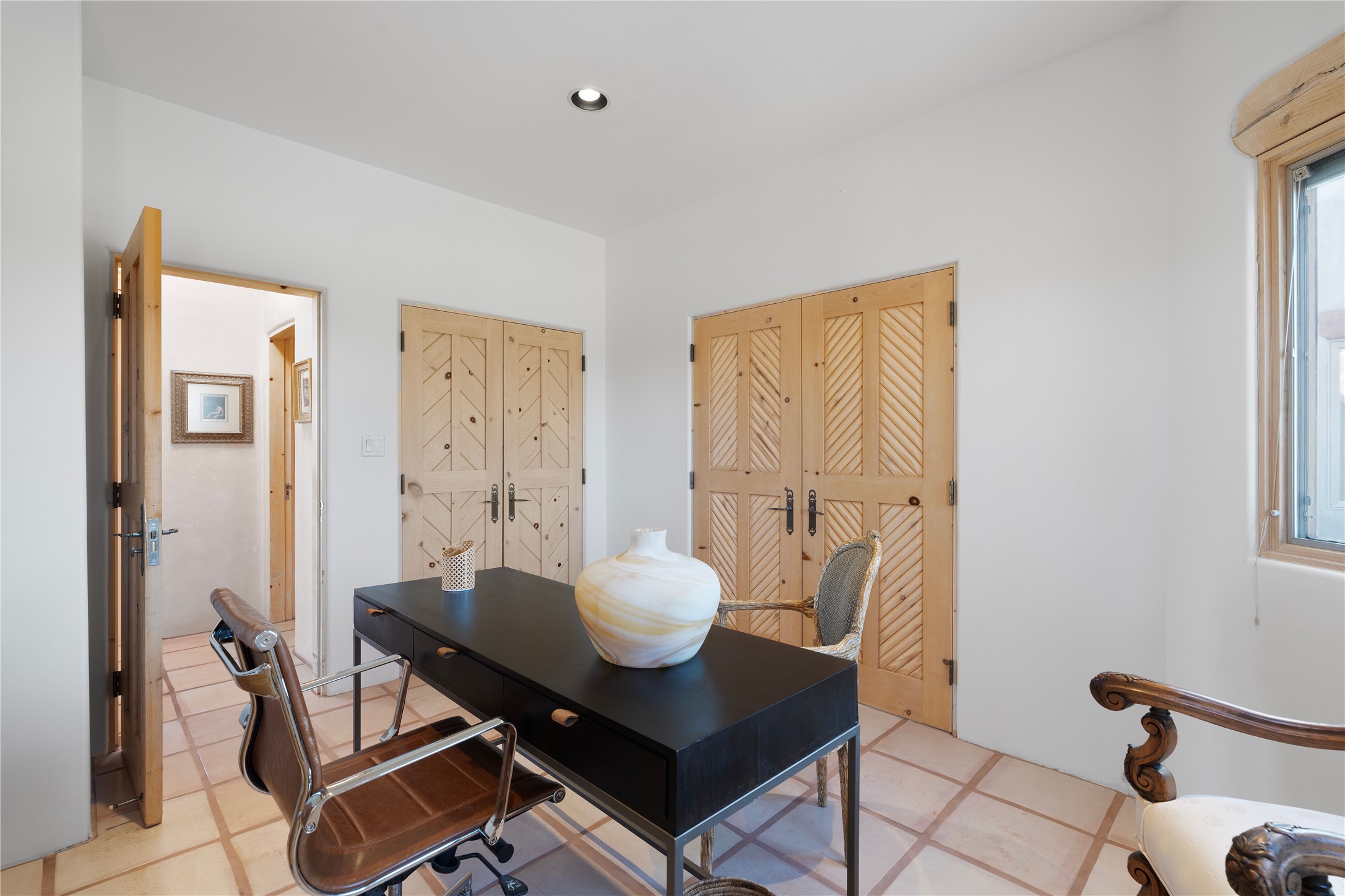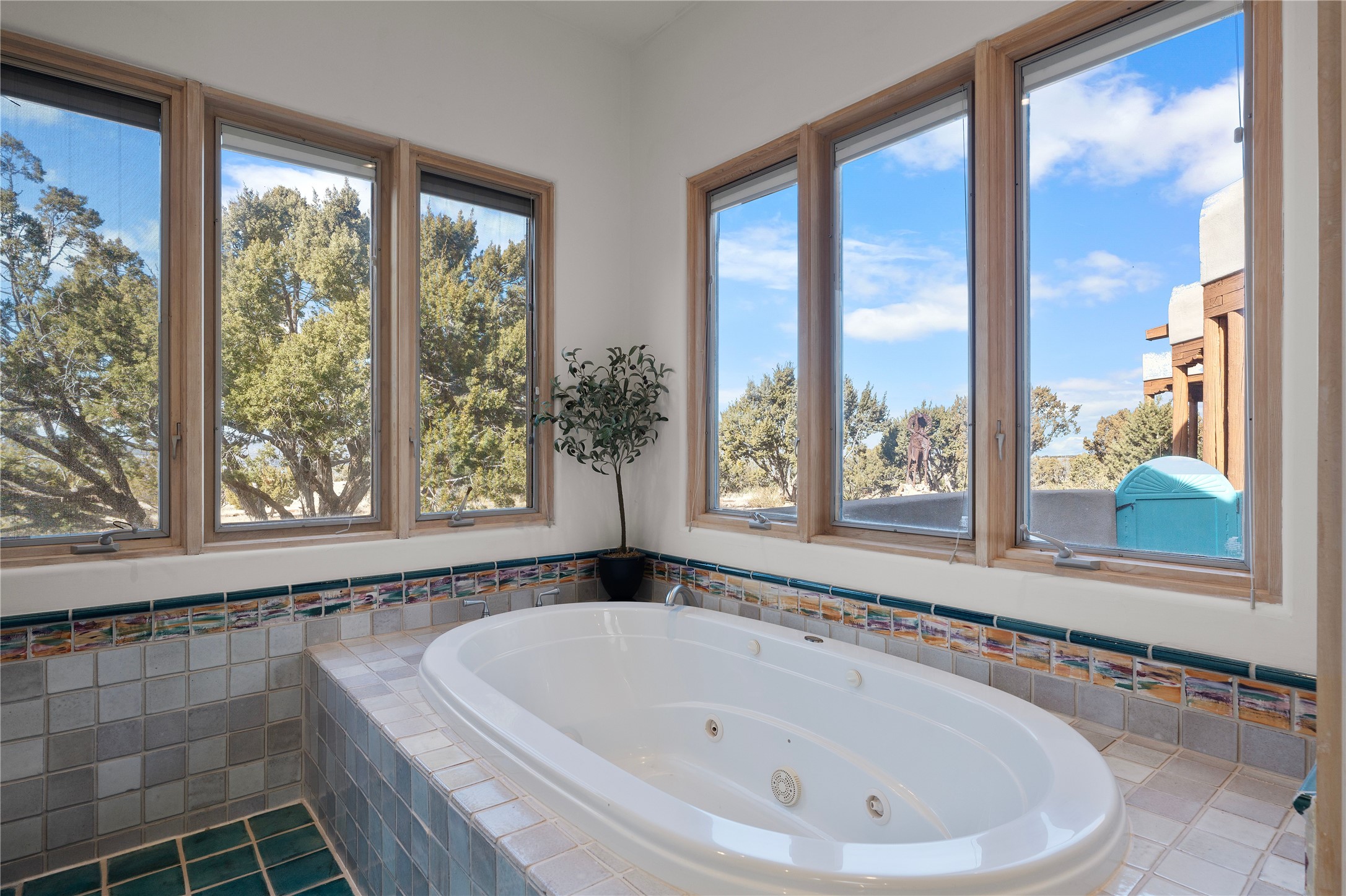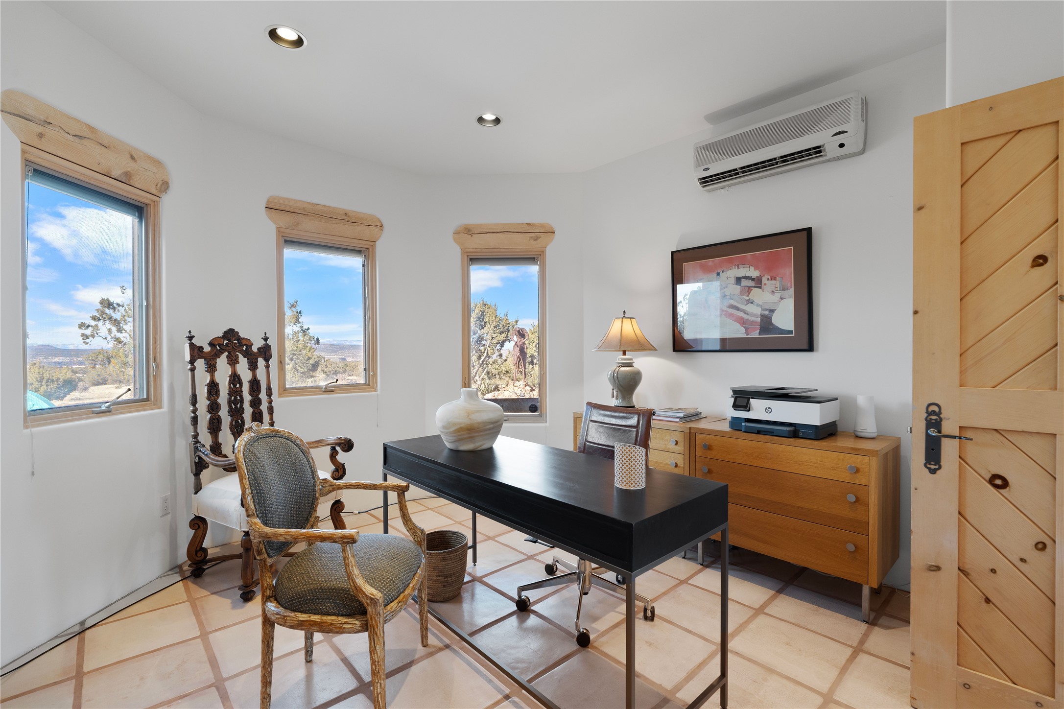 Your Private Hideaway Awaits! Amazing architecture and forever mountain views from every room define thisextraordinary custom home in fabulous guard-gated La Tierra Nueva! Enjoy an "other world" feeling in this beautiful location, on 11.9 natural acres only a beautiful 15 minute drive to the Santa Fe Plaza! Featuring a thoughtful single level plan with resort like charm, beautiful architectural details, and spacious rooms with high ceilings, vigas, and abundant windows throughout. Thick plastered walls and a flowing floor plan create a feeling of warmth and belonging. Off the front entry, you'll enter a large and beautiful living room with 11' ceilings, a kiva fireplace, an adjacent glassed dining room, and plenty of space for artwork. A gallery hallway featuring all glass on one side links to the media room/den, with kiva fireplace, built-in seating, and direct access to the front portico. The large island kitchen opens to den, with an oversized island with seating. The luxurious owner's suite features direct access to a private patio, kiva fireplace, spa like bath, jetted soaking tub overlooking the mountains, and a spacious walk in closet. The other end of the home has a private guest suite with it's own views and bathroom. The home's outdoor spaces are equally impressive, with an east-facing portal offering sweeping views of the Sangre de Cristo Mountains, and a west-facing portal takes in the grandeur of the Jemez Mountains. A separately entered studio can easily be transformed into a fourth bedroom/casita. This subdivision is great for horses and their owners, ride on your lot or trot to nearby BLM land. The Club at Las Campanas is nearby. La Tierra Nueva offers a ranch like feel just a short drive to world class art, dining, symphony, opera, culture, museums, golf, tennis, pickleball, biking, skiing, and the clean air and sunny skies that make Santa Fe famous! Watch the property tour video; however, this magnificent property must be experienced in person.