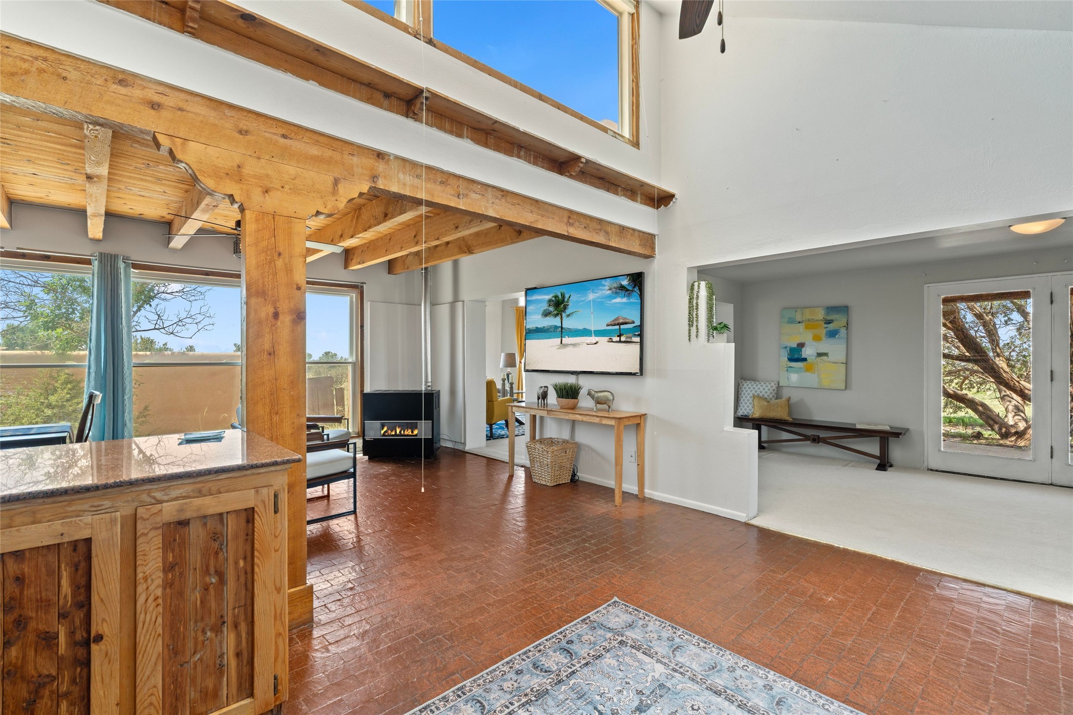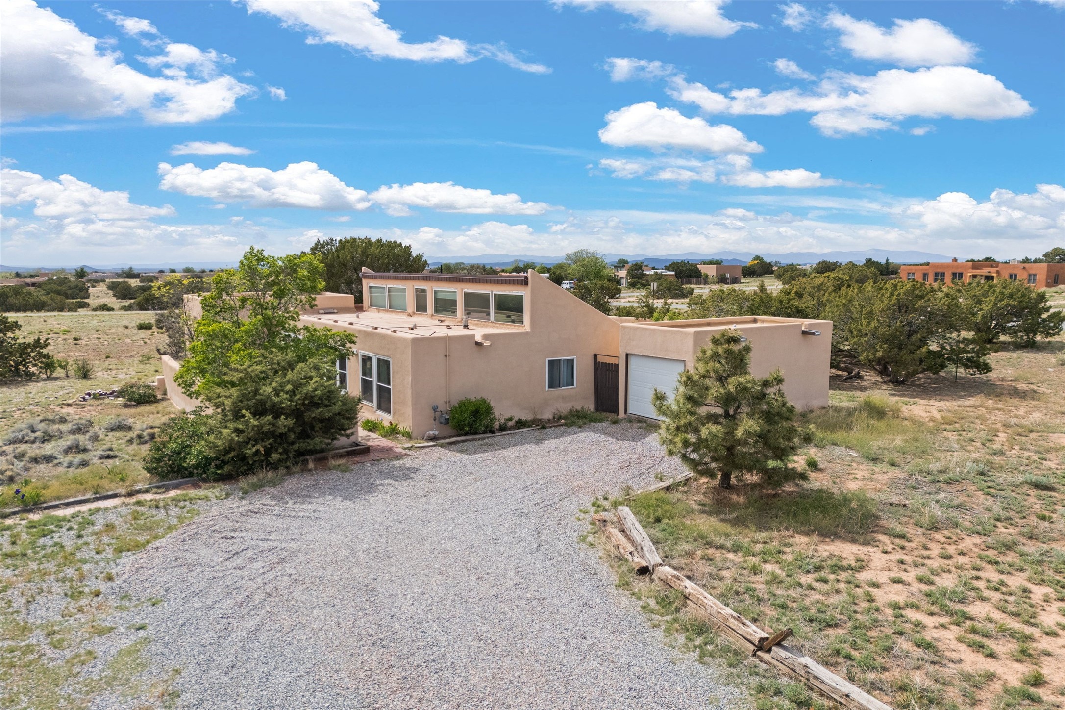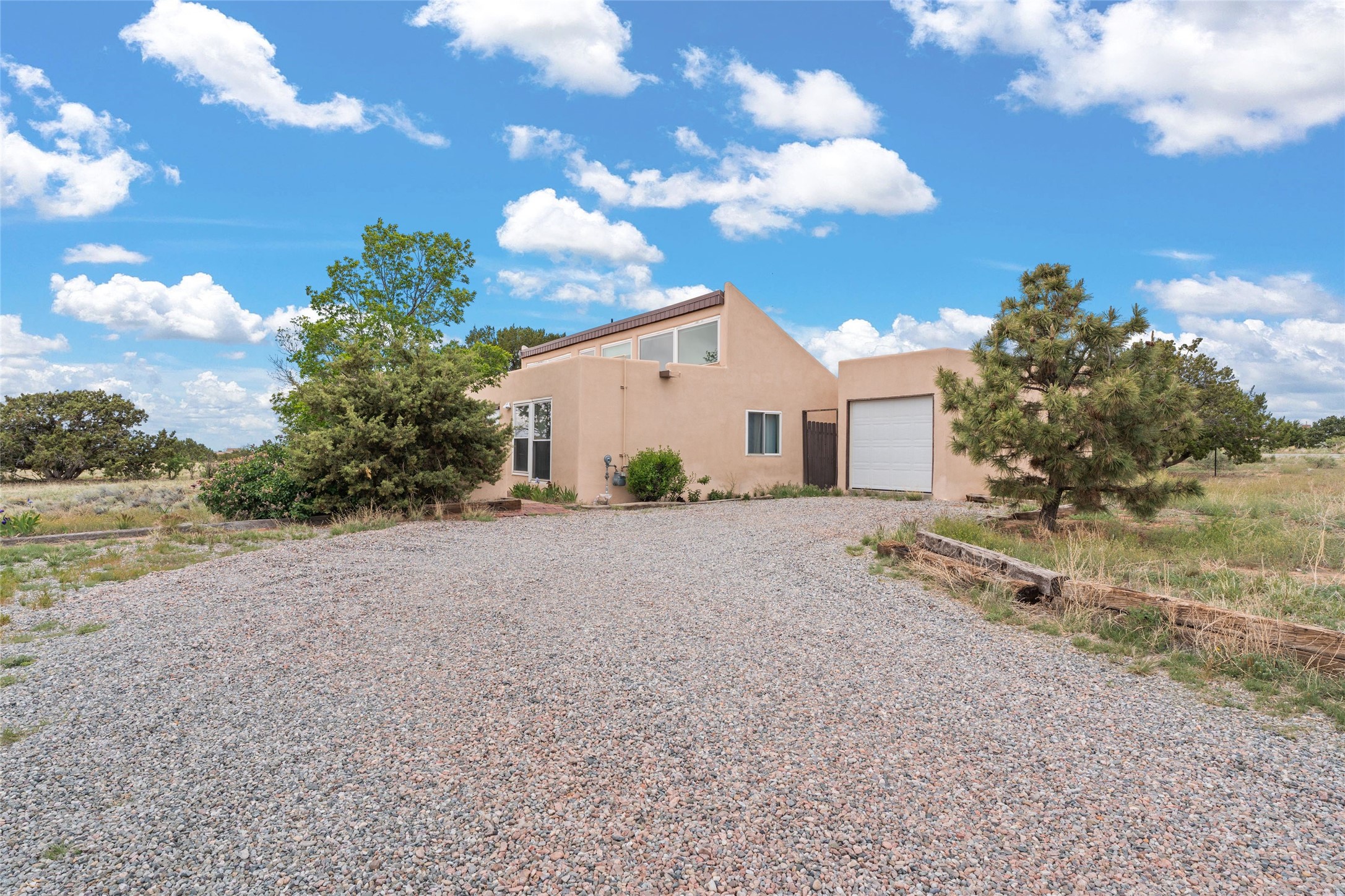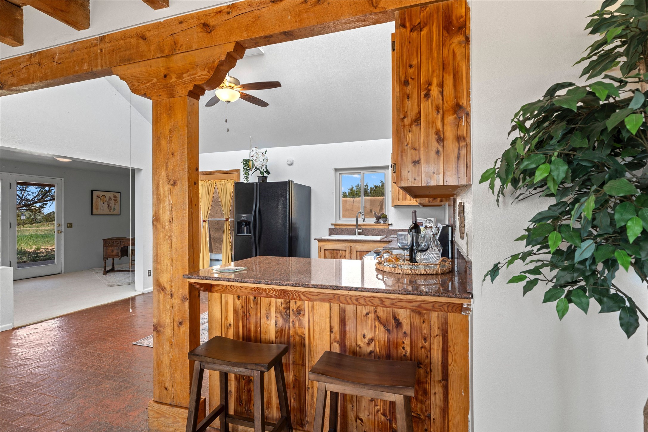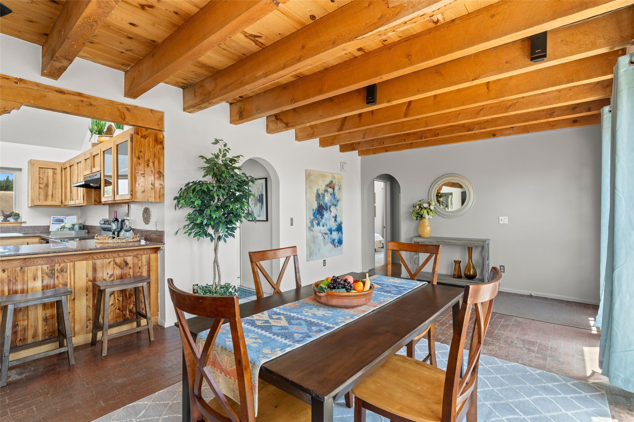 Set on 1.66 acres with peaceful rural surroundings, this classic Santa Fe home blends Southwestern charm with versatile living space just 17 minutes from the historic Plaza. Featuring 2 bedrooms and 2 bathrooms across 1,626 square feet, the home showcases signature regional details including brick floors, wood-beamed ceilings, and an open-concept layout that invites natural light and easy flow between living, dining, and kitchen areas. The kitchen offers warm wood cabinetry, granite countertops, and a breakfast bar that opens to the main living space -- ideal for everyday living or entertaining. French doors from a flexible bonus room lead outside, creating a perfect spot for a home office, art studio, or reading nook. Outdoor living is equally inviting with natural landscaping, mature trees, and room to expand gardens or create patios to suit your lifestyle. A detached one-car garage provides additional storage or workshop potential. Residents enjoy a shared well, a new septic tank installed in 2023, and high-speed internet access. Located just 3.8 miles from Eldorado's shopping and dining conveniences, this property combines the quiet of a country setting with proximity to Santa Fe amenities. Annual HOA dues of $610 cover road maintenance and community upkeep. This property offers a rare opportunity to enjoy Santa Fe's distinctive character and natural beauty in a serene, spacious setting -- ready to make your own.