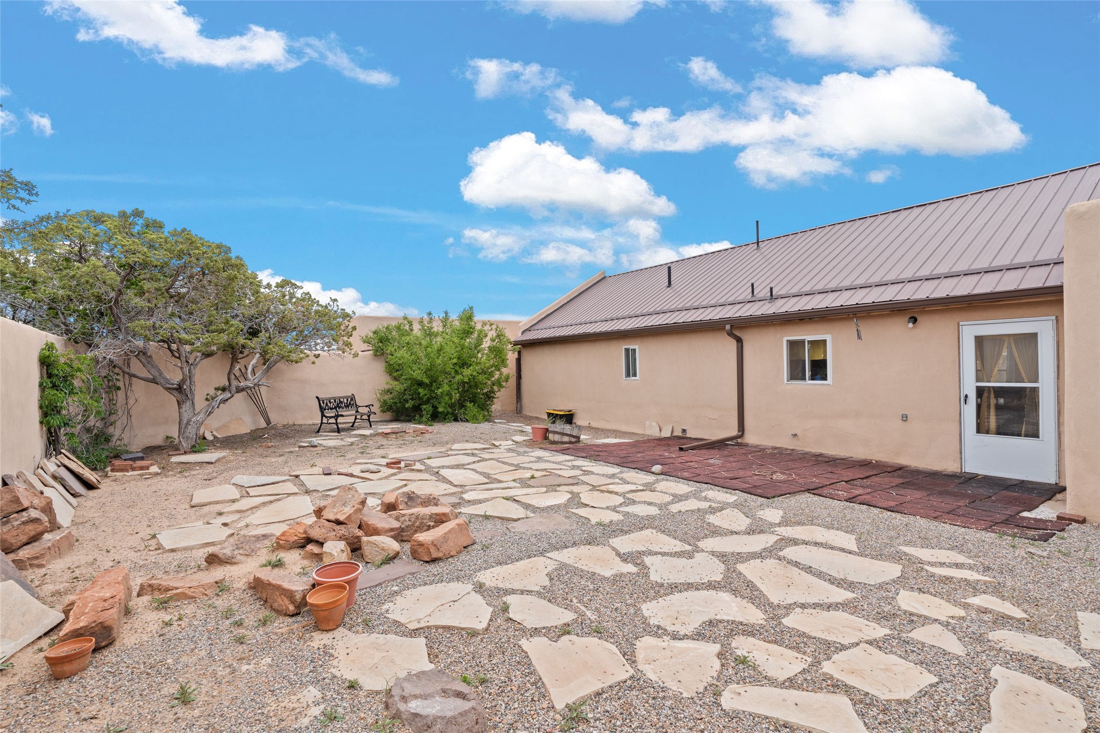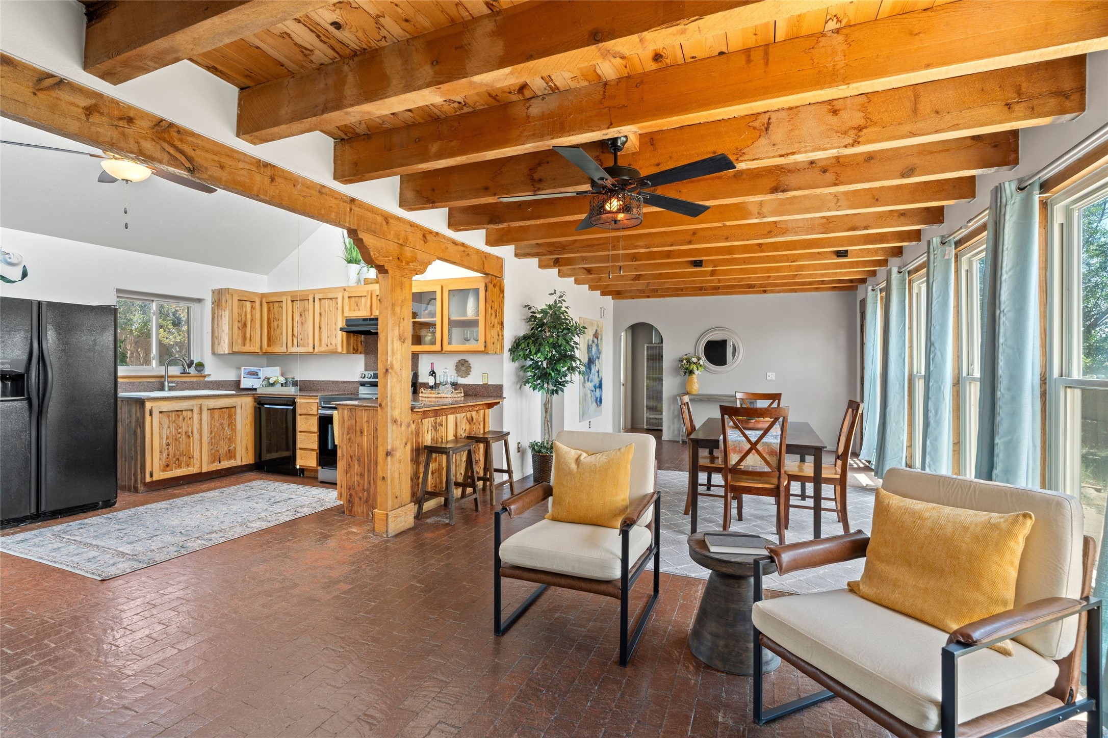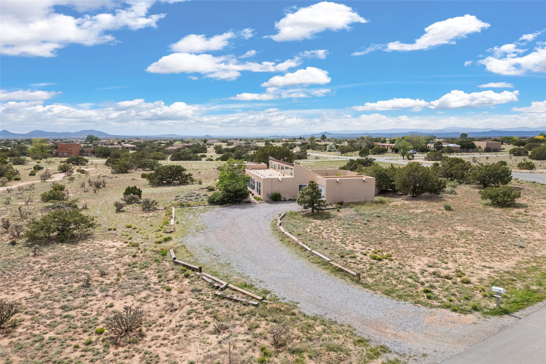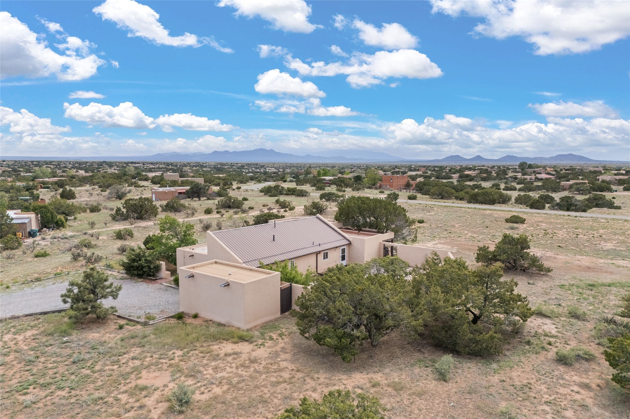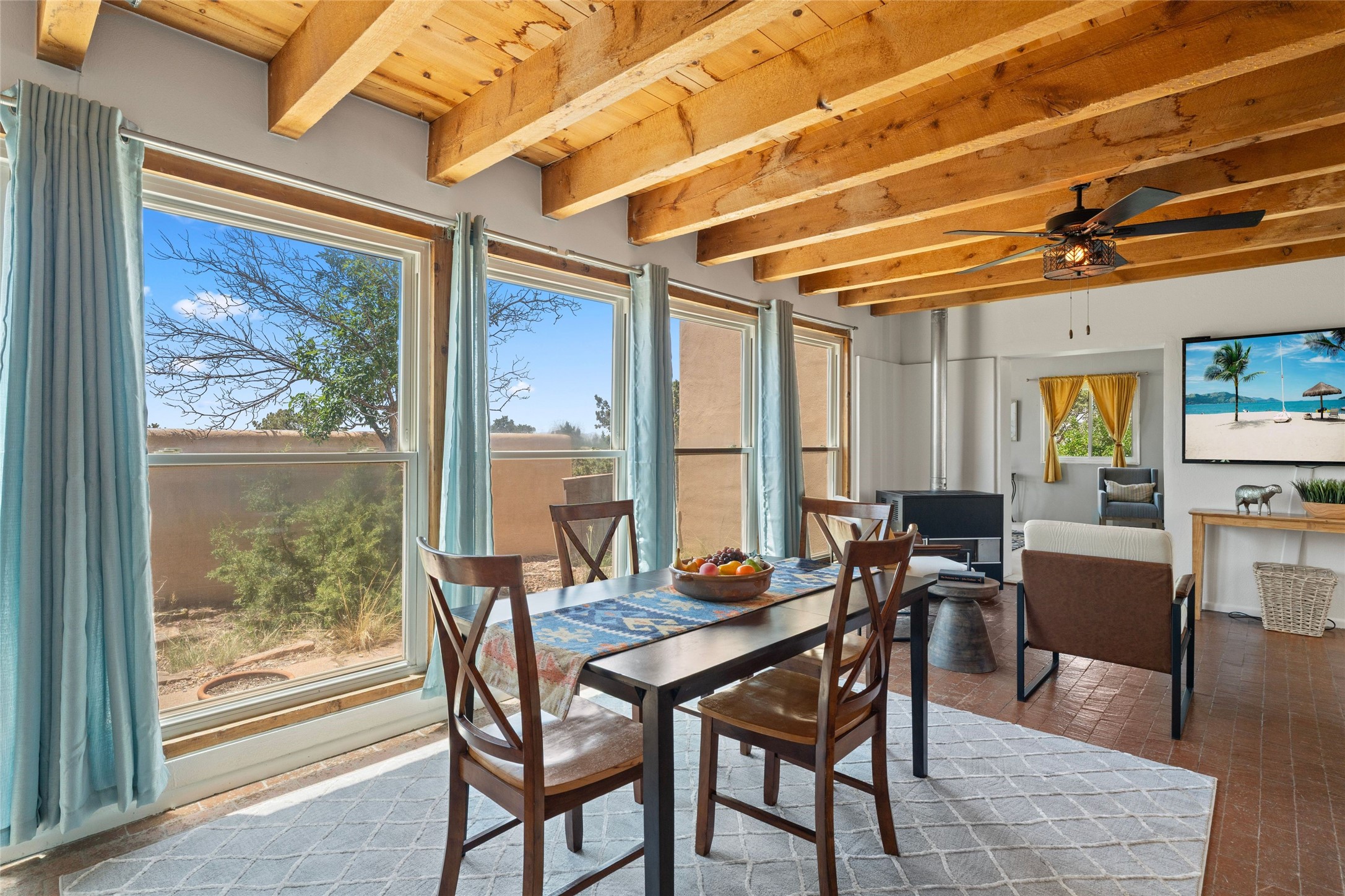 Set on 1.66 acres with peaceful rural surroundings, this classic Santa Fe home blends Southwestern charm with versatile living space just 17 minutes from the historic Plaza. Featuring 2 bedrooms and 2 bathrooms across 1,626 square feet, the home showcases signature regional details including brick floors, wood-beamed ceilings, and an open-concept layout that invites natural light and easy flow between living, dining, and kitchen areas. The kitchen offers warm wood cabinetry, granite countertops, and a breakfast bar that opens to the main living space -- ideal for everyday living or entertaining. French doors from a flexible bonus room lead outside, creating a perfect spot for a home office, art studio, or reading nook. Outdoor living is equally inviting with natural landscaping, mature trees, and room to expand gardens or create patios to suit your lifestyle. A detached one-car garage provides additional storage or workshop potential. Residents enjoy a shared well, a new septic tank installed in 2023, and high-speed internet access. Located just 3.8 miles from Eldorado's shopping and dining conveniences, this property combines the quiet of a country setting with proximity to Santa Fe amenities. Annual HOA dues of $610 cover road maintenance and community upkeep. This property offers a rare opportunity to enjoy Santa Fe's distinctive character and natural beauty in a serene, spacious setting -- ready to make your own.