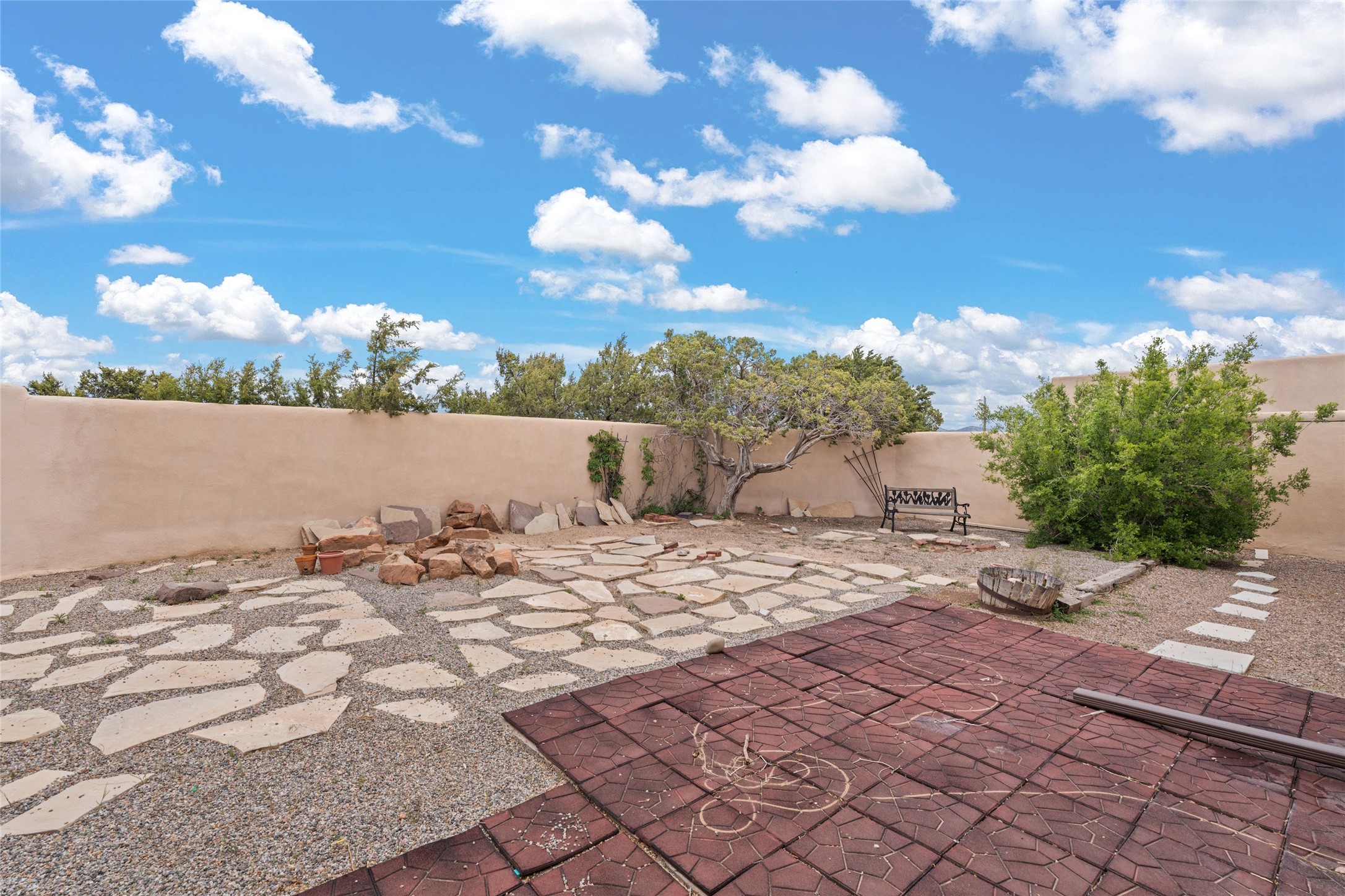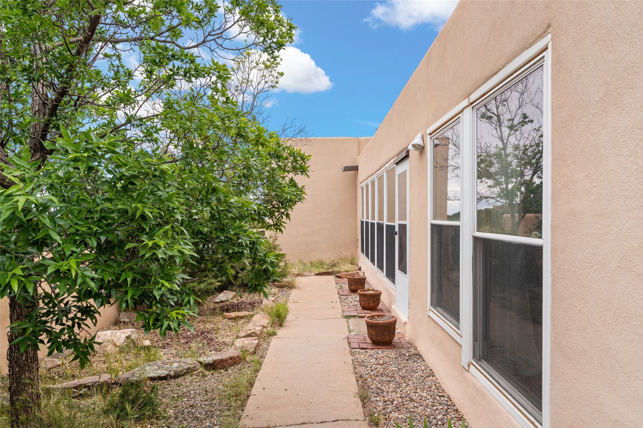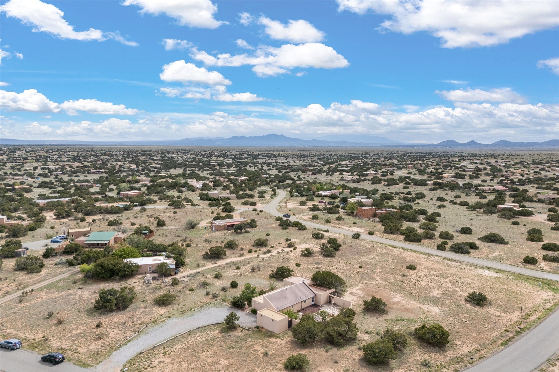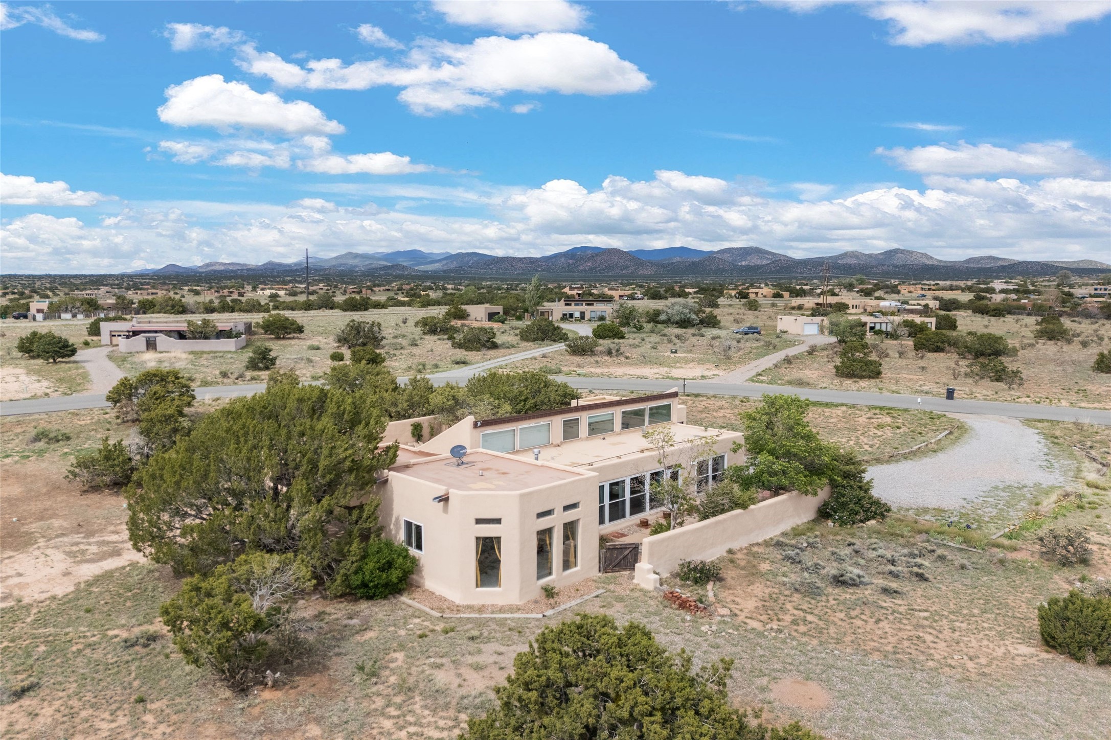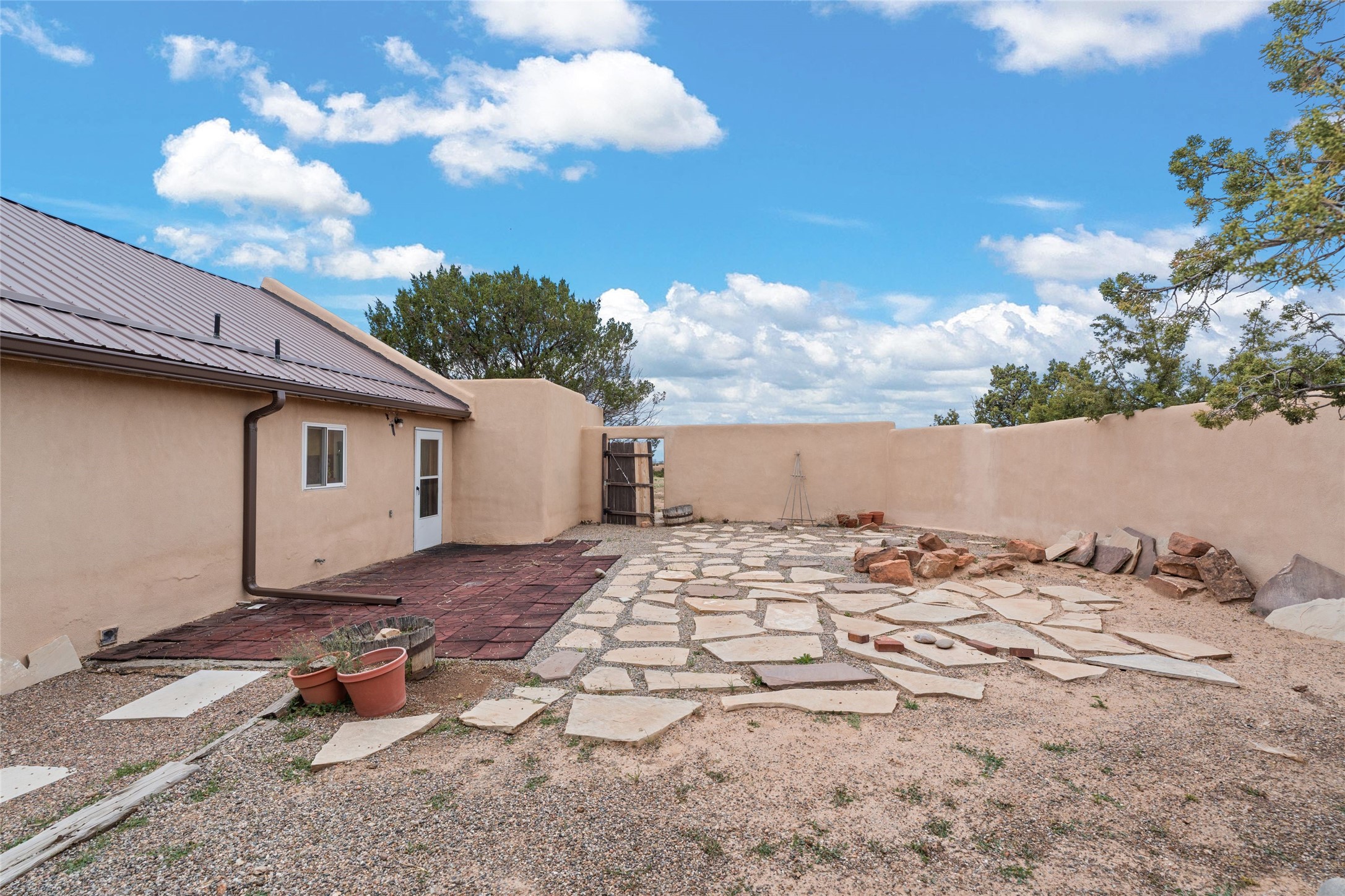 Set on 1.66 acres with peaceful rural surroundings, this classic Santa Fe home blends Southwestern charm with versatile living space just 17 minutes from the historic Plaza. Featuring 2 bedrooms and 2 bathrooms across 1,626 square feet, the home showcases signature regional details including brick floors, wood-beamed ceilings, and an open-concept layout that invites natural light and easy flow between living, dining, and kitchen areas. The kitchen offers warm wood cabinetry, granite countertops, and a breakfast bar that opens to the main living space -- ideal for everyday living or entertaining. French doors from a flexible bonus room lead outside, creating a perfect spot for a home office, art studio, or reading nook. Outdoor living is equally inviting with natural landscaping, mature trees, and room to expand gardens or create patios to suit your lifestyle. A detached one-car garage provides additional storage or workshop potential. Residents enjoy a shared well, a new septic tank installed in 2023, and high-speed internet access. Located just 3.8 miles from Eldorado's shopping and dining conveniences, this property combines the quiet of a country setting with proximity to Santa Fe amenities. Annual HOA dues of $610 cover road maintenance and community upkeep. This property offers a rare opportunity to enjoy Santa Fe's distinctive character and natural beauty in a serene, spacious setting -- ready to make your own.