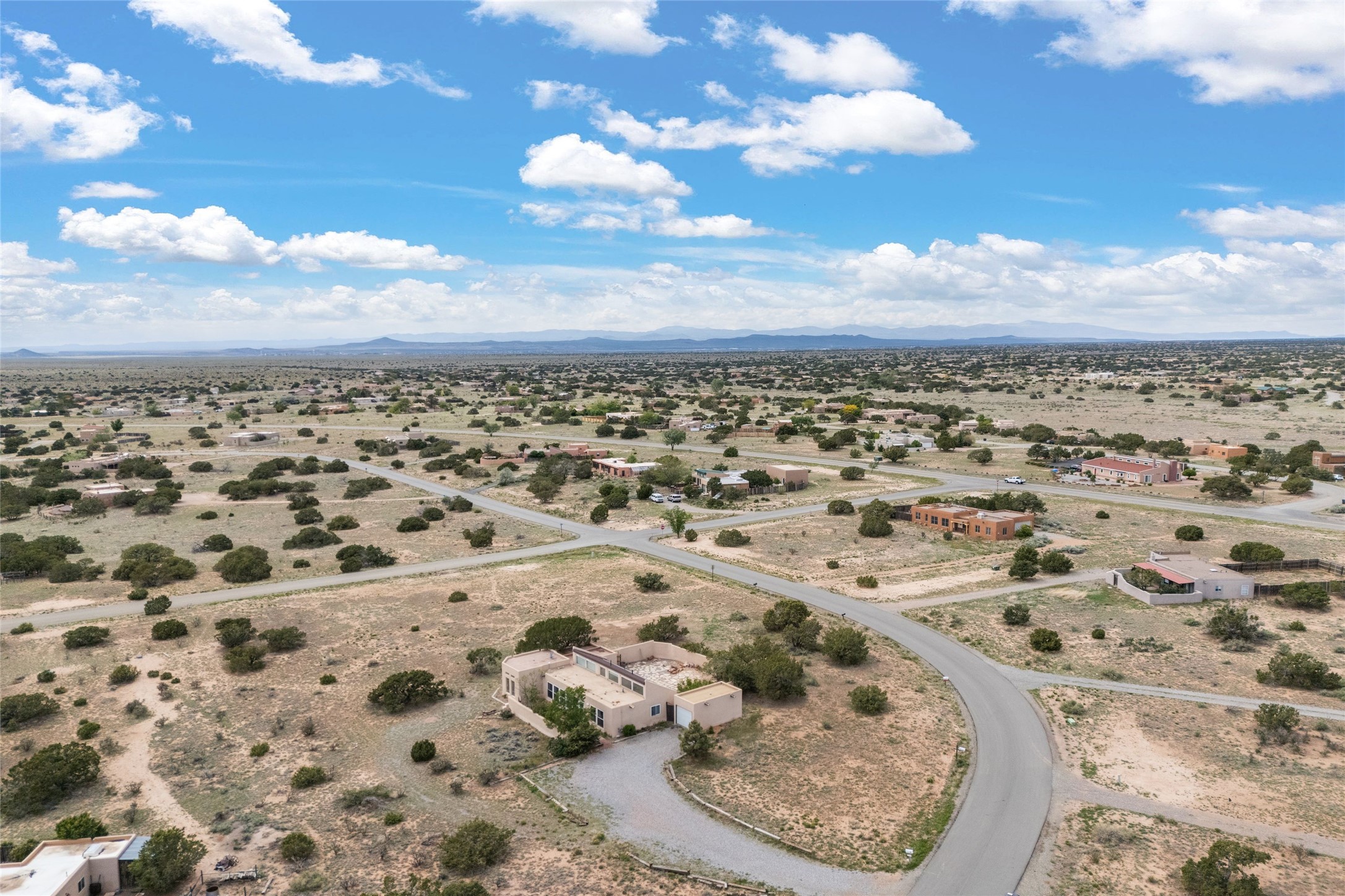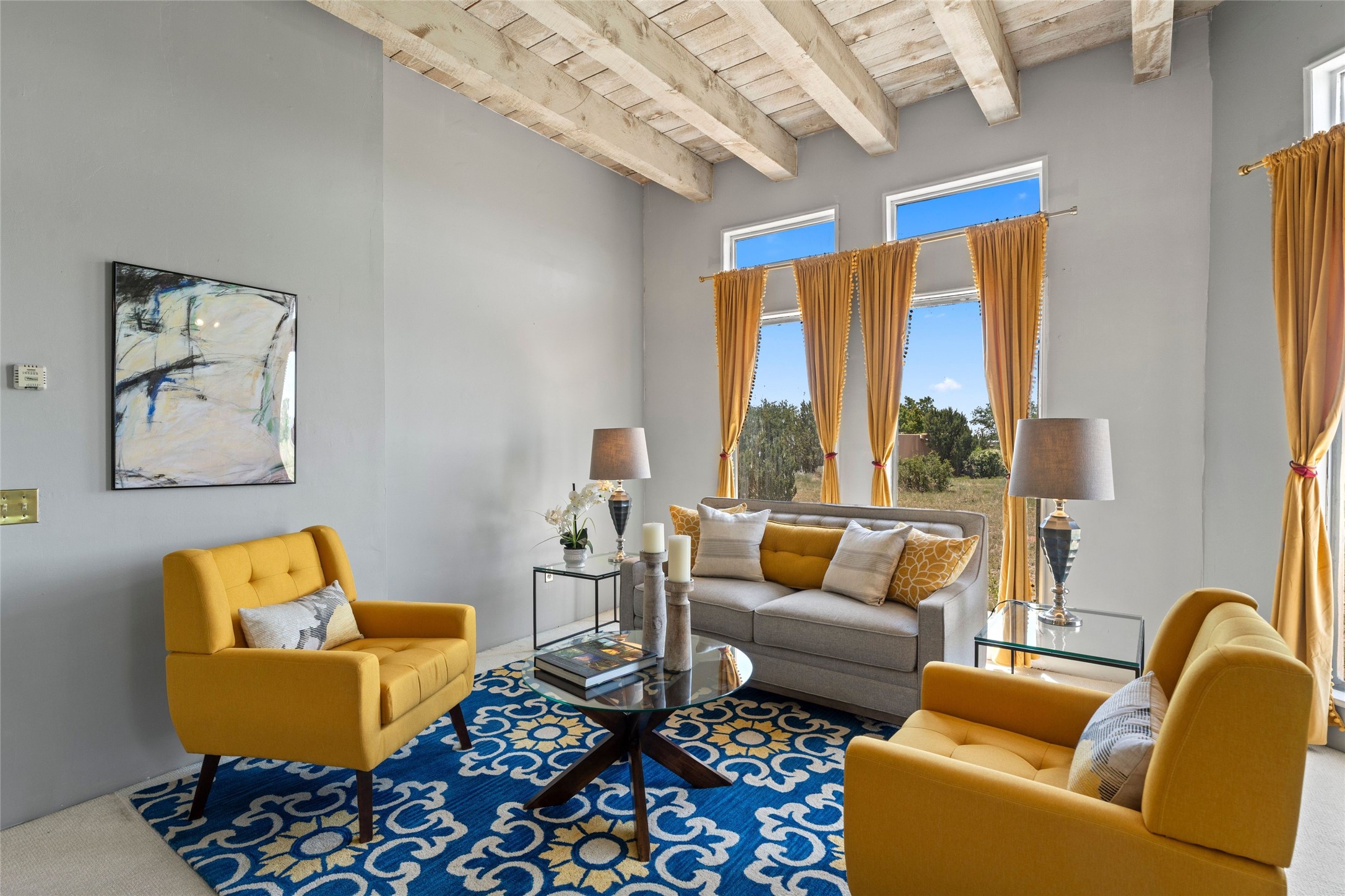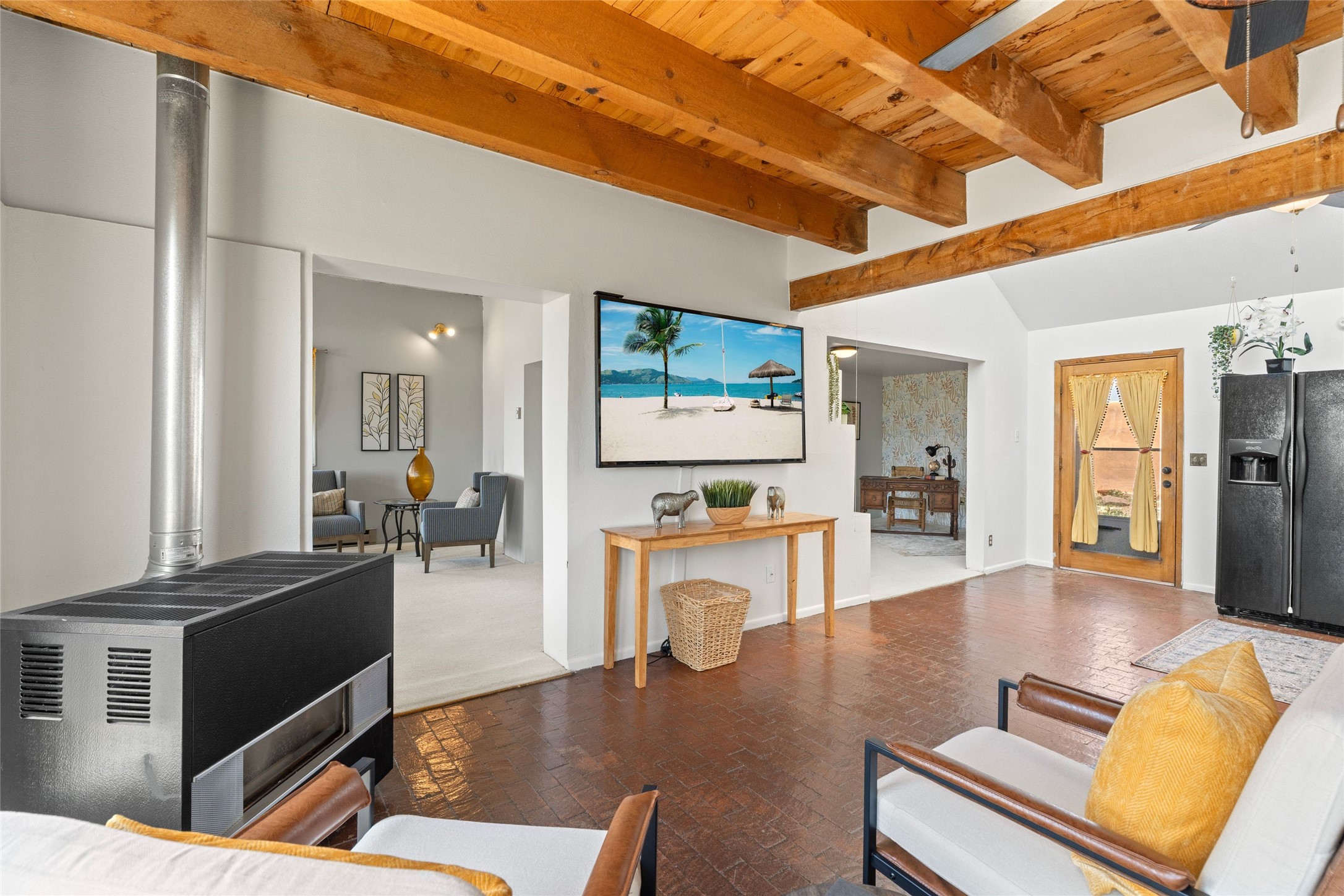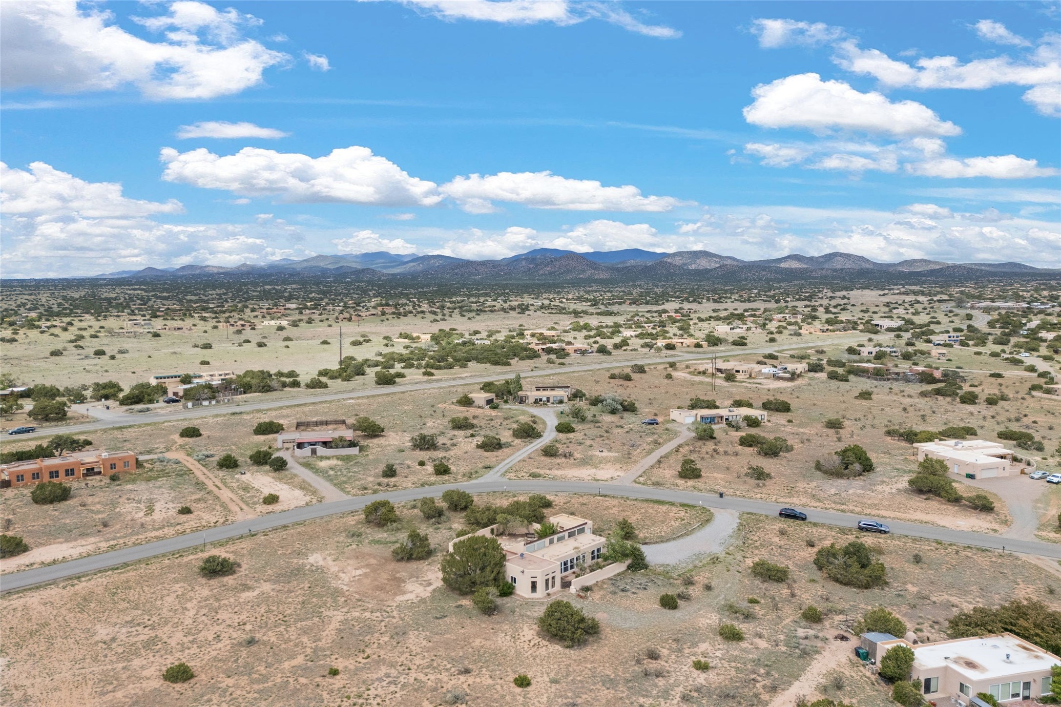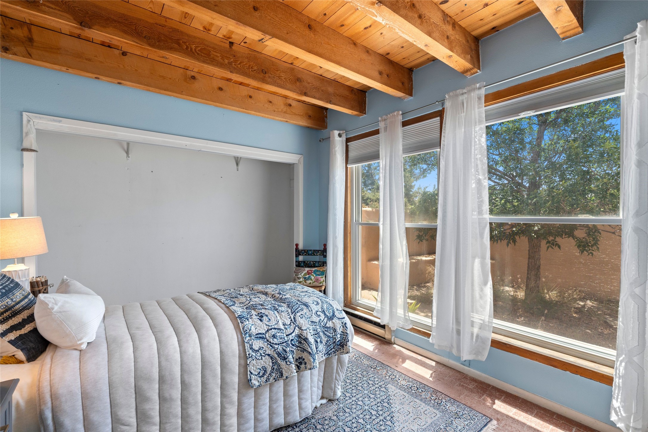 Set on 1.66 acres with peaceful rural surroundings, this classic Santa Fe home blends Southwestern charm with versatile living space just 17 minutes from the historic Plaza. Featuring 2 bedrooms and 2 bathrooms across 1,626 square feet, the home showcases signature regional details including brick floors, wood-beamed ceilings, and an open-concept layout that invites natural light and easy flow between living, dining, and kitchen areas. The kitchen offers warm wood cabinetry, granite countertops, and a breakfast bar that opens to the main living space -- ideal for everyday living or entertaining. French doors from a flexible bonus room lead outside, creating a perfect spot for a home office, art studio, or reading nook. Outdoor living is equally inviting with natural landscaping, mature trees, and room to expand gardens or create patios to suit your lifestyle. A detached one-car garage provides additional storage or workshop potential. Residents enjoy a shared well, a new septic tank installed in 2023, and high-speed internet access. Located just 3.8 miles from Eldorado's shopping and dining conveniences, this property combines the quiet of a country setting with proximity to Santa Fe amenities. Annual HOA dues of $610 cover road maintenance and community upkeep. This property offers a rare opportunity to enjoy Santa Fe's distinctive character and natural beauty in a serene, spacious setting -- ready to make your own.