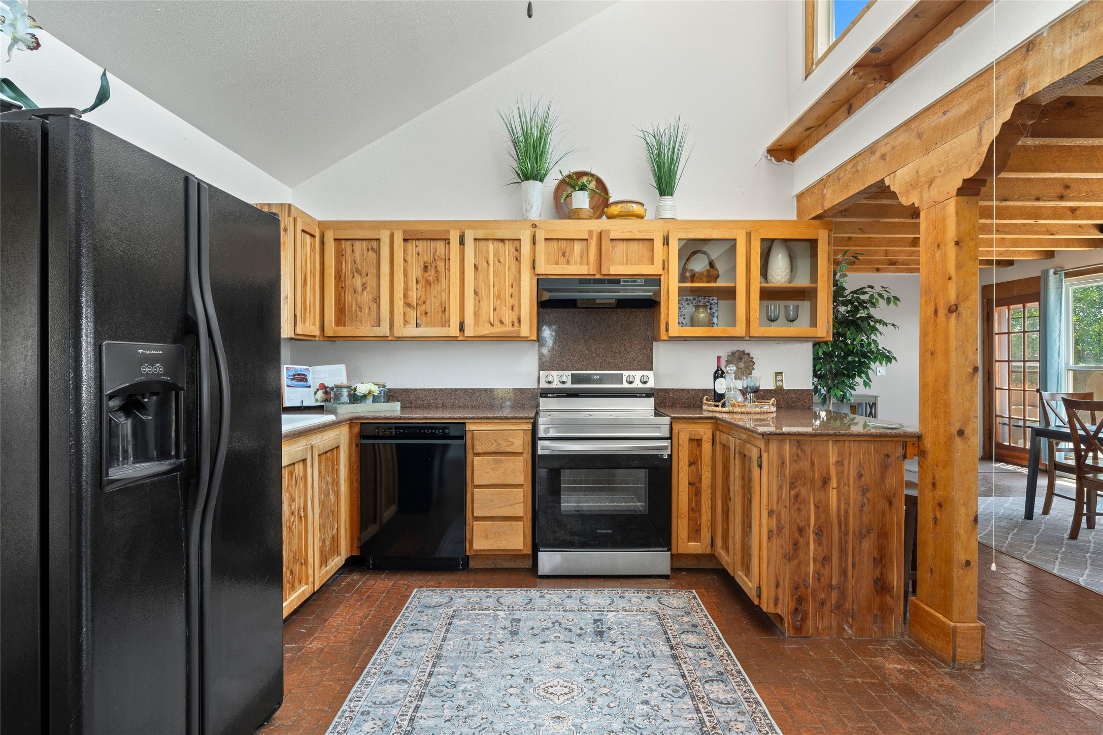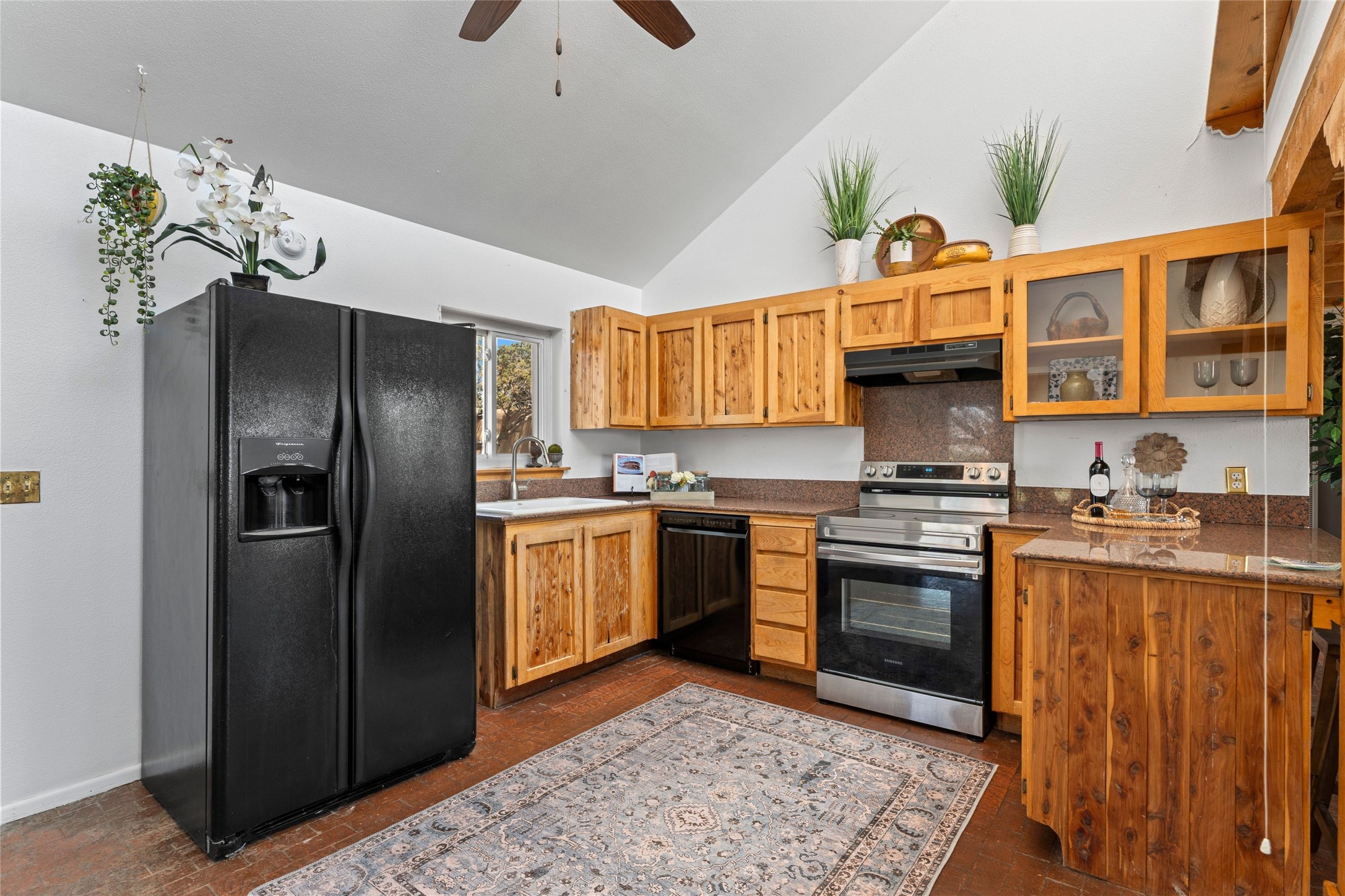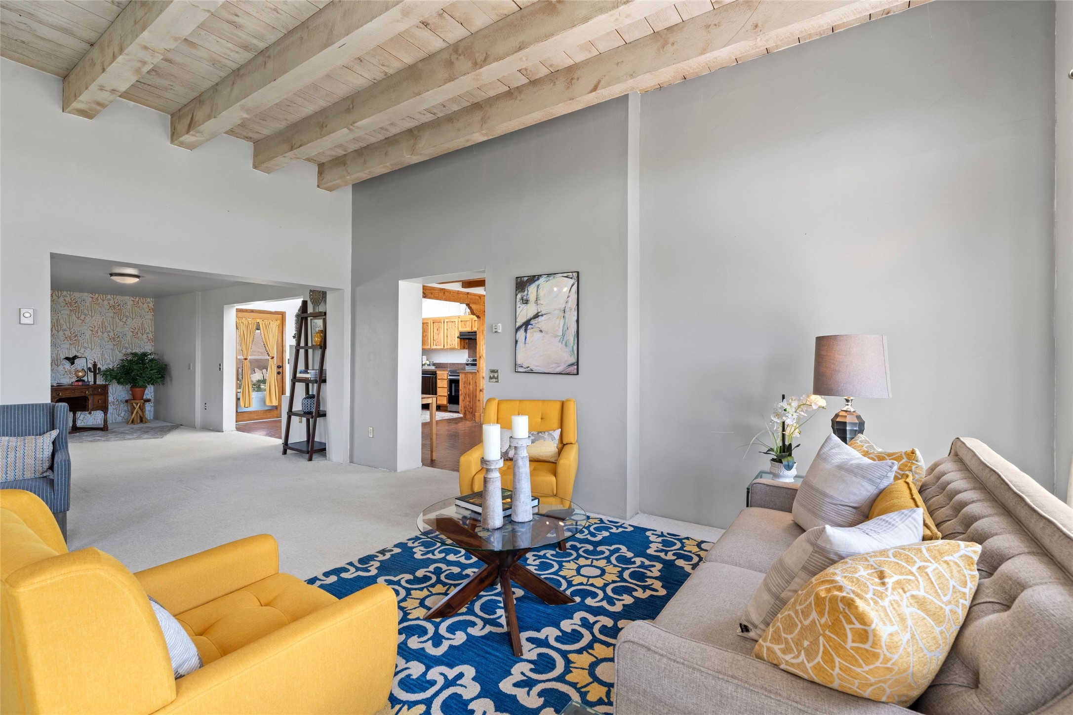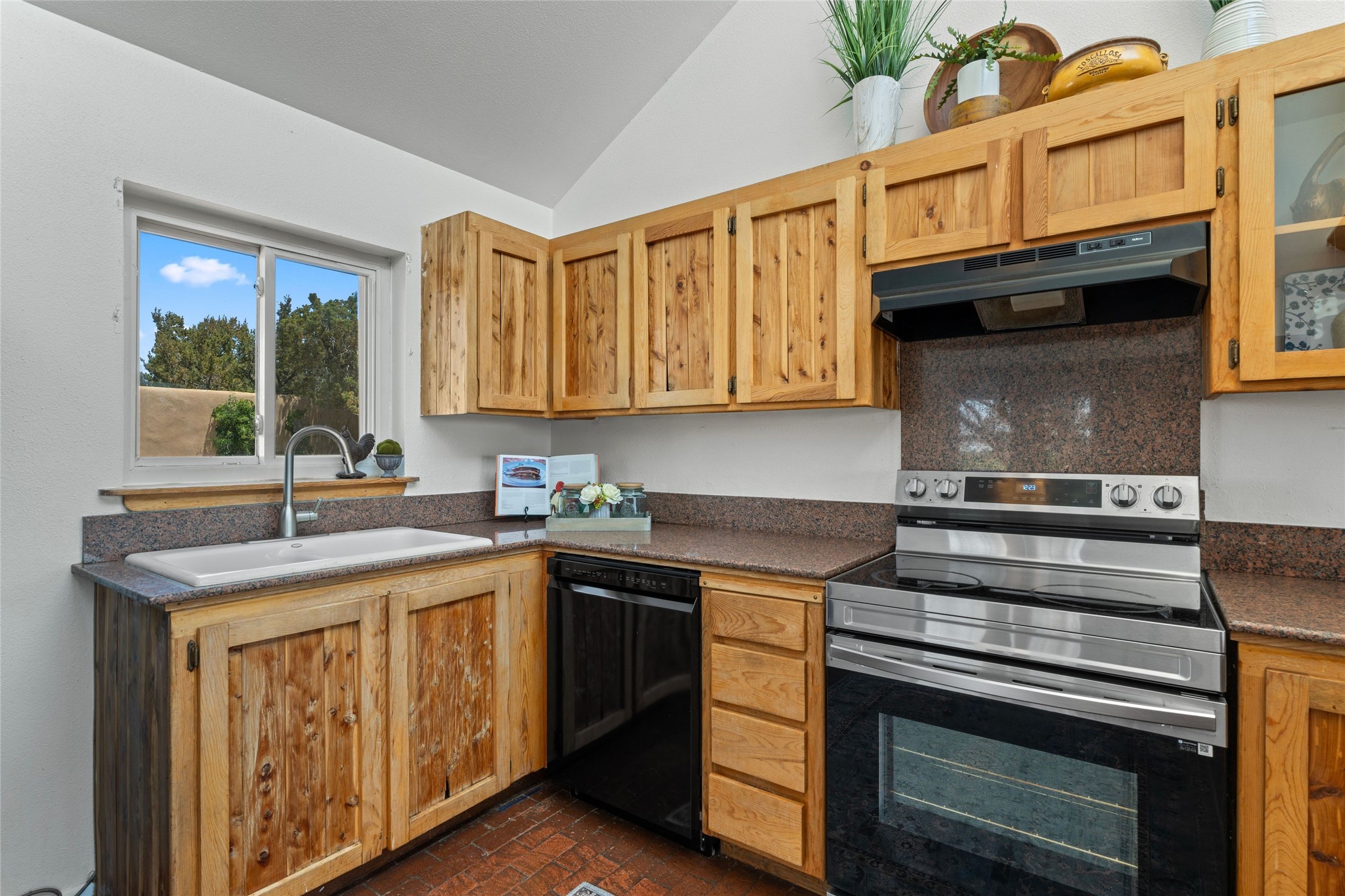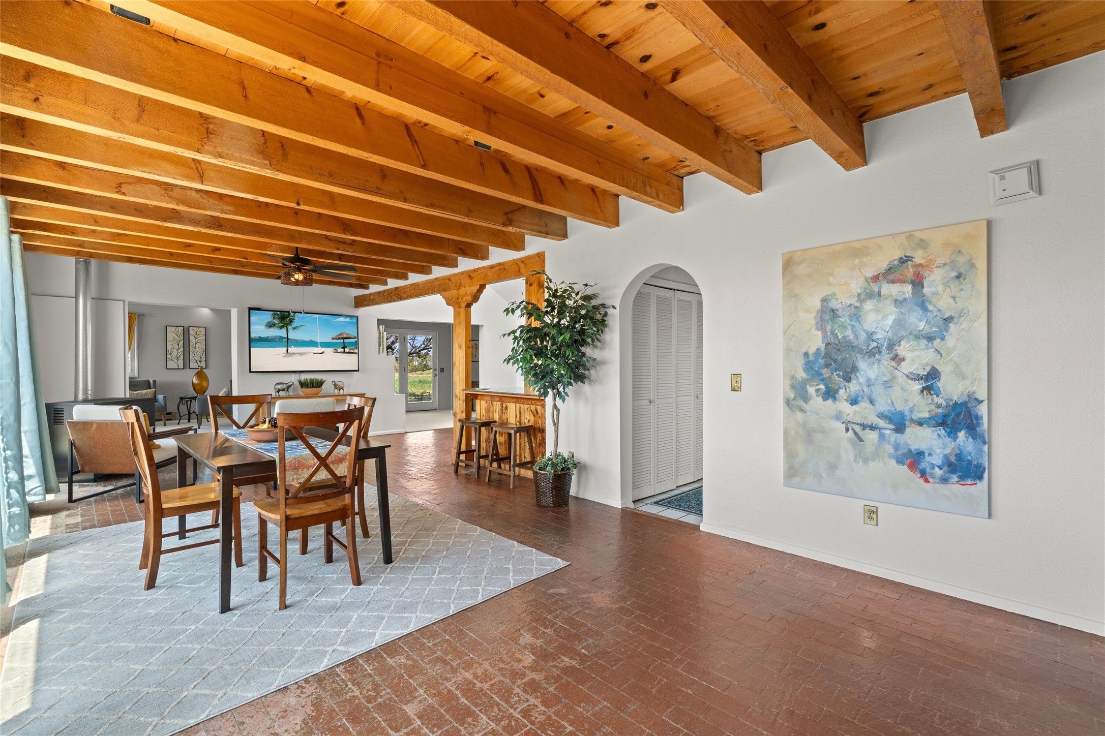 Set on 1.66 acres with peaceful rural surroundings, this classic Santa Fe home blends Southwestern charm with versatile living space just 17 minutes from the historic Plaza. Featuring 2 bedrooms and 2 bathrooms across 1,626 square feet, the home showcases signature regional details including brick floors, wood-beamed ceilings, and an open-concept layout that invites natural light and easy flow between living, dining, and kitchen areas. The kitchen offers warm wood cabinetry, granite countertops, and a breakfast bar that opens to the main living space -- ideal for everyday living or entertaining. French doors from a flexible bonus room lead outside, creating a perfect spot for a home office, art studio, or reading nook. Outdoor living is equally inviting with natural landscaping, mature trees, and room to expand gardens or create patios to suit your lifestyle. A detached one-car garage provides additional storage or workshop potential. Residents enjoy a shared well, a new septic tank installed in 2023, and high-speed internet access. Located just 3.8 miles from Eldorado's shopping and dining conveniences, this property combines the quiet of a country setting with proximity to Santa Fe amenities. Annual HOA dues of $610 cover road maintenance and community upkeep. This property offers a rare opportunity to enjoy Santa Fe's distinctive character and natural beauty in a serene, spacious setting -- ready to make your own.