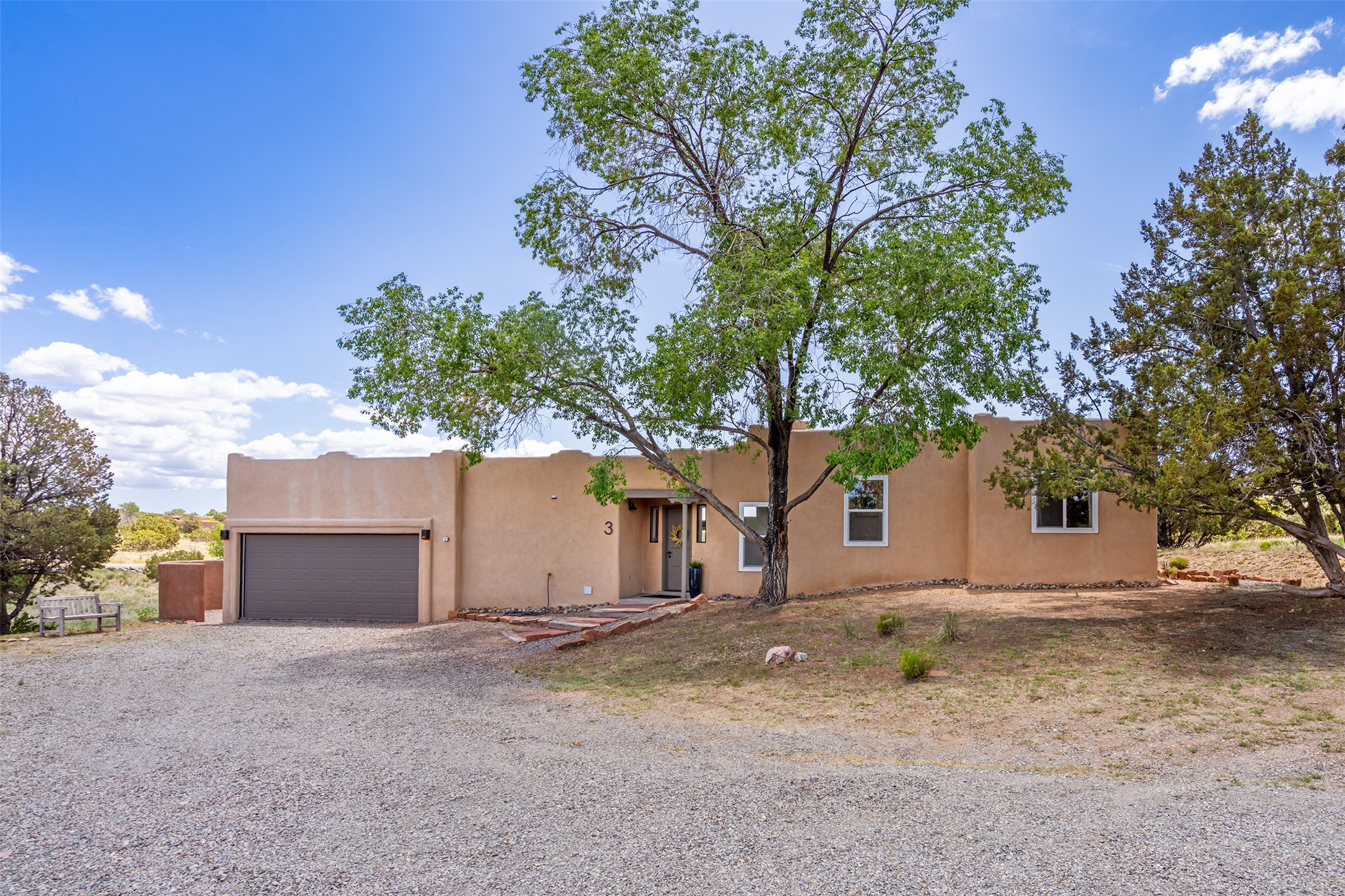Welcoming 2 bed, 2 bath home in the northeast section of Eldorado, blending traditional Southwestern charm with modern comforts in one of Santa Fe's most sought-after communities.Enter into a warm and bright living area with hardwood flooring, beam ceilings, and a large kiva fireplace with nicho. Natural light floods in through the wall of picture windows and french doors leading to a patio perfect for dining al fresco and soaking up our spectacular sunsets.The updated kitchen is thoughtfully remodeled with stylish finishes, quality cabinetry, and stainless steel appliances. Both bathrooms have also been tastefully renovated with contemporary fixtures that enhance the home's understated luxury. The bedrooms are peaceful retreats, with the primary featuring its own private entrance into the spacious backyard.Step outside to enjoy the tranquility of Eldorado's wide-open skies and natural landscapes, with nearby access to miles of scenic trails in the Eldorado open space and the Galisteo Basin Preserve -- ideal for hiking, wildlife viewing, and peaceful reflection.Residents of Eldorado enjoy an exceptional array of amenities, including a vibrant community clubhouse, swimming pool, fitness center, tennis courts, horse stables, and dog parks. Whether you're seeking quiet retreat or active engagement, this community provides the perfect setting.3 Raudo Road is more than a home -- it's a lifestyle rooted in comfort, and natural beauty. Don't miss your opportunity to experience the unique charm of Eldorado living. Schedule your private showing today.
