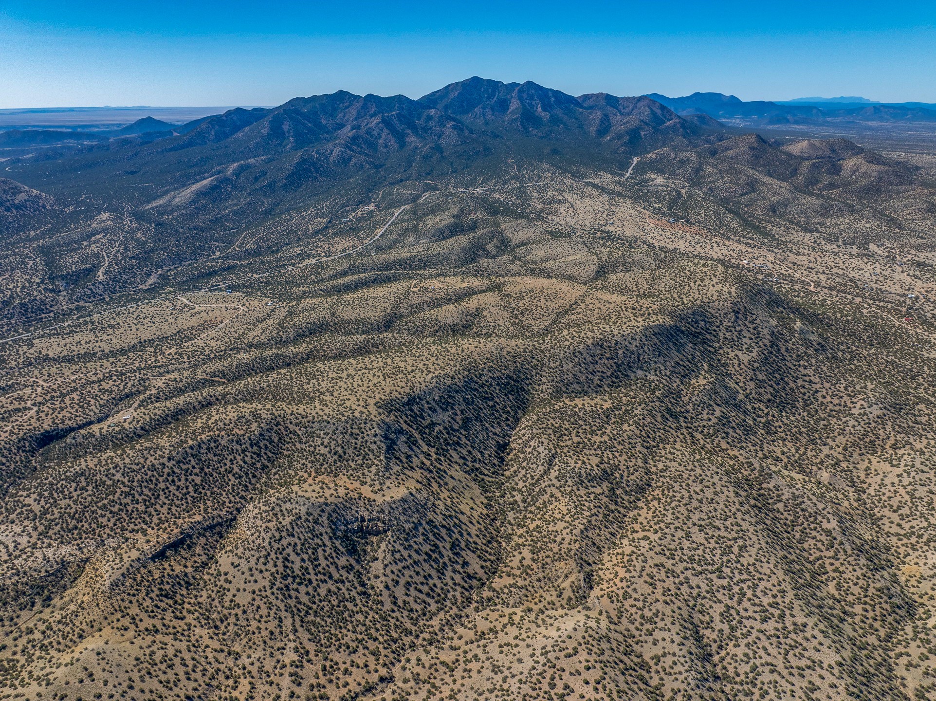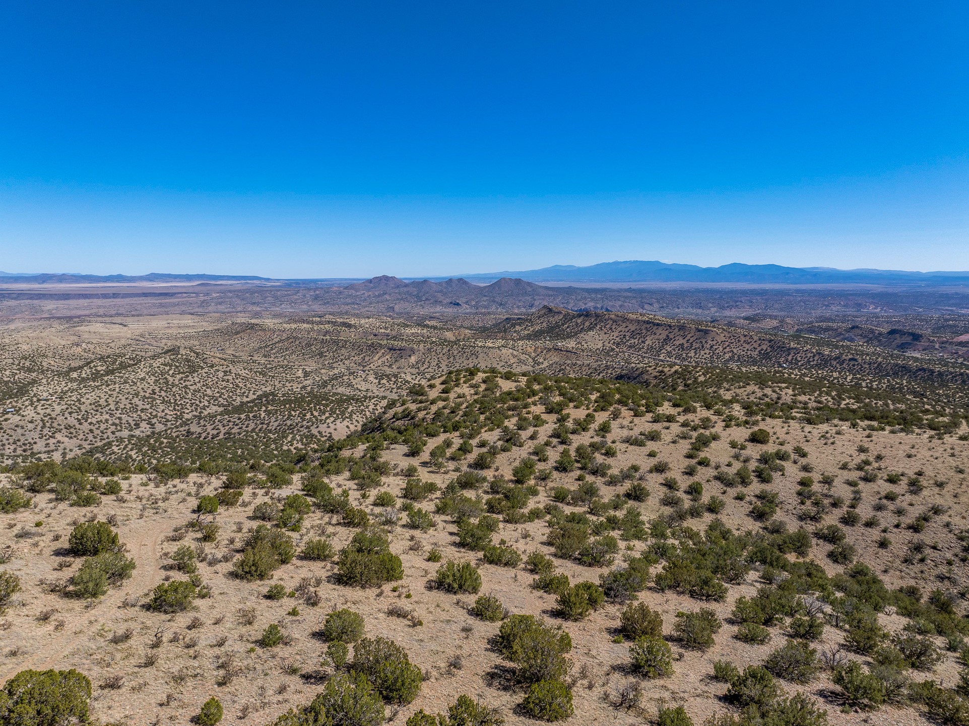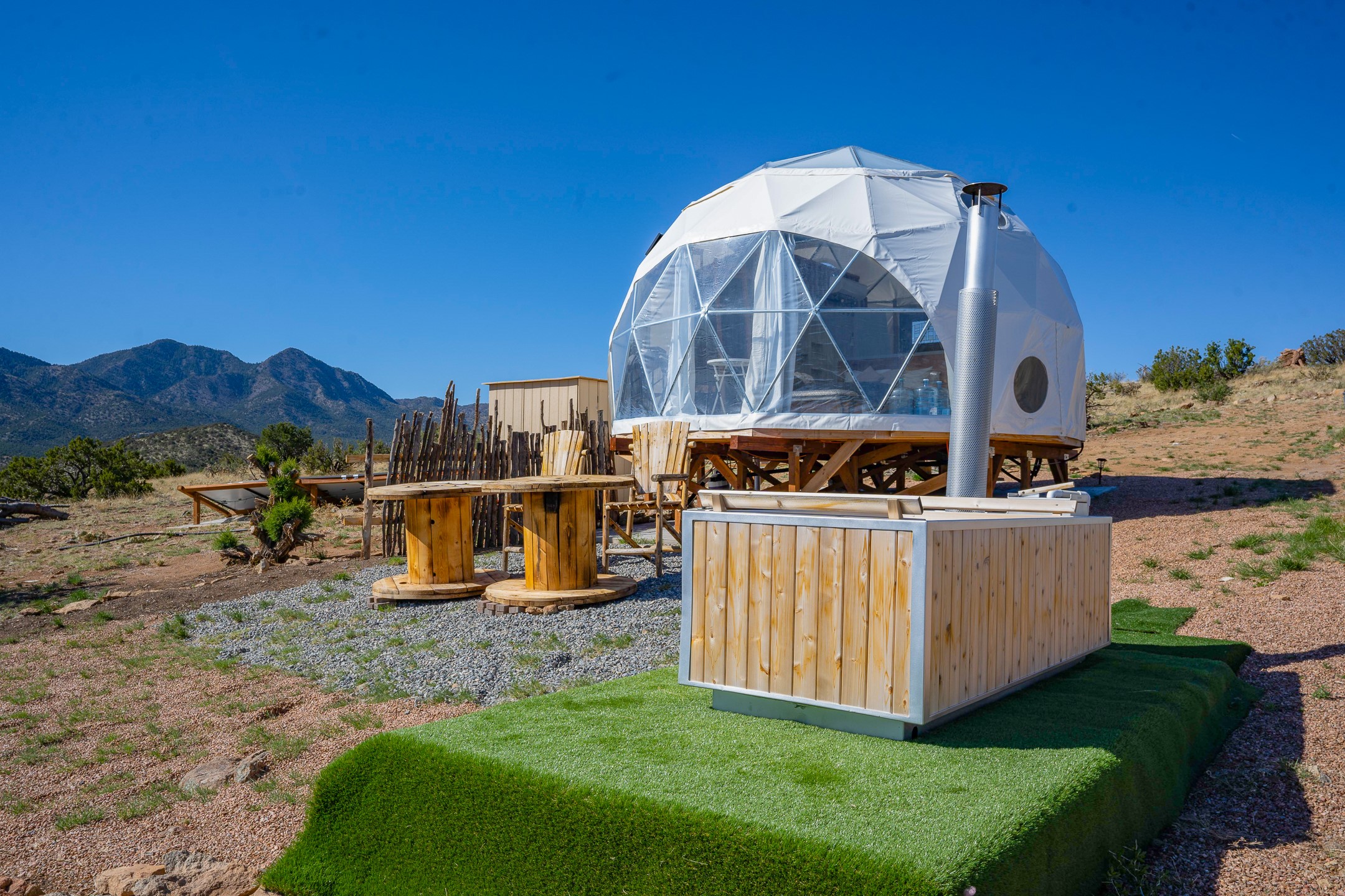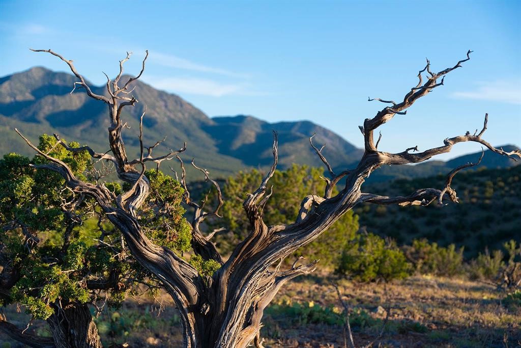 Two hundred and thirty mountain top acres with a PVC dome featuring all modern conveniences near Madrid. On two lots with two wells, this private getaway awaits the adventurous soul who wants to get above it all while still being connected. With 360 degree views from the mountain top, and the dome sited on a slope with amazing views of the Sangre de Cristo's, buyers will find this to be an incomparable view property. This far out, the Milky Way will shine bright, and the wood fired hot tub is the perfect place to stargaze from after a day of exploring the mountain. The dome has a small kitchen, bathroom, loft storage area, mini-split for heating and cooling, a luxurious glamping hideout or a cozy full time home. The solar system is modern and robust, and sewage is handled by an innovative bio-gas system. Closer than it feels, the property is just a half mile from the pavement, but that half mile is a steep and rocky climb, and a 4x4 with some clearance is recommended.