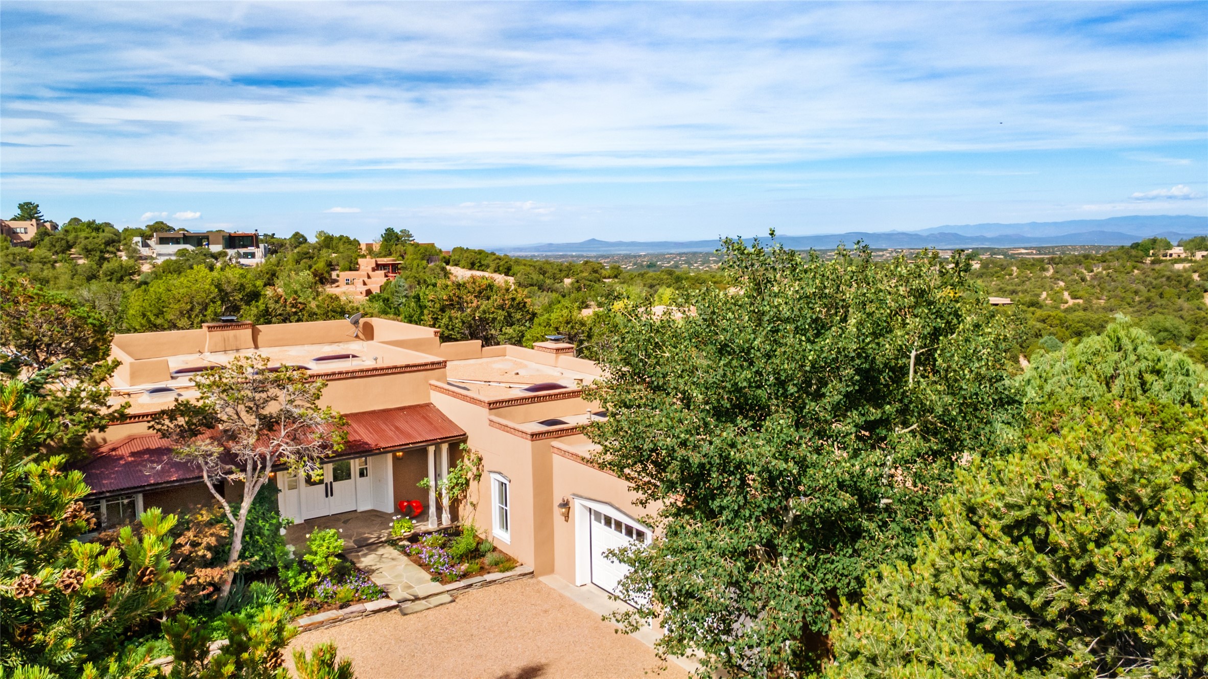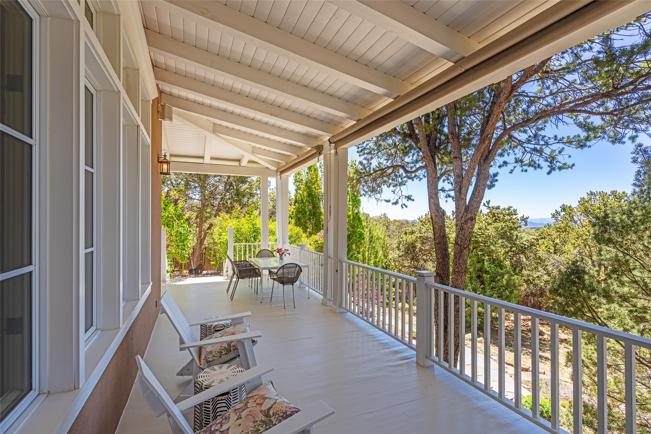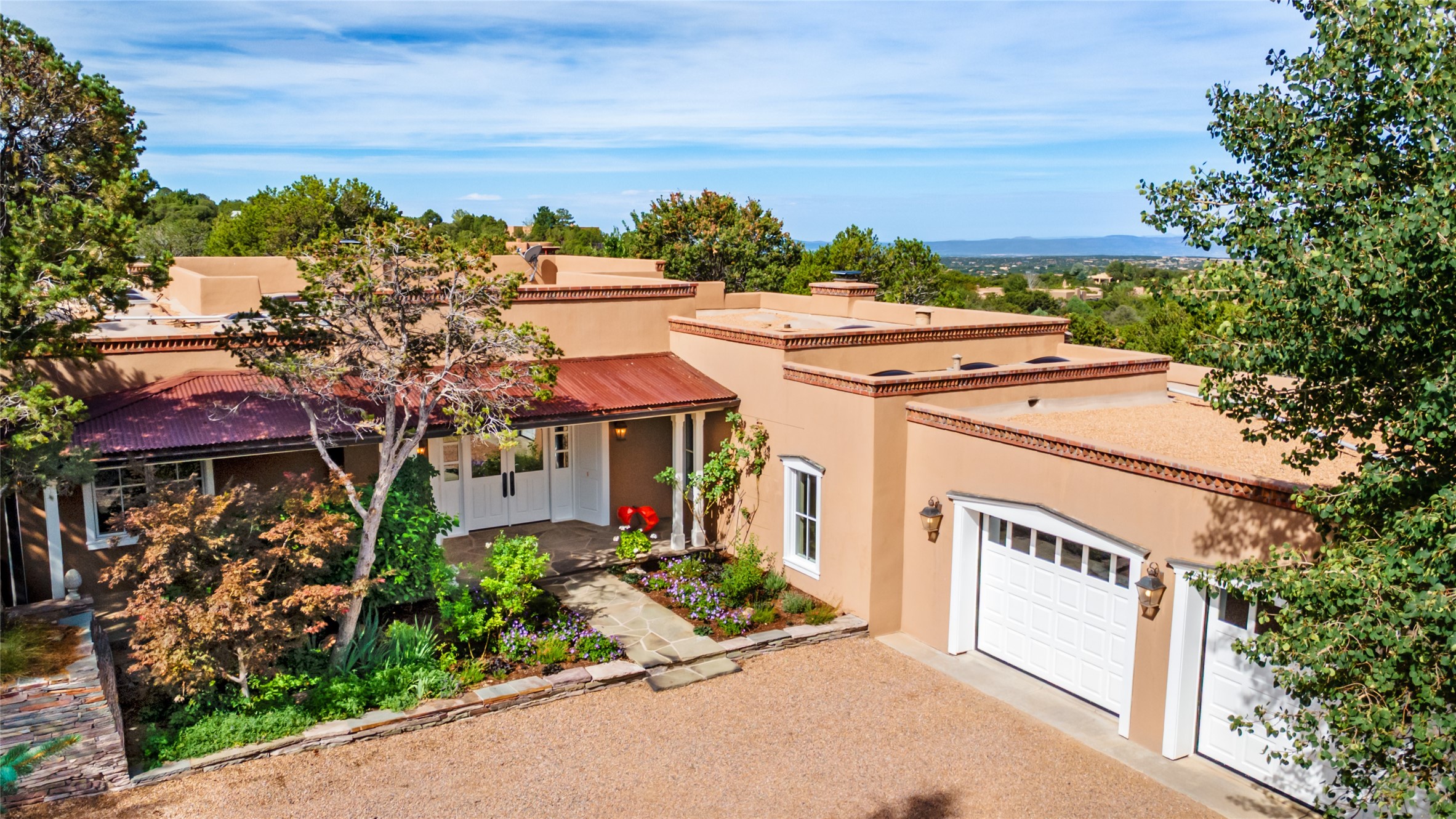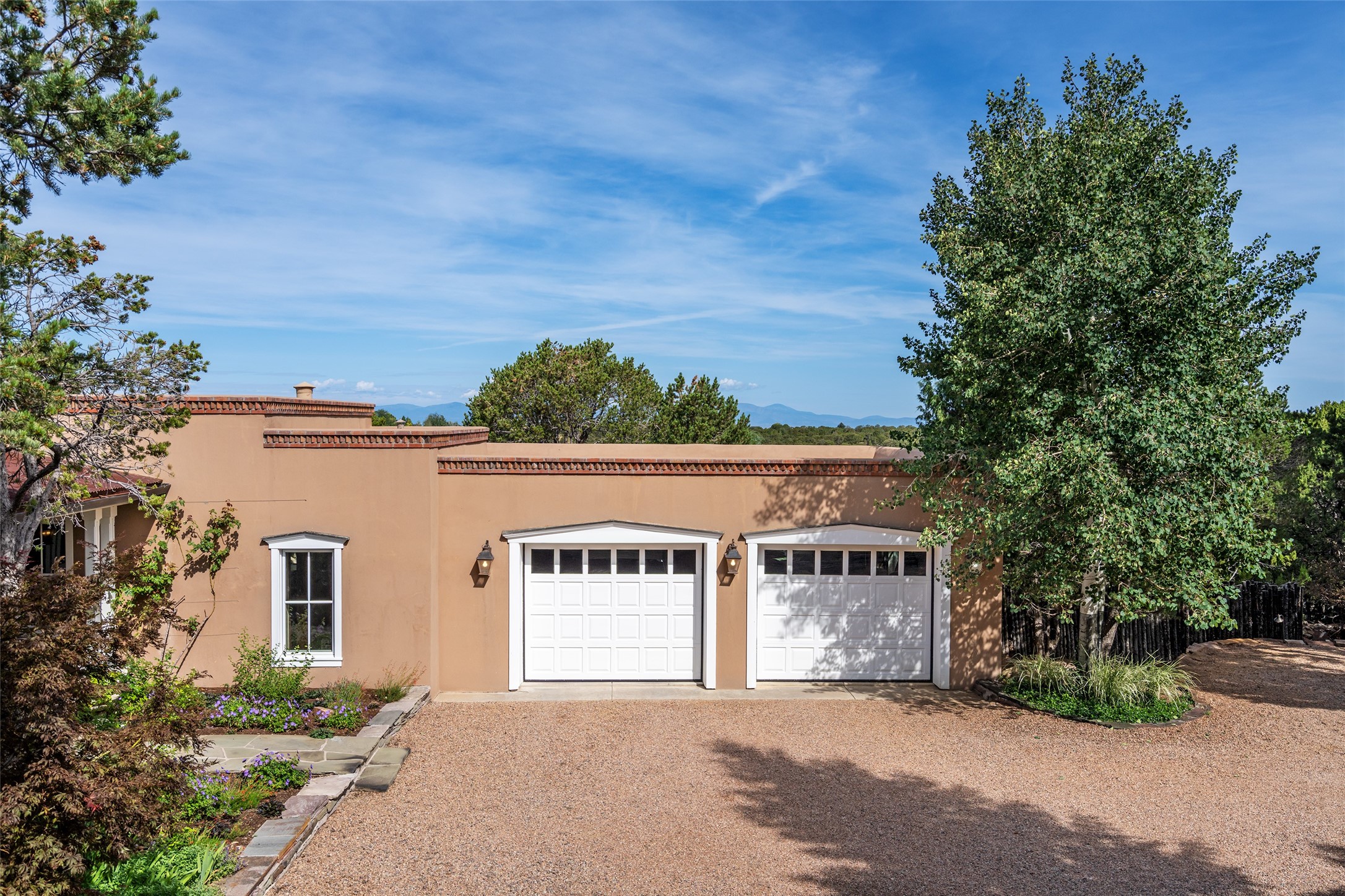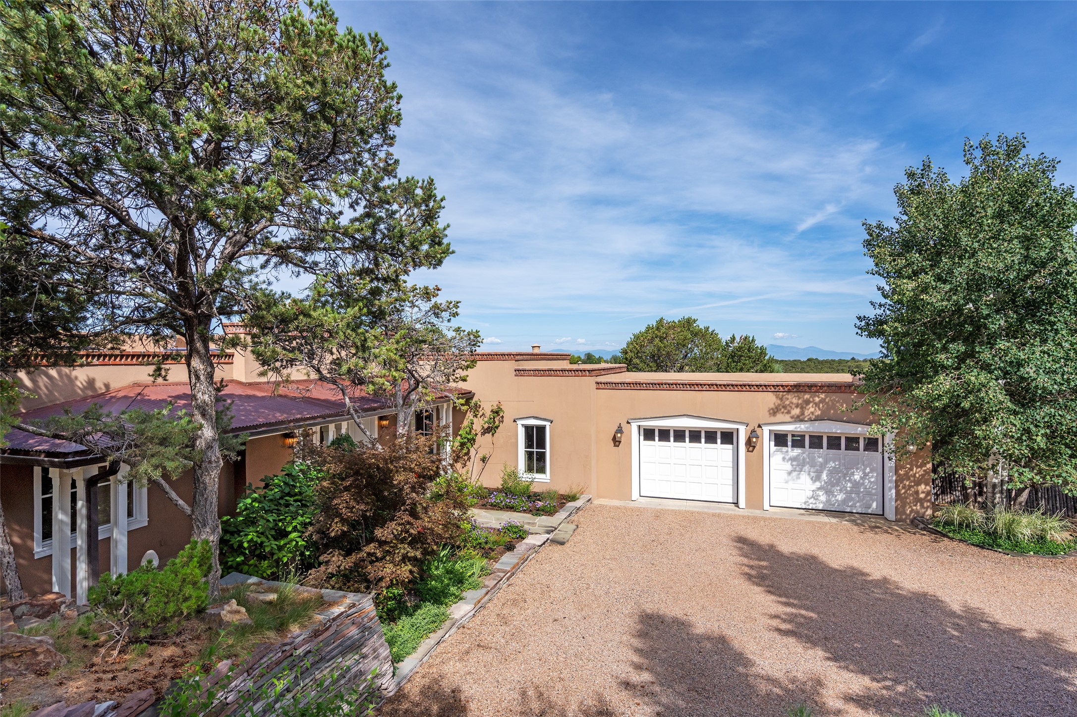 This gated oasis tastefully blends territorial-style with southwestern character reminiscent of old-world Europe. The property offers privacy, elegance, and tranquil views of the Jemez Mountains. The home features a deep wrap-around veranda --perfect for outdoor entertaining or peaceful evenings surrounded by lush, mature gardens and glorious trees. Inside, unique architectural touches abound, including roughhewn wood accents and soaring brick ceilings that add warmth and texture throughout. The elegant living room features a large stone fireplace and is adjoined by the dining room that seamlessly integrates with the gourmet kitchen -- a culinary dream, with a large island, honed stone countertop, top-tier appliances, and a separate butler's pantry with an additional dishwasher and sink. The spacious floor plan includes three bedrooms and four baths. The primary suite is generous, with access to the veranda, a private study, two spacious walk-in closets, and a luxurious bath. The separate guest wing with two gracious guest suites enjoys privacy and ensures welcoming accommodations. An oversized two-car garage completes this stunning property. More than a home, this is a secluded sanctuary that blends timeless design with modern comfort.