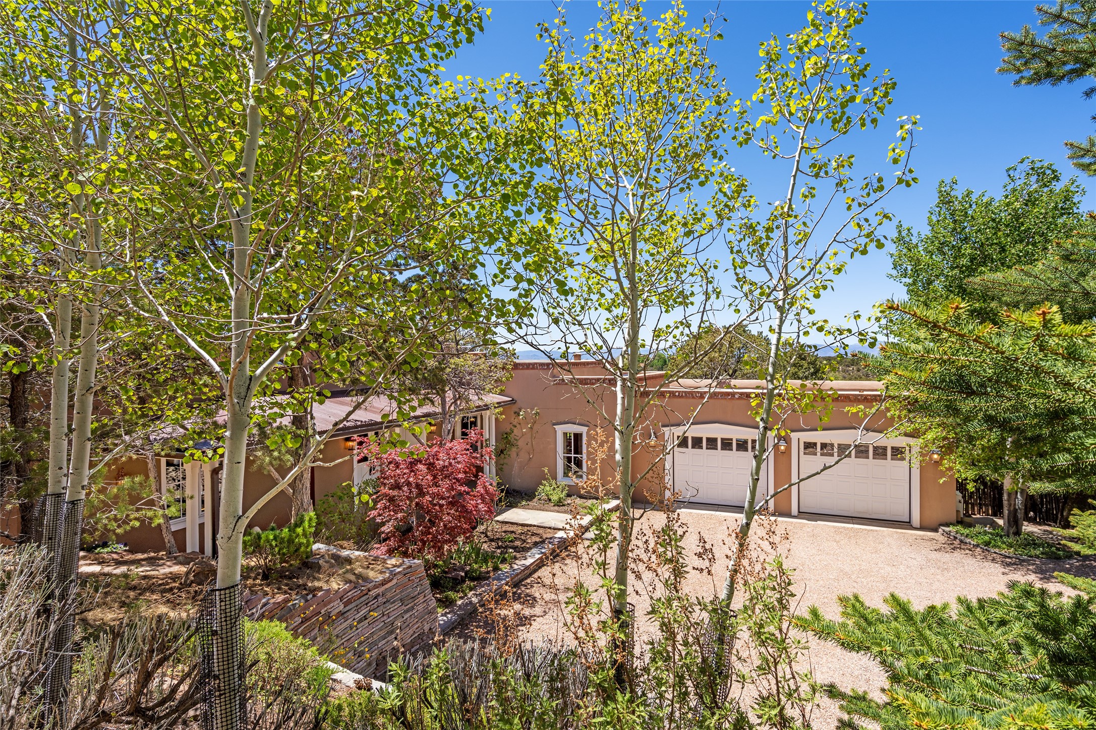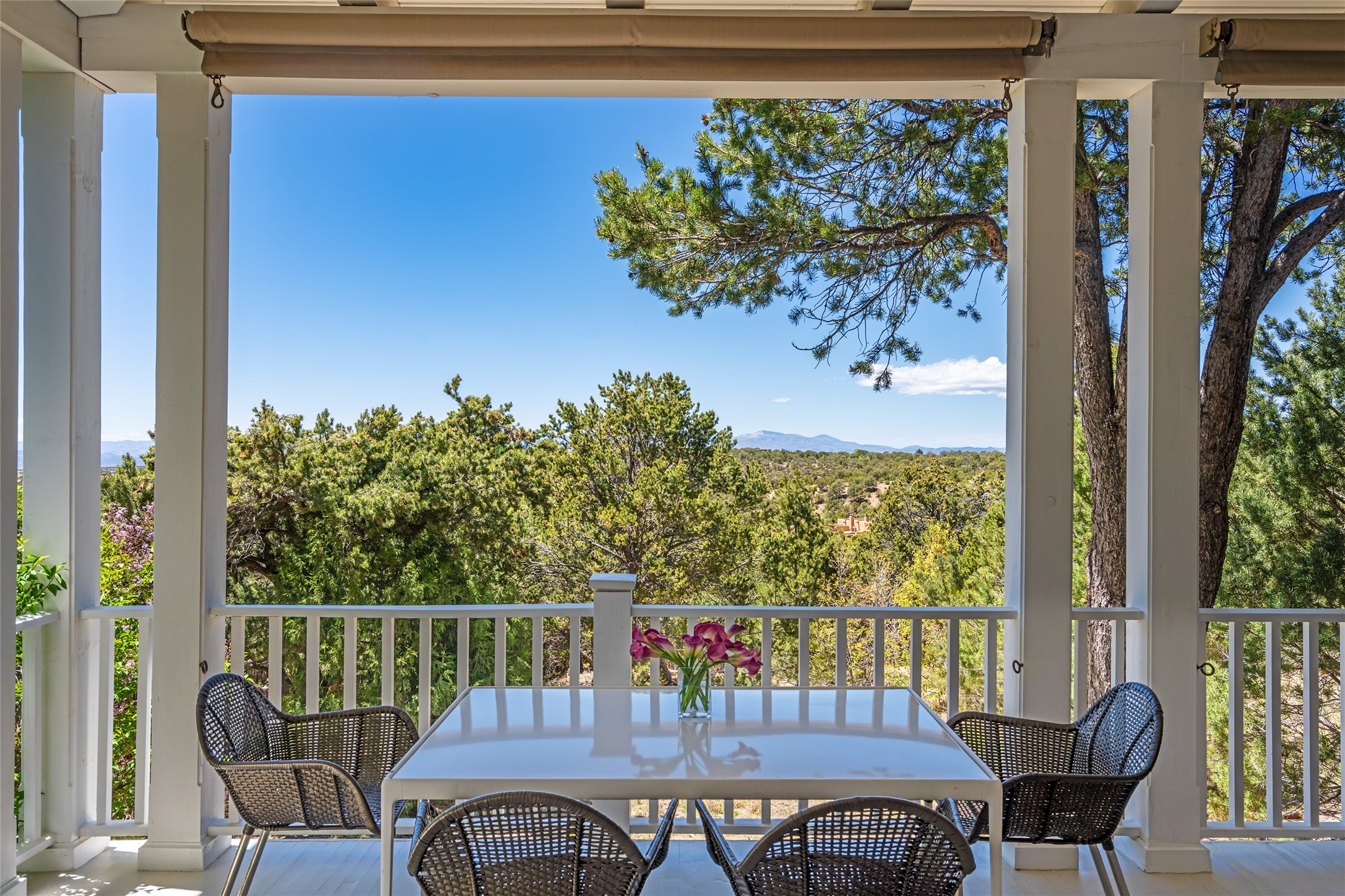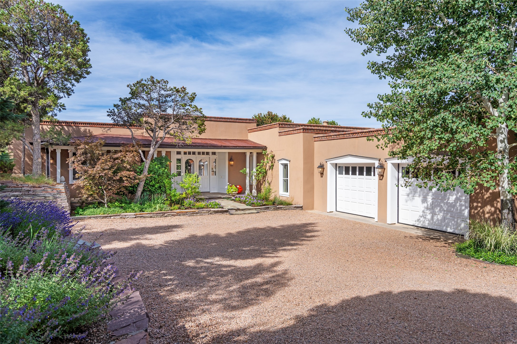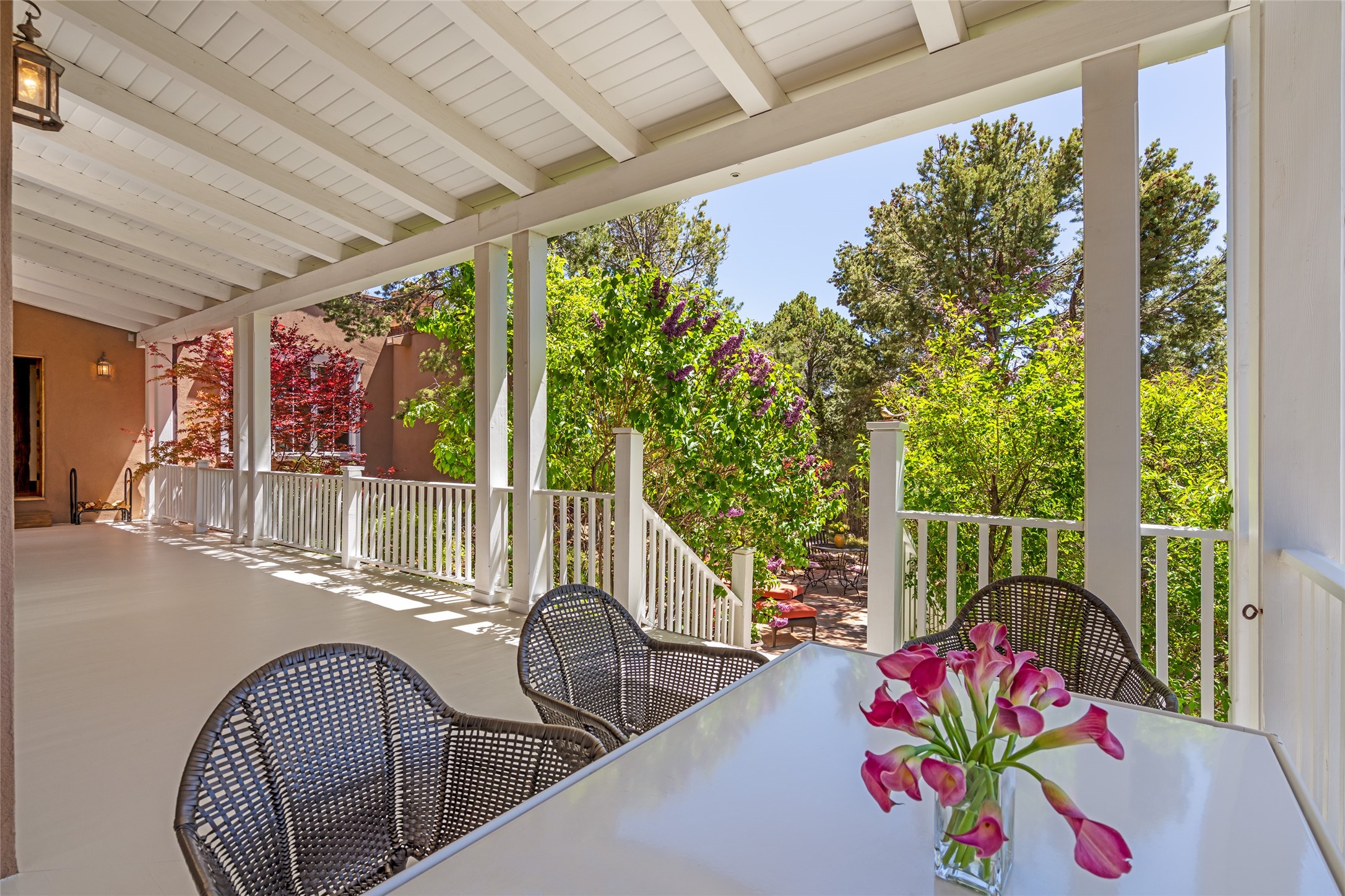 This gated oasis tastefully blends territorial-style with southwestern character reminiscent of old-world Europe. The property offers privacy, elegance, and tranquil views of the Jemez Mountains. The home features a deep wrap-around veranda --perfect for outdoor entertaining or peaceful evenings surrounded by lush, mature gardens and glorious trees. Inside, unique architectural touches abound, including roughhewn wood accents and soaring brick ceilings that add warmth and texture throughout. The elegant living room features a large stone fireplace and is adjoined by the dining room that seamlessly integrates with the gourmet kitchen -- a culinary dream, with a large island, honed stone countertop, top-tier appliances, and a separate butler's pantry with an additional dishwasher and sink. The spacious floor plan includes three bedrooms and four baths. The primary suite is generous, with access to the veranda, a private study, two spacious walk-in closets, and a luxurious bath. The separate guest wing with two gracious guest suites enjoys privacy and ensures welcoming accommodations. An oversized two-car garage completes this stunning property. More than a home, this is a secluded sanctuary that blends timeless design with modern comfort.