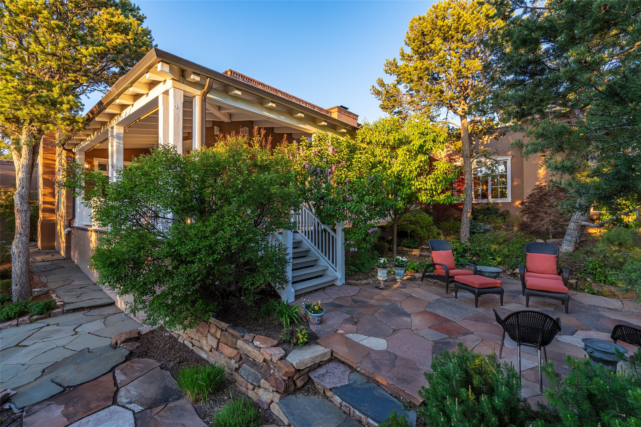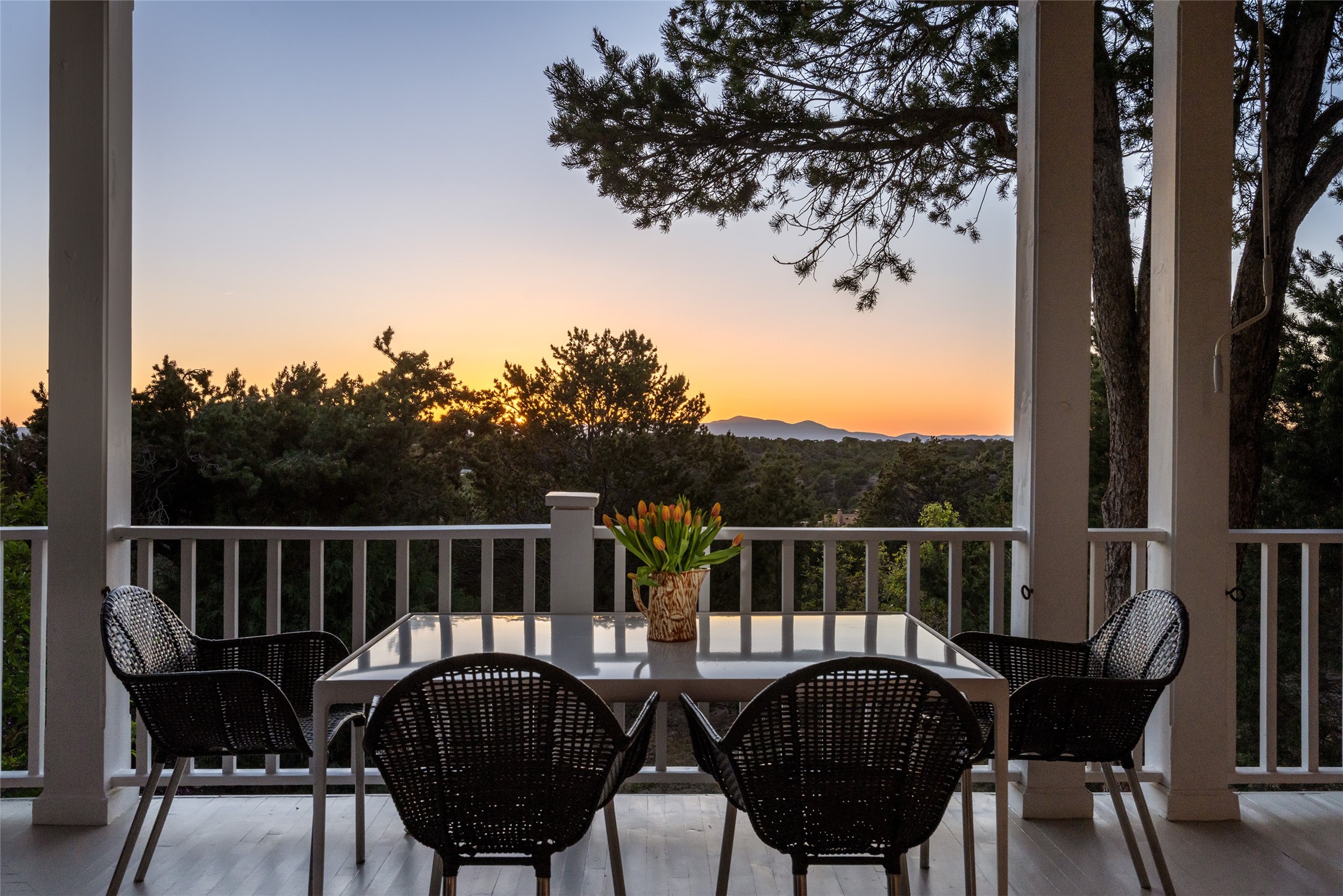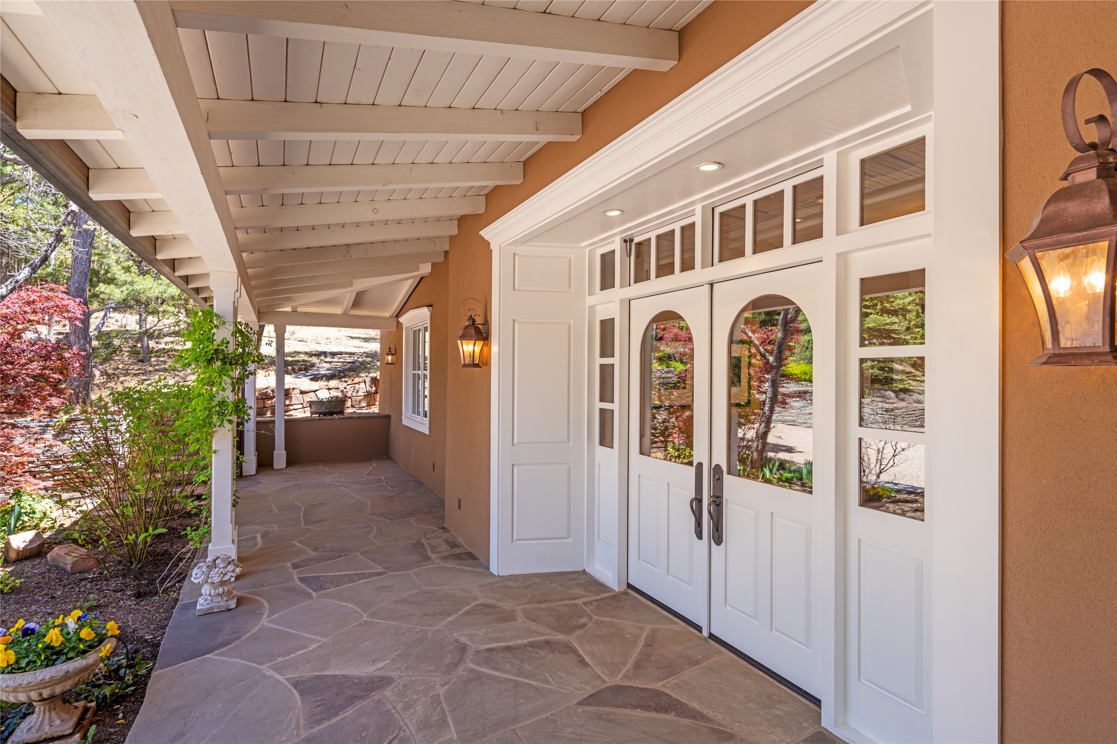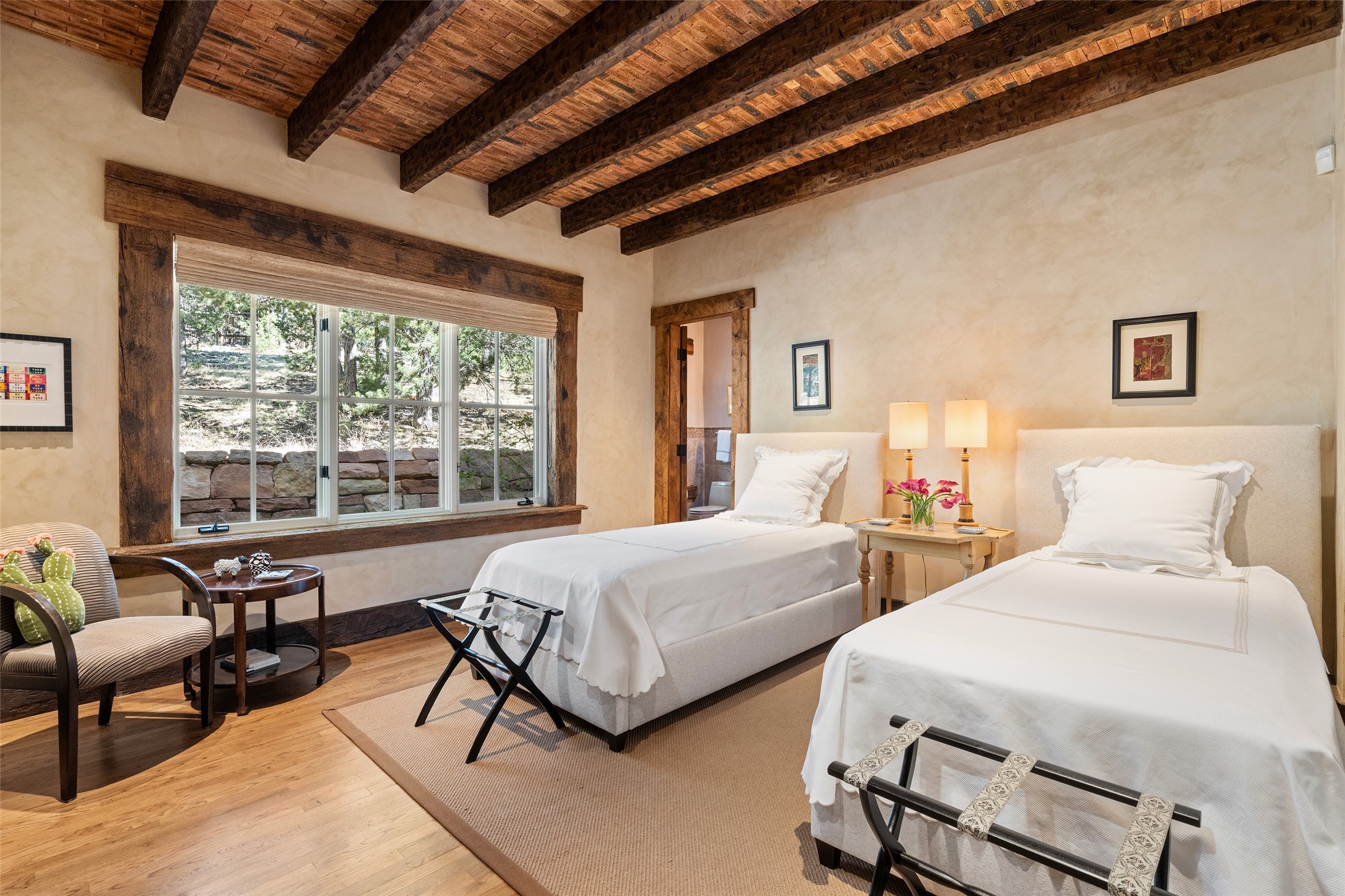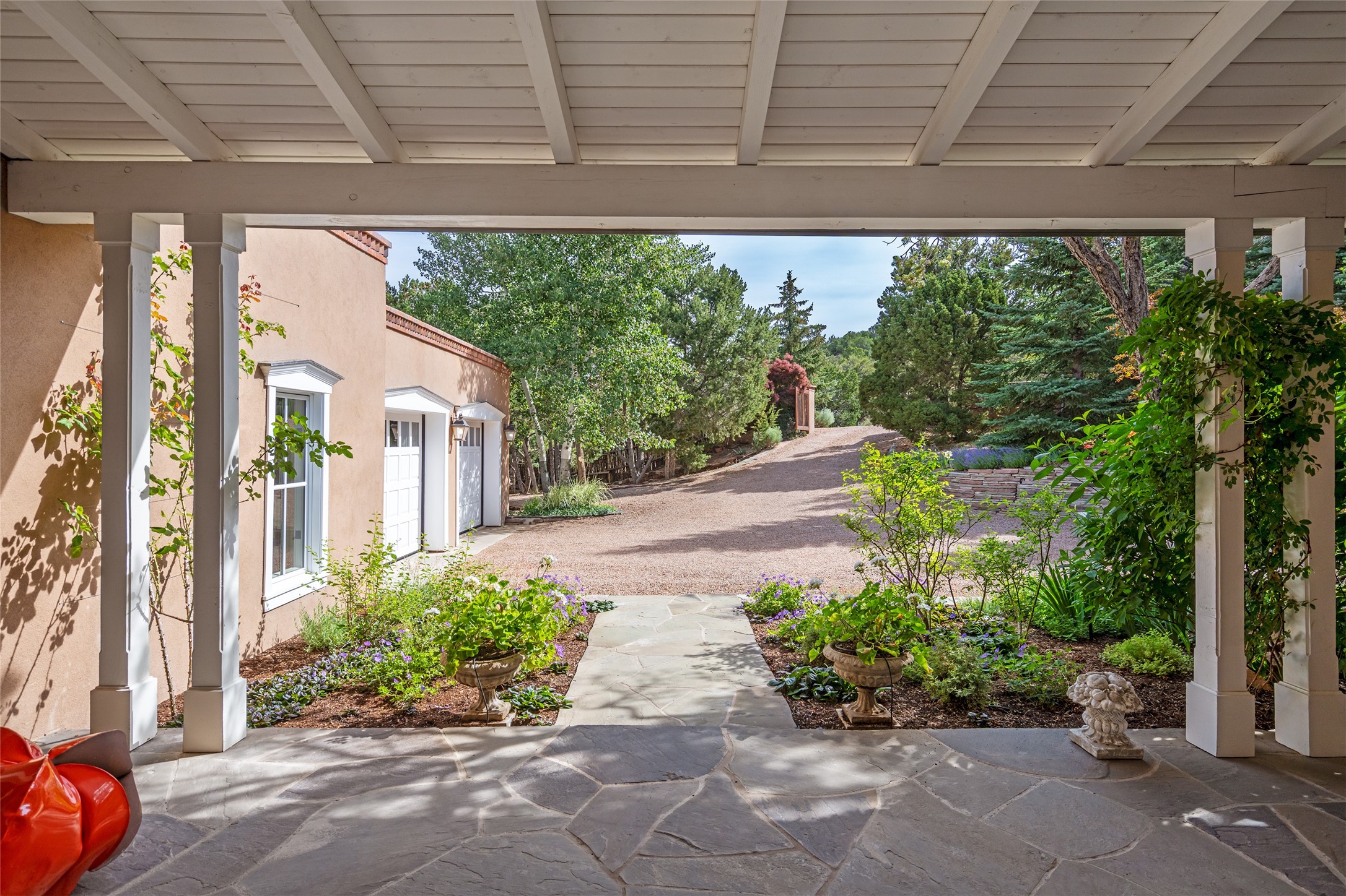 This gated oasis tastefully blends territorial-style with southwestern character reminiscent of old-world Europe. The property offers privacy, elegance, and tranquil views of the Jemez Mountains. The home features a deep wrap-around veranda --perfect for outdoor entertaining or peaceful evenings surrounded by lush, mature gardens and glorious trees. Inside, unique architectural touches abound, including roughhewn wood accents and soaring brick ceilings that add warmth and texture throughout. The elegant living room features a large stone fireplace and is adjoined by the dining room that seamlessly integrates with the gourmet kitchen -- a culinary dream, with a large island, honed stone countertop, top-tier appliances, and a separate butler's pantry with an additional dishwasher and sink. The spacious floor plan includes three bedrooms and four baths. The primary suite is generous, with access to the veranda, a private study, two spacious walk-in closets, and a luxurious bath. The separate guest wing with two gracious guest suites enjoys privacy and ensures welcoming accommodations. An oversized two-car garage completes this stunning property. More than a home, this is a secluded sanctuary that blends timeless design with modern comfort.