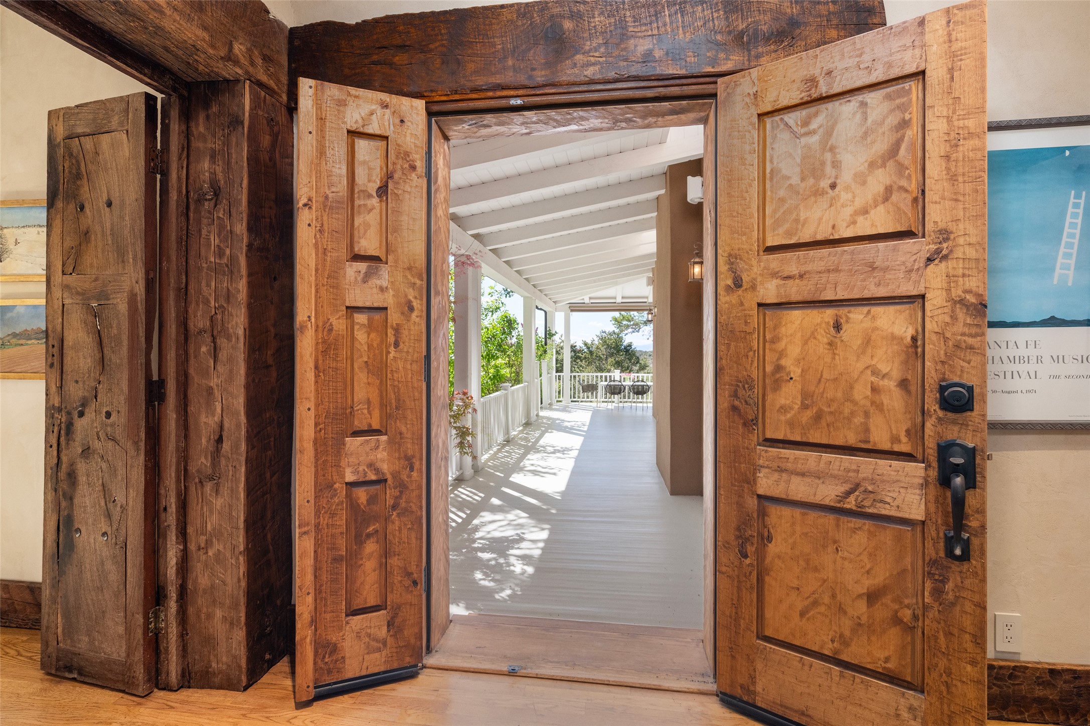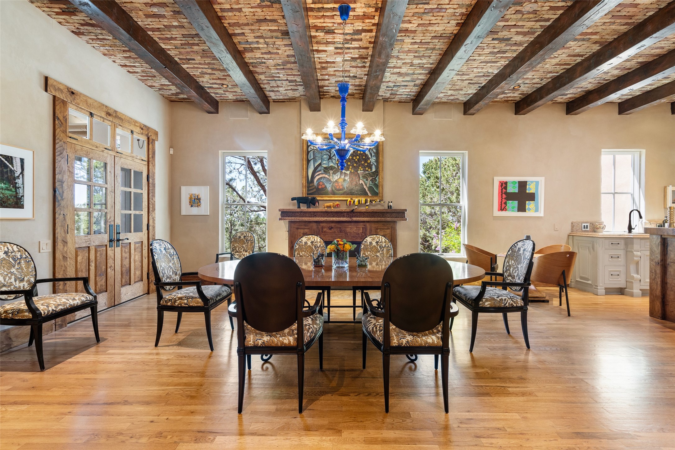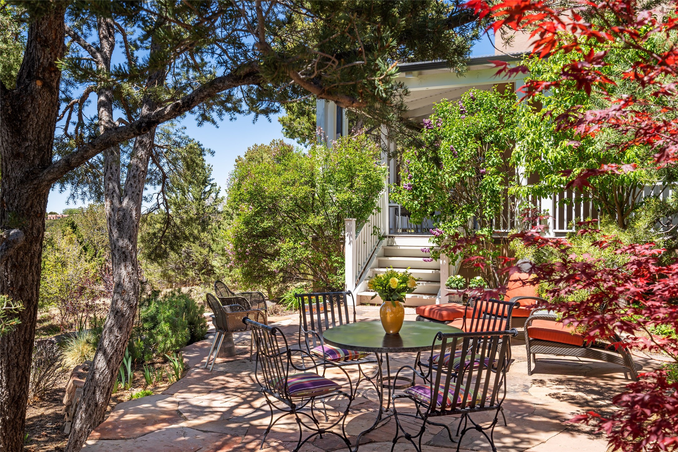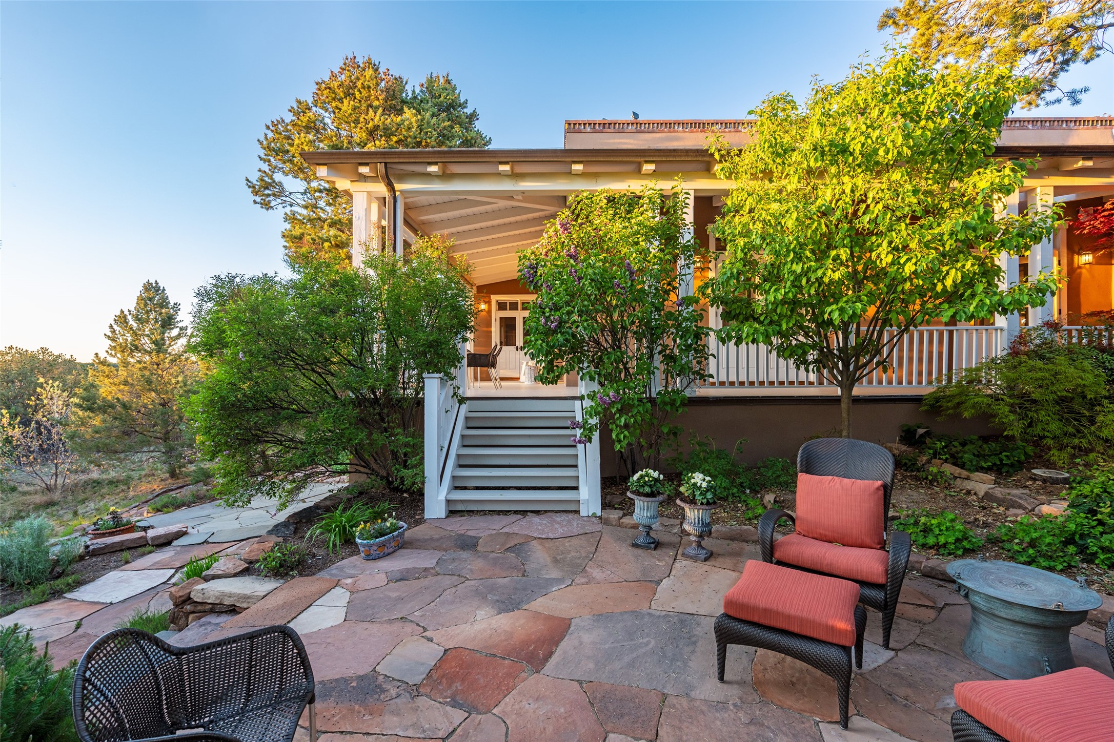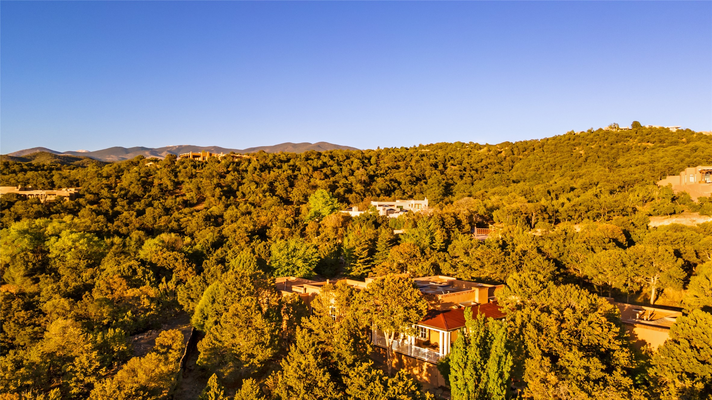 This gated oasis tastefully blends territorial-style with southwestern character reminiscent of old-world Europe. The property offers privacy, elegance, and tranquil views of the Jemez Mountains. The home features a deep wrap-around veranda --perfect for outdoor entertaining or peaceful evenings surrounded by lush, mature gardens and glorious trees. Inside, unique architectural touches abound, including roughhewn wood accents and soaring brick ceilings that add warmth and texture throughout. The elegant living room features a large stone fireplace and is adjoined by the dining room that seamlessly integrates with the gourmet kitchen -- a culinary dream, with a large island, honed stone countertop, top-tier appliances, and a separate butler's pantry with an additional dishwasher and sink. The spacious floor plan includes three bedrooms and four baths. The primary suite is generous, with access to the veranda, a private study, two spacious walk-in closets, and a luxurious bath. The separate guest wing with two gracious guest suites enjoys privacy and ensures welcoming accommodations. An oversized two-car garage completes this stunning property. More than a home, this is a secluded sanctuary that blends timeless design with modern comfort.