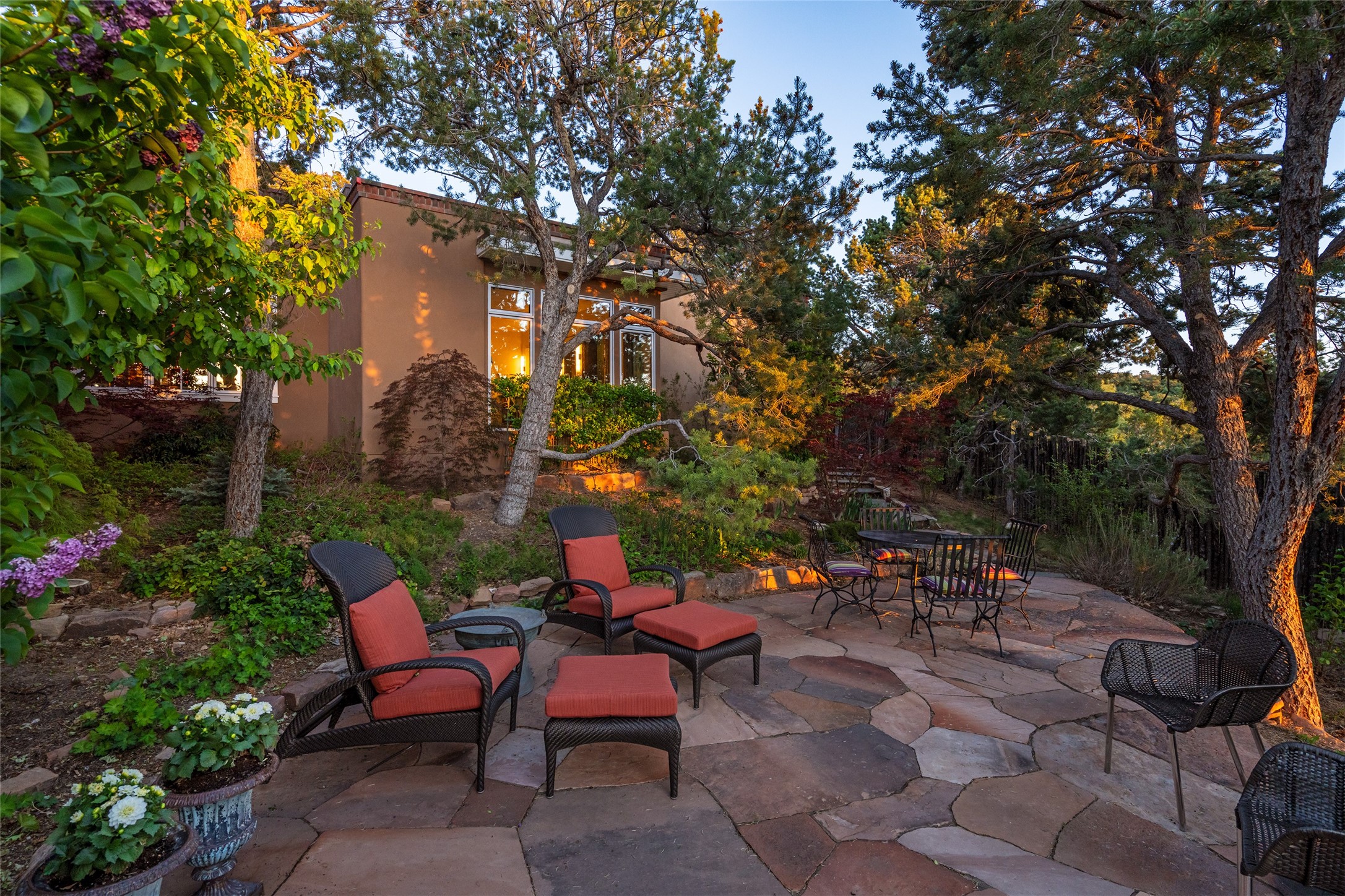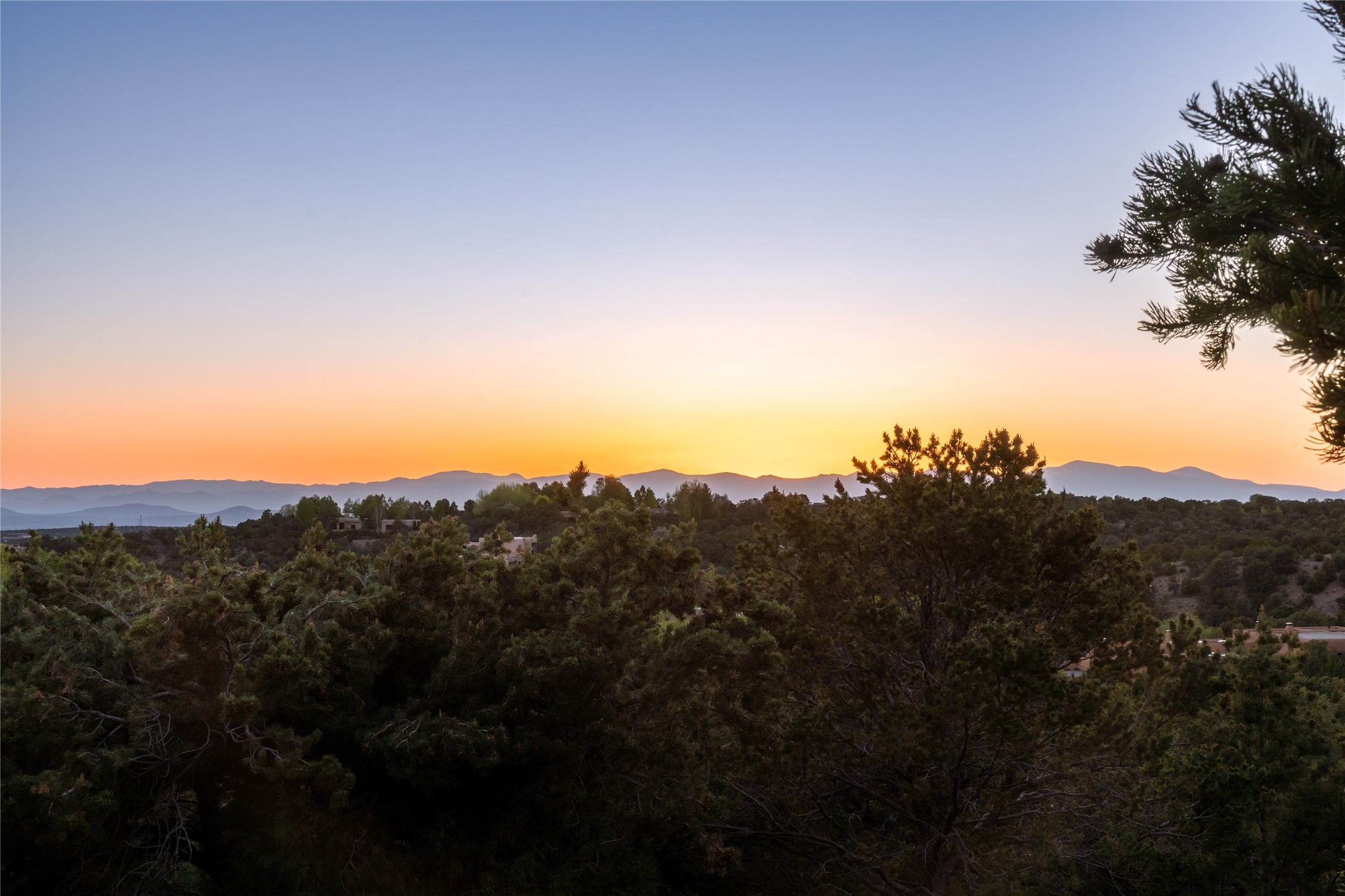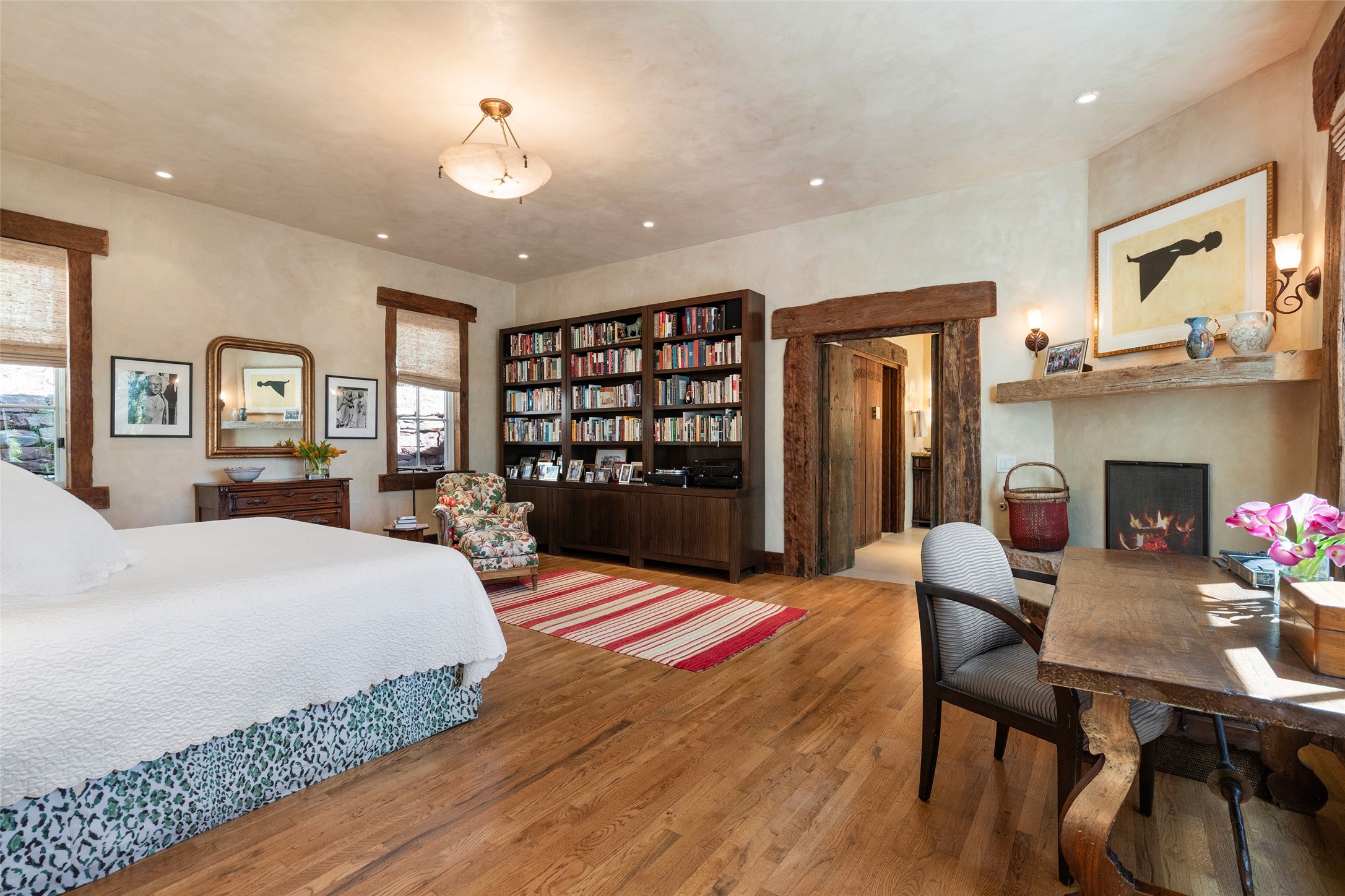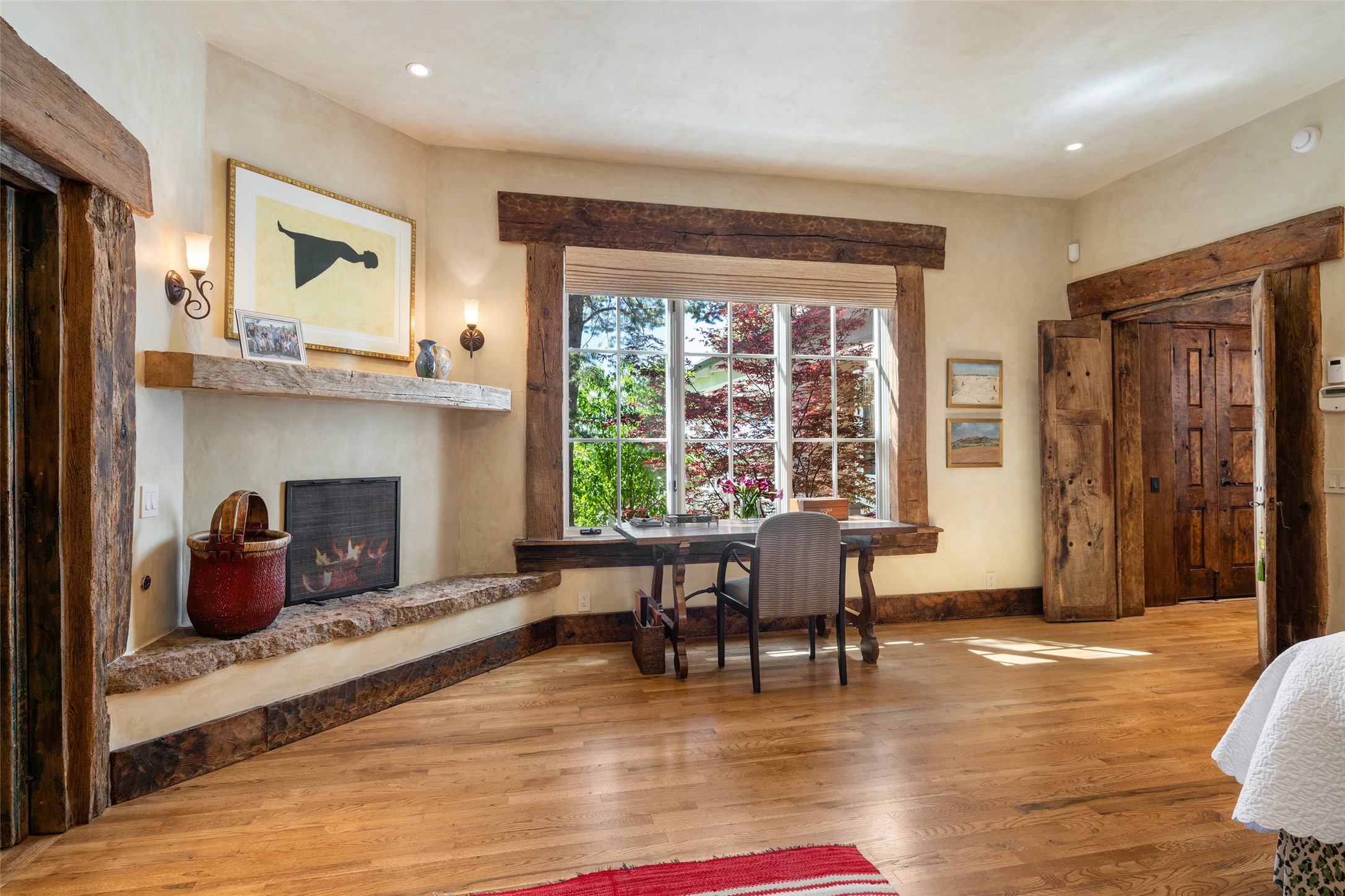 This gated oasis tastefully blends territorial-style with southwestern character reminiscent of old-world Europe. The property offers privacy, elegance, and tranquil views of the Jemez Mountains. The home features a deep wrap-around veranda --perfect for outdoor entertaining or peaceful evenings surrounded by lush, mature gardens and glorious trees. Inside, unique architectural touches abound, including roughhewn wood accents and soaring brick ceilings that add warmth and texture throughout. The elegant living room features a large stone fireplace and is adjoined by the dining room that seamlessly integrates with the gourmet kitchen -- a culinary dream, with a large island, honed stone countertop, top-tier appliances, and a separate butler's pantry with an additional dishwasher and sink. The spacious floor plan includes three bedrooms and four baths. The primary suite is generous, with access to the veranda, a private study, two spacious walk-in closets, and a luxurious bath. The separate guest wing with two gracious guest suites enjoys privacy and ensures welcoming accommodations. An oversized two-car garage completes this stunning property. More than a home, this is a secluded sanctuary that blends timeless design with modern comfort.