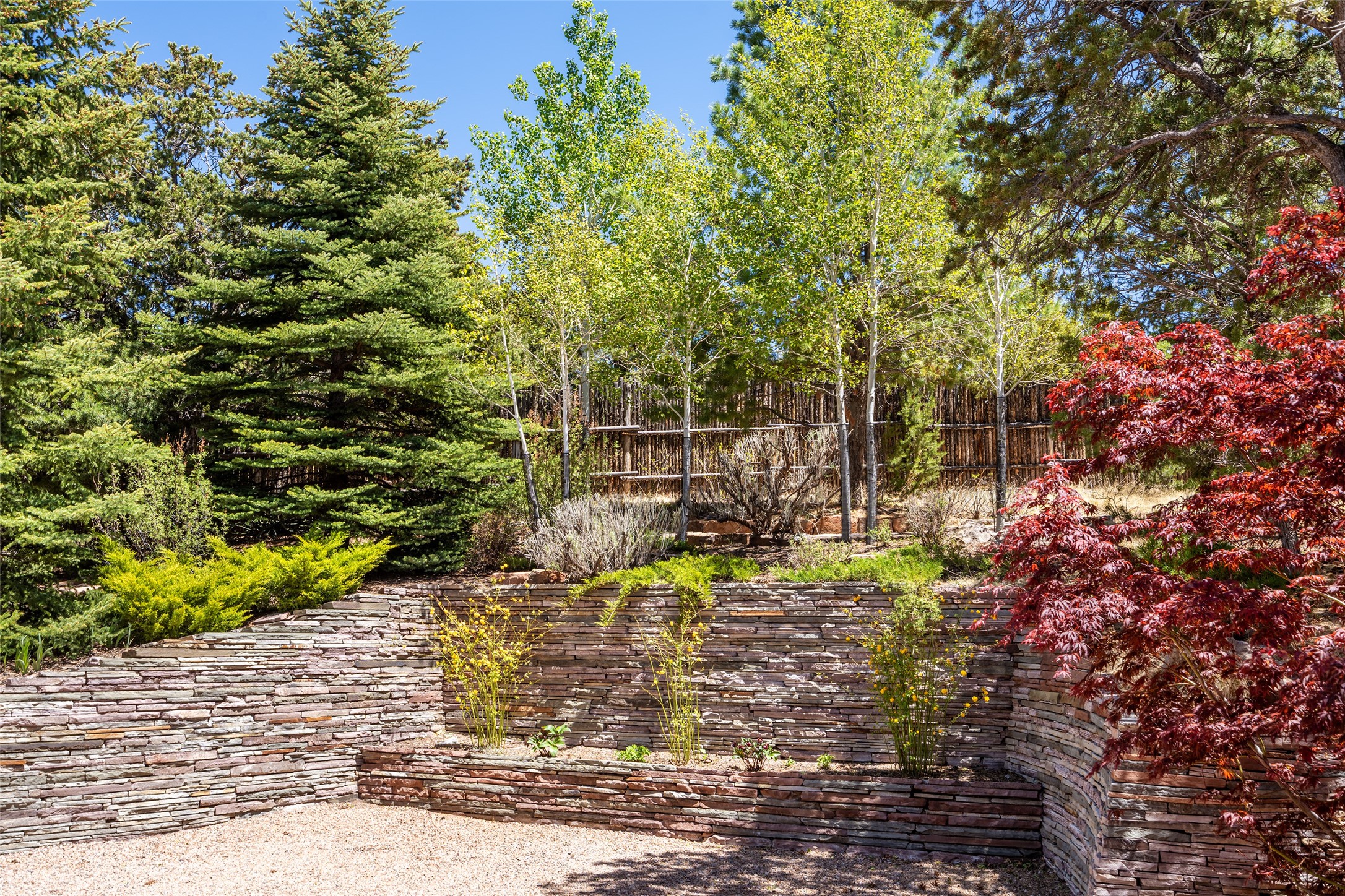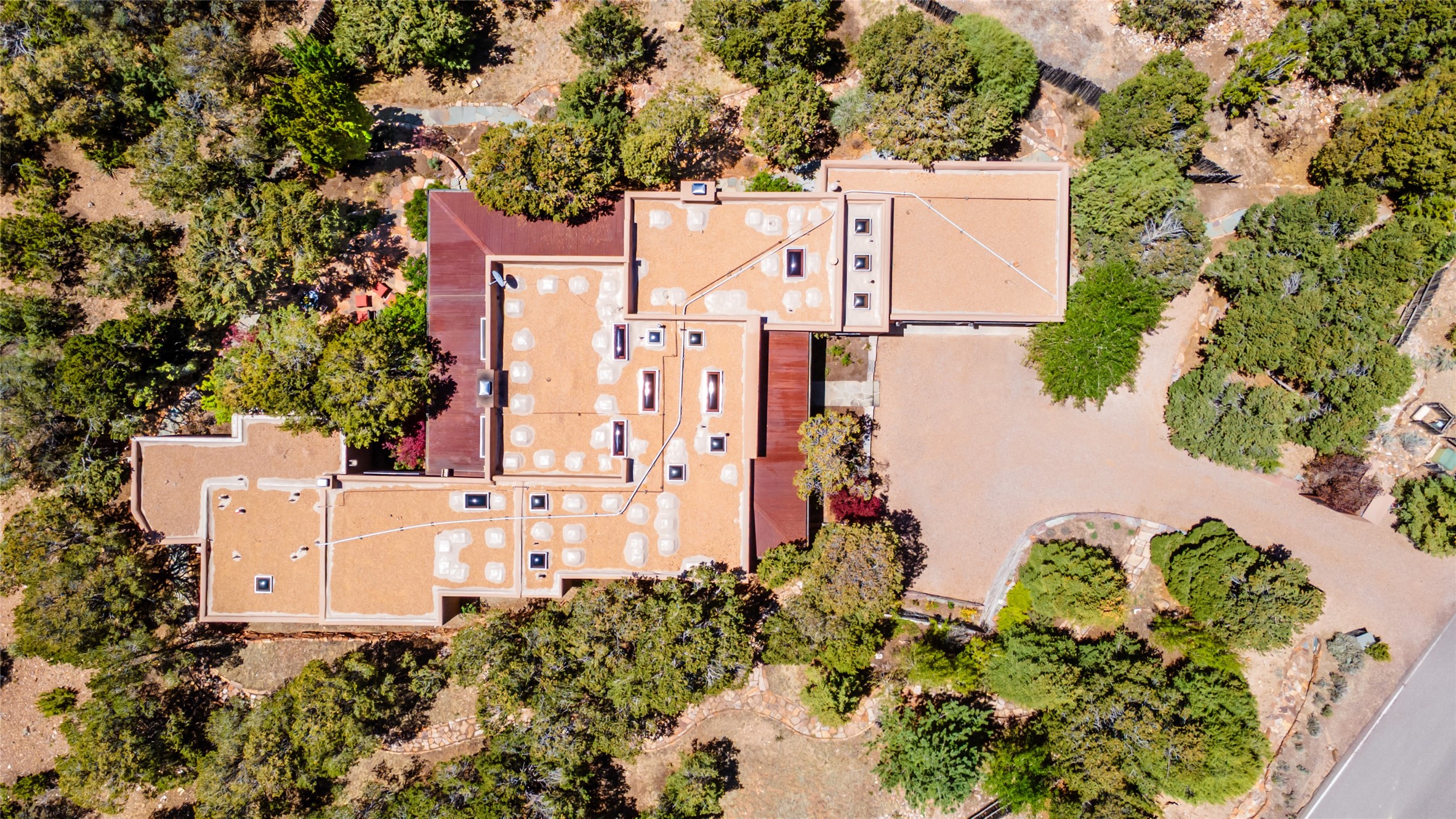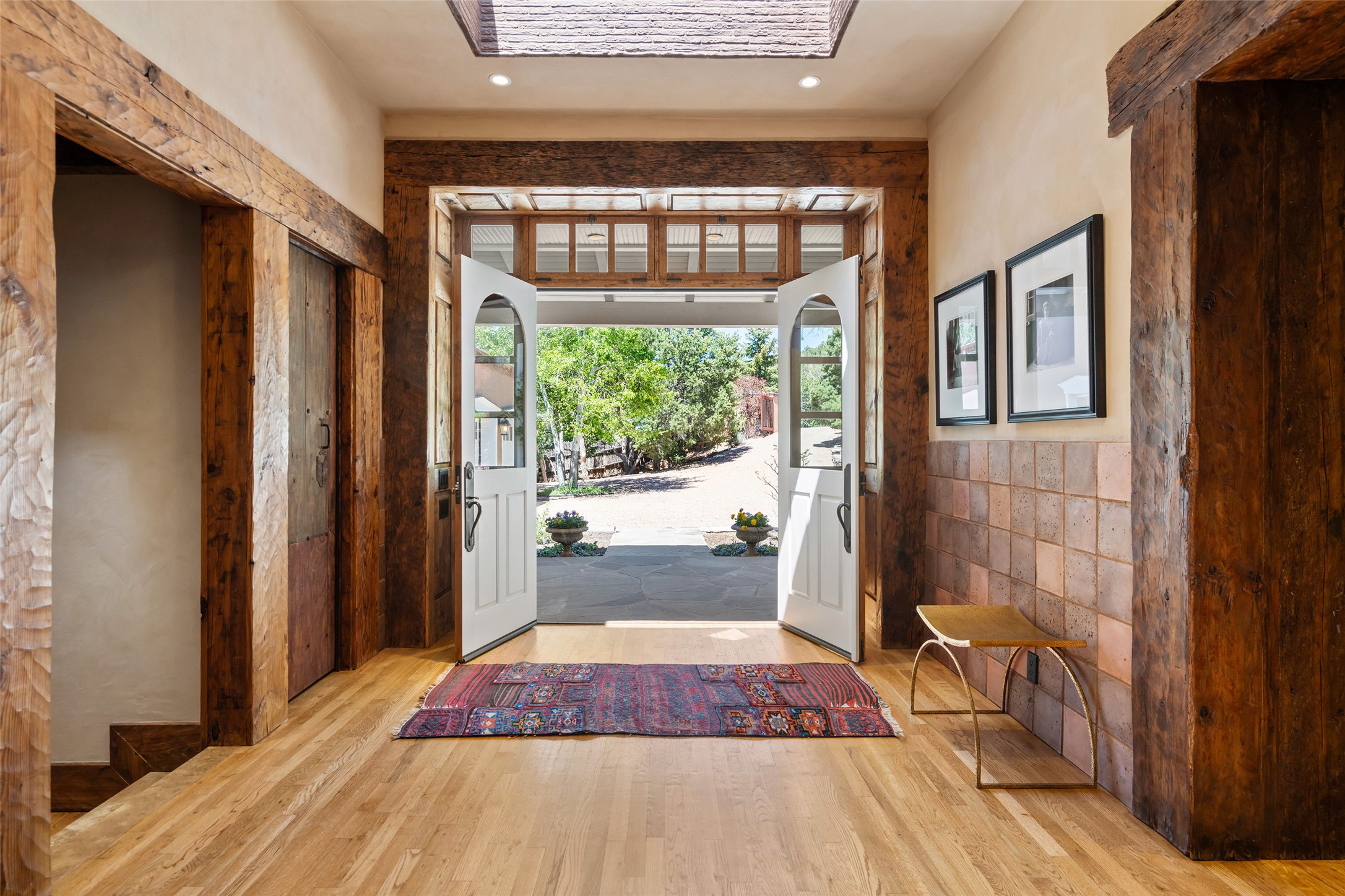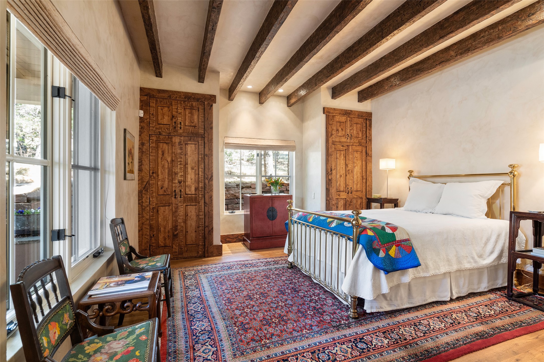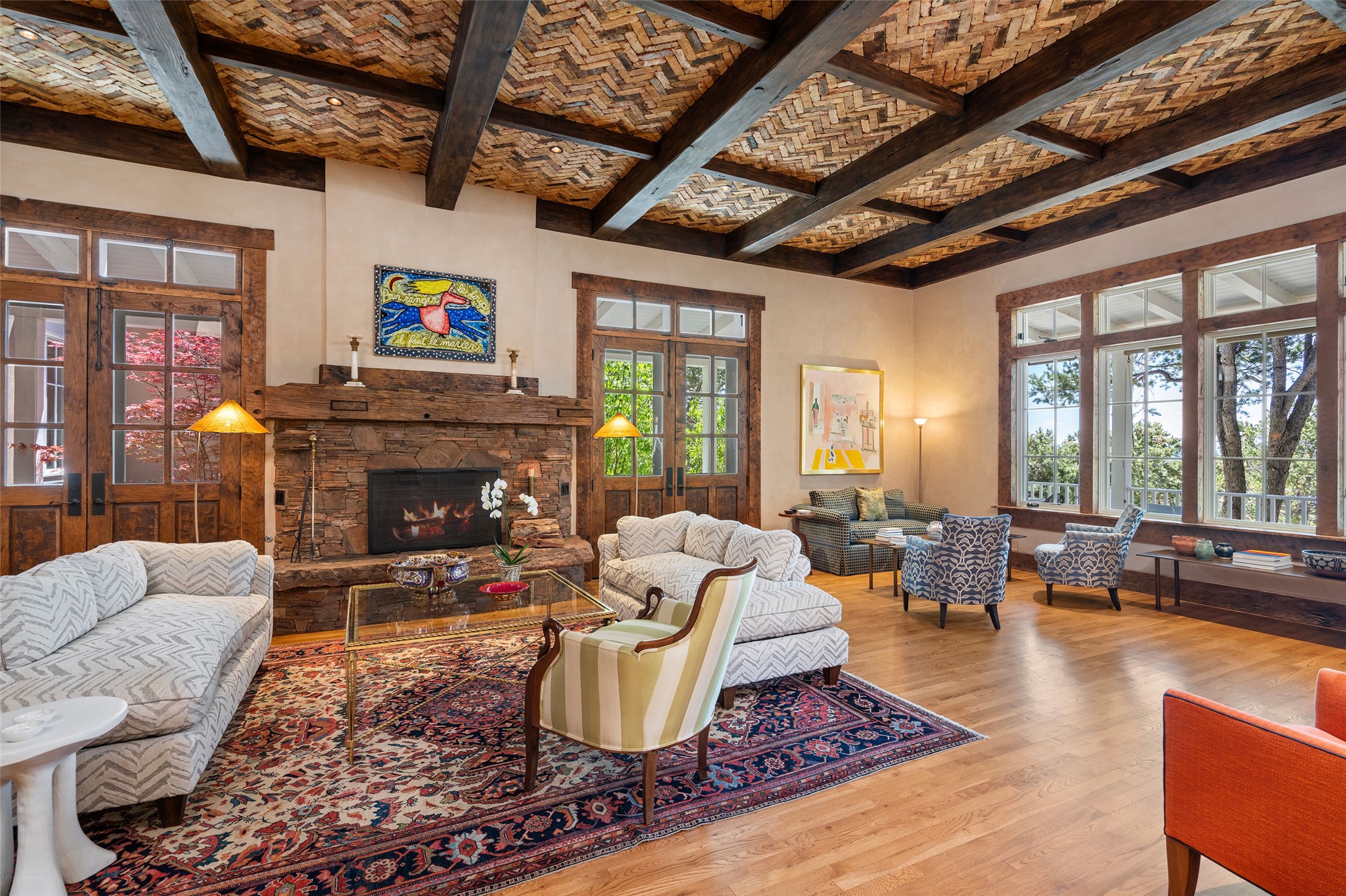 This gated oasis tastefully blends territorial-style with southwestern character reminiscent of old-world Europe. The property offers privacy, elegance, and tranquil views of the Jemez Mountains. The home features a deep wrap-around veranda --perfect for outdoor entertaining or peaceful evenings surrounded by lush, mature gardens and glorious trees. Inside, unique architectural touches abound, including roughhewn wood accents and soaring brick ceilings that add warmth and texture throughout. The elegant living room features a large stone fireplace and is adjoined by the dining room that seamlessly integrates with the gourmet kitchen -- a culinary dream, with a large island, honed stone countertop, top-tier appliances, and a separate butler's pantry with an additional dishwasher and sink. The spacious floor plan includes three bedrooms and four baths. The primary suite is generous, with access to the veranda, a private study, two spacious walk-in closets, and a luxurious bath. The separate guest wing with two gracious guest suites enjoys privacy and ensures welcoming accommodations. An oversized two-car garage completes this stunning property. More than a home, this is a secluded sanctuary that blends timeless design with modern comfort.