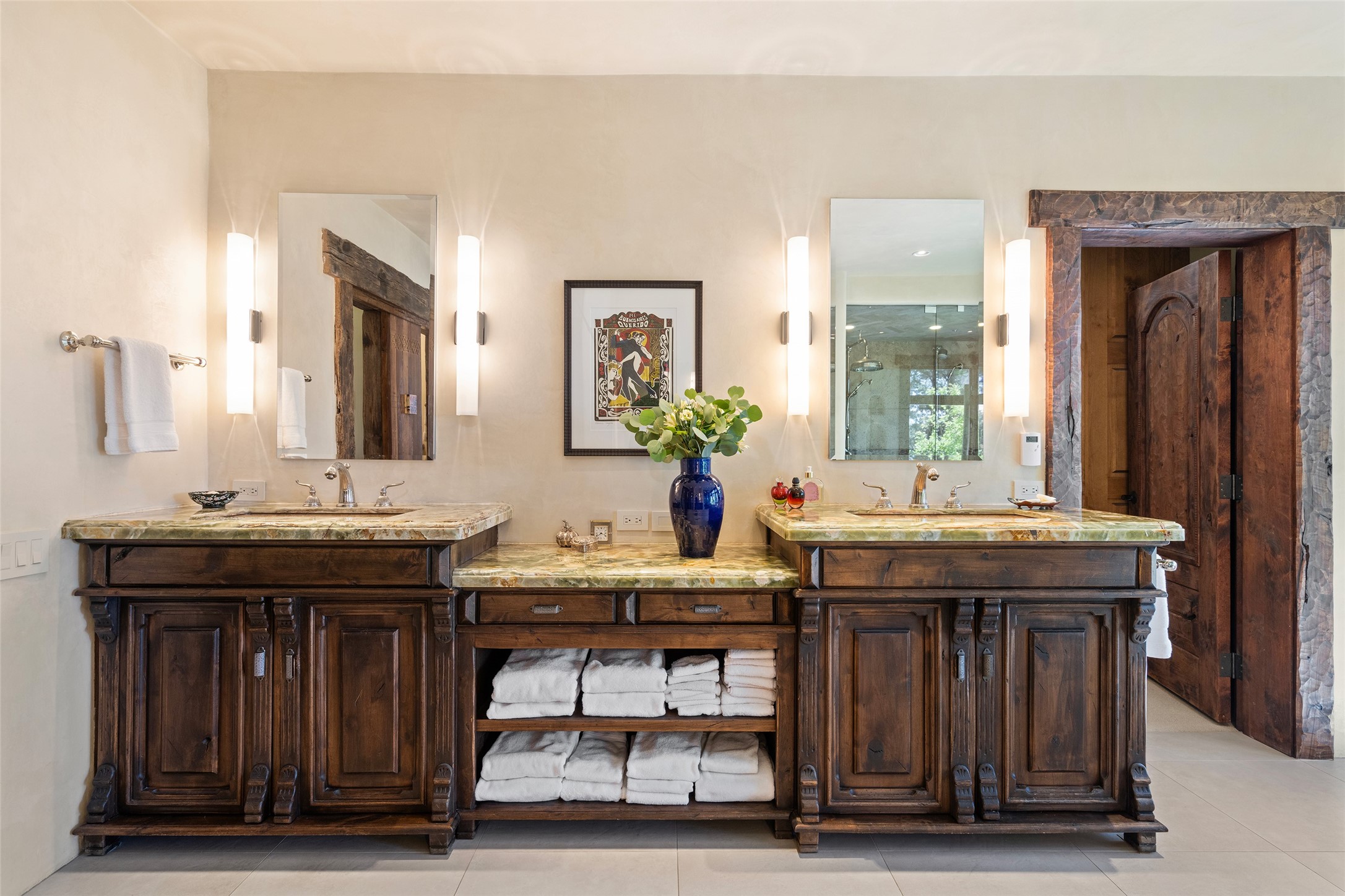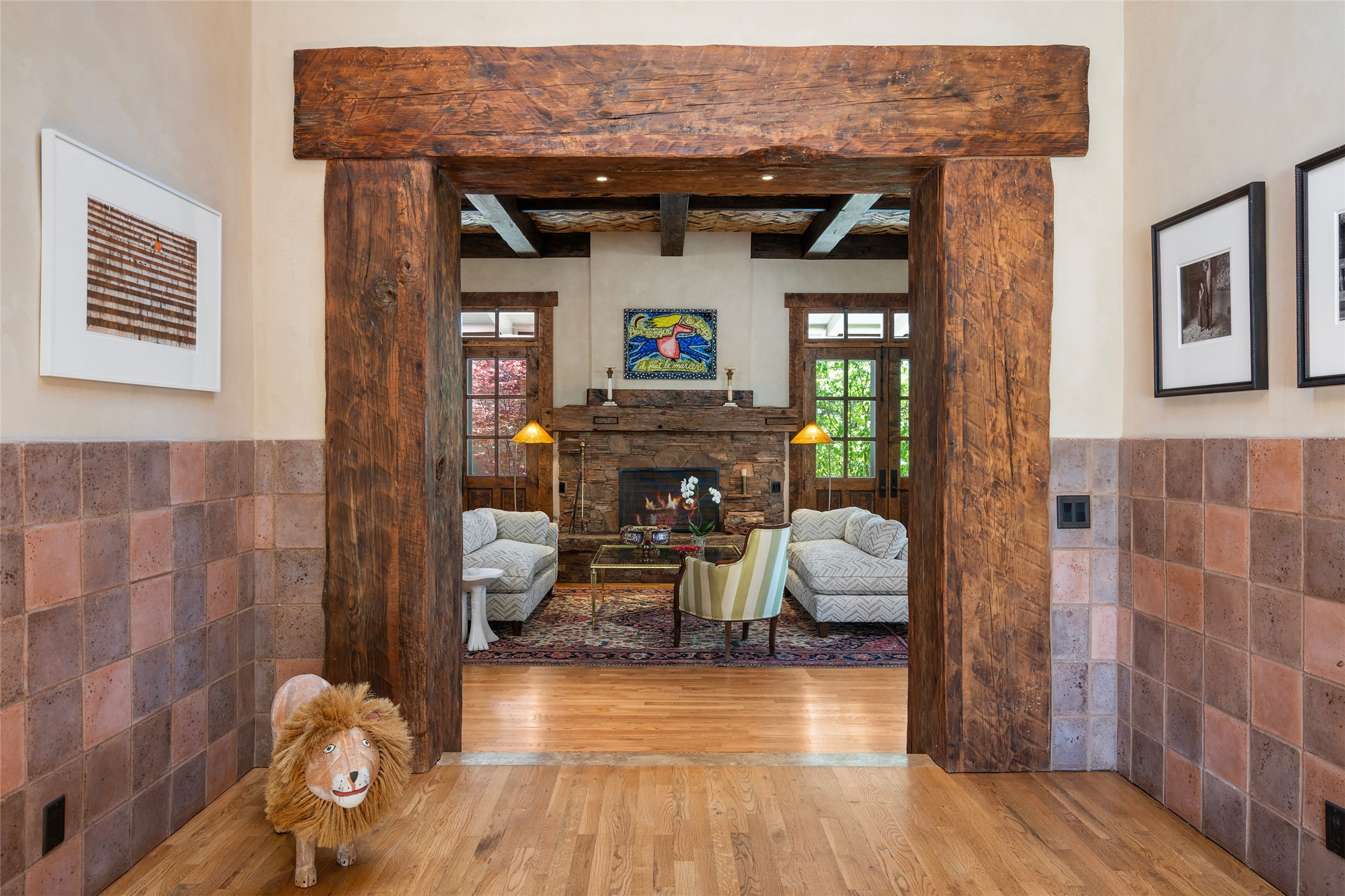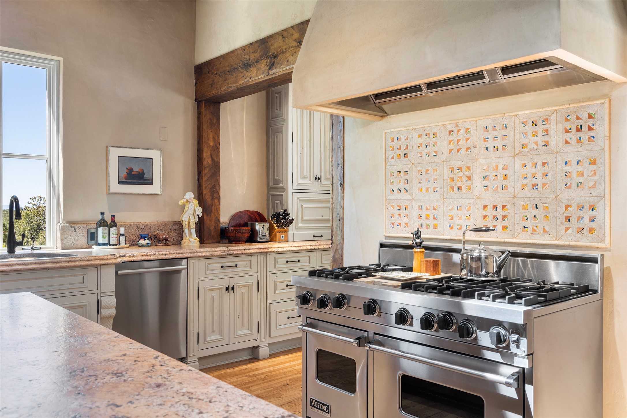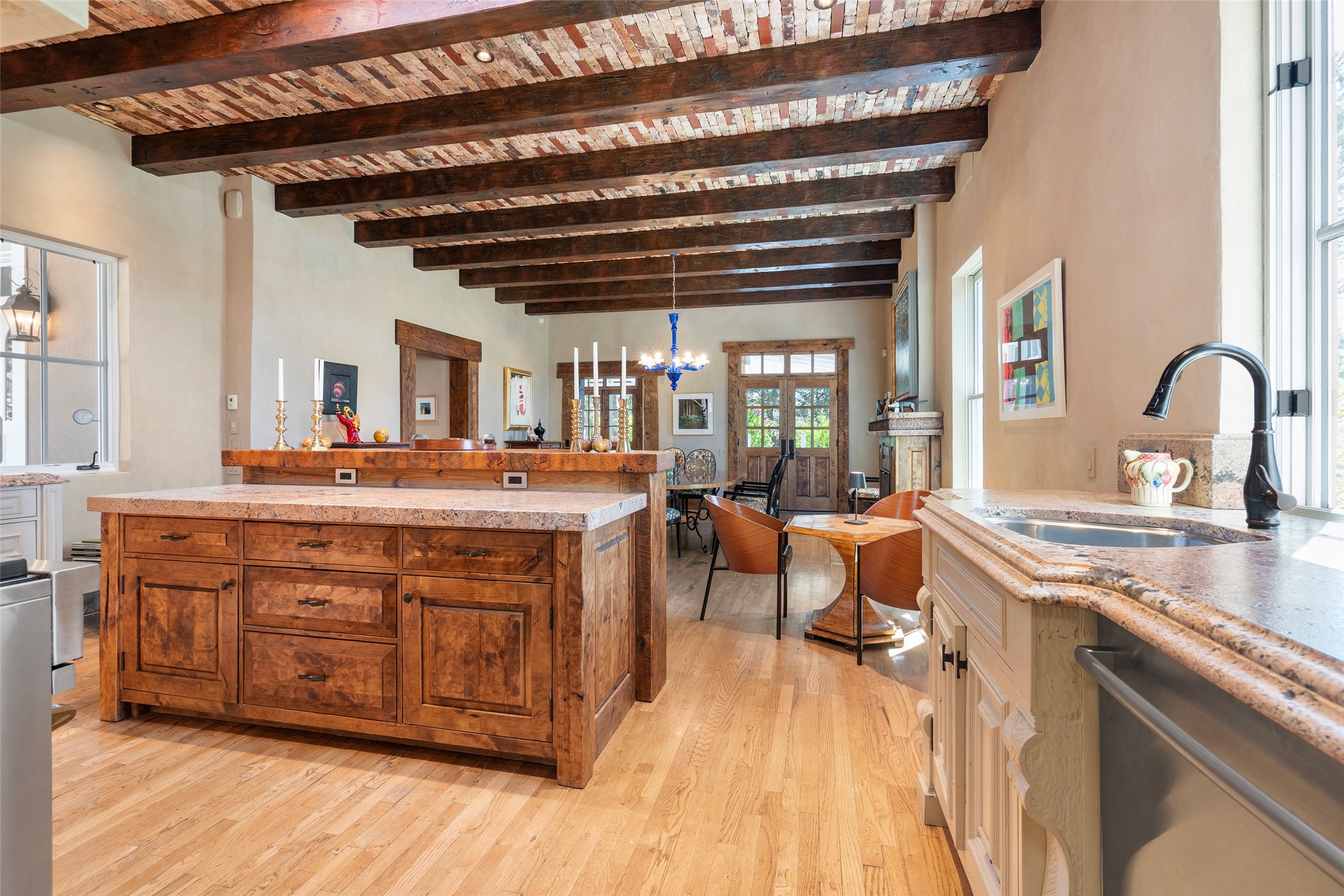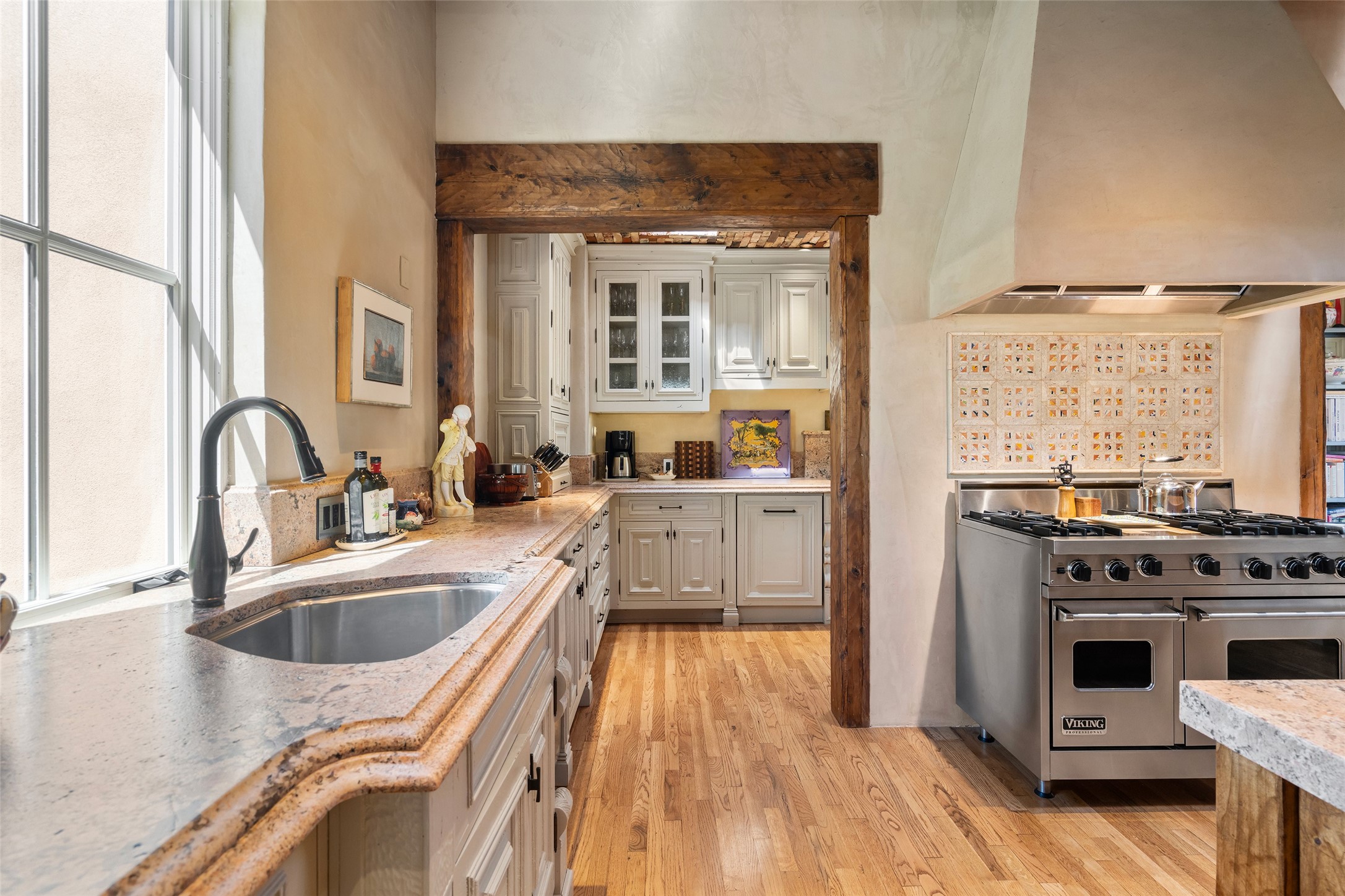 This gated oasis tastefully blends territorial-style with southwestern character reminiscent of old-world Europe. The property offers privacy, elegance, and tranquil views of the Jemez Mountains. The home features a deep wrap-around veranda --perfect for outdoor entertaining or peaceful evenings surrounded by lush, mature gardens and glorious trees. Inside, unique architectural touches abound, including roughhewn wood accents and soaring brick ceilings that add warmth and texture throughout. The elegant living room features a large stone fireplace and is adjoined by the dining room that seamlessly integrates with the gourmet kitchen -- a culinary dream, with a large island, honed stone countertop, top-tier appliances, and a separate butler's pantry with an additional dishwasher and sink. The spacious floor plan includes three bedrooms and four baths. The primary suite is generous, with access to the veranda, a private study, two spacious walk-in closets, and a luxurious bath. The separate guest wing with two gracious guest suites enjoys privacy and ensures welcoming accommodations. An oversized two-car garage completes this stunning property. More than a home, this is a secluded sanctuary that blends timeless design with modern comfort.