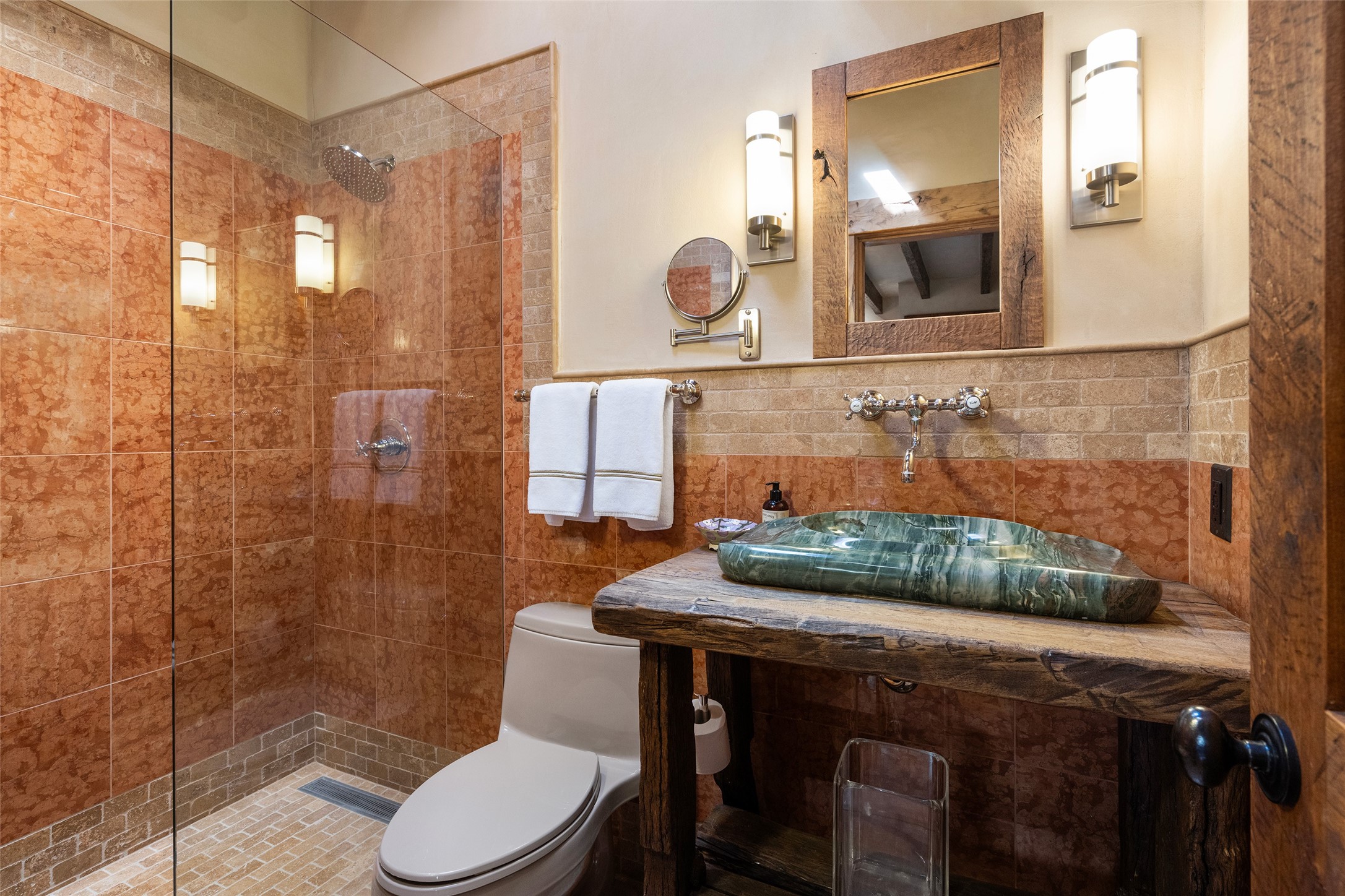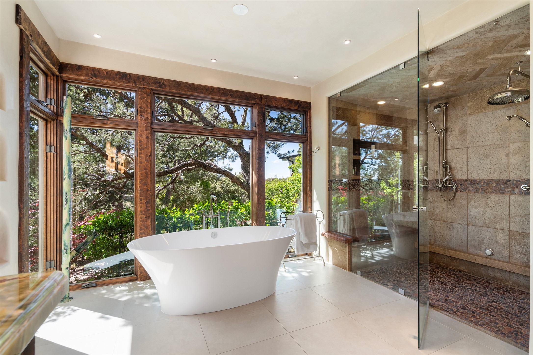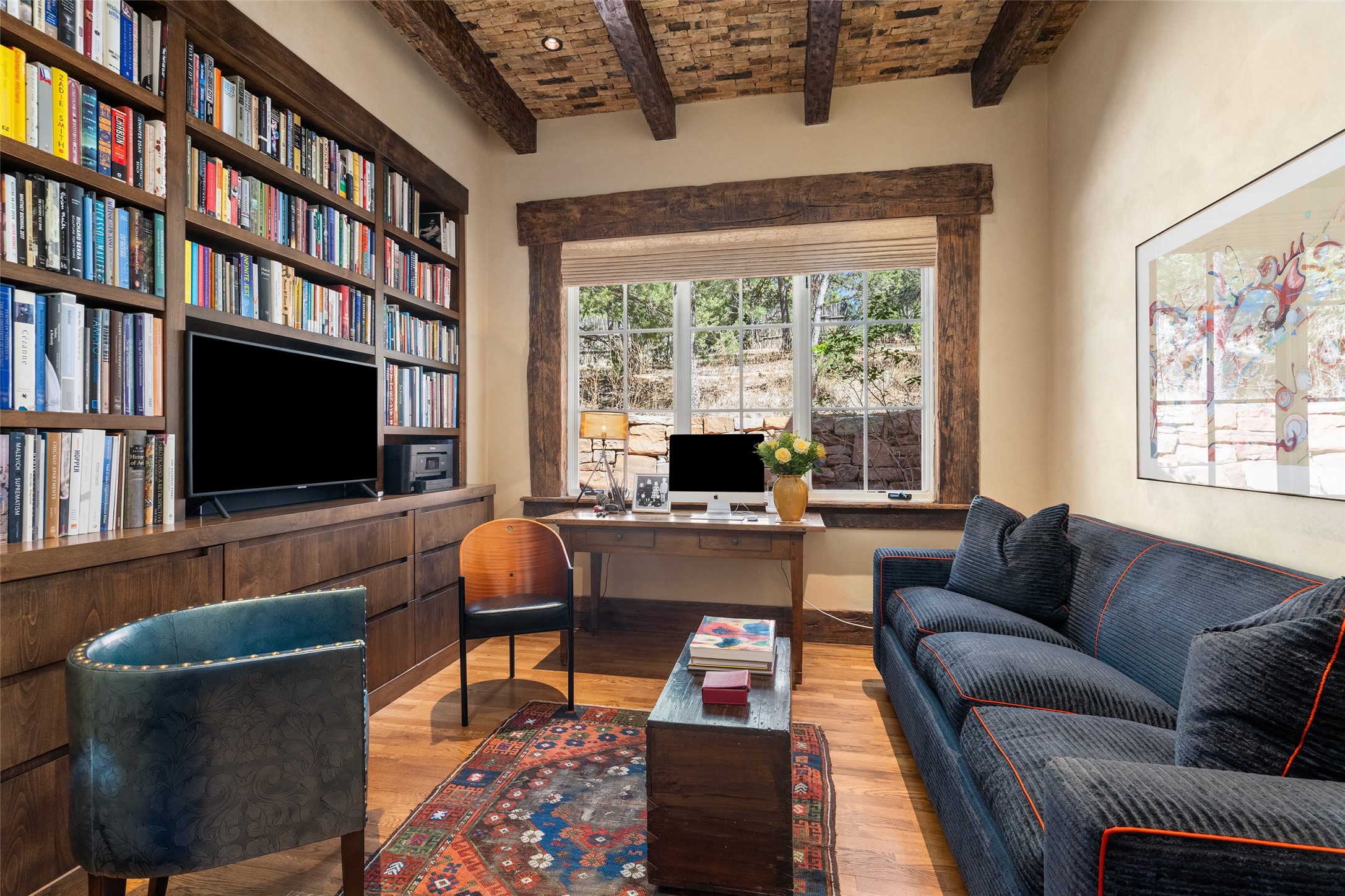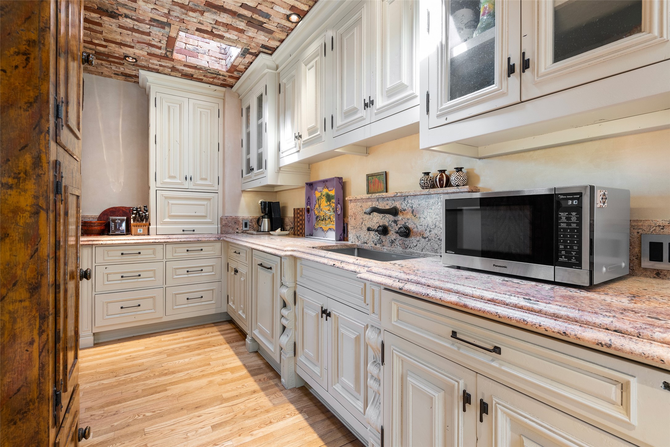 This gated oasis tastefully blends territorial-style with southwestern character reminiscent of old-world Europe. The property offers privacy, elegance, and tranquil views of the Jemez Mountains. The home features a deep wrap-around veranda --perfect for outdoor entertaining or peaceful evenings surrounded by lush, mature gardens and glorious trees. Inside, unique architectural touches abound, including roughhewn wood accents and soaring brick ceilings that add warmth and texture throughout. The elegant living room features a large stone fireplace and is adjoined by the dining room that seamlessly integrates with the gourmet kitchen -- a culinary dream, with a large island, honed stone countertop, top-tier appliances, and a separate butler's pantry with an additional dishwasher and sink. The spacious floor plan includes three bedrooms and four baths. The primary suite is generous, with access to the veranda, a private study, two spacious walk-in closets, and a luxurious bath. The separate guest wing with two gracious guest suites enjoys privacy and ensures welcoming accommodations. An oversized two-car garage completes this stunning property. More than a home, this is a secluded sanctuary that blends timeless design with modern comfort.