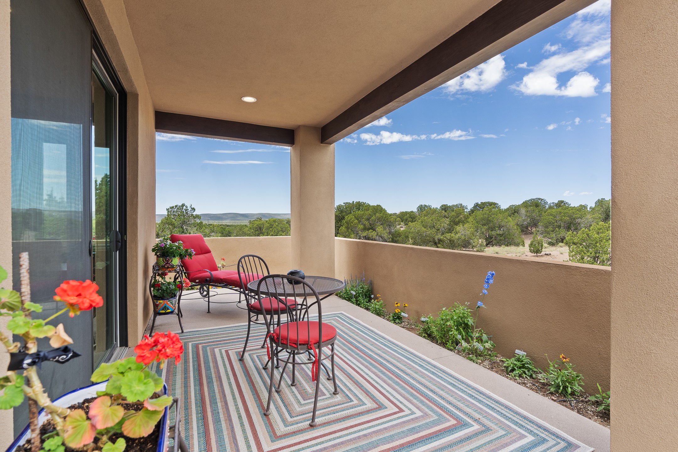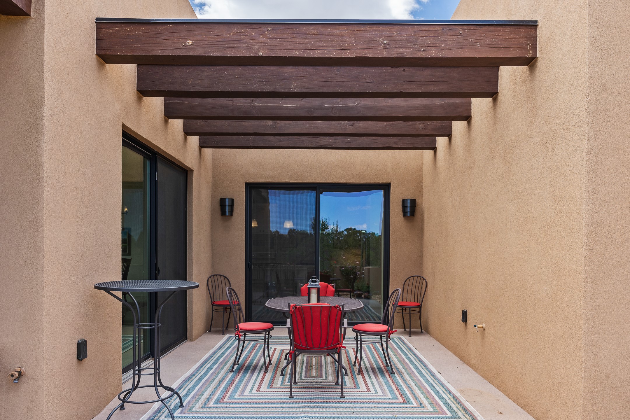 This recently constructed, open concept design residence elegantly combines Pueblo Revival and Contemporary architectural styles. It features three outdoor living areas, including a sheltered courtyard perfect for al fresco dining, and a spacious covered portal, making it an inviting space to enjoy the serene water features, meticulously landscaped gardens with flowers galore, and breathtaking sunset vistas. The gourmet kitchen is equipped with exquisite solid wood cabinetry, stainless-steel Viking appliances, quartz countertops, and a walk-in pantry, seamlessly connecting to the dining and gathering areas. The gathering space boasts a substantial gas fireplace adorned with custom stonework. This Energy efficient Home has Solar panels that cover household electricity plus 2 electric vehicles! The primary suite includes a private portal and a generously sized bathroom featuring a curbless walk-in shower, a soaking tub, dual sinks, and a large walk-in closet with convenient access to the laundry room. A shared bathroom serves the two additional bedrooms, one of which is ideally suited for a home office. The homeowners' association fees cover road and common area maintenance, 24-hour roaming security, and on-site emergency medical technicians. Membership to The Club at Las Campanas is optional, offering amenities such as indoor and outdoor swimming pools, tennis courts, a fitness center, equestrian facilities, fine dining options, and two Jack Nicklaus Signature Golf Courses.