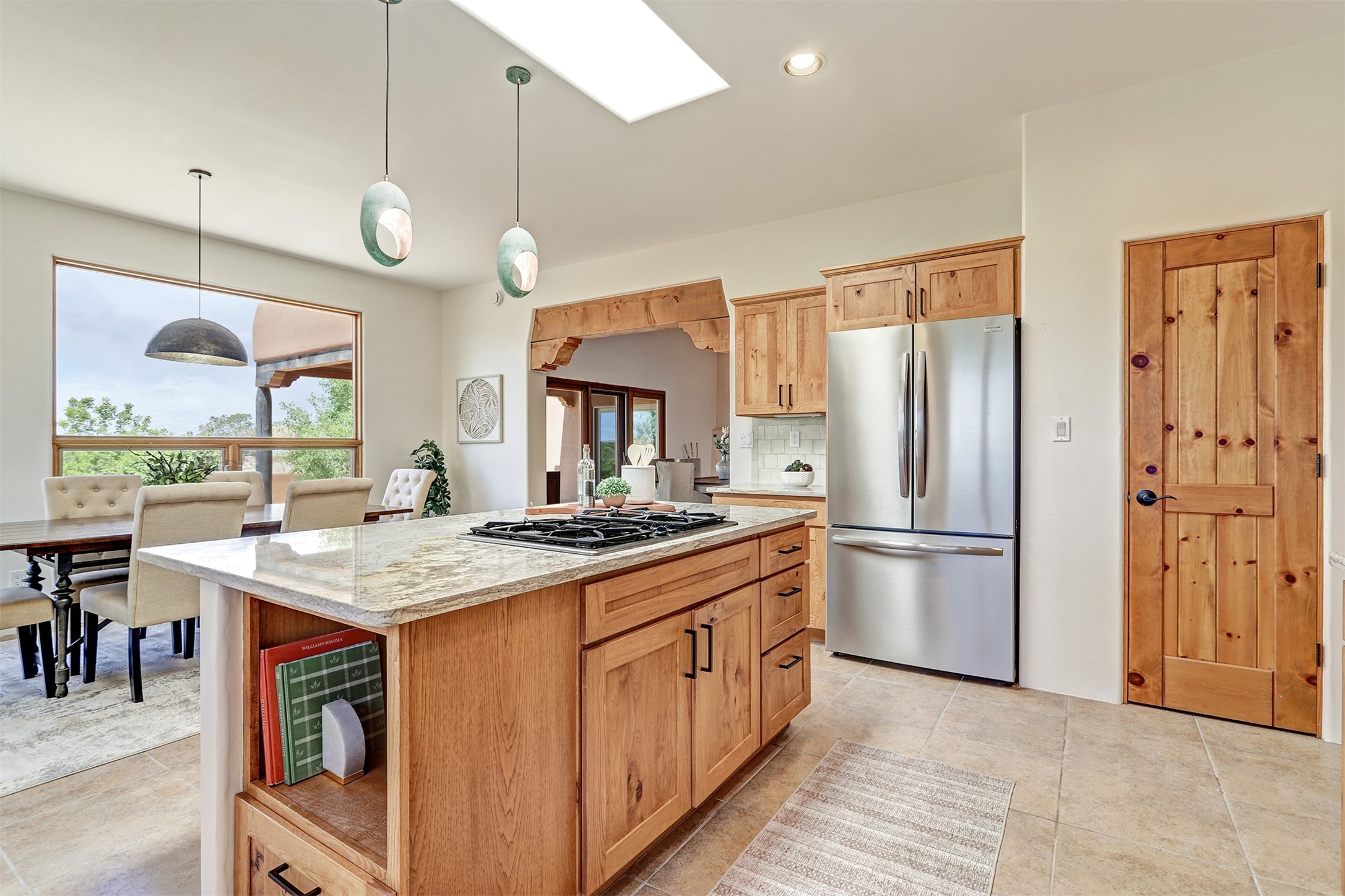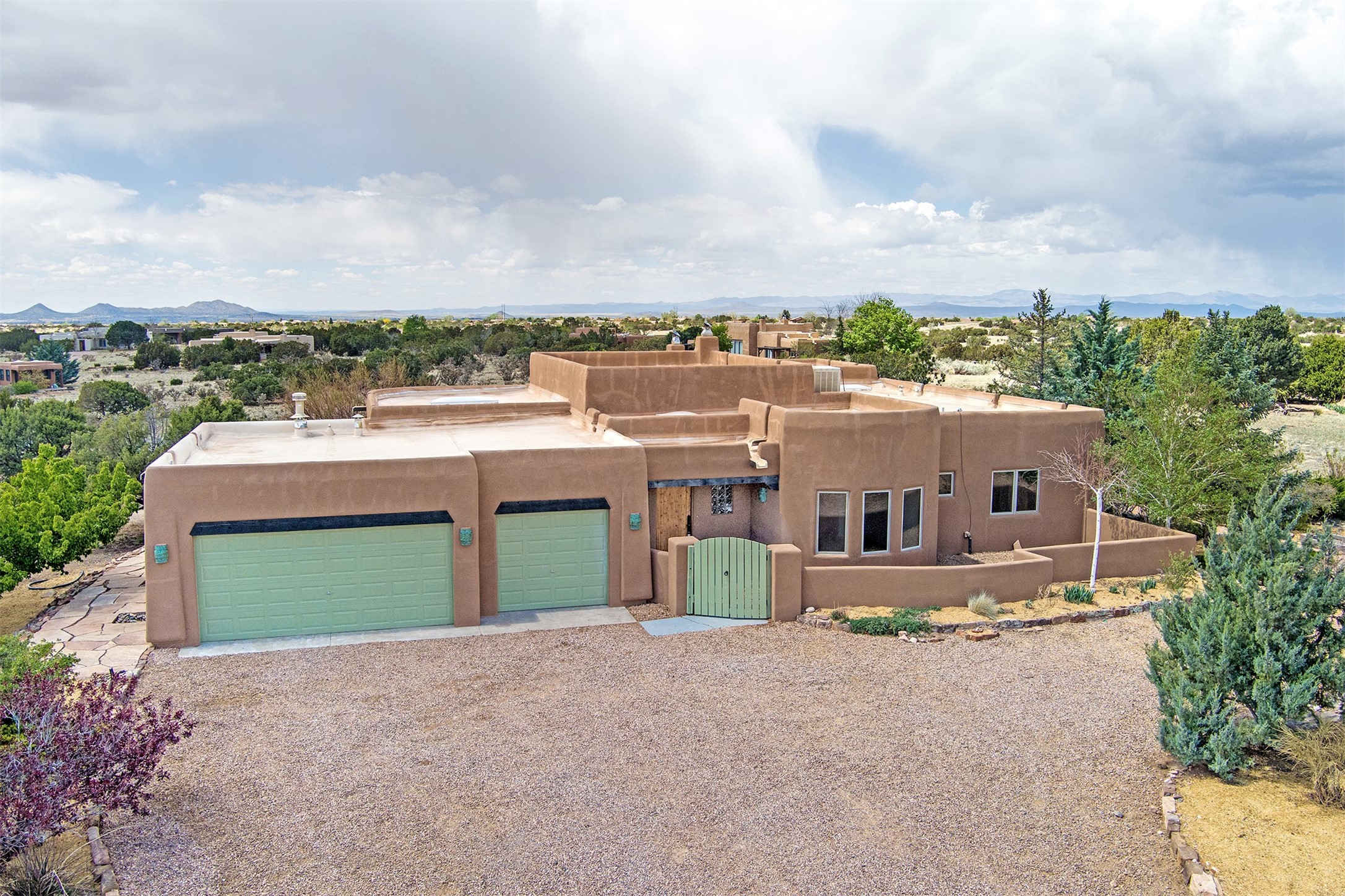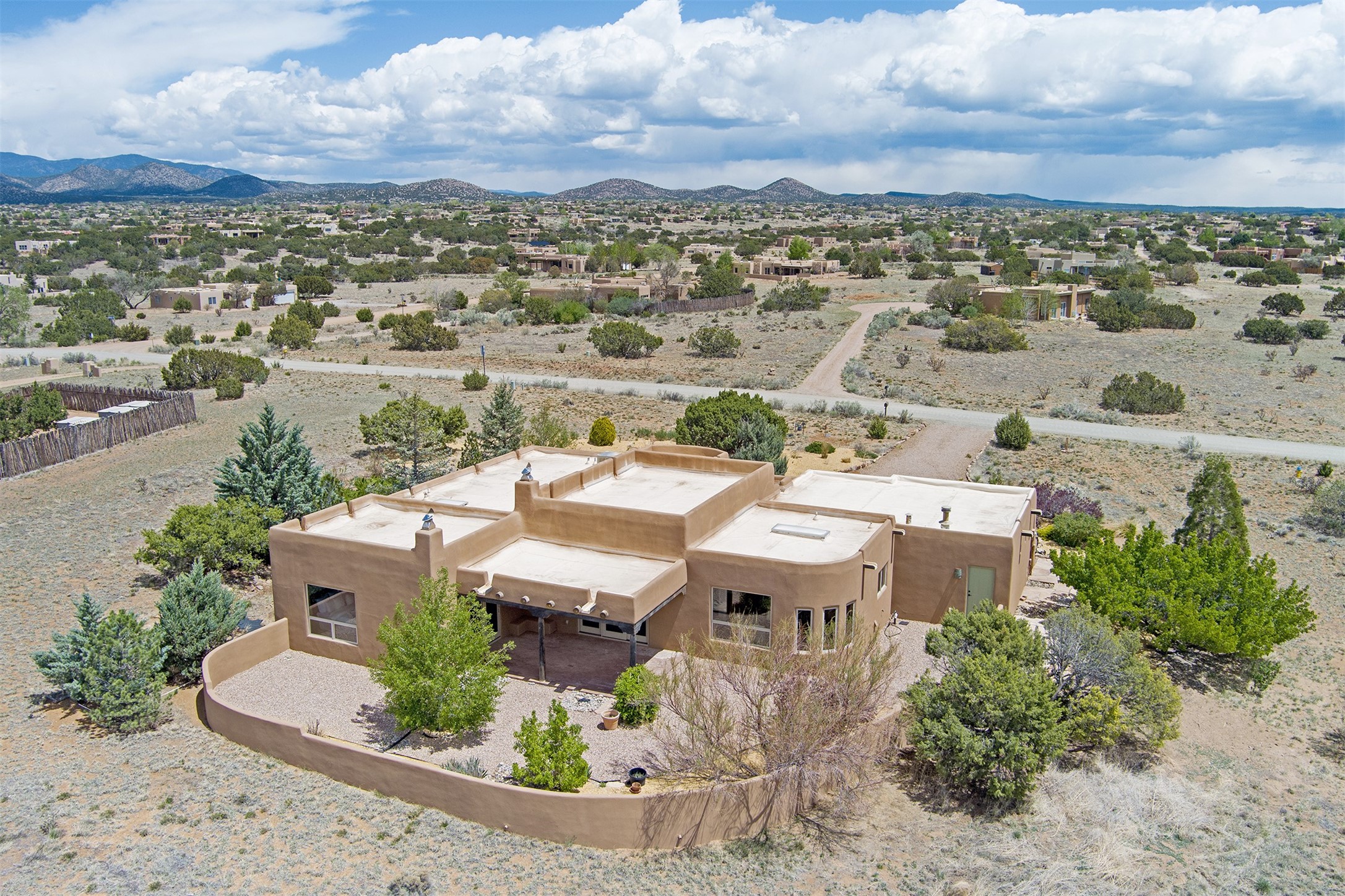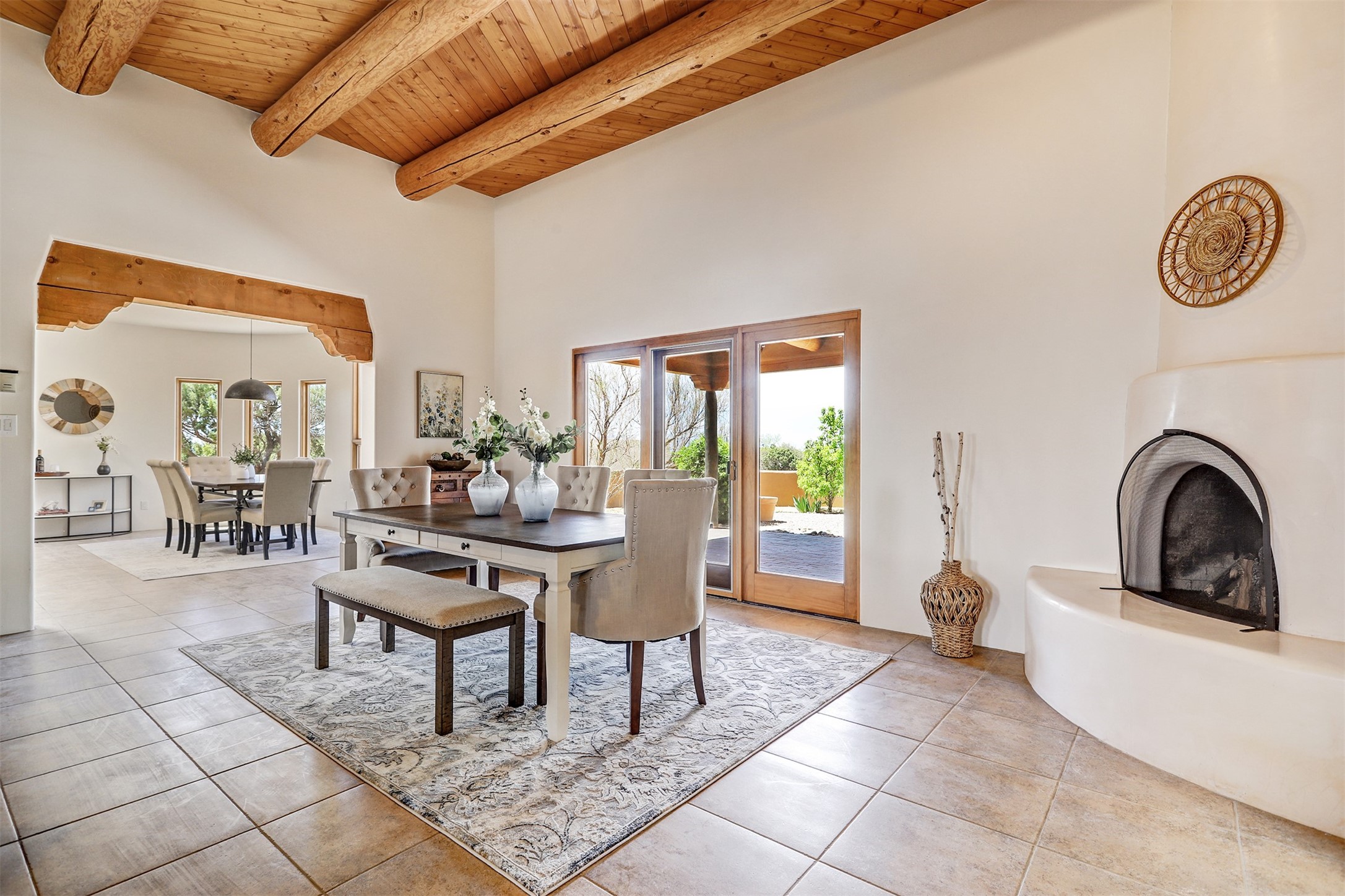 Welcome to this extraordinary residence in the highly desirable Eldorado, where Southwestern elegance meets modern comfort. Upon entering, you're greeted by soaring vaulted ceilings, exquisite tongue-and-groove woodwork, and beautiful vigas, setting the stage for this home's timeless design. The spacious living area, anchored by a traditional kiva fireplace, flows seamlessly into a chef-inspired kitchen. Featuring custom handmade tile backsplash, granite countertops, elegantly designed cabinetry, and brand-new stainless steel appliances, this kitchen is perfect for both everyday living and entertaining. The primary suite is a true retreat, offering a kiva fireplace, a luxurious ensuite, and extraordinary views of the surrounding mountains, providing the perfect sanctuary. Step outside to the private outdoor portal, adorned with tongue-and-groove ceilings and vigas, offering a peaceful setting for relaxation or entertaining. The front and back of the home boast breathtaking mountain views, adding an ever-changing, picturesque backdrop to daily life. This meticulously crafted home has been thoughtfully upgraded to offer a seamless blend of style and functionality. Located in the coveted Eldorado community, this home offers an ideal combination of privacy and convenience. Eldorado is known for its expansive open spaces, dark night skies, and a vibrant, close-knit community. Enjoy miles of walking, biking, and equestrian trails, along with a community center that features a pool, tennis and pickleball courts, and dog parks. Only a short drive to downtown Santa Fe, you'll have access to the city's galleries, fine dining, and cultural events, offering the best of both worlds. This extraordinary home presents a rare opportunity to live in a serene, natural environment while remaining close to the rich culture and amenities of Santa Fe. Schedule your private showing today to experience this exceptional property in person.