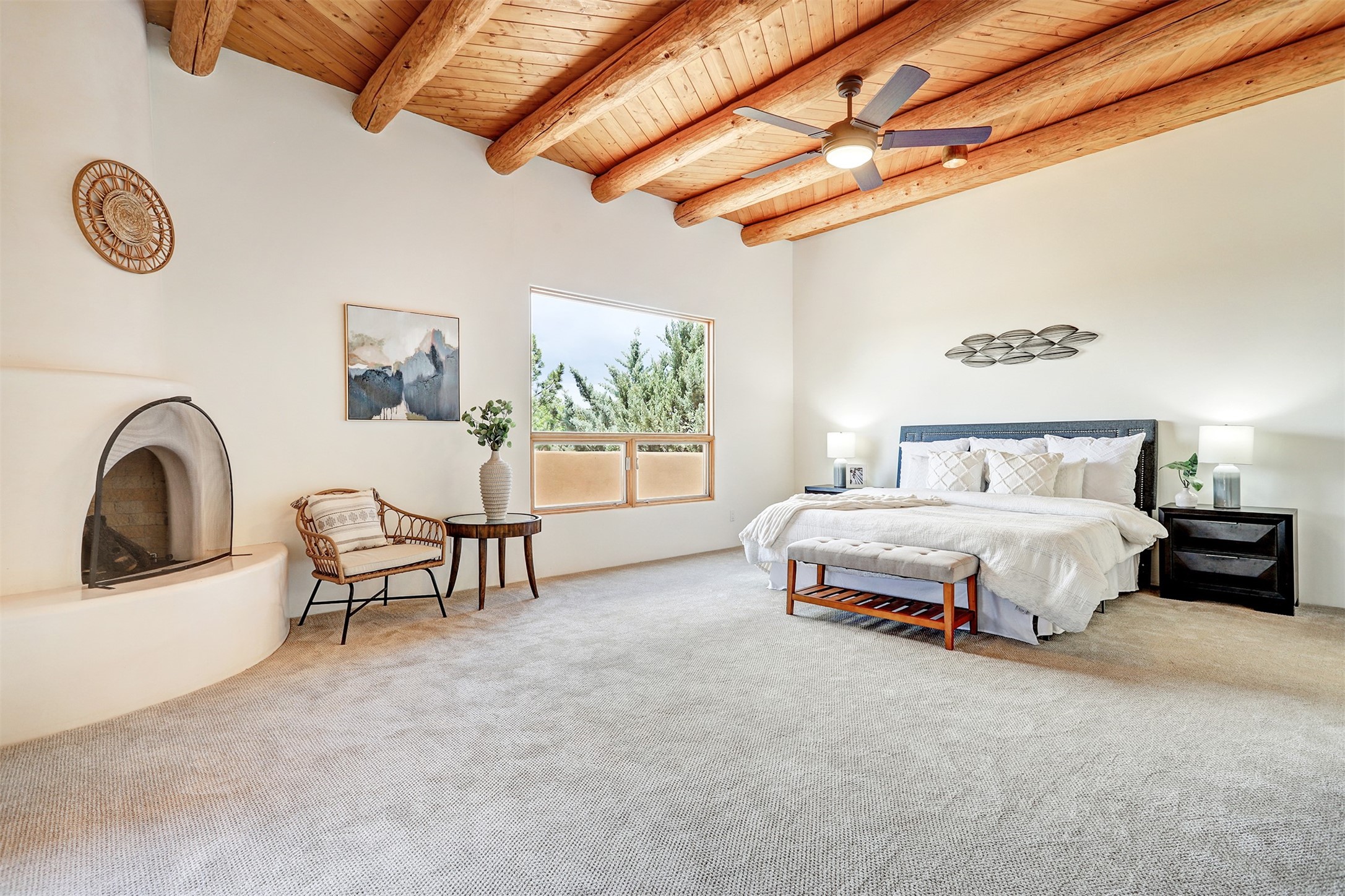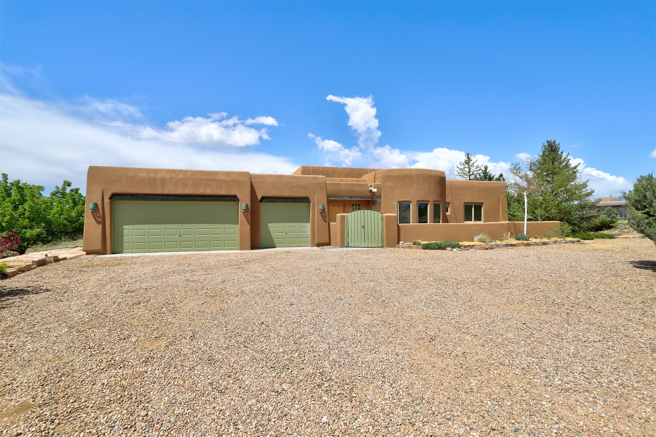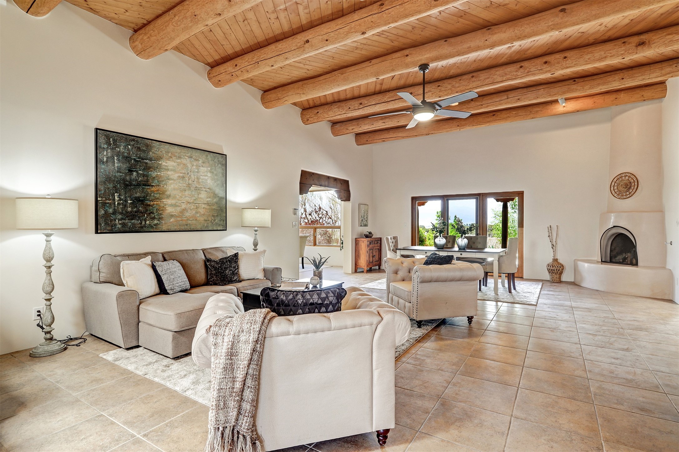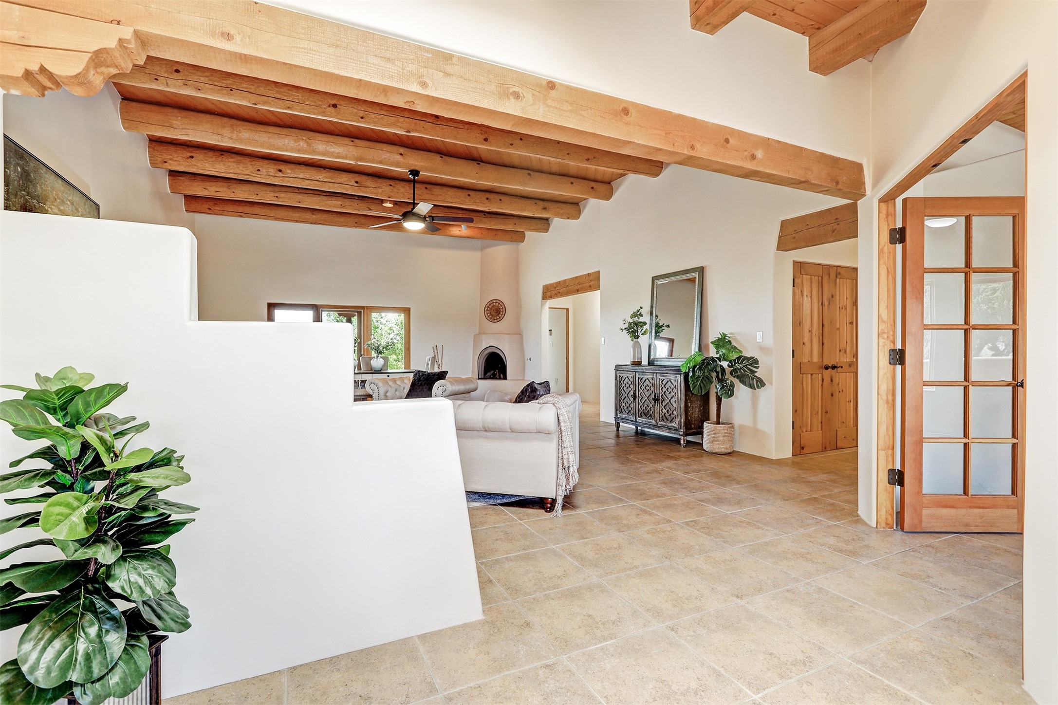 Welcome to this extraordinary residence in the highly desirable Eldorado, where Southwestern elegance meets modern comfort. Upon entering, you're greeted by soaring vaulted ceilings, exquisite tongue-and-groove woodwork, and beautiful vigas, setting the stage for this home's timeless design. The spacious living area, anchored by a traditional kiva fireplace, flows seamlessly into a chef-inspired kitchen. Featuring custom handmade tile backsplash, granite countertops, elegantly designed cabinetry, and brand-new stainless steel appliances, this kitchen is perfect for both everyday living and entertaining. The primary suite is a true retreat, offering a kiva fireplace, a luxurious ensuite, and extraordinary views of the surrounding mountains, providing the perfect sanctuary. Step outside to the private outdoor portal, adorned with tongue-and-groove ceilings and vigas, offering a peaceful setting for relaxation or entertaining. The front and back of the home boast breathtaking mountain views, adding an ever-changing, picturesque backdrop to daily life. This meticulously crafted home has been thoughtfully upgraded to offer a seamless blend of style and functionality. Located in the coveted Eldorado community, this home offers an ideal combination of privacy and convenience. Eldorado is known for its expansive open spaces, dark night skies, and a vibrant, close-knit community. Enjoy miles of walking, biking, and equestrian trails, along with a community center that features a pool, tennis and pickleball courts, and dog parks. Only a short drive to downtown Santa Fe, you'll have access to the city's galleries, fine dining, and cultural events, offering the best of both worlds. This extraordinary home presents a rare opportunity to live in a serene, natural environment while remaining close to the rich culture and amenities of Santa Fe. Schedule your private showing today to experience this exceptional property in person.