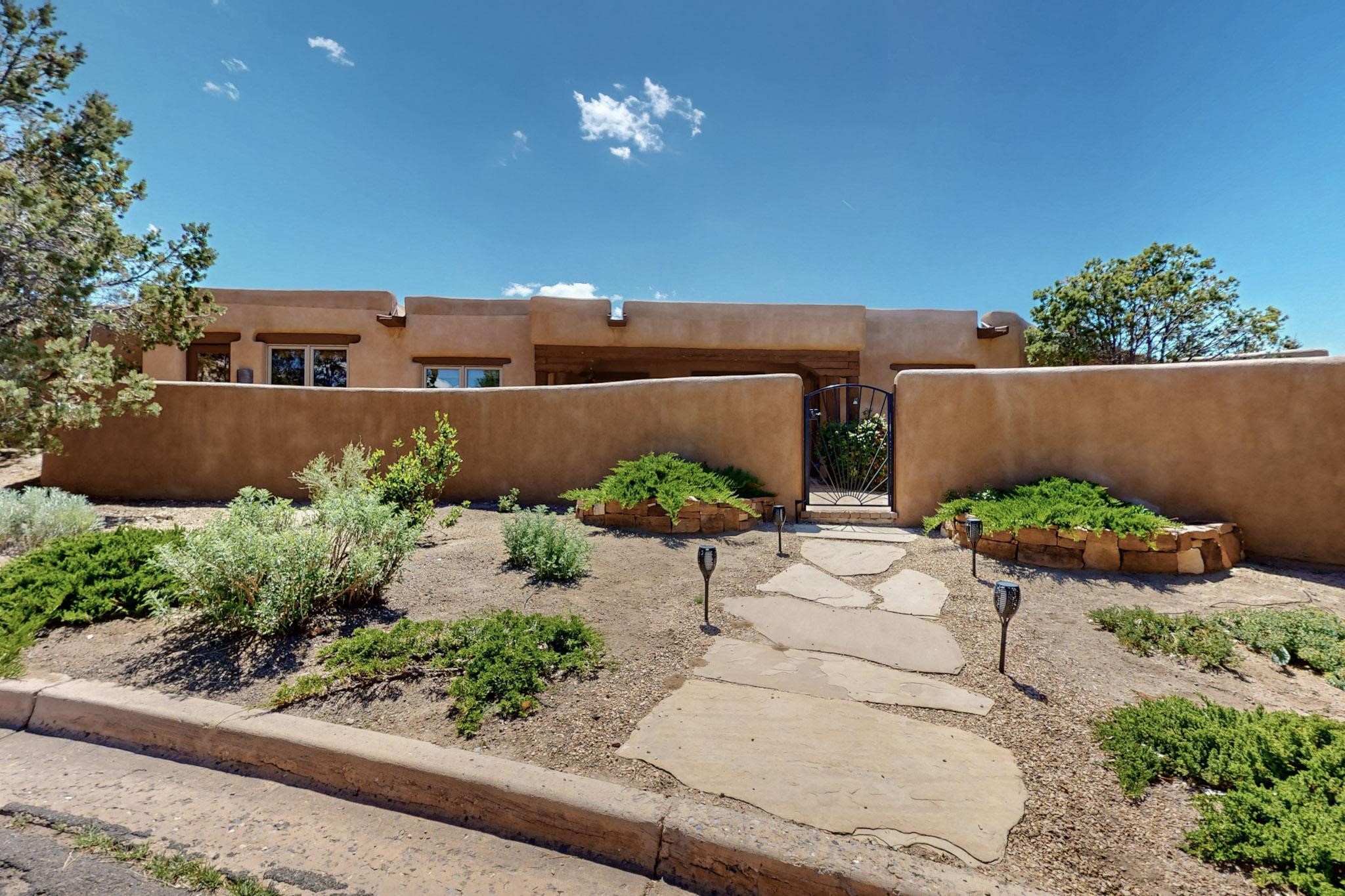 This exceptional Adobe home, a testament to the artistry of Jim Hays, offers a rare blend of exquisite design and superior construction. Upon entering, you'll immediately appreciate the distinguished details that define a Hays-built residence, including graceful curved hard plaster walls, authentic Saltillo tile flooring, thoughtfully placed nichos, hand-carved corbels, substantial beams, and the inviting warmth of traditional Kiva fireplaces.The home's comfortable single-level floor plan is thoughtfully designed for ease of living. Envision starting your day in the delightful breakfast nook, a perfect spot to savor your morning coffee while taking in the views of the majestic Sangre de Cristo Mountains. Adjacent, the separate dining room provides an elegant space for more formal gatherings. A versatile Office/Library further enhances the home's casual yet refined ambiance, offering a quiet retreat for work or relaxation. The open and welcoming layout flows seamlessly into a generously sized living room, which in turn opens onto a lovely rear portal. Here, you can unwind amidst beautiful native landscaping and enjoy the convenience of an astroturf lawn that maintains its appeal year-round. Located within the highly sought-after Estancia Primera community, residents benefit from access to fantastic amenities, including a refreshing summertime pool, tennis courts, and a comfortable clubhouse for social gatherings. The convenience of this location is truly unparalleled, with the historic Santa Fe Plaza just a short drive away, offering a wealth of cultural attractions, dining, and shopping. Additionally, the renowned 10,000 Waves Japanese Bathhouse is within easy reach for a tranquil escape. For those who enjoy the outdoors, a nearby hiking trail provides a scenic route to downtown, allowing you to immerse yourself in the natural beauty of the area. NOTE: there are seven steps leading from the garage to the main living level.