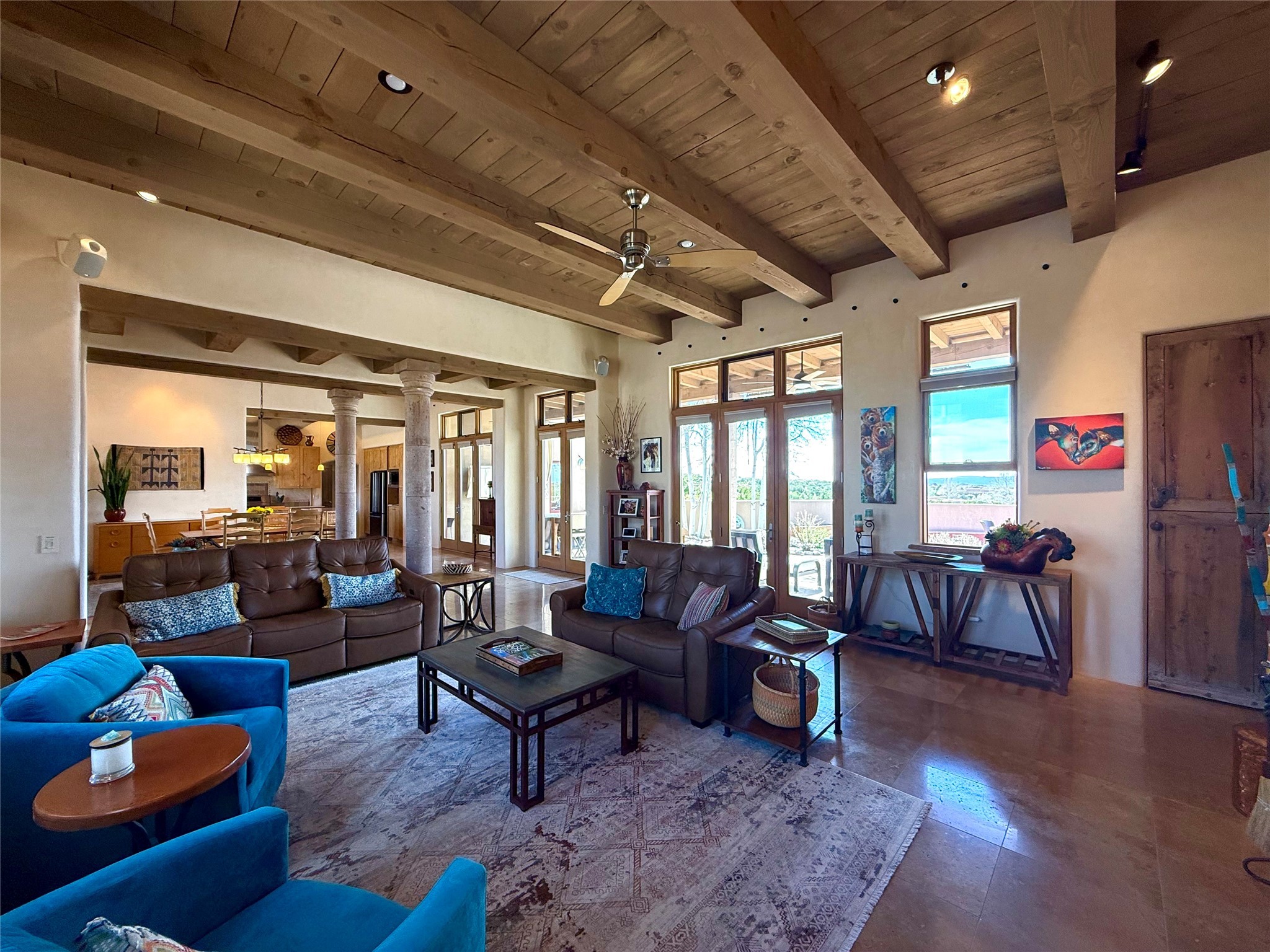 Along a private, quiet road in desirable NW Santa Fe, only minutes from downtown, don't miss the huge entertaining spaces with drop dead gorgeous 180 degree sunset views! Home features a well equipped, open kitchen with plenty of space. Gorgeous custom travertine tilework, an awesome built-in sound system, and extensive landscaping. Design offers privacy in the bedroom areas and togetherness in the large open family spaces. Spacious Master Suite with kiva fireplace, large walk-in closet, private portal,and a fabulous spa bath. Tall french doors across the back of the home bring the outdoors in. Backyard features a walled rear courtyard, built-in outdoor seating, and incredible landscaping. Built in 2006 and sited on 2.5 acres adjoining the extensive trail system of NW Santa Fe, this home is the perfect place to get away and enjoy world famous Santa Fe sunsets!