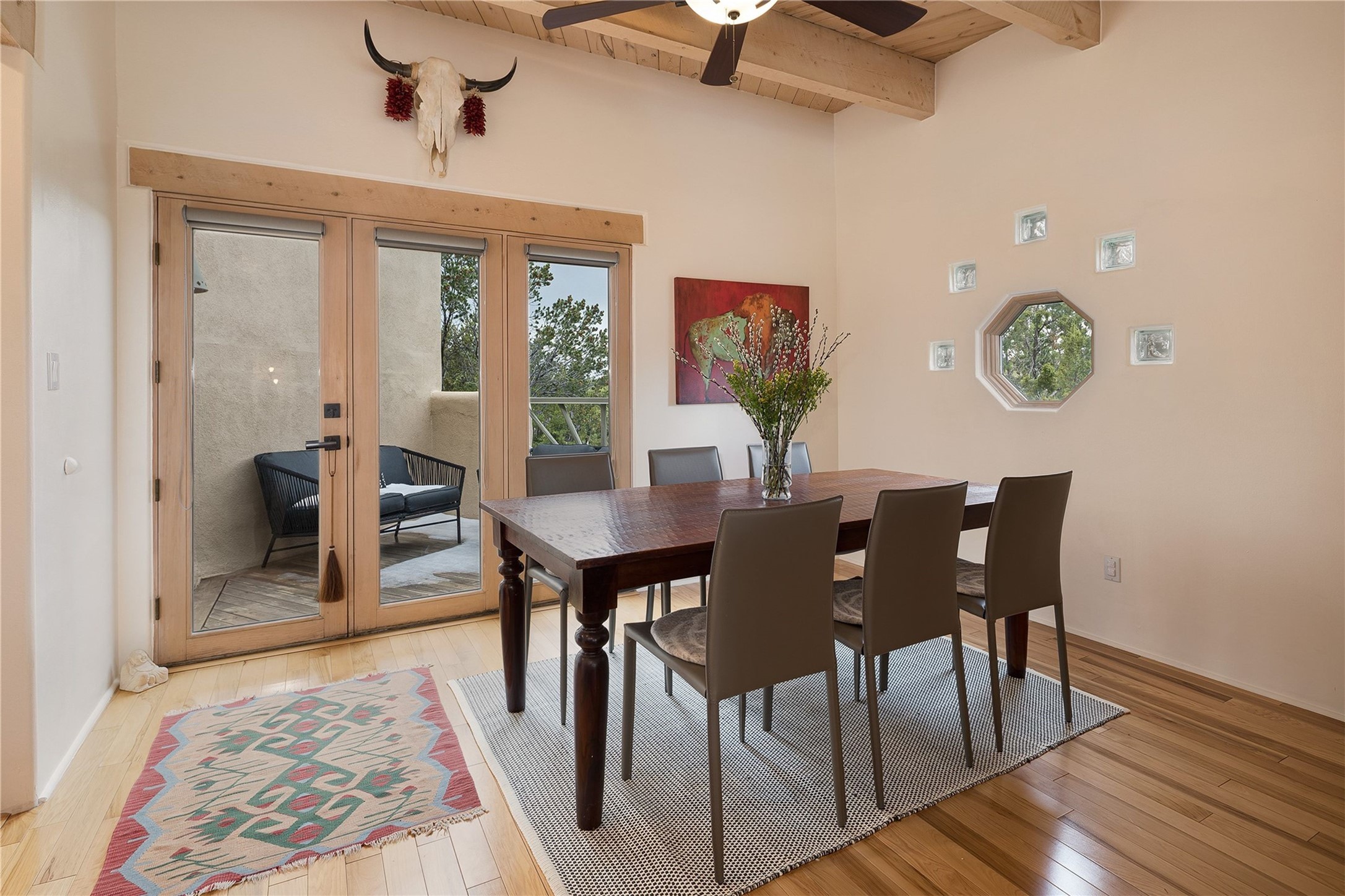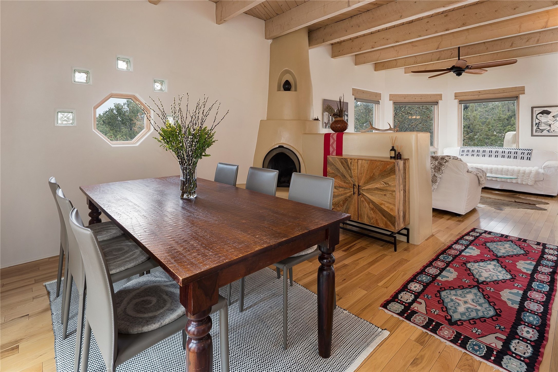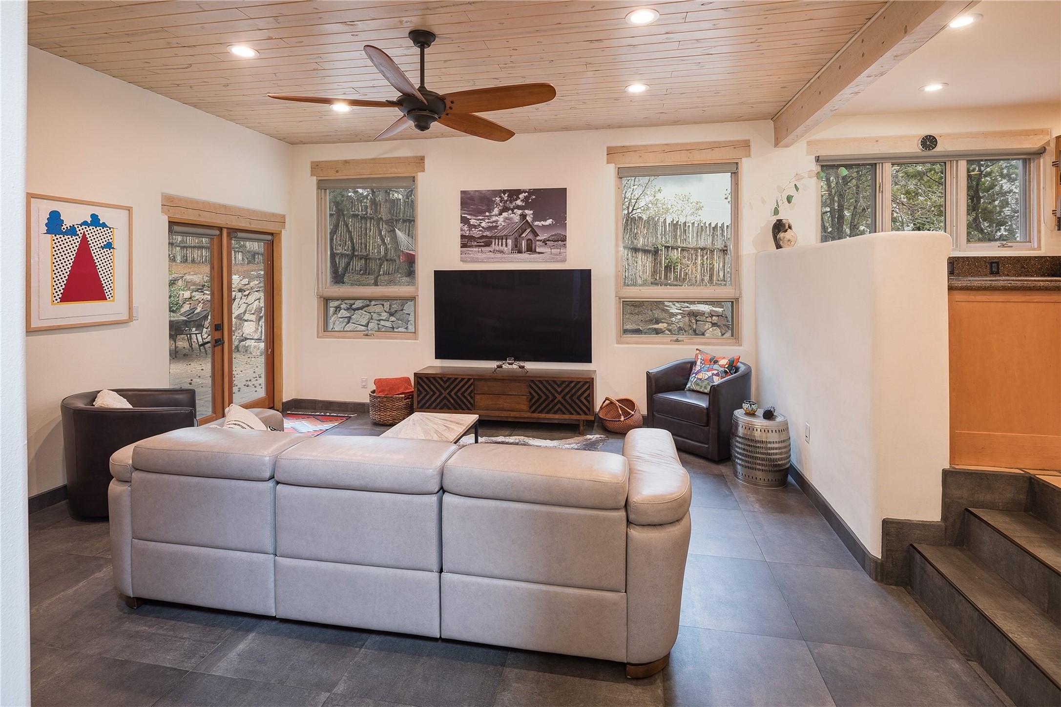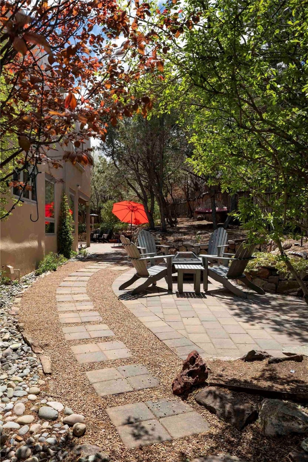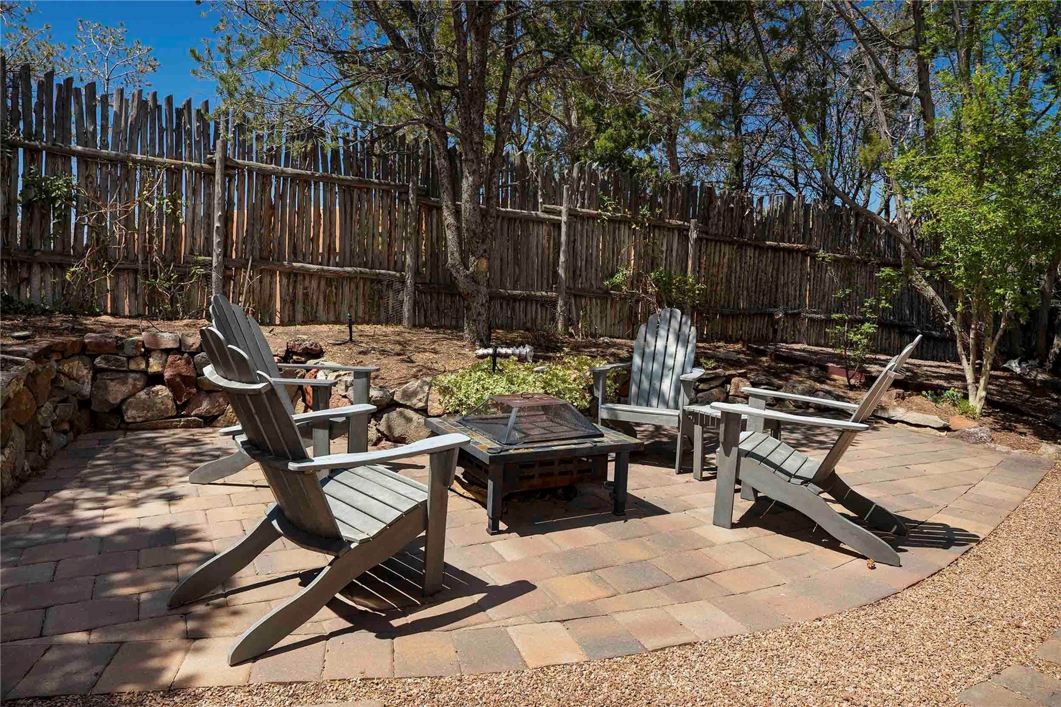 Set in the North Hills above Historic downtown Santa Fe, this serene, sophisticated home is an expressive mix of Soft Contemporary and Traditional styles. Gorgeous hardwood floors sweep from the foyer through the living/dining area with its double-sided kiva fireplace and adjacent deck. The kitchen continues the home's handsome palette with chocolate-colored countertops, maple cabinets and a sun-bathed alcove for casual meals. A few steps down from the kitchen is a den, with adjacent Laundry/Mudroom and double-door access to the sheltered back patio. A sleek, custom staircase leads to the home's four bedrooms. A soothing sanctuary, the Primary bedroom has a coved ceiling, fireplace, private view deck and ensuite, remodeled bath with walk-in, glass-walled shower. In the back garden, a moss rock wall borders an expansive, paver patio, with water feature. The atmosphere turns magical as the path glides toward the lower garden with its outdoor shower and hot tub. A new, high-efficiency boiler, solar and on-demand hot water heater add to the appeal of this refined offering. Residents of the Estancia Primera community enjoy an outdoor pool, tennis courts, and clubhouse. Walking trails enable quick access to downtown. Hiking trails and the Ski Basin are a short drive away.